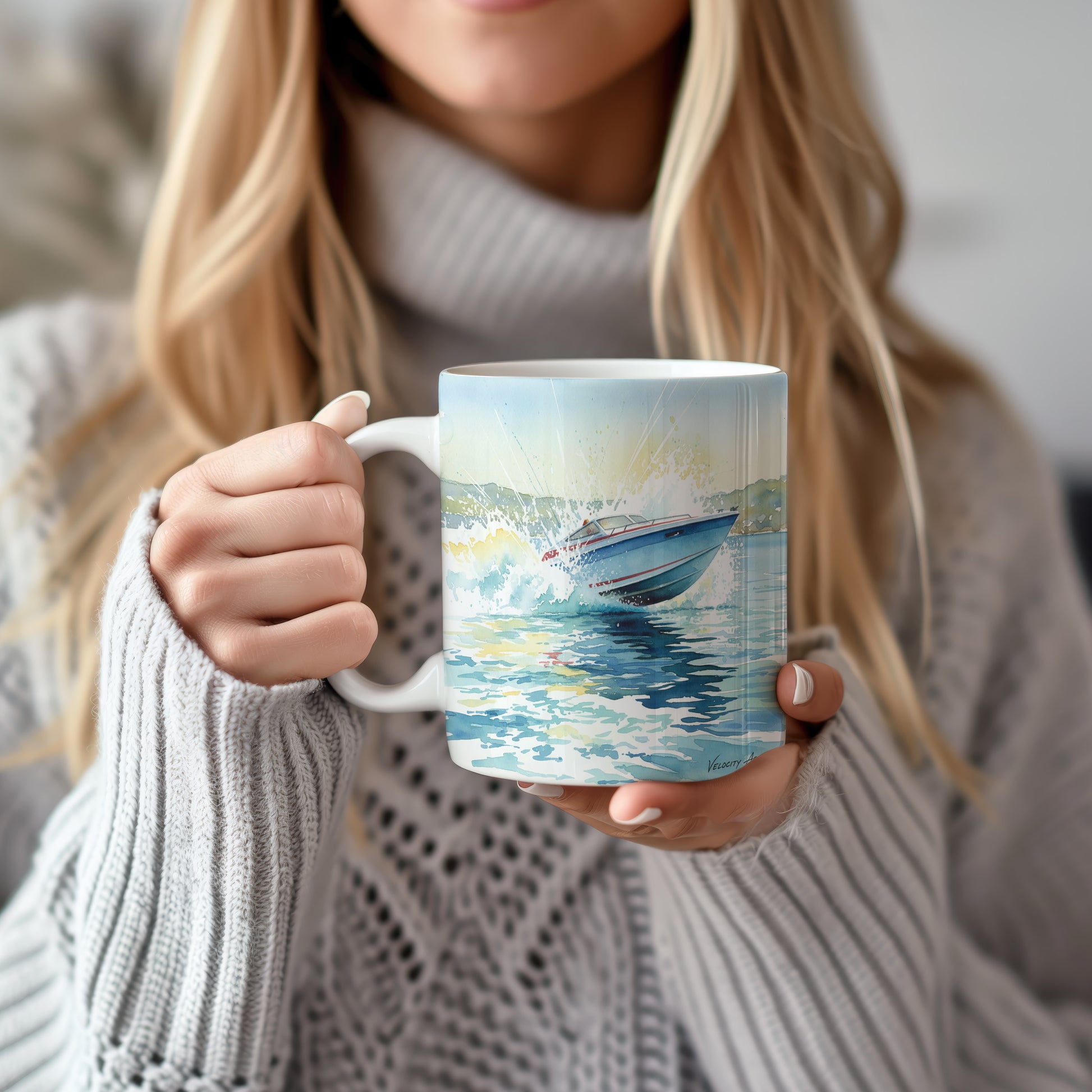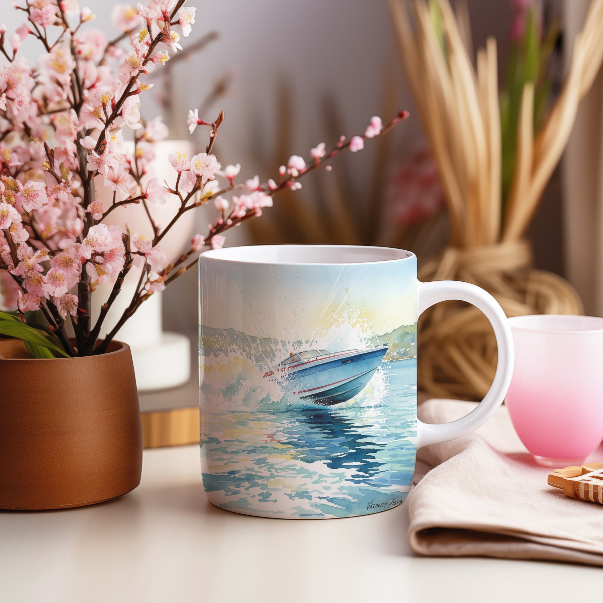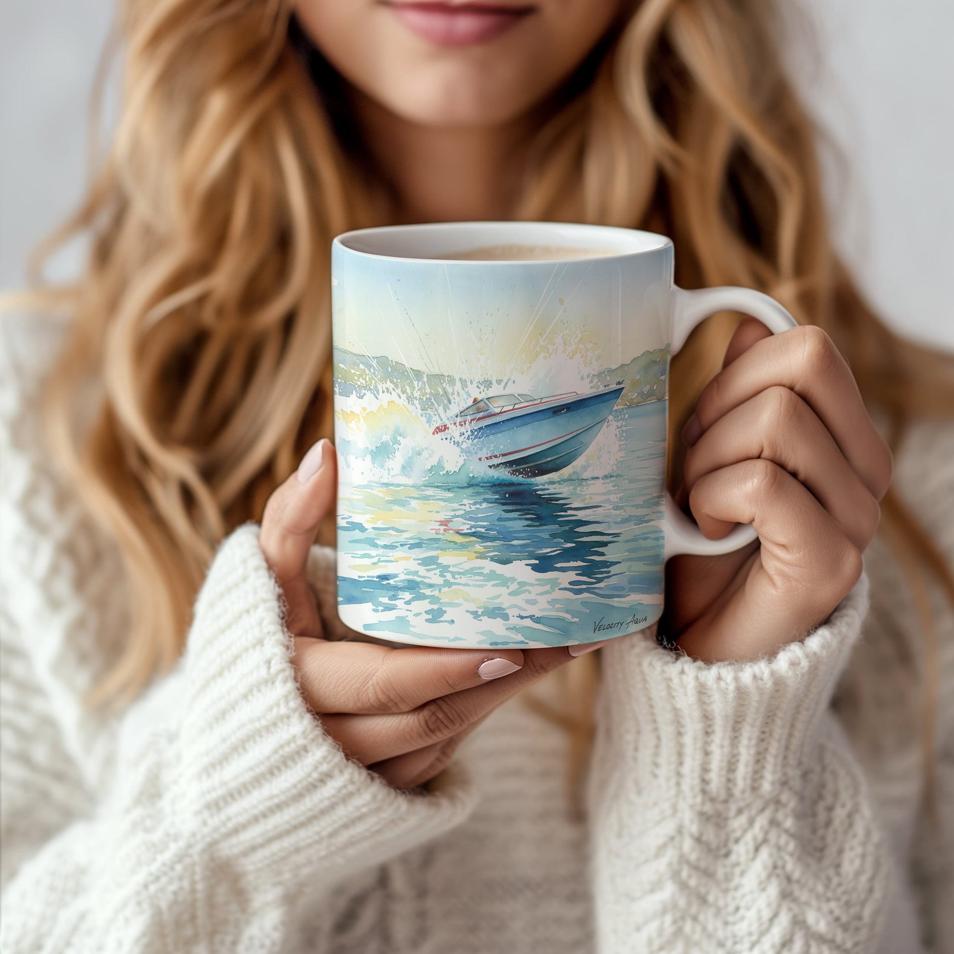 Objevte vlny dobrodružství s naším hrnkem, který zobrazuje motorový člun řítící se po vlnách. Akvarelové barvy přinášejí svěžest a energii do každého doušku. Hrnek 330 ml – vhodný do myčky i mikrovlnky.