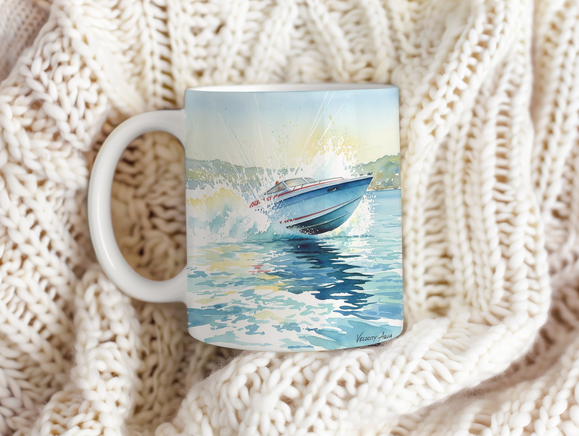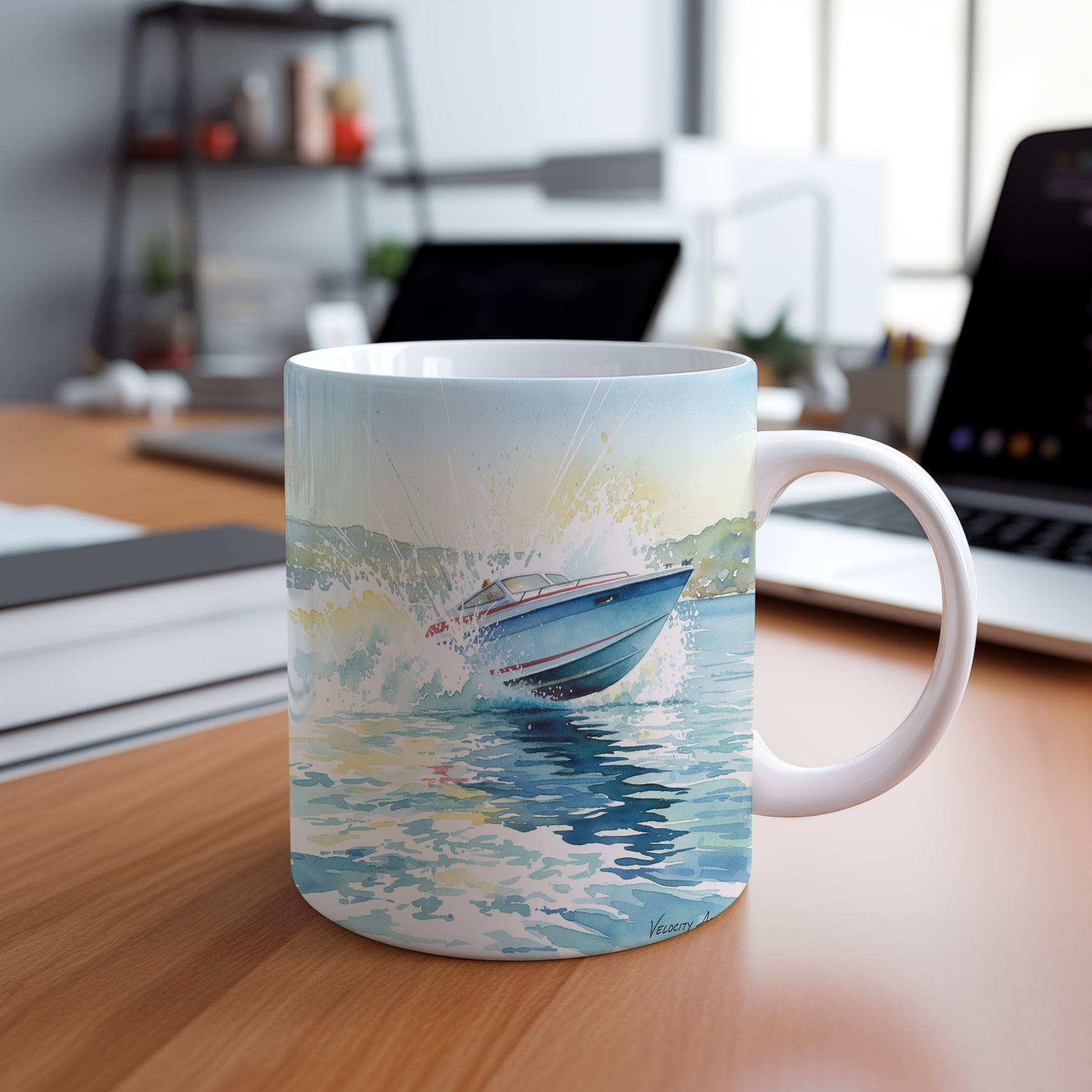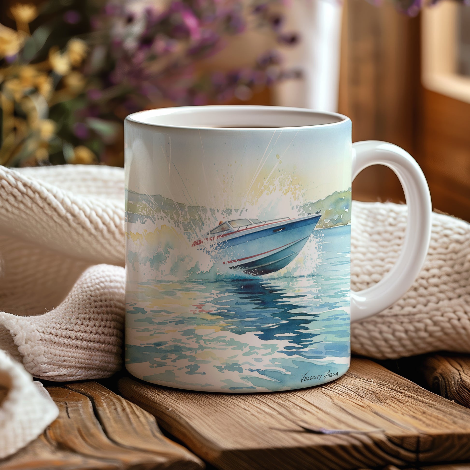 Objevte vlny dobrodružství s naším hrnkem, který zobrazuje motorový člun řítící se po vlnách. Akvarelové barvy přinášejí svěžest a energii do každého doušku. Hrnek 330 ml – vhodný do myčky i mikrovlnky.