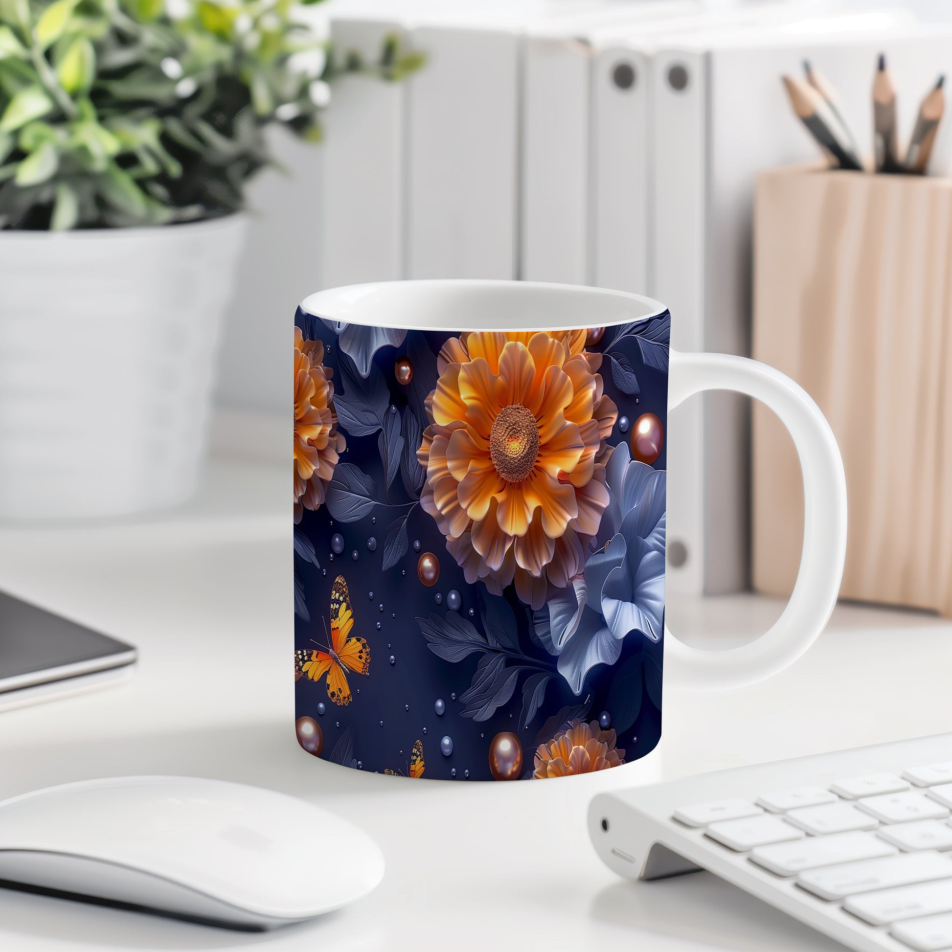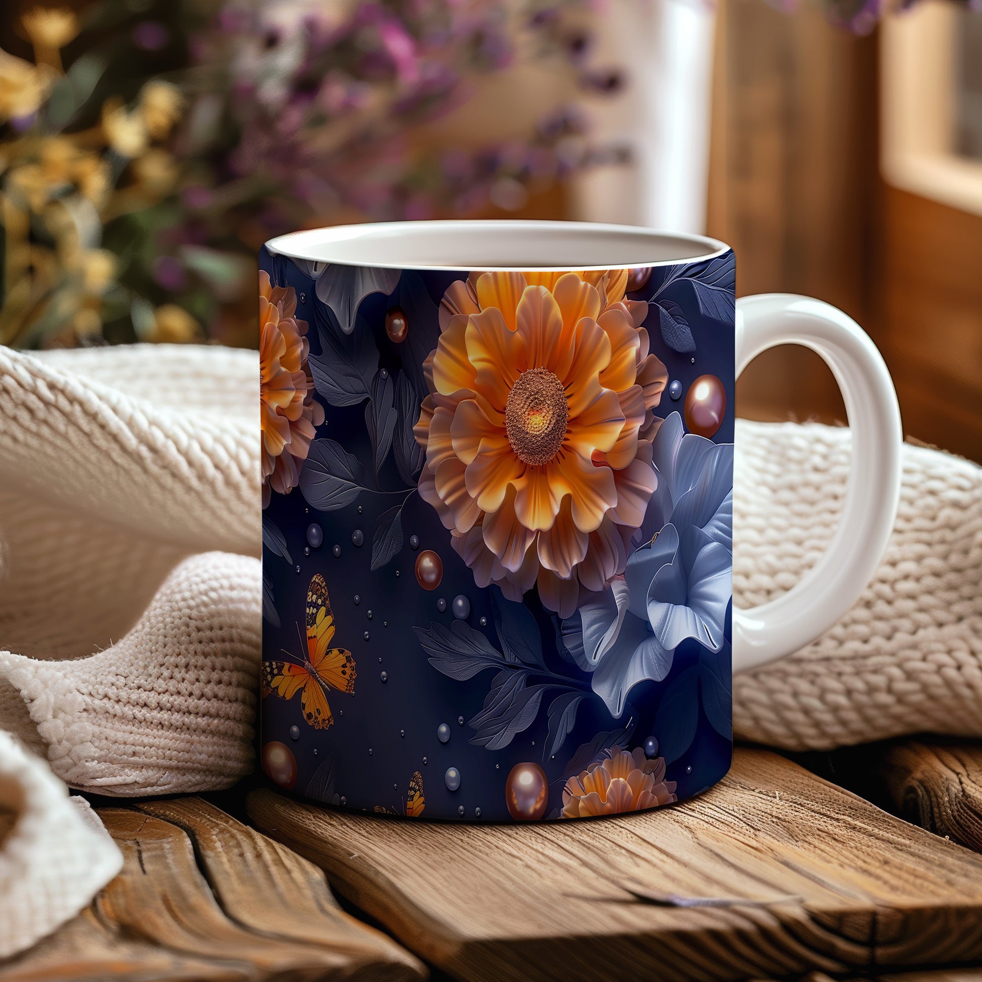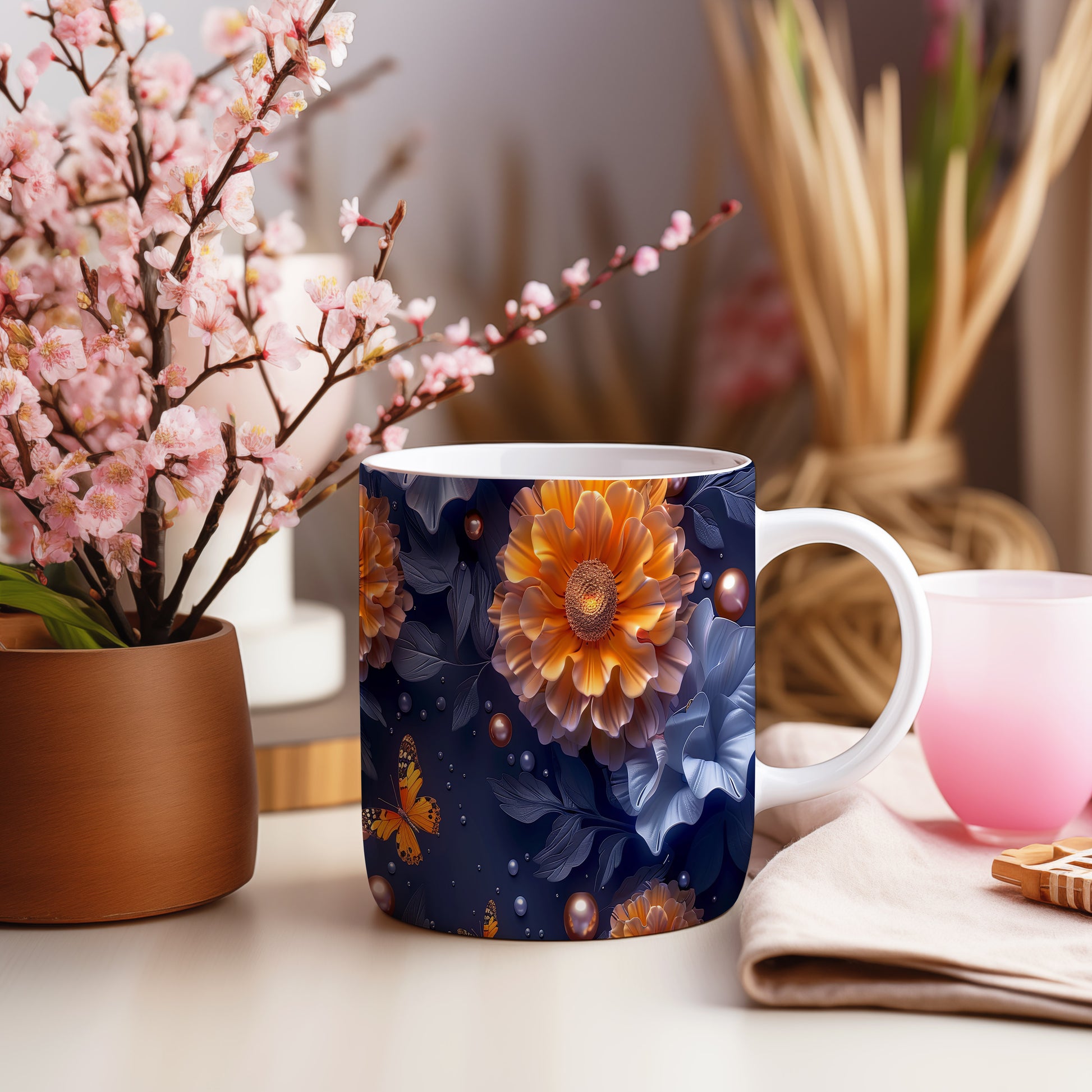 Hrnek s motýlem a květinovým designem v přírodních tónech
