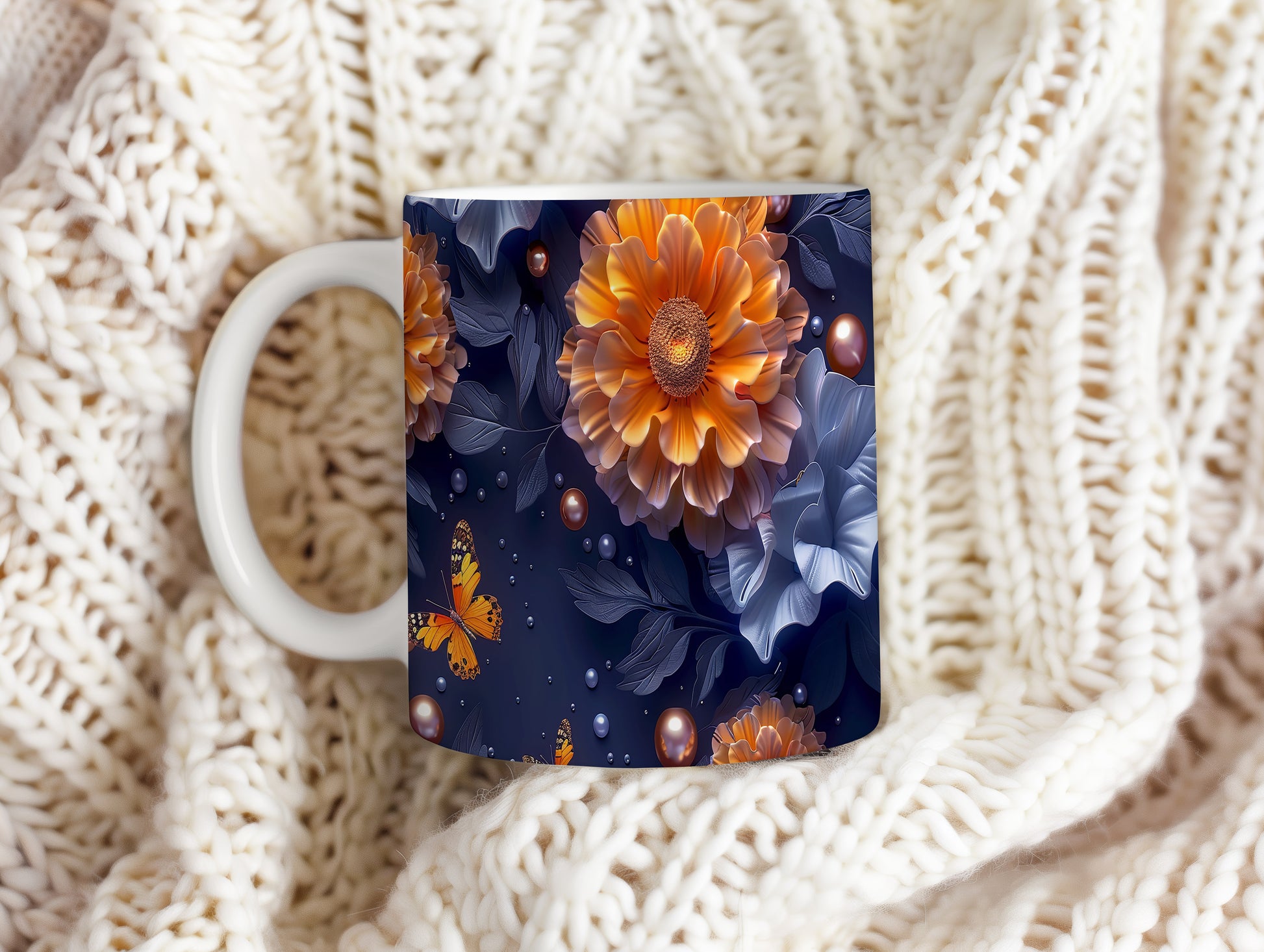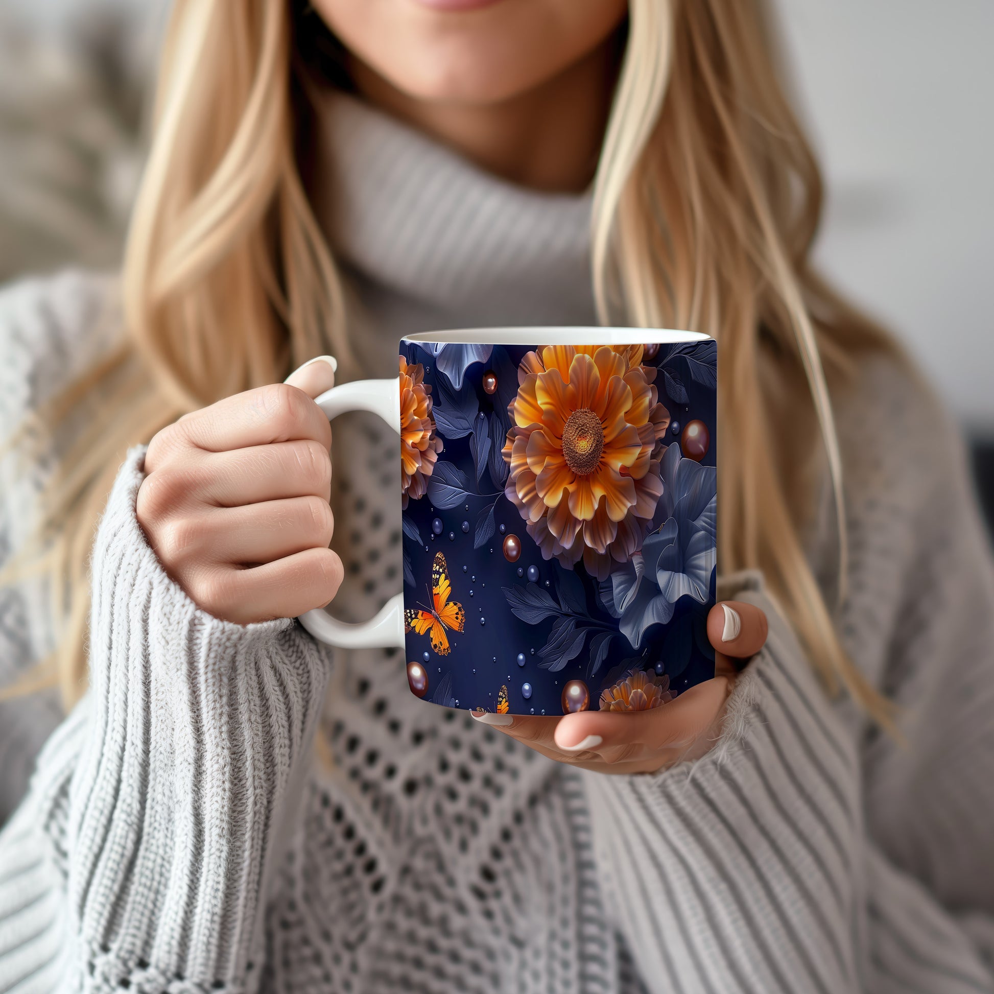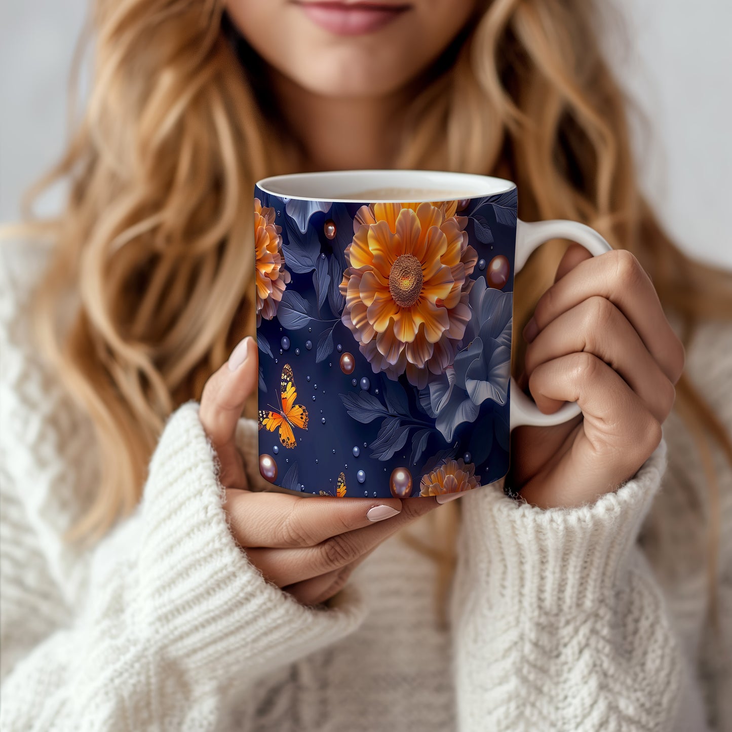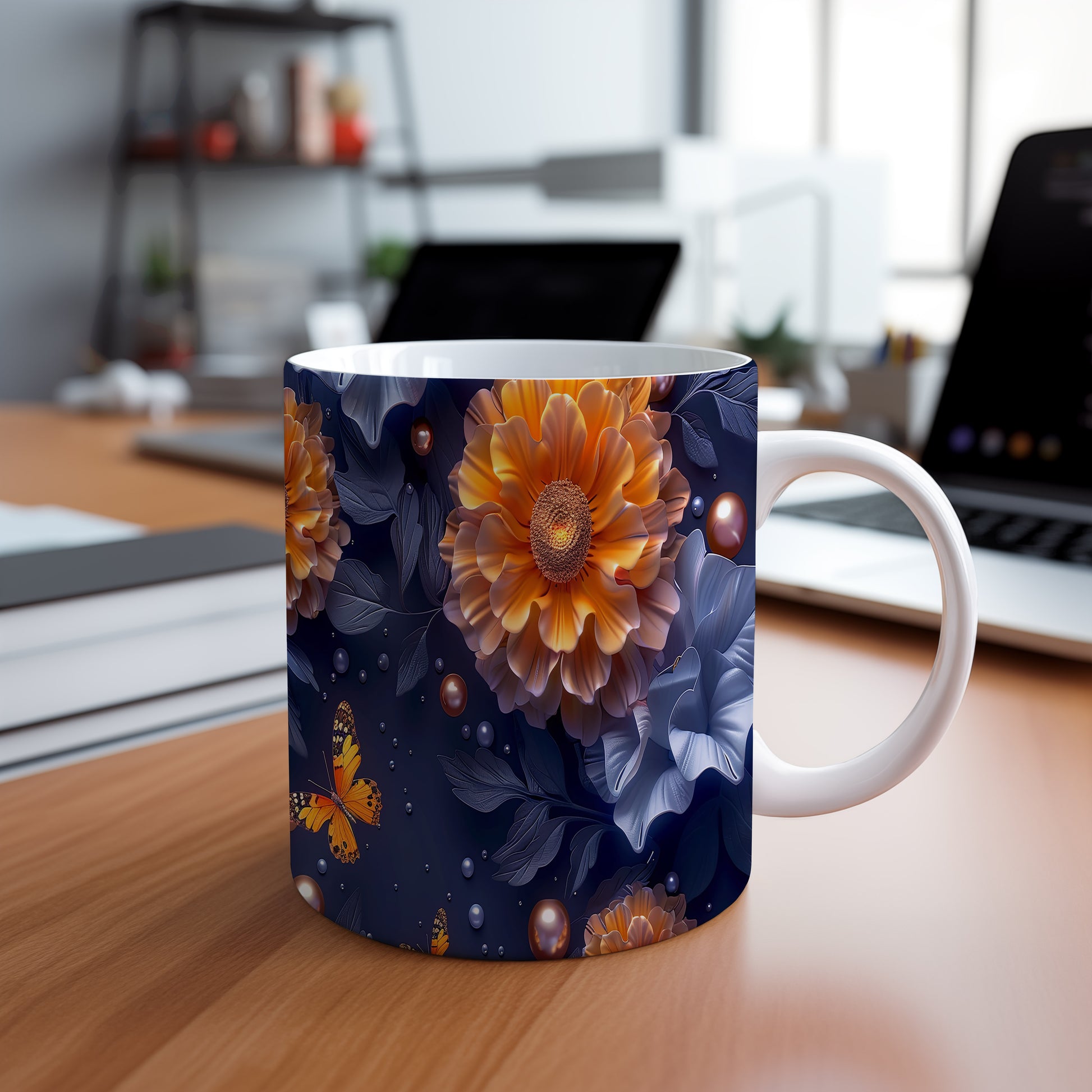Hrnek s motýlem a květinovým designem v přírodních tónech