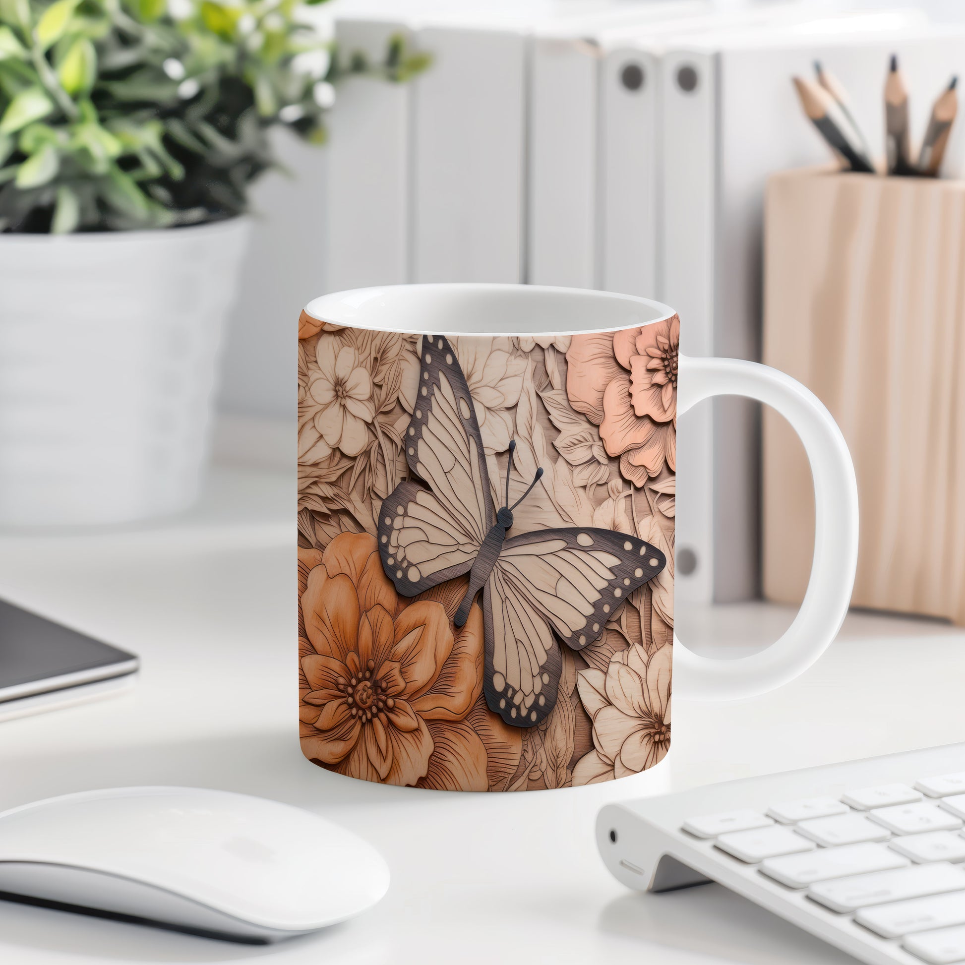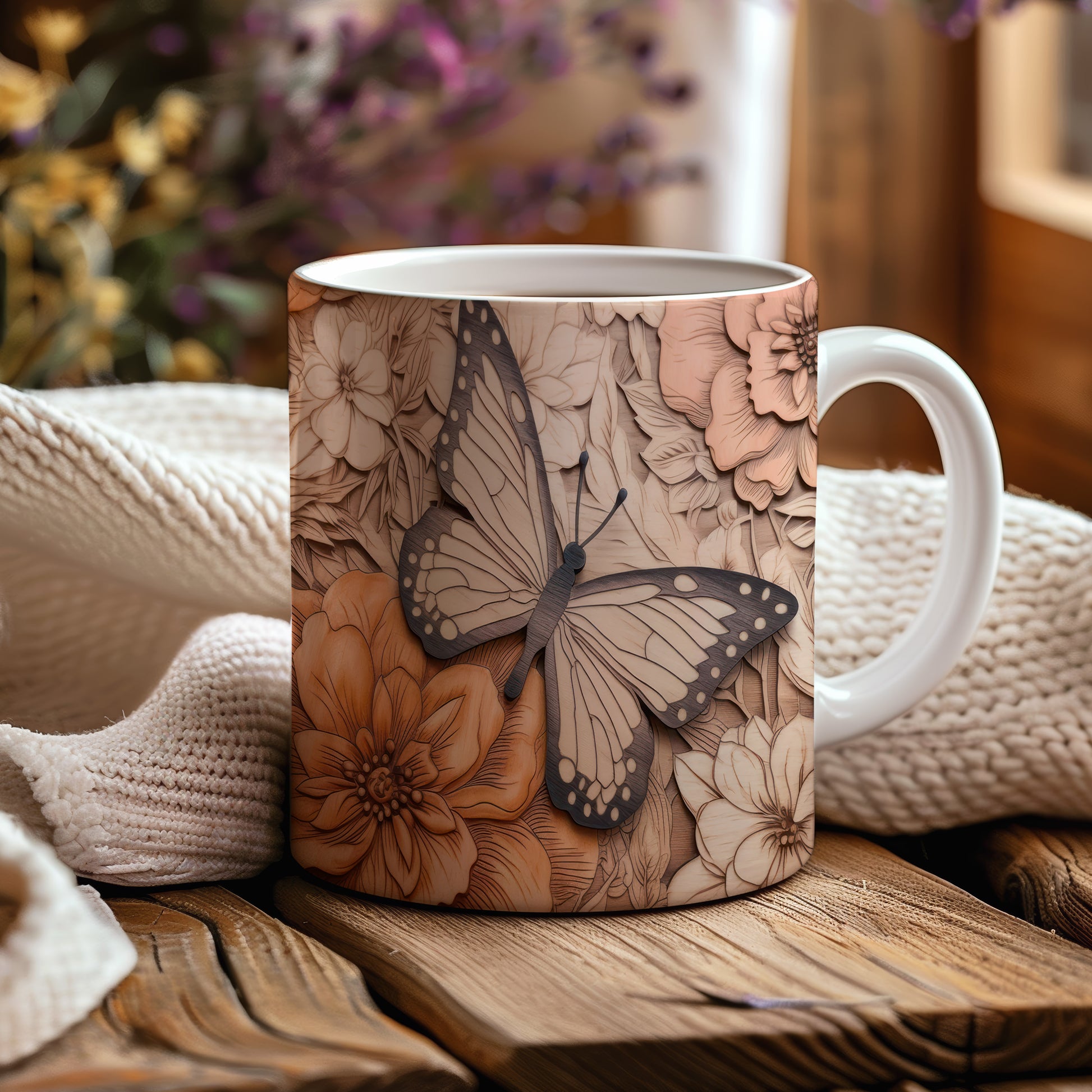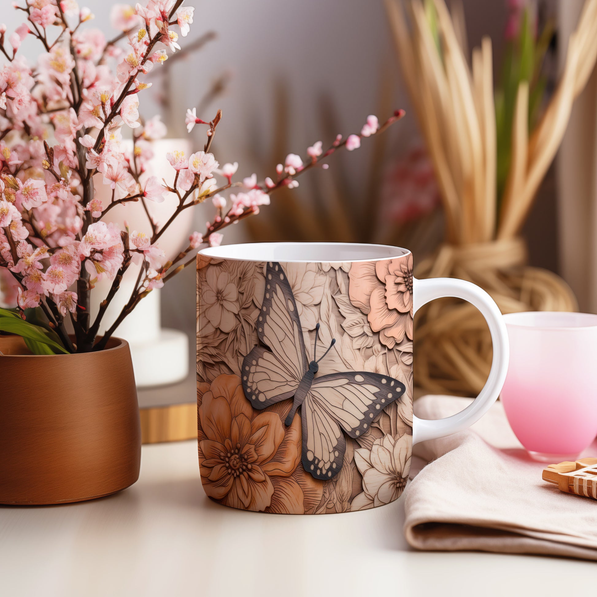 Hrnek s motýlem na květinovém pozadí