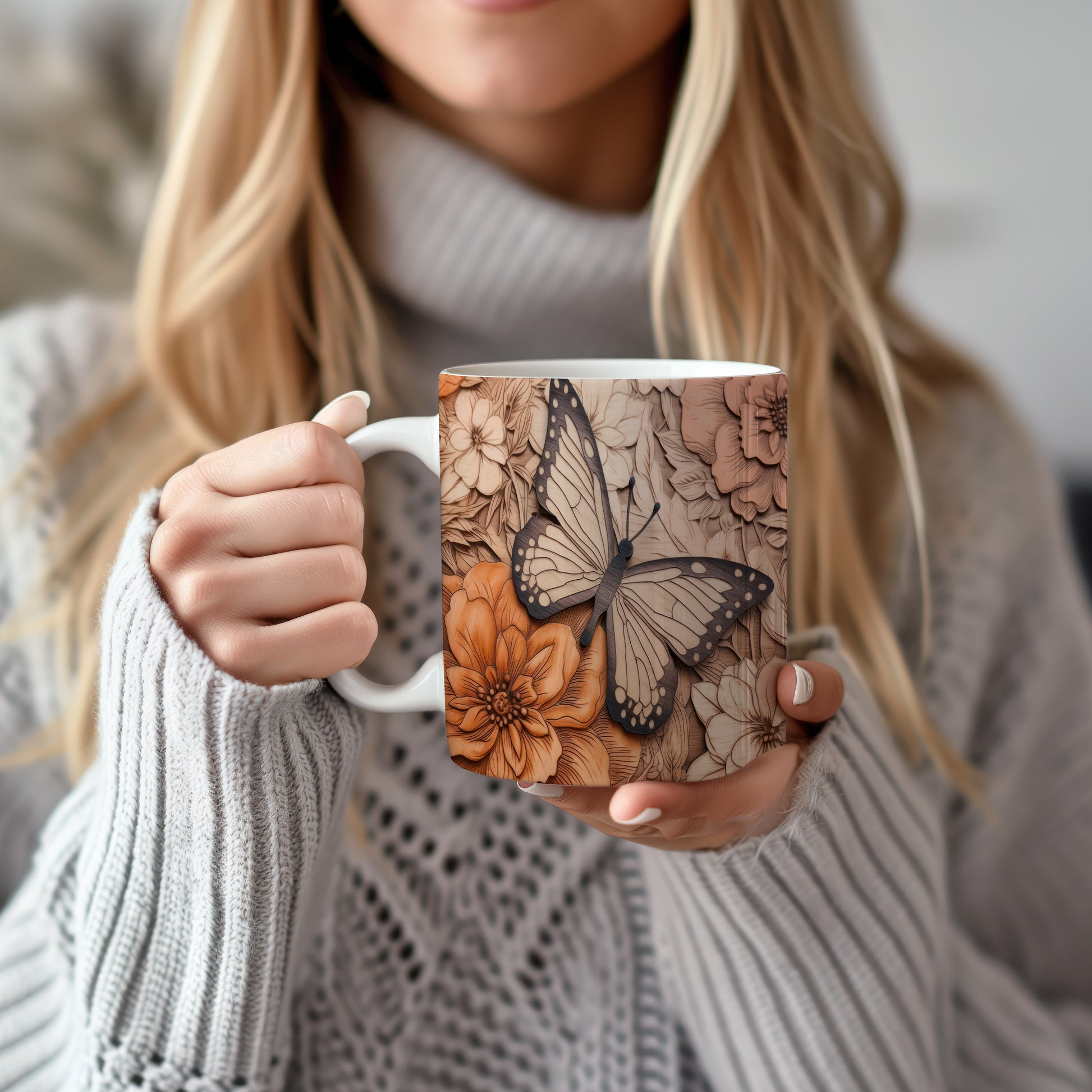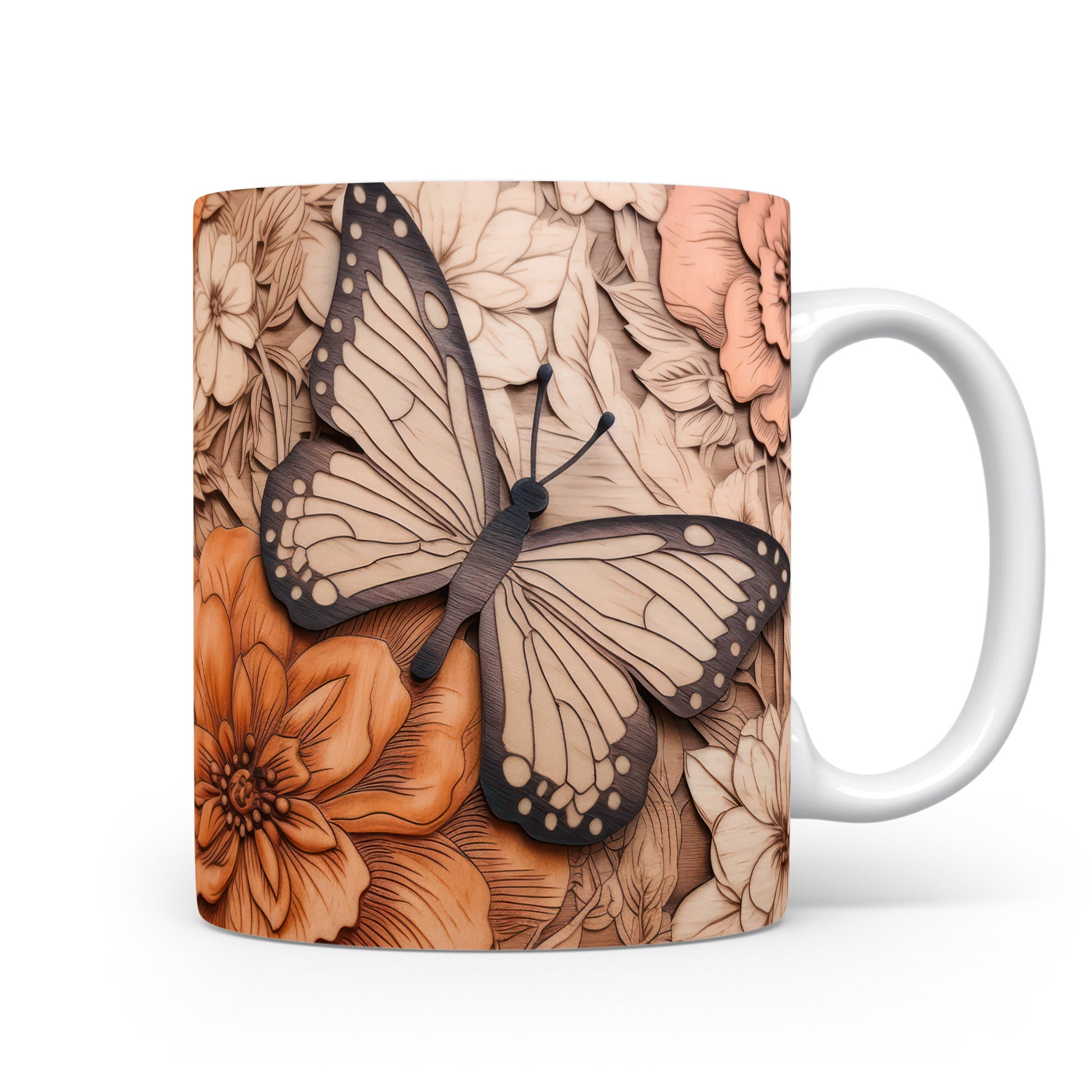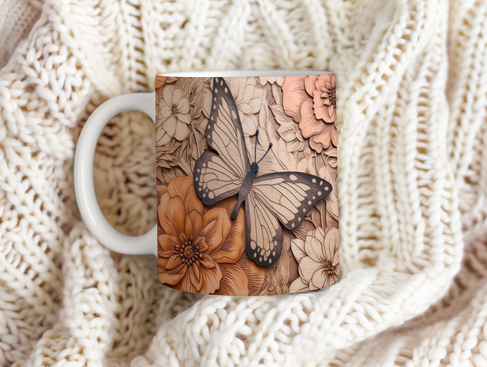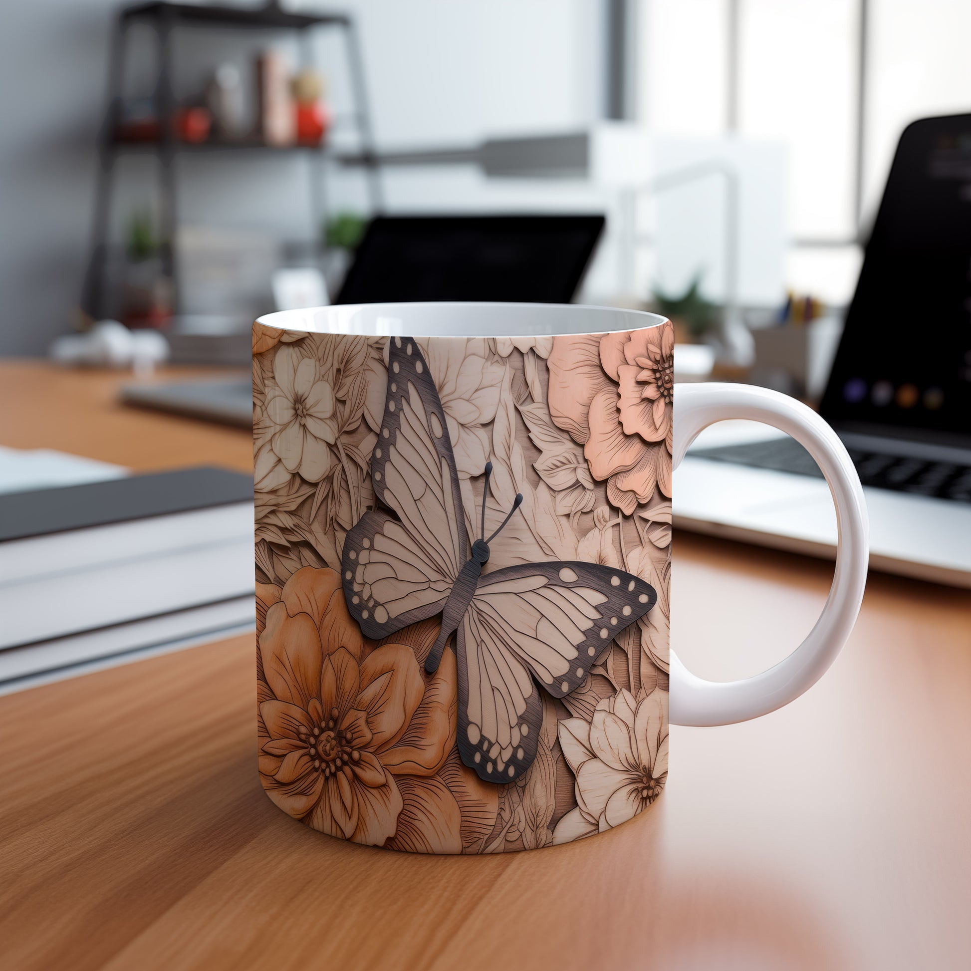 Hrnek s motýlem na květinovém pozadí