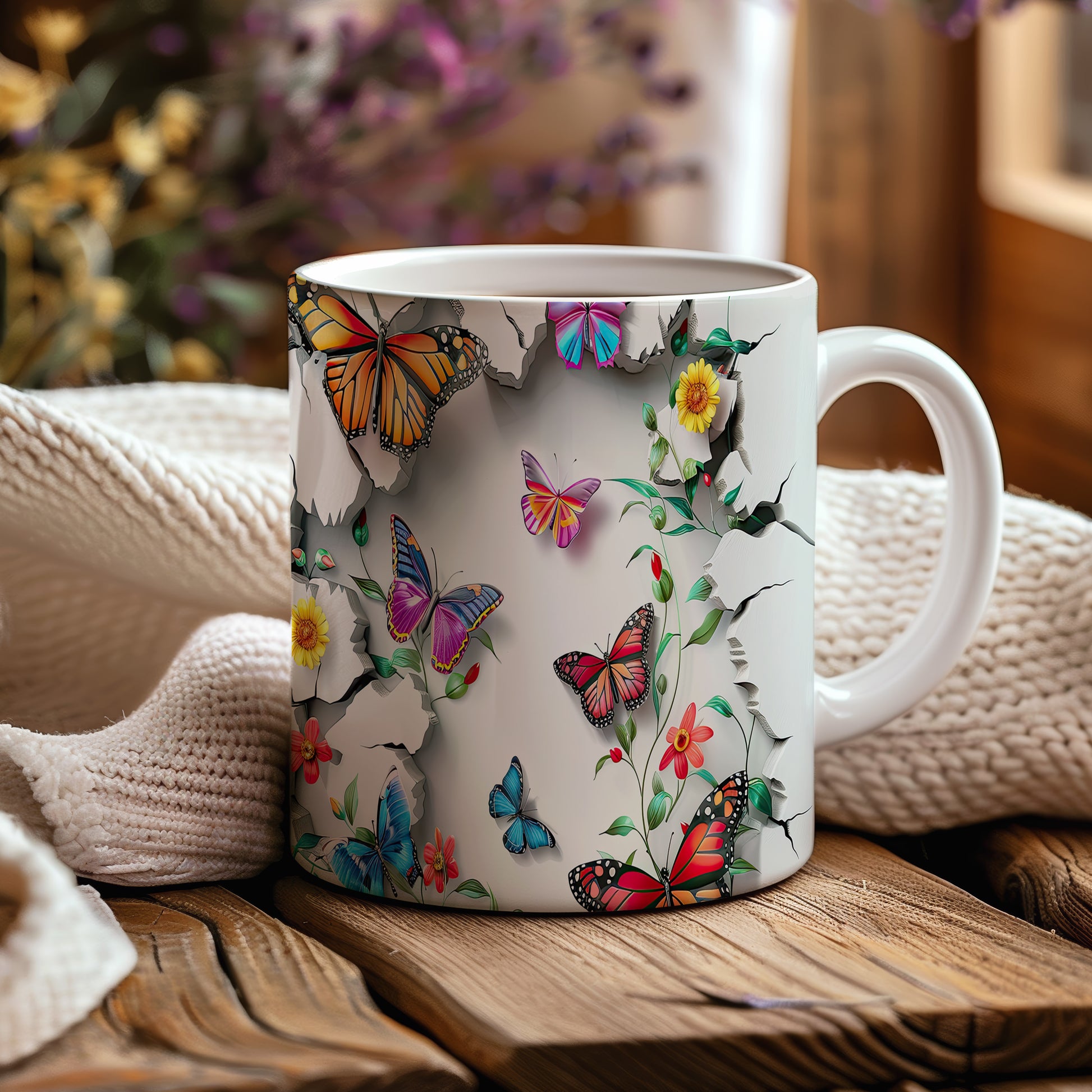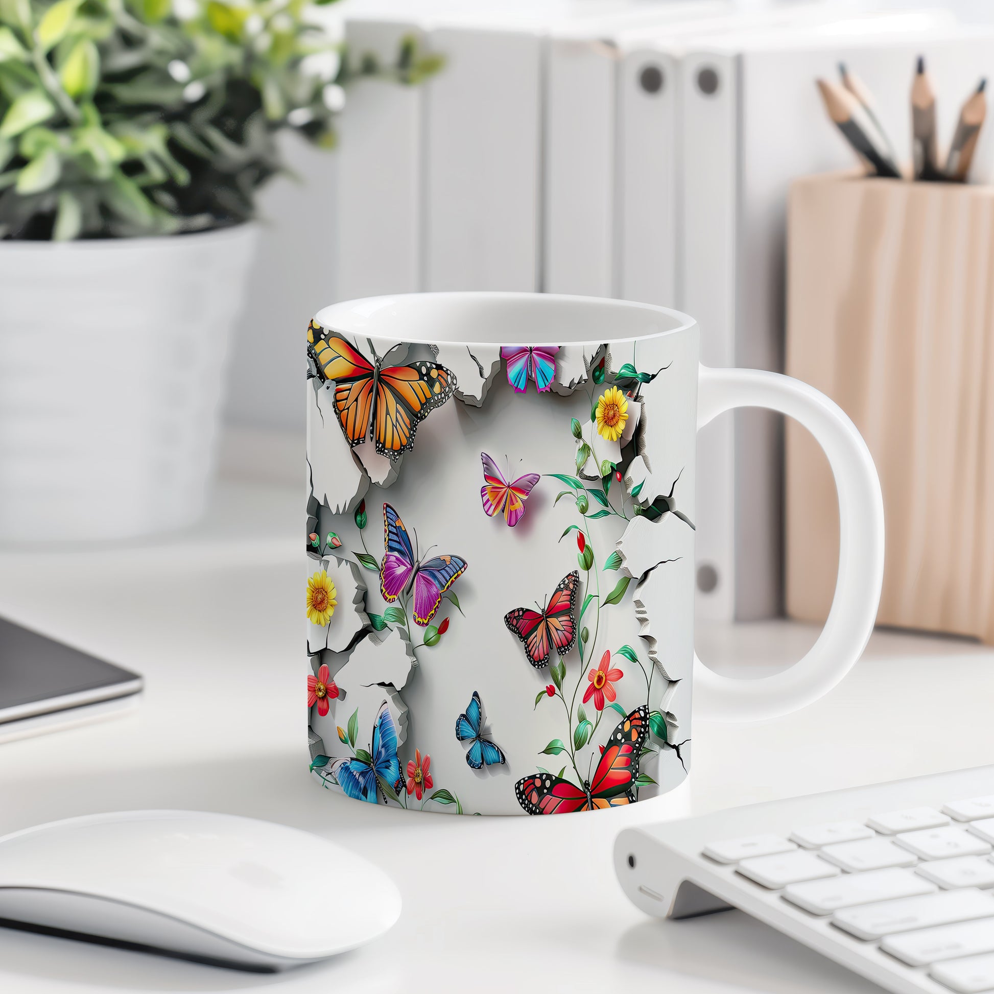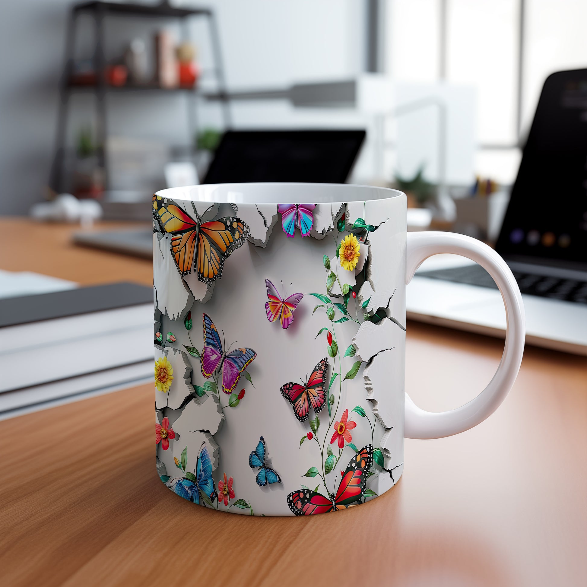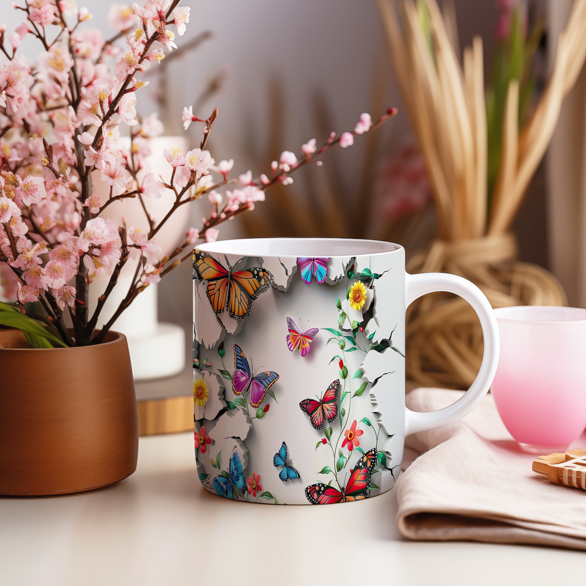 Hrnek s motýly a květinami – kontrastním vzhledem