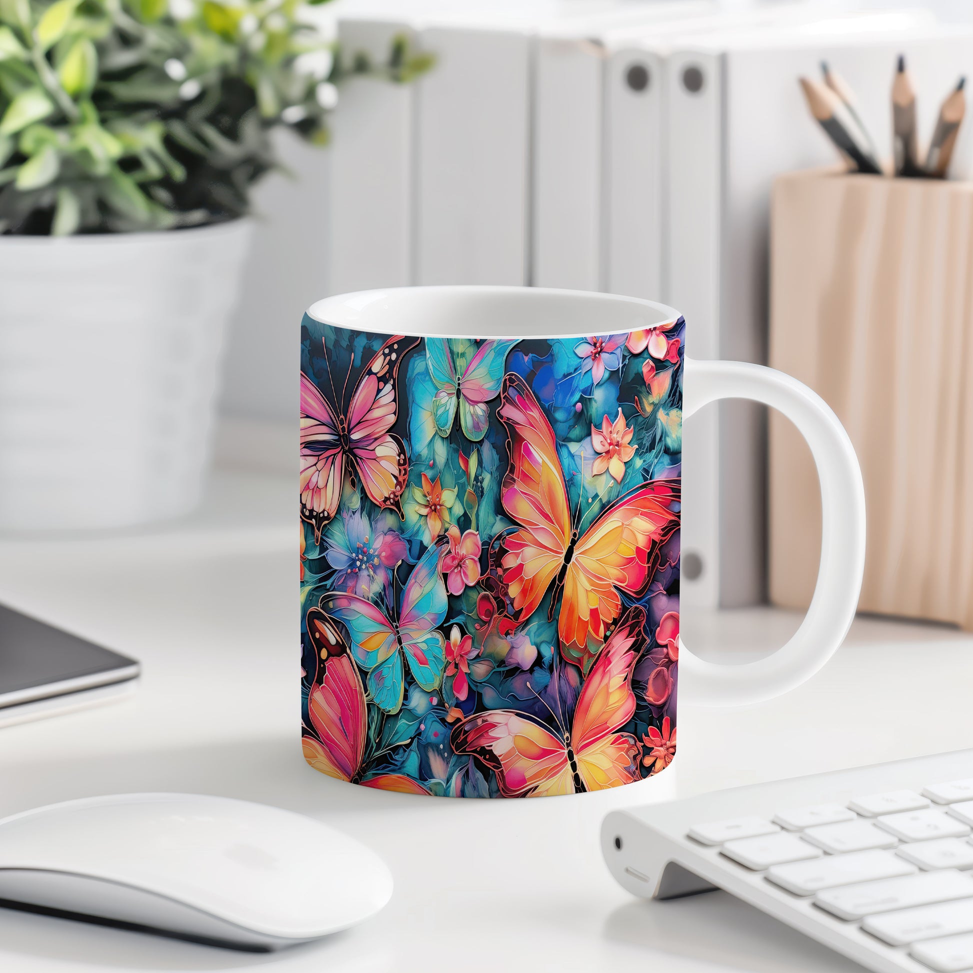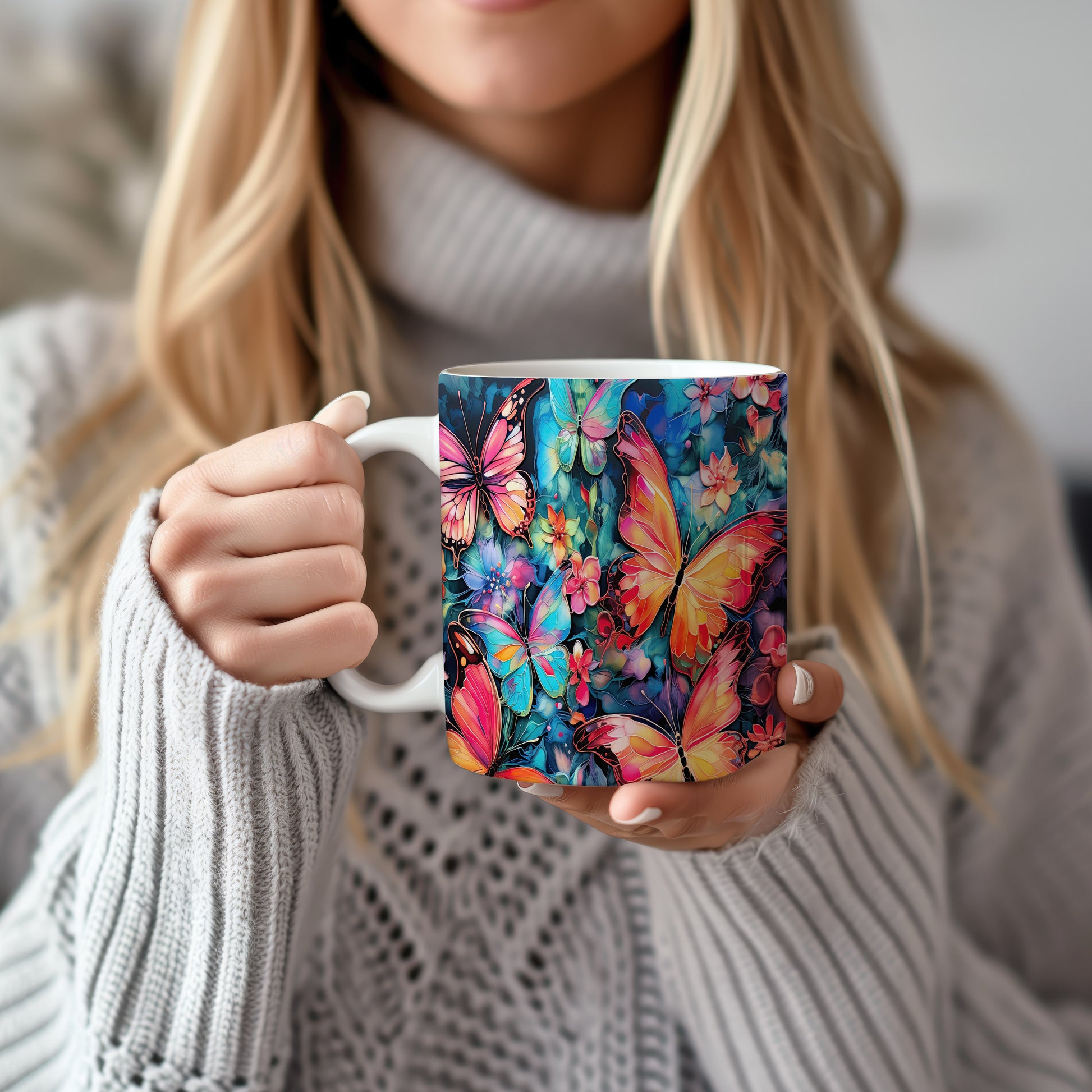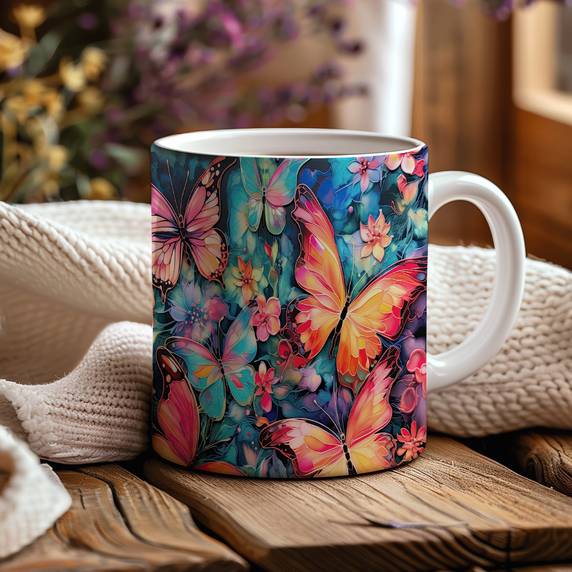 Hrnek s motýly a květinami je krásným a pestrým kouskem, který potěší každého milovníka přírody. Skvěle se hodí jako dárek pro přátele nebo rodinu, kteří ocení jedinečný design. Materiál: keramika. Objem: 330 ml. Vhodné do myčky i mikrovlnky. Tento hrnek přináší radost do každodenního pití a oživí váš stůl.