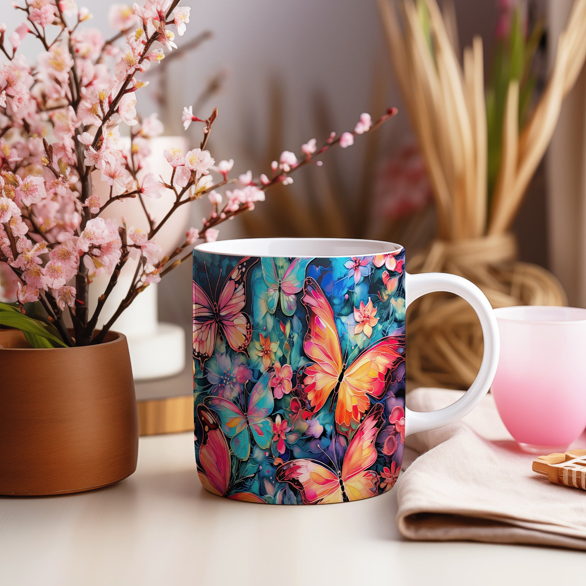 Hrnek s motýly a květinami – unikátní variantou