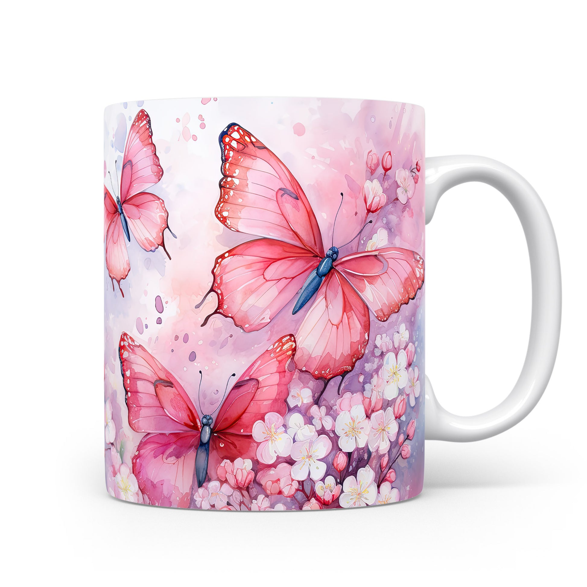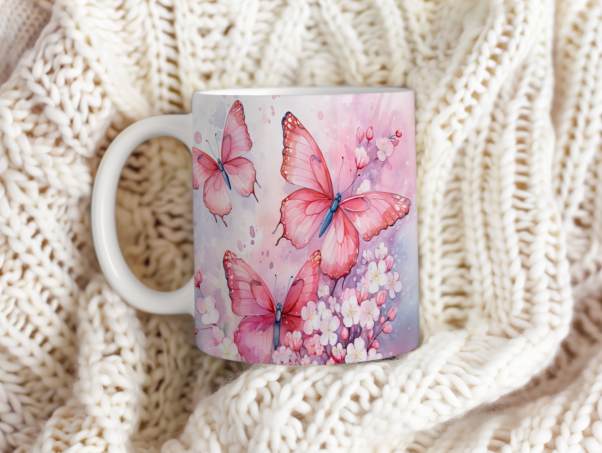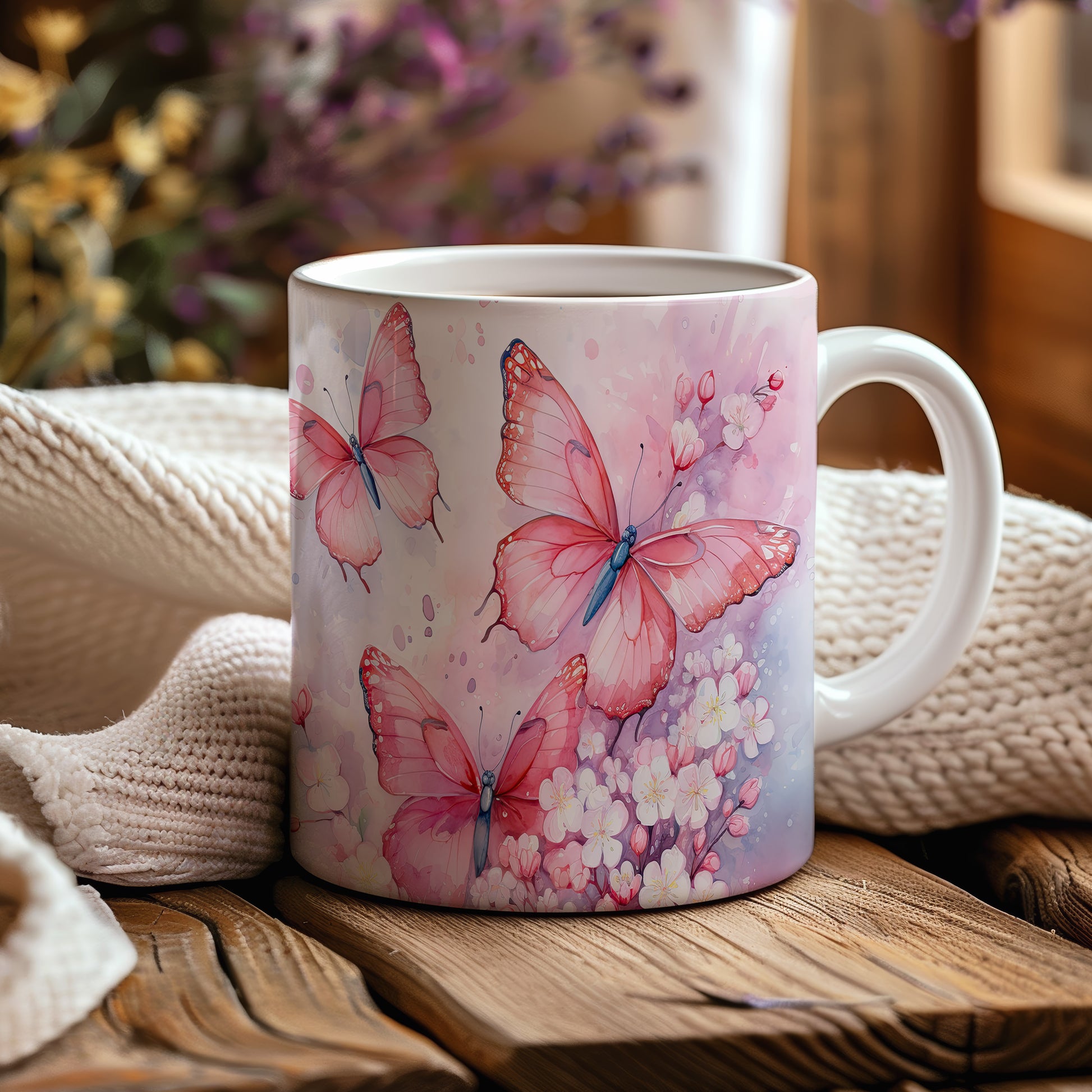 Hrnek s motýly a květinami v jemných pastelových tónech