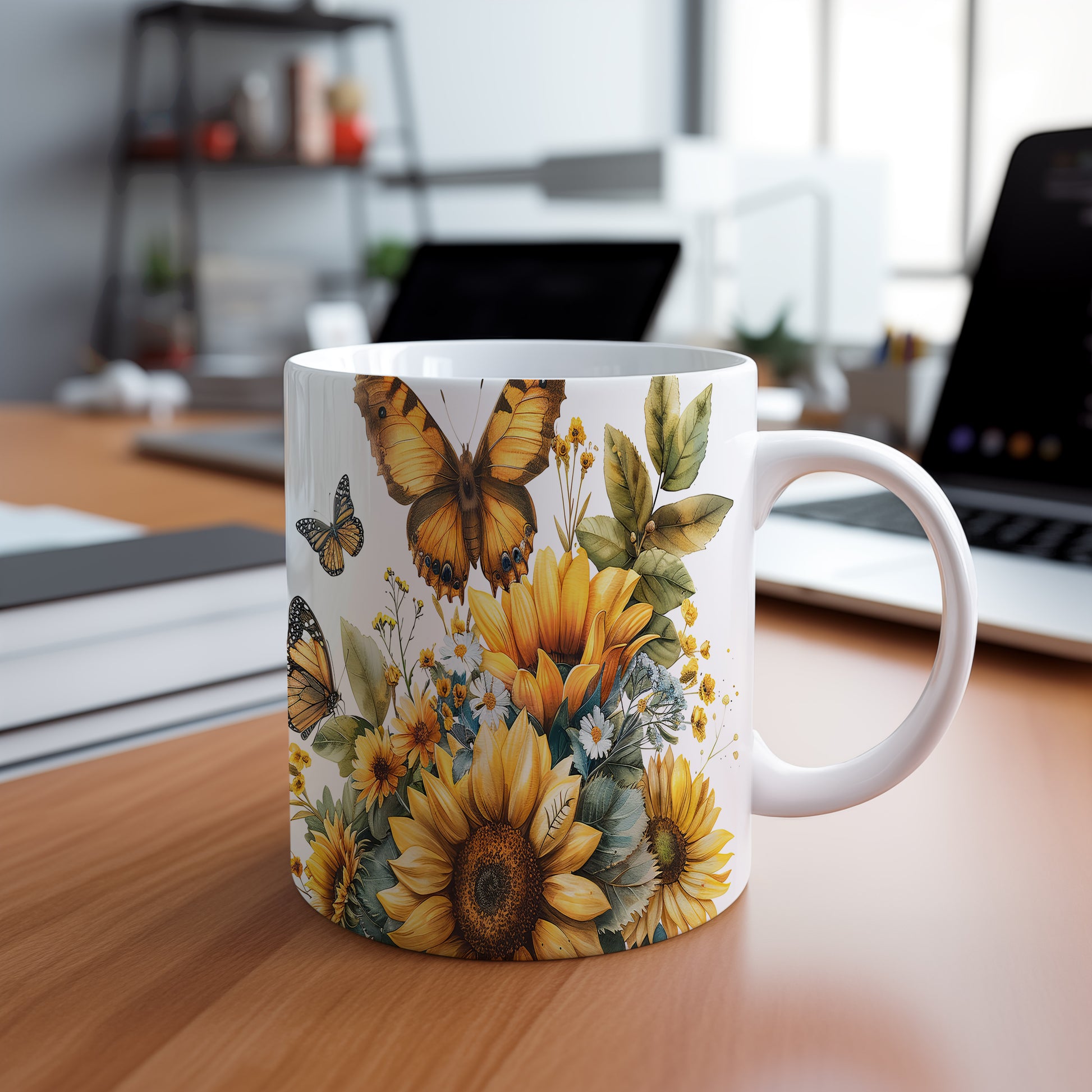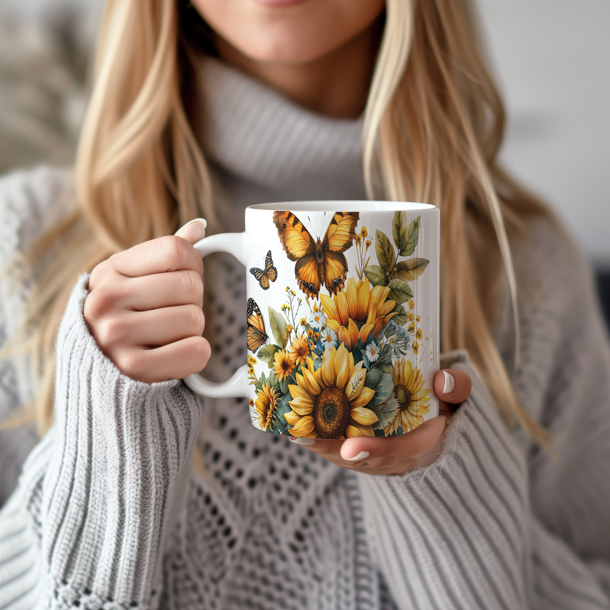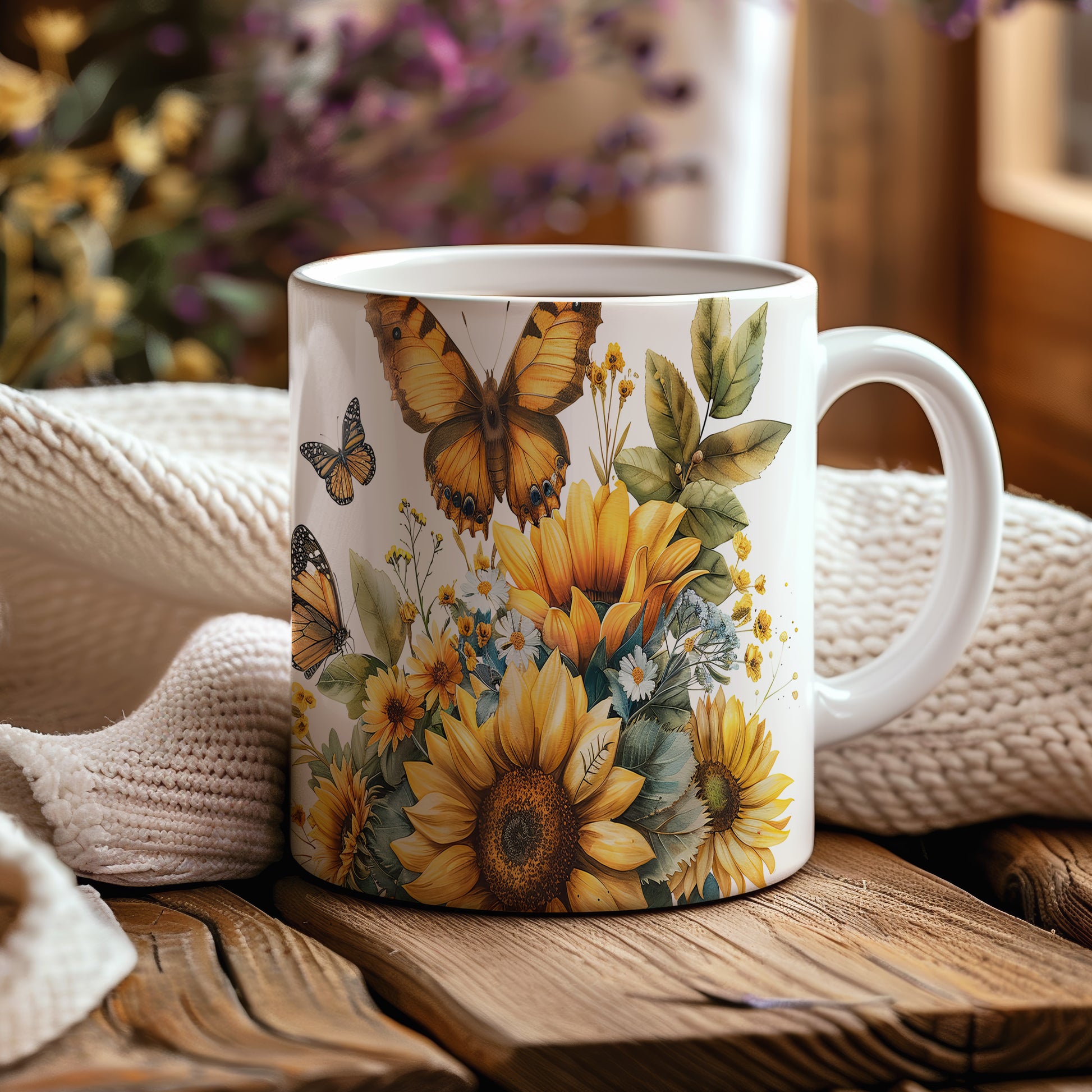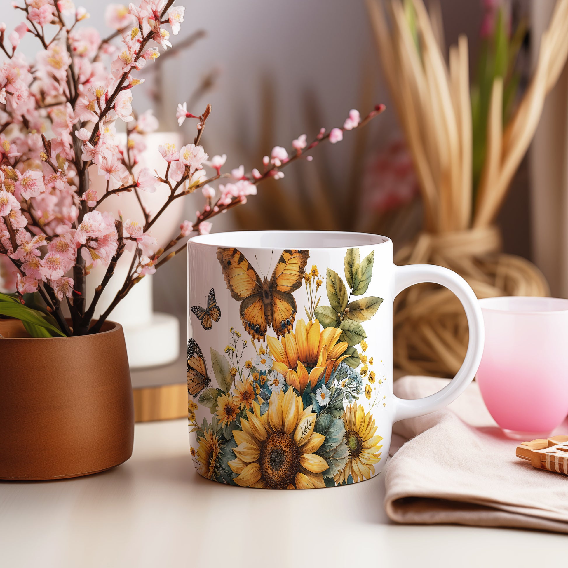 Hrnek s motýly a květinami v žlutých tónech – přírodní styl
