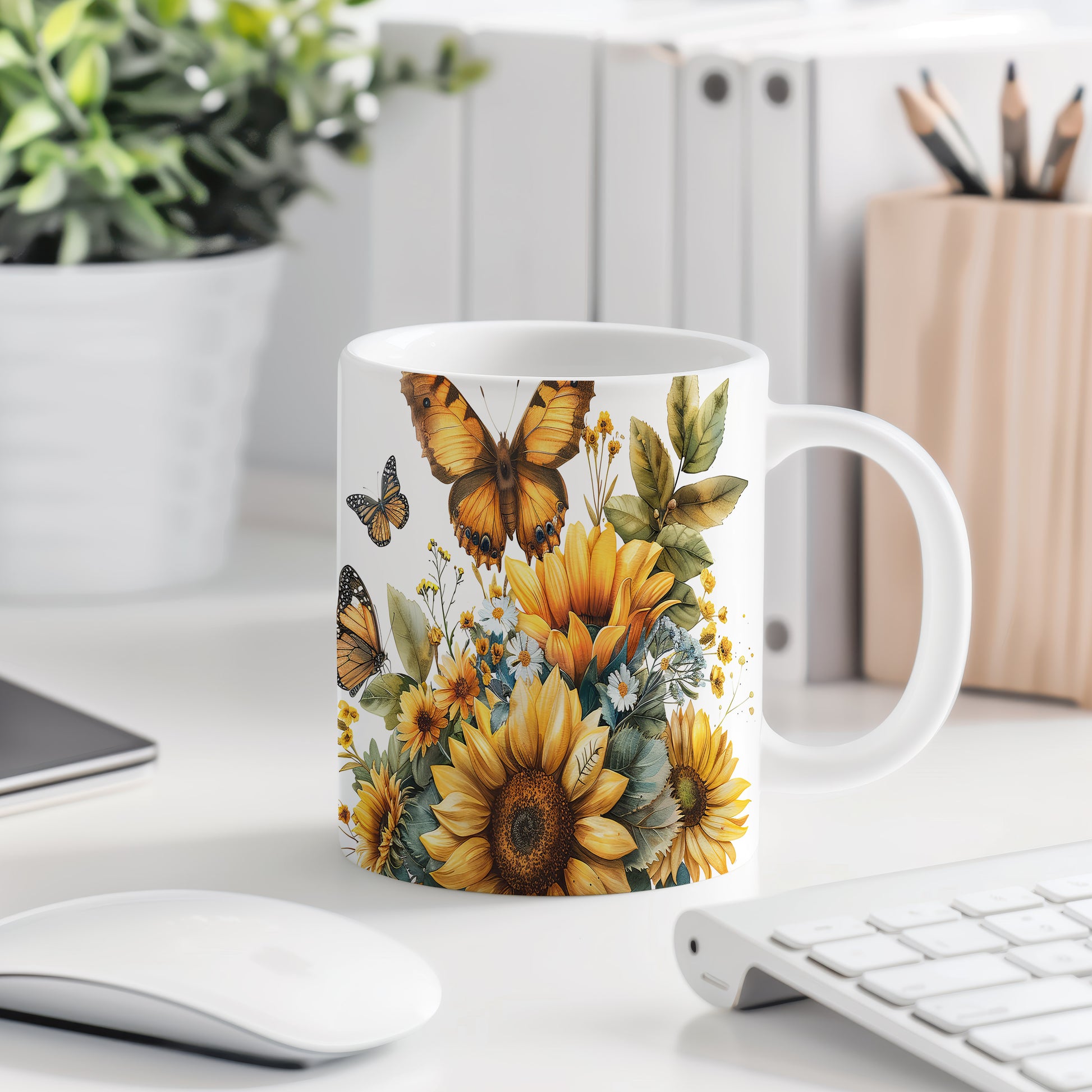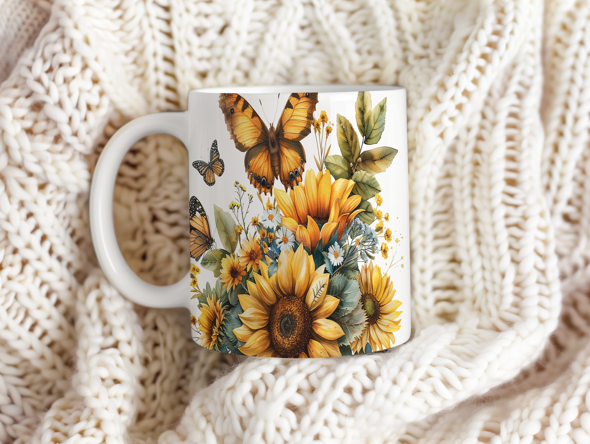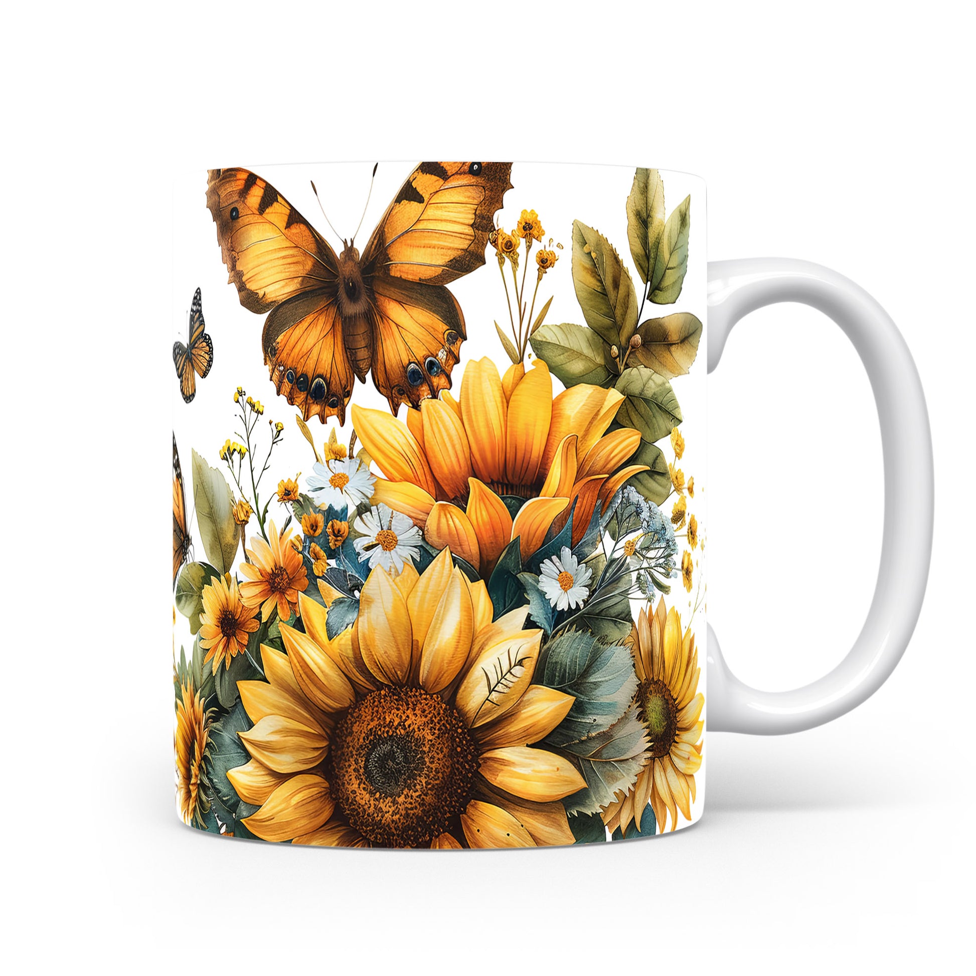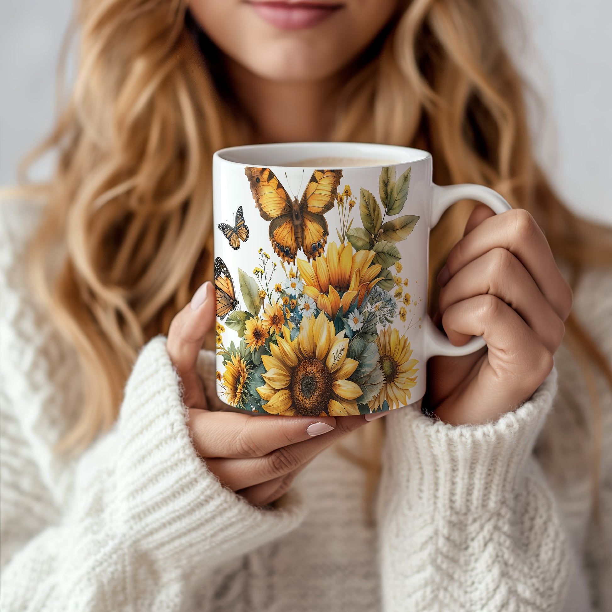 Hrnek s motýly a květinami v žlutých tónech – přírodní styl