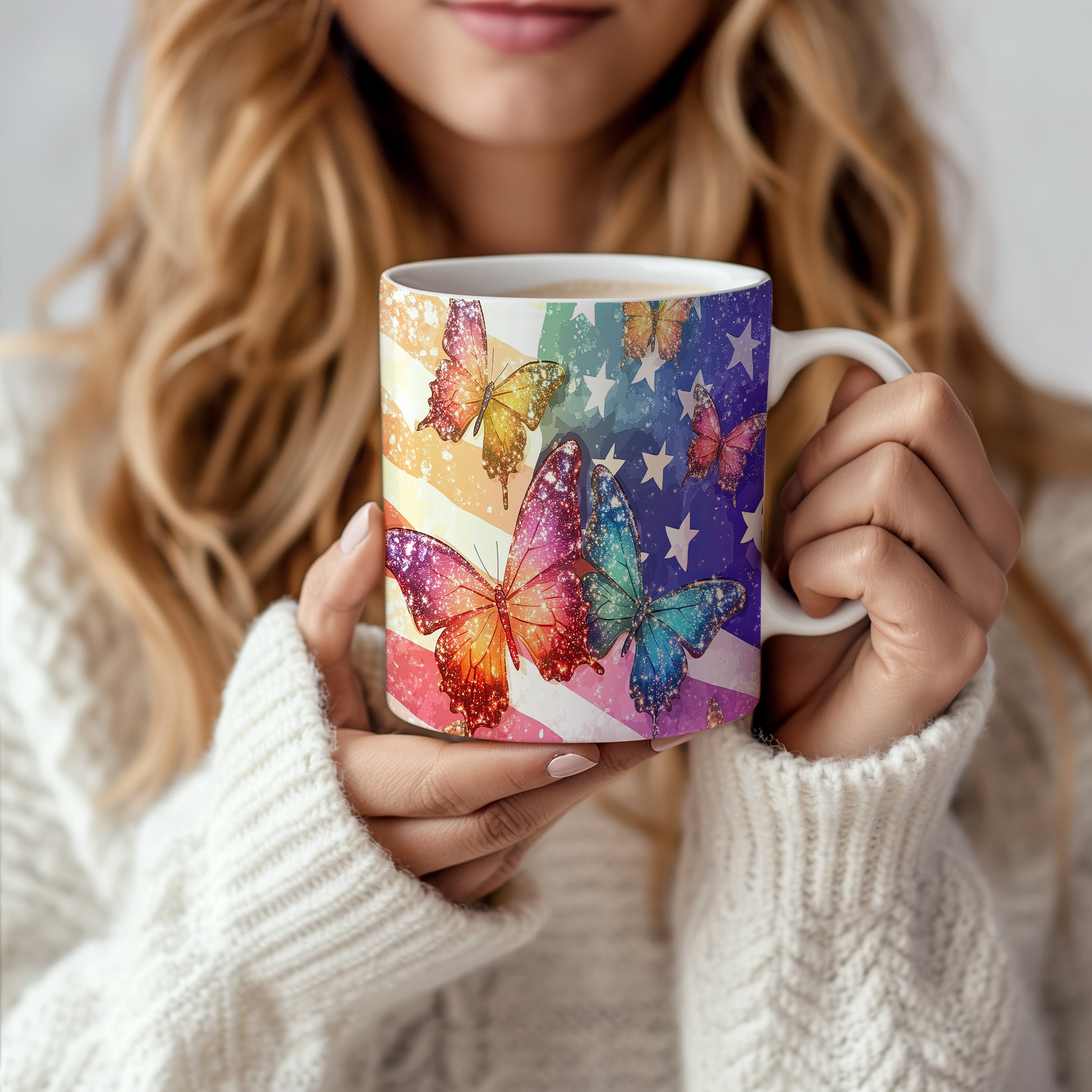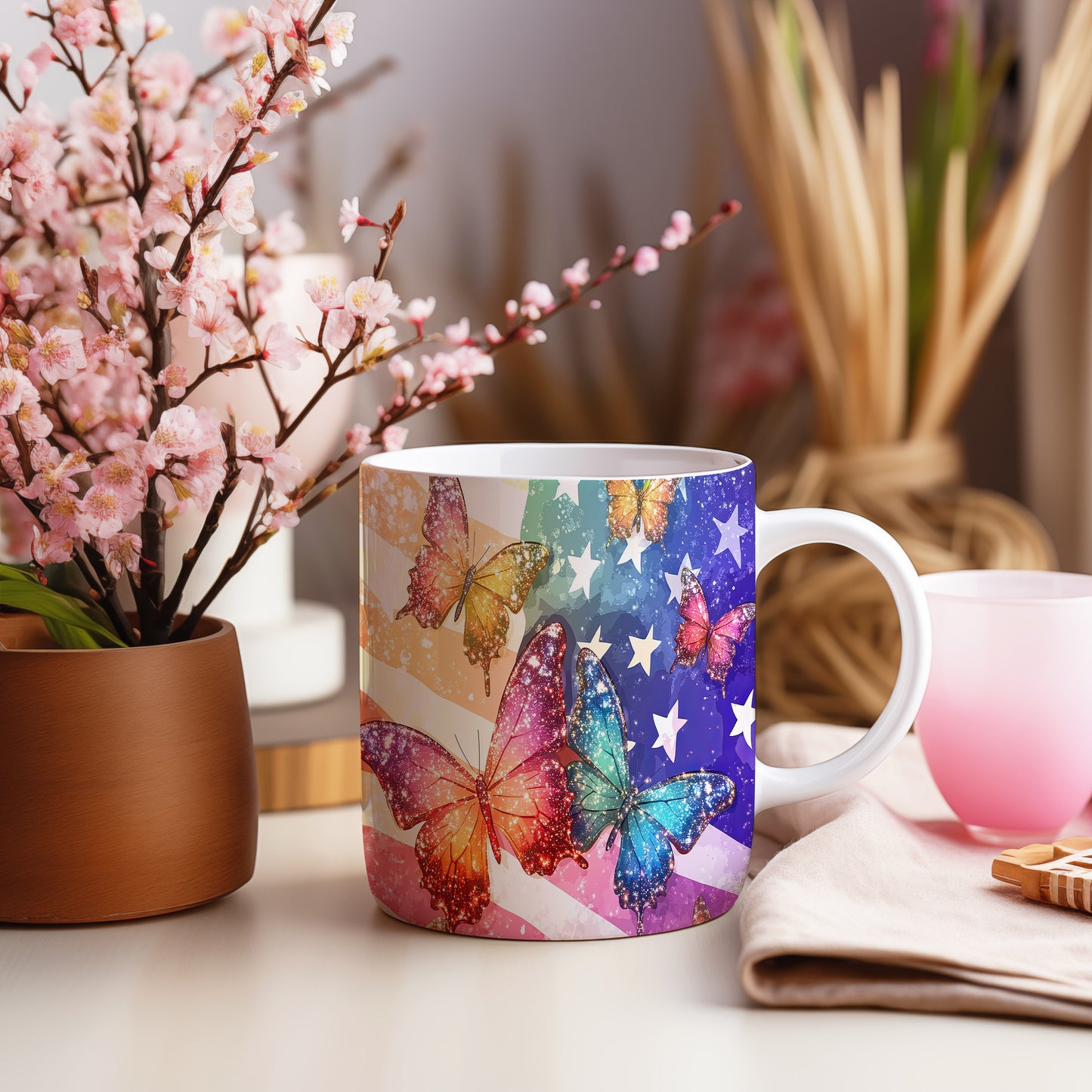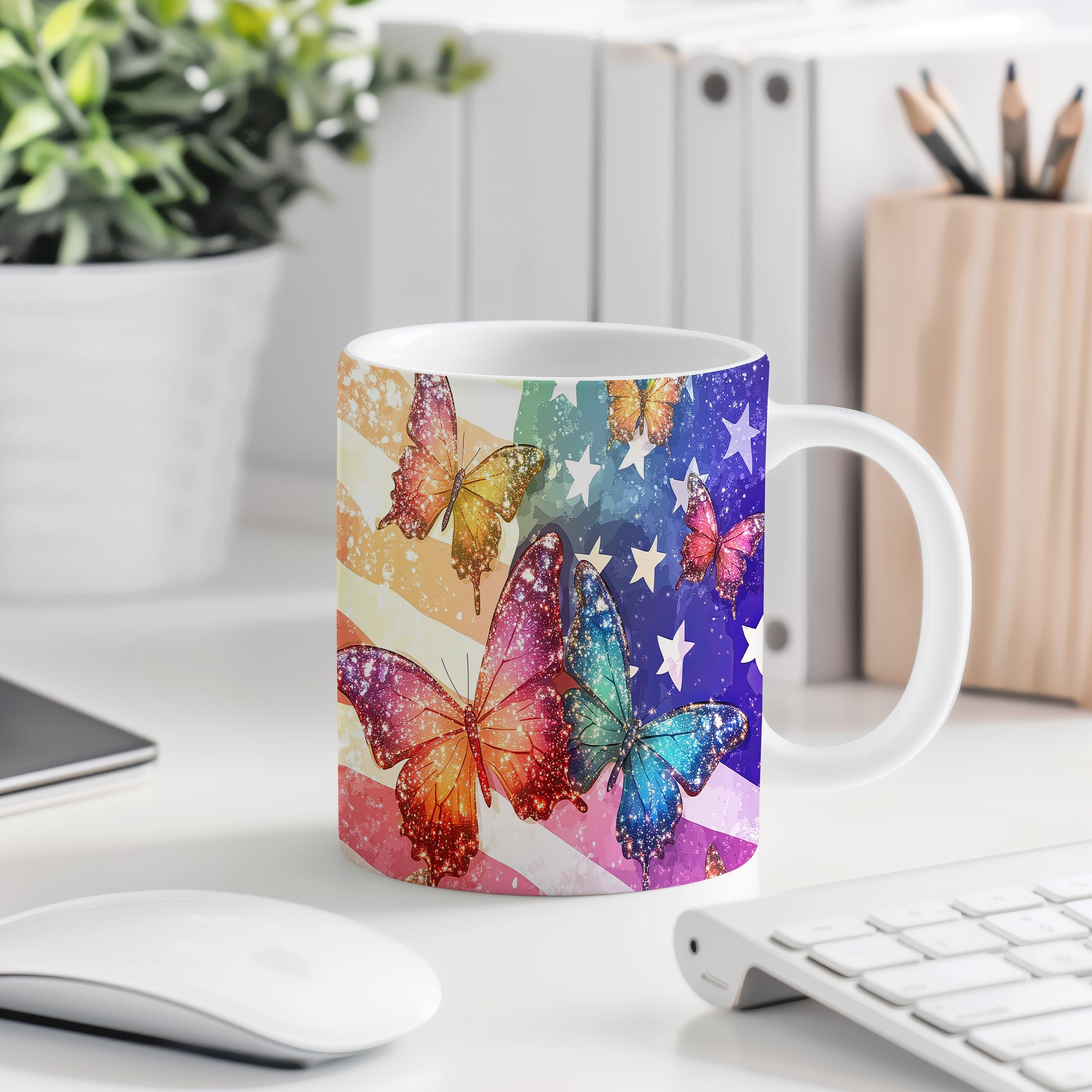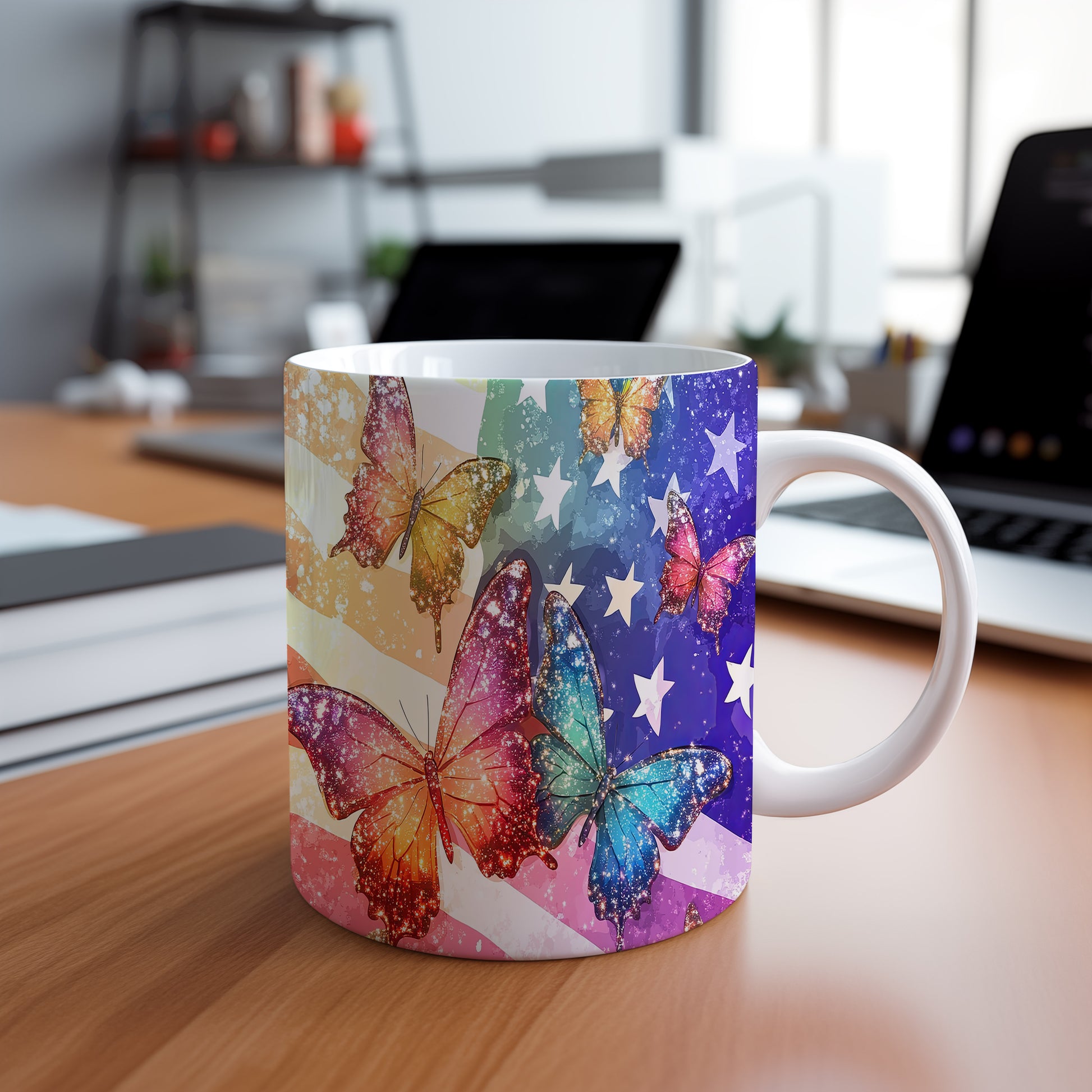 Hrnek s motivem barevných motýlů na veselém pozadí. Tento stylový kousek je ideální pro milovníky přírody a originálních designů, skvělý tip na dárek pro blízké. Materiál: keramika. Objem: 330 ml. Vhodné do myčky i mikrovlnky. Používání tohoto hrnku přináší radost z každého doušku.