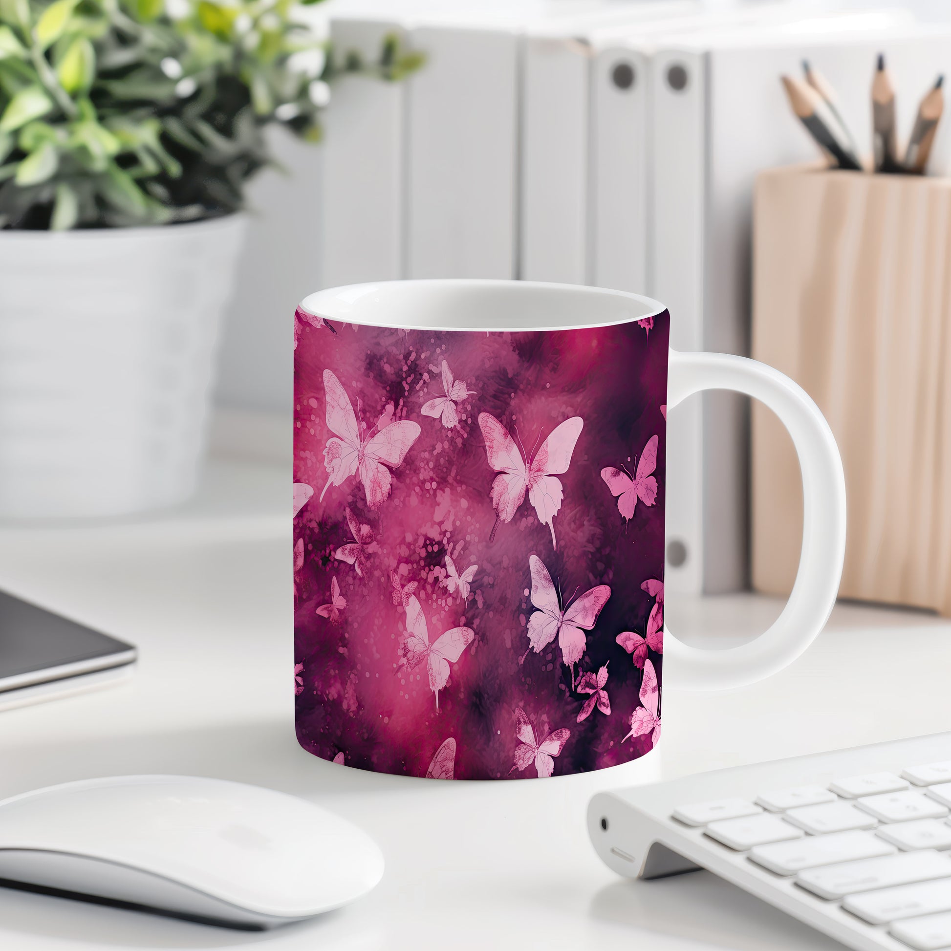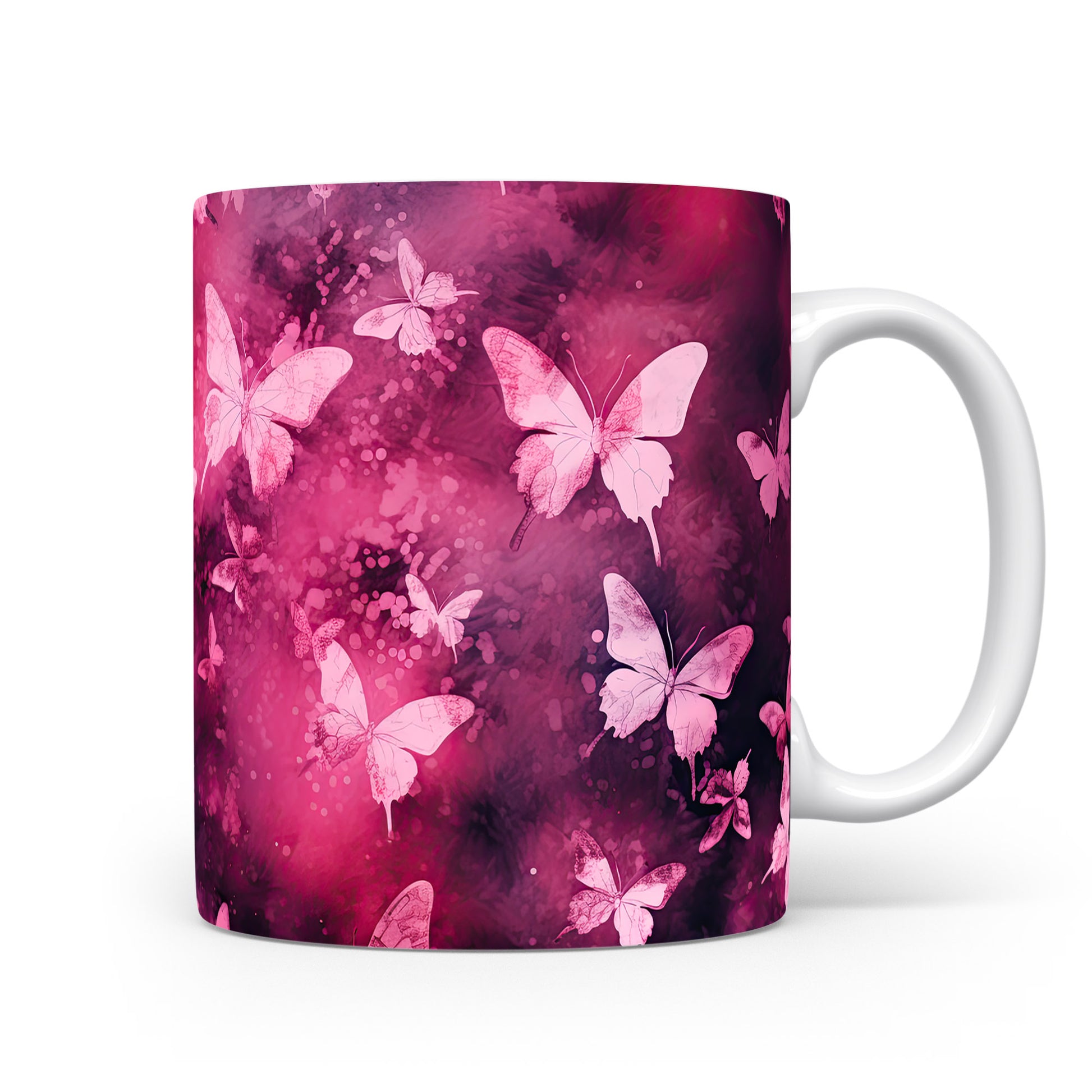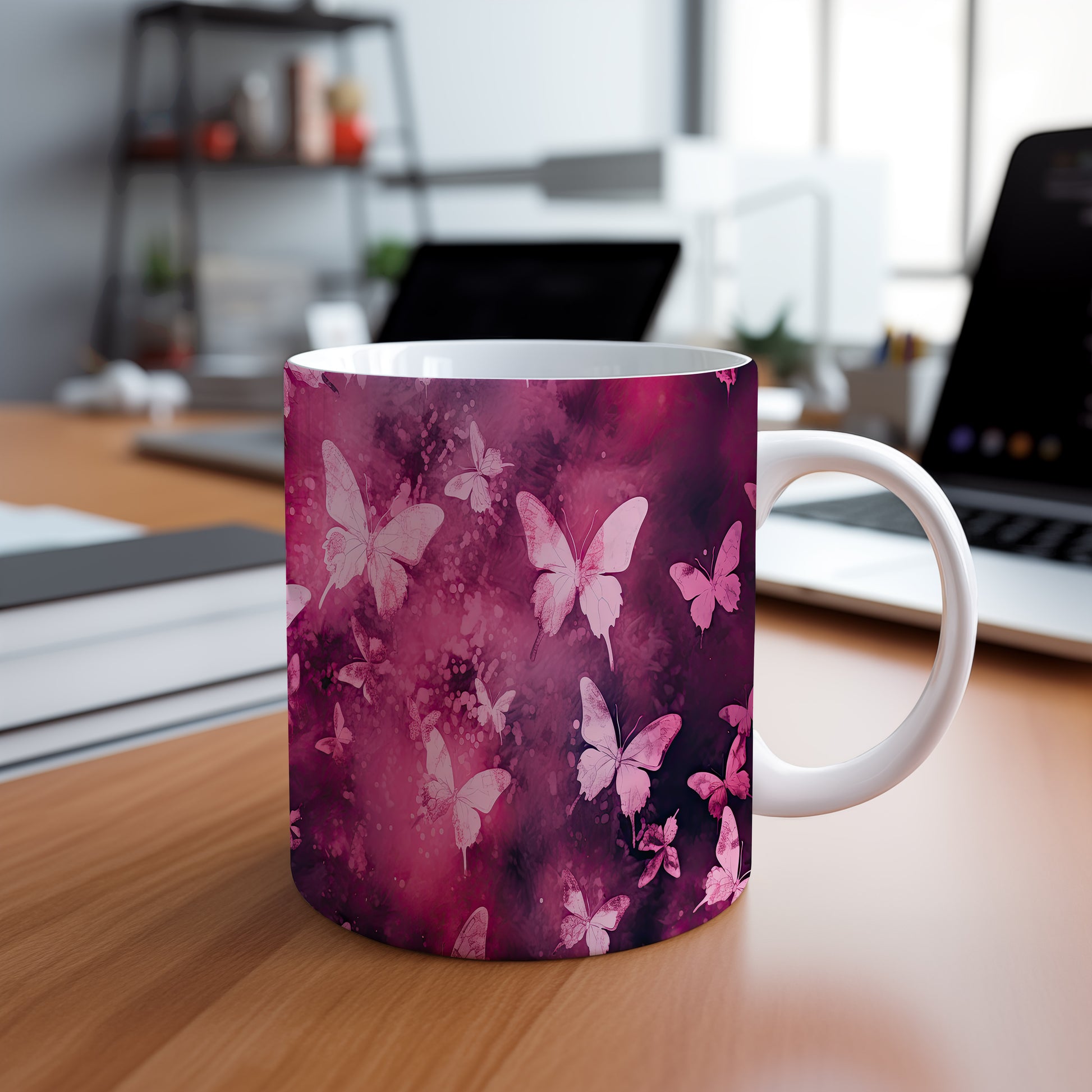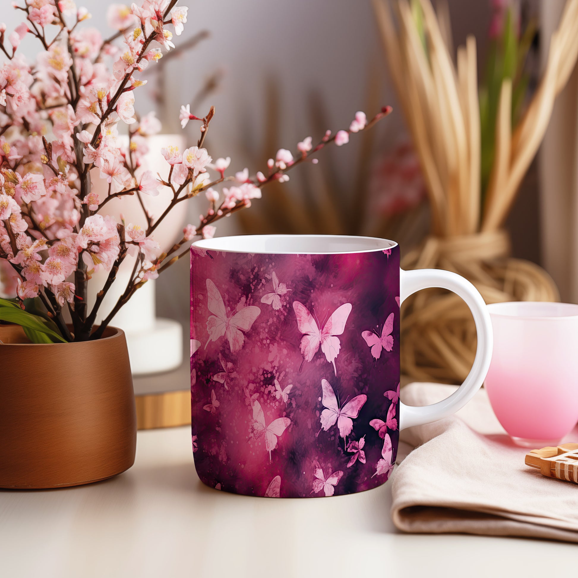 Hrnek s motýly na růžovém pozadí