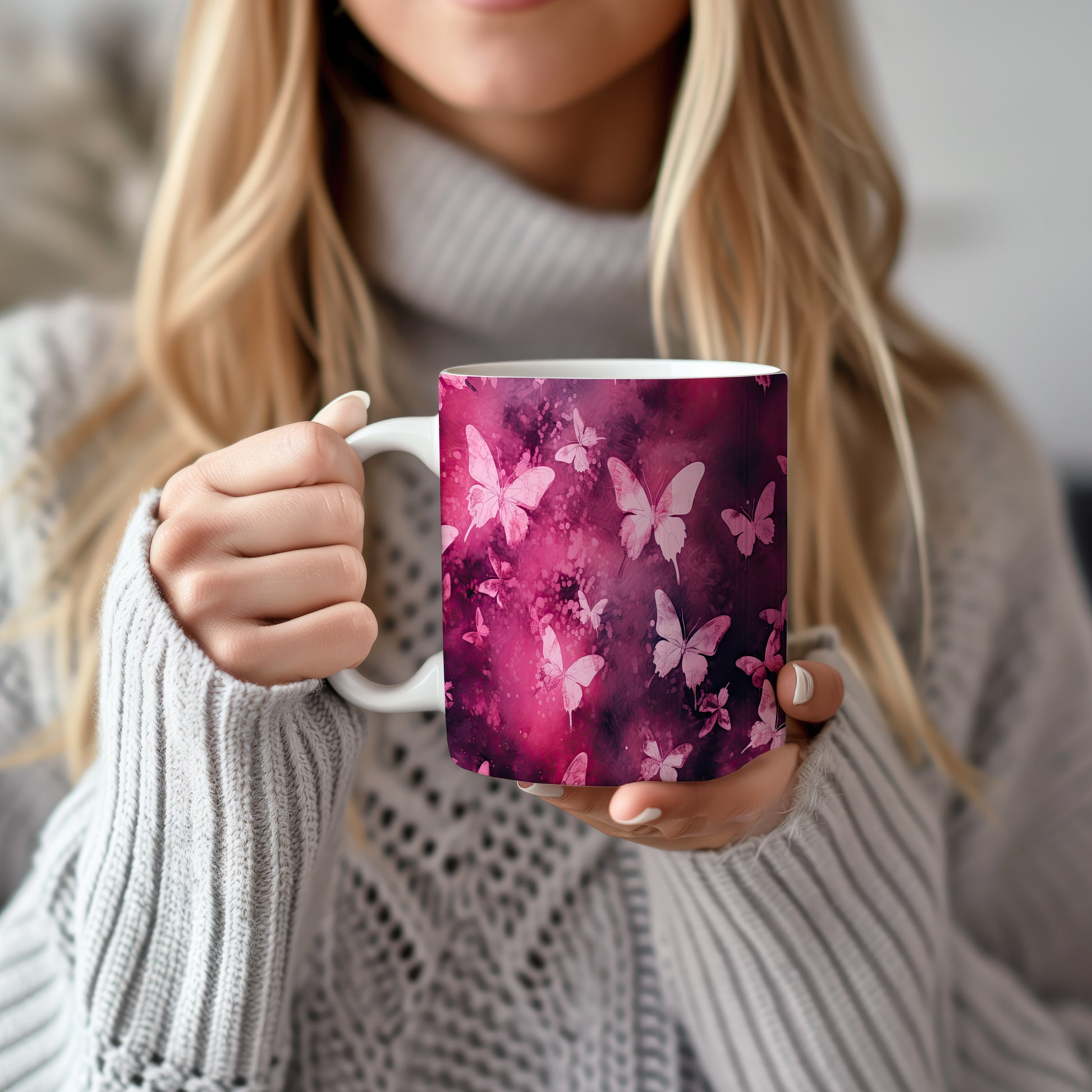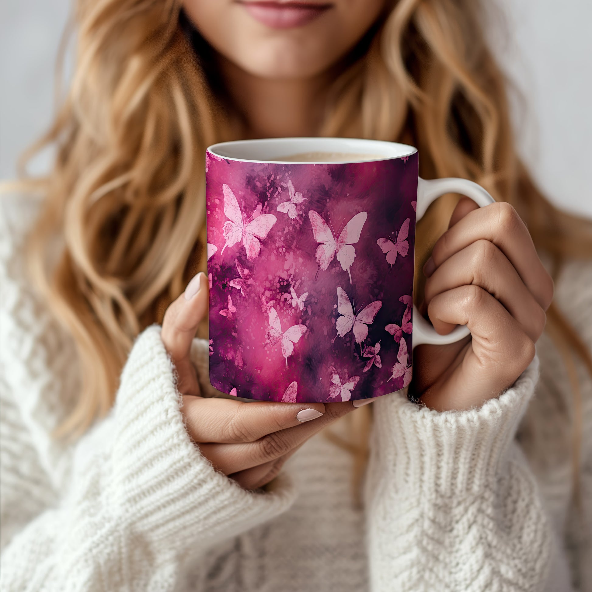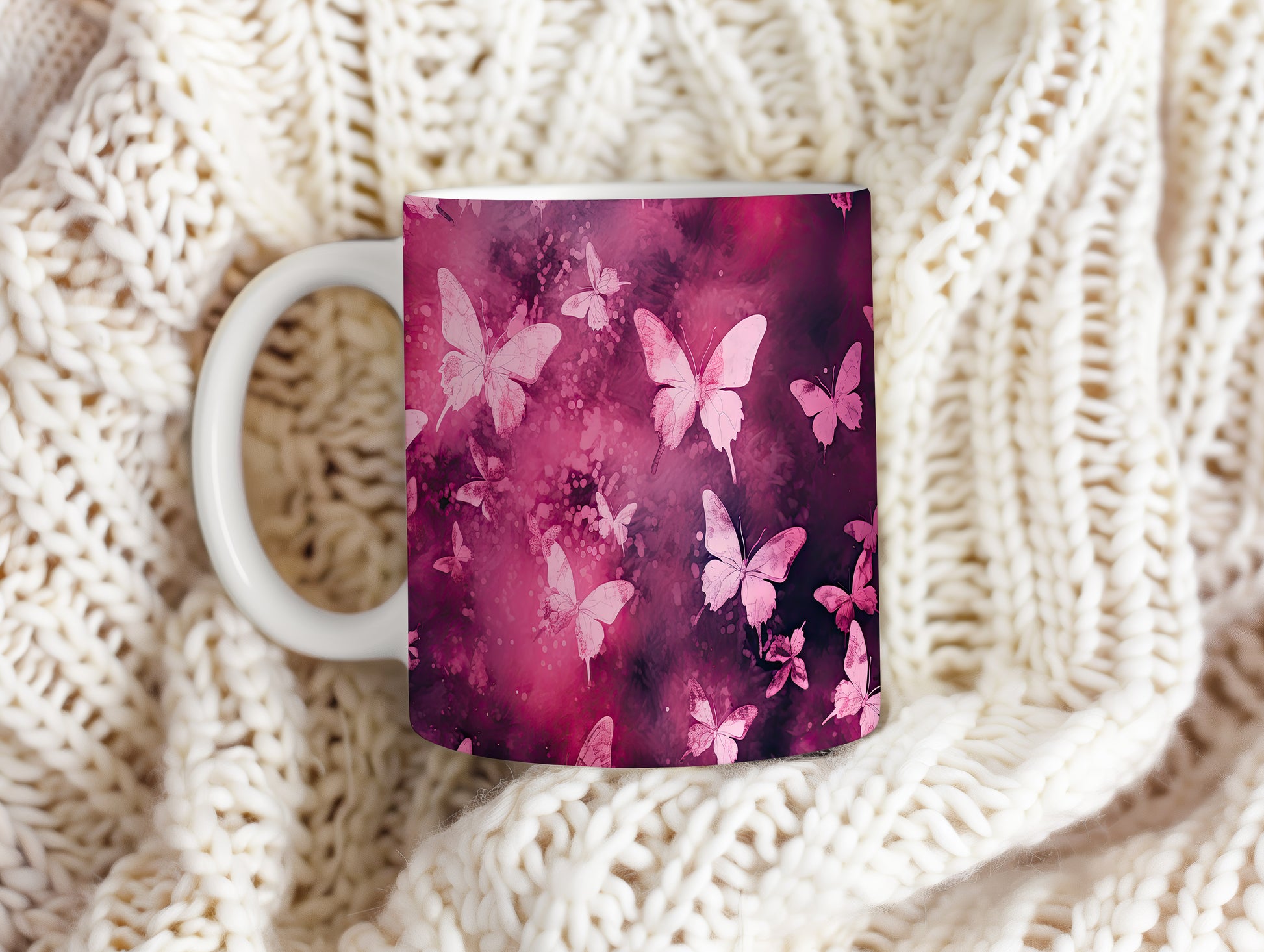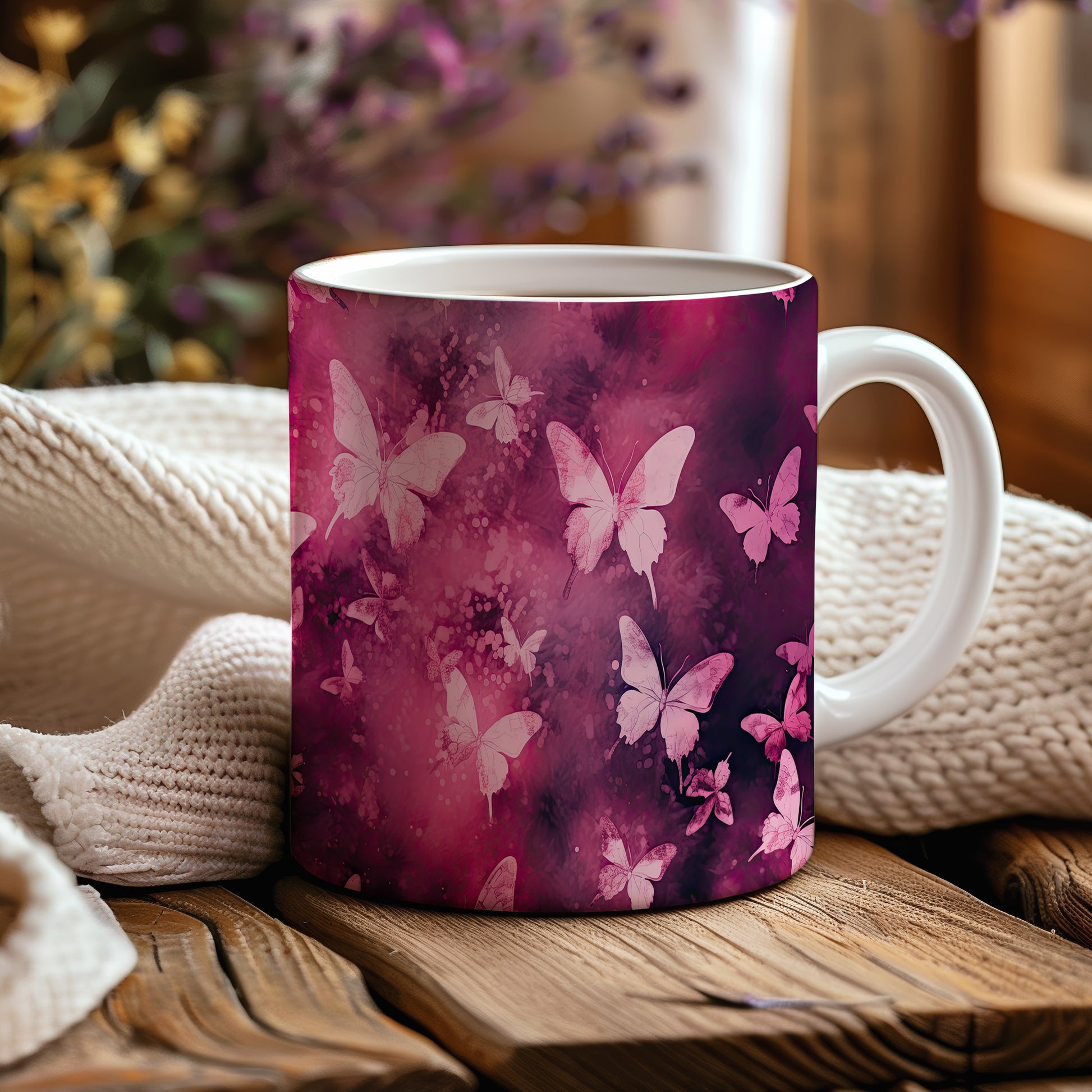 Hrnek s motýly na růžovém pozadí