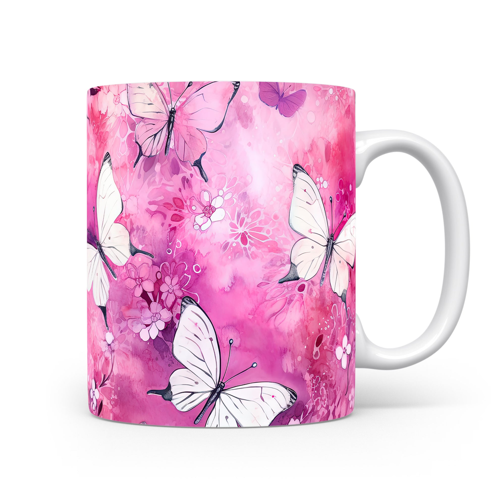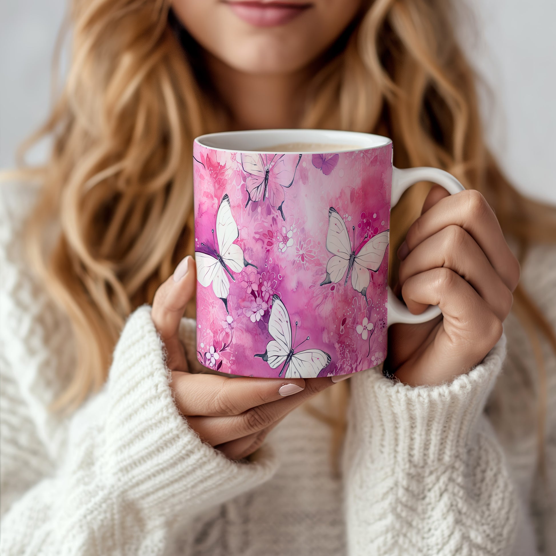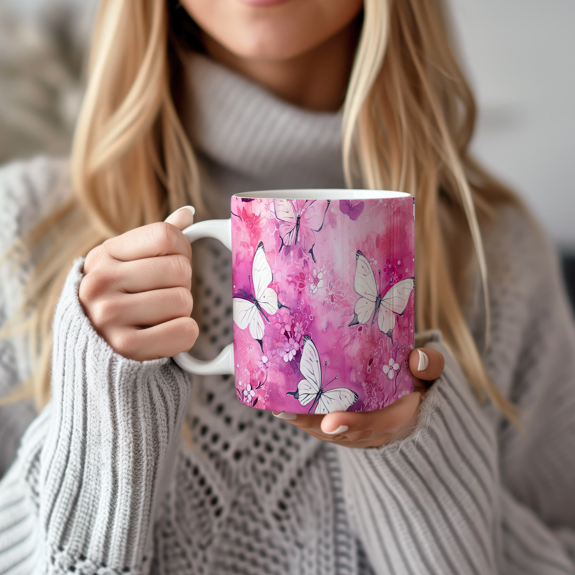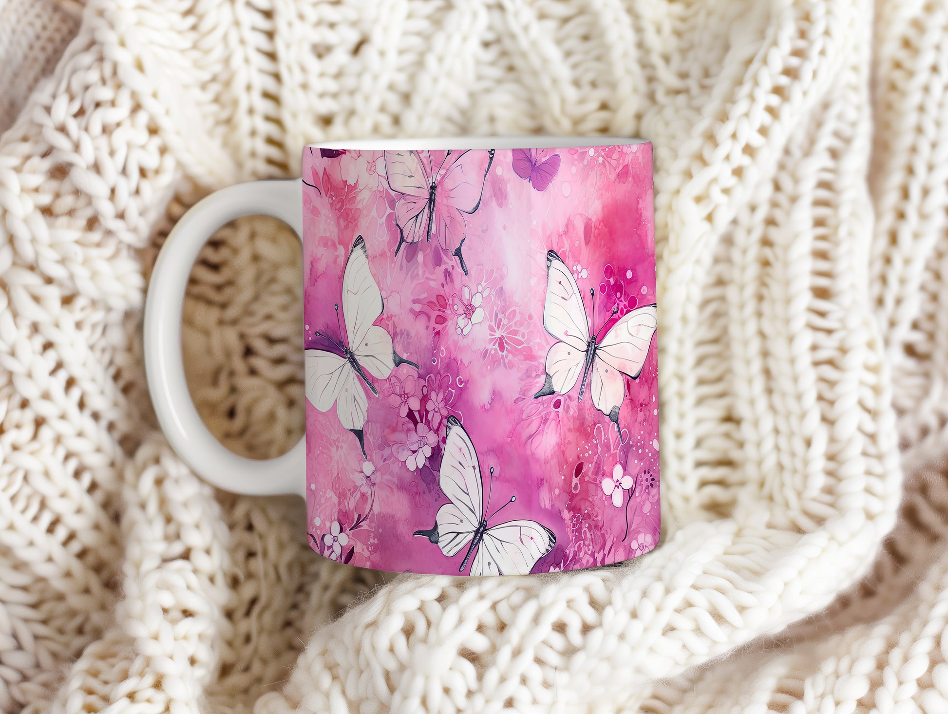Hrnek s motýly na růžovém pozadí – bílým provedením