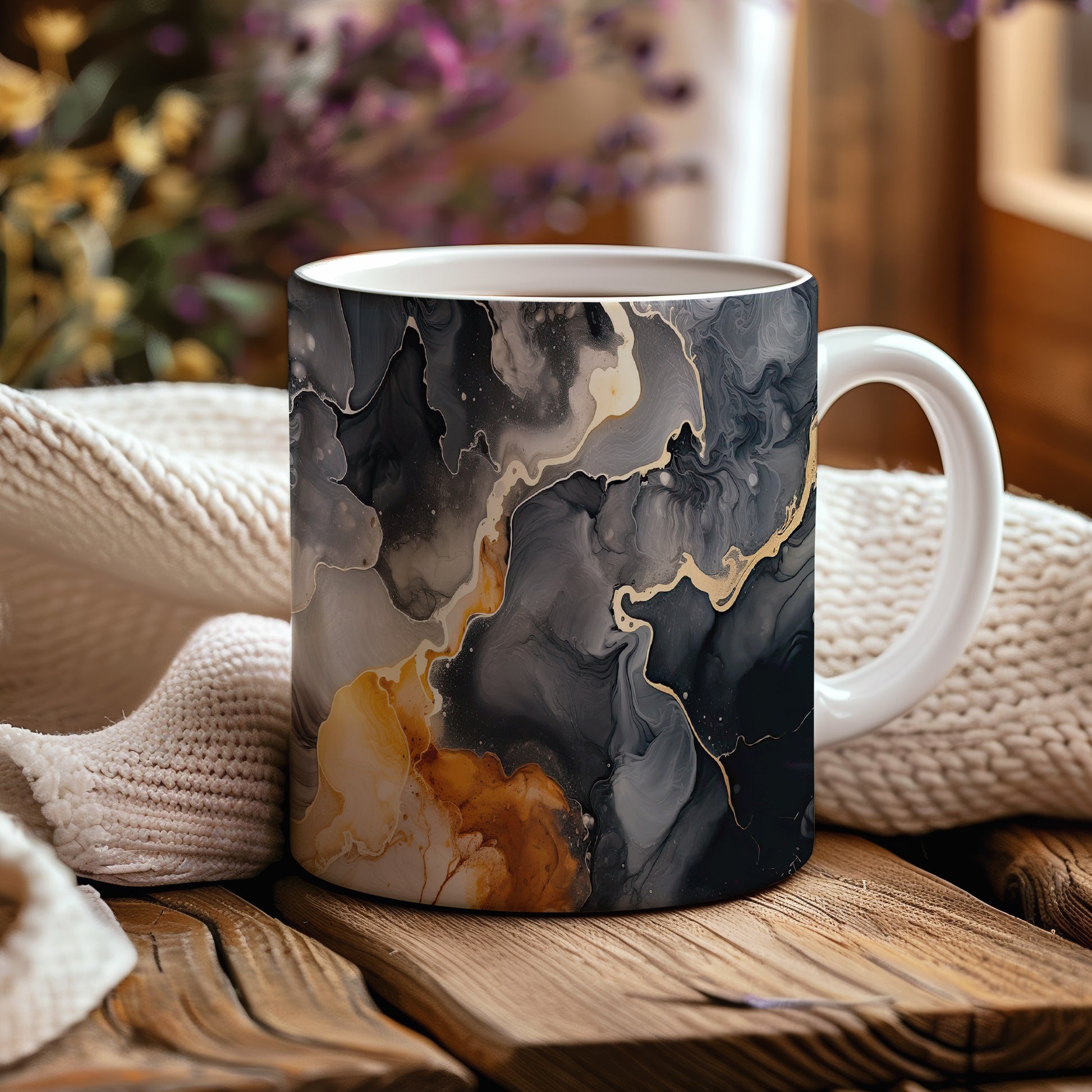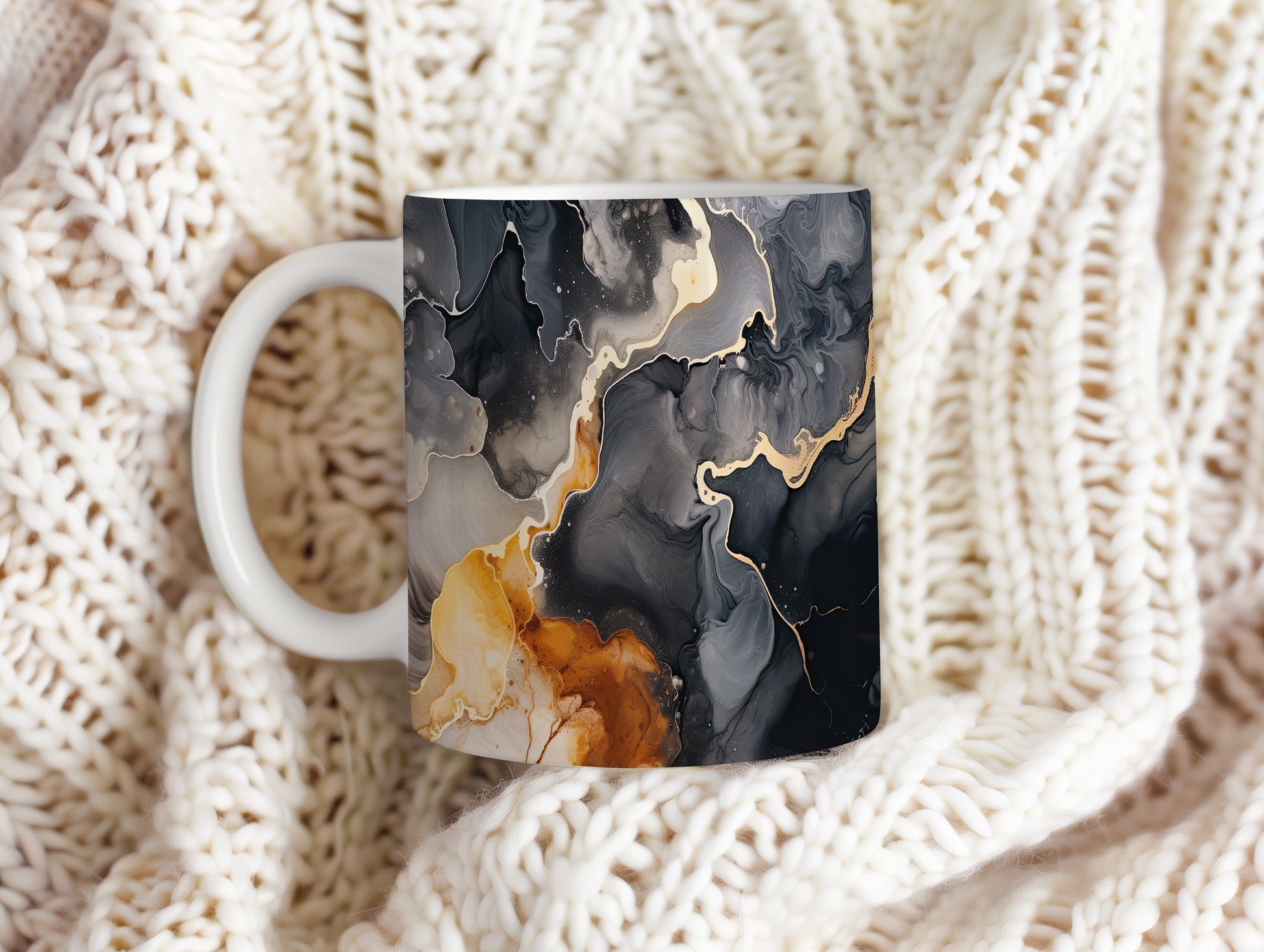 Hrnek s mramorováním v černé a zlaté barvě – černobílým motivem