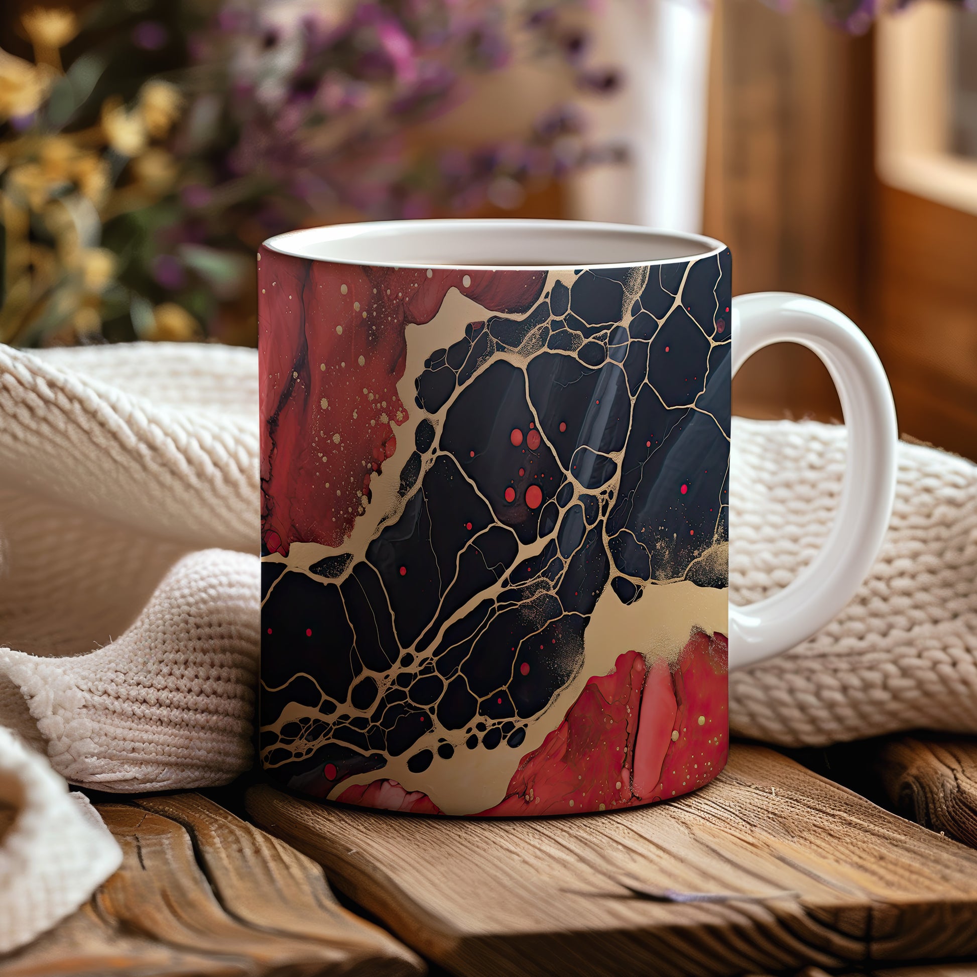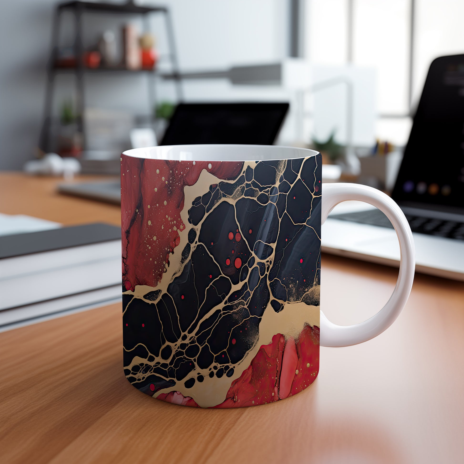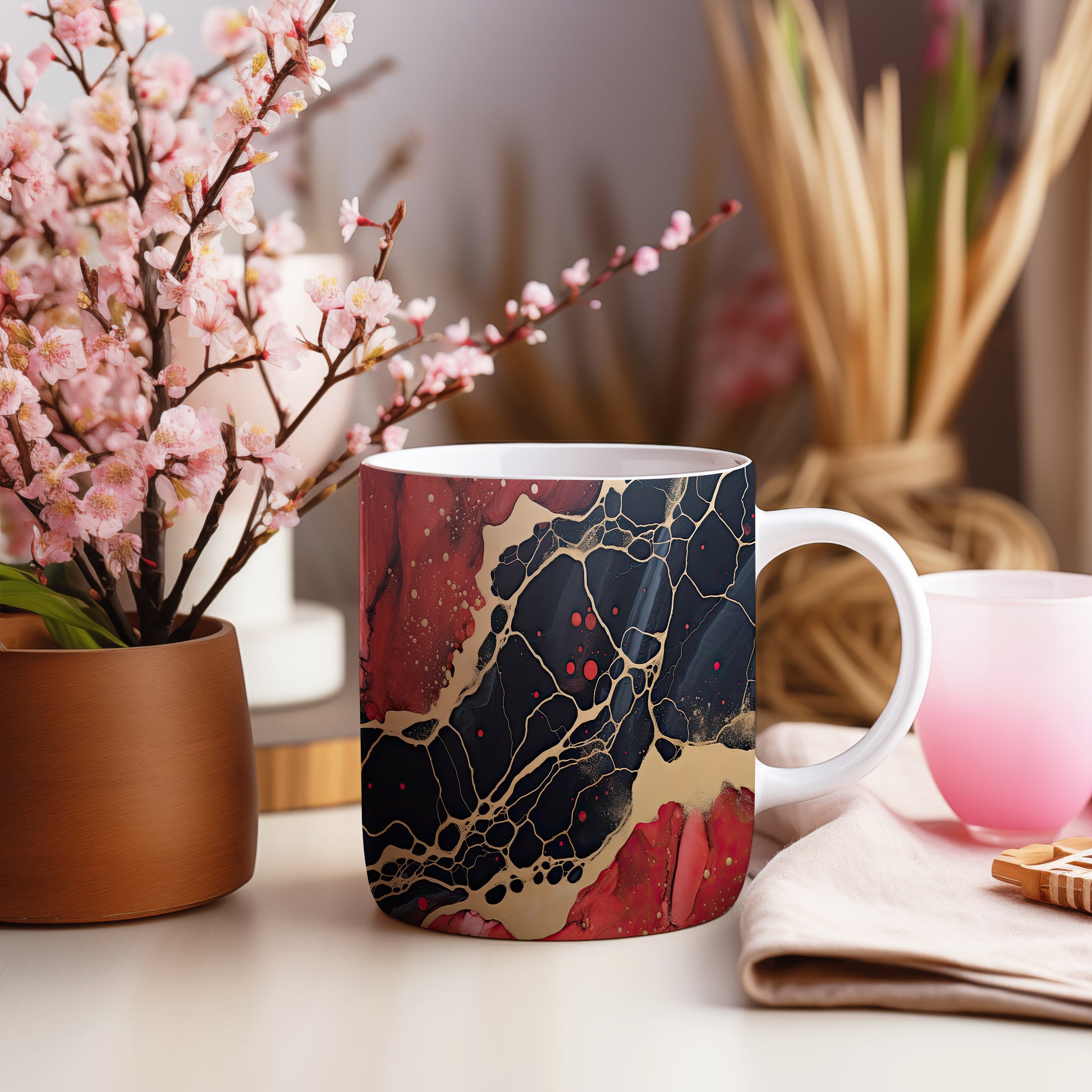 Tento hrnek s mramorováním v černých a červených tónech přináší elegantní a luxusní vzhled. Je ideální pro milovníky stylového nádobí a skvělým dárkem pro přátele či rodinu. Materiál: keramika. Objem: 330 ml. Vhodné do myčky i mikrovlnky. Díky svému designu dodá každému nápoji šmrnc a potěší oko.