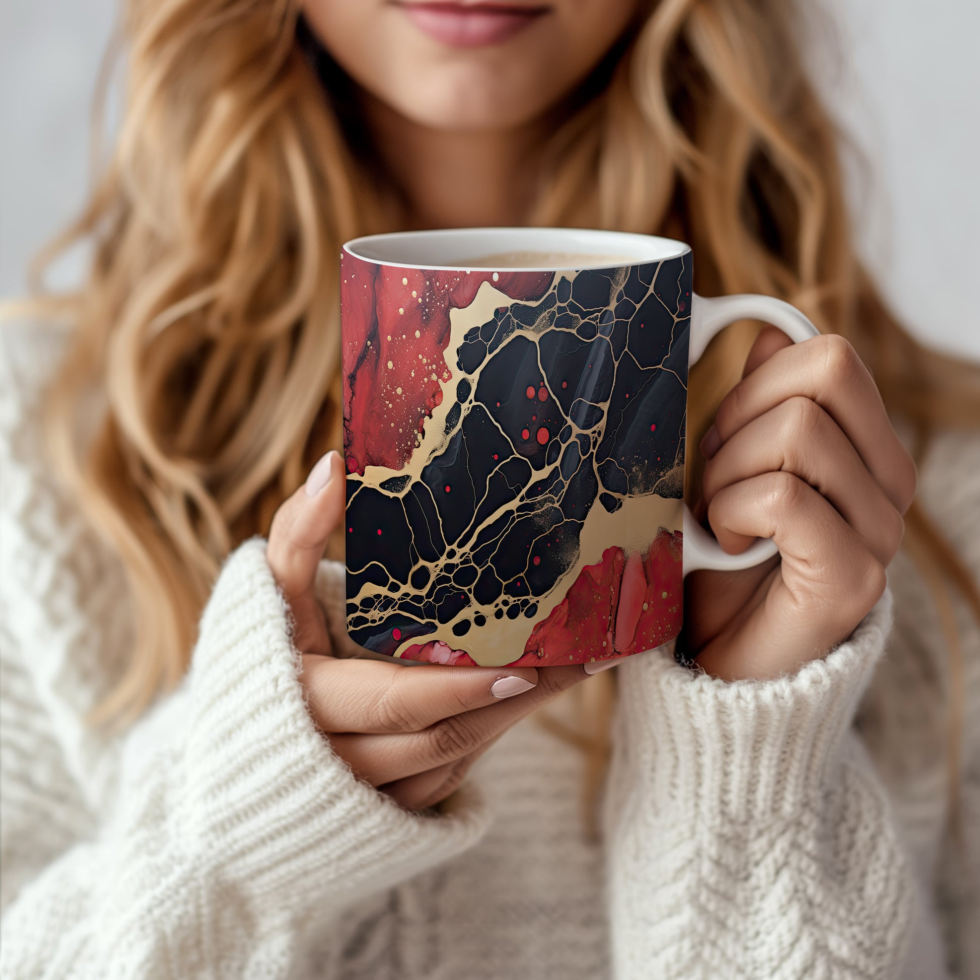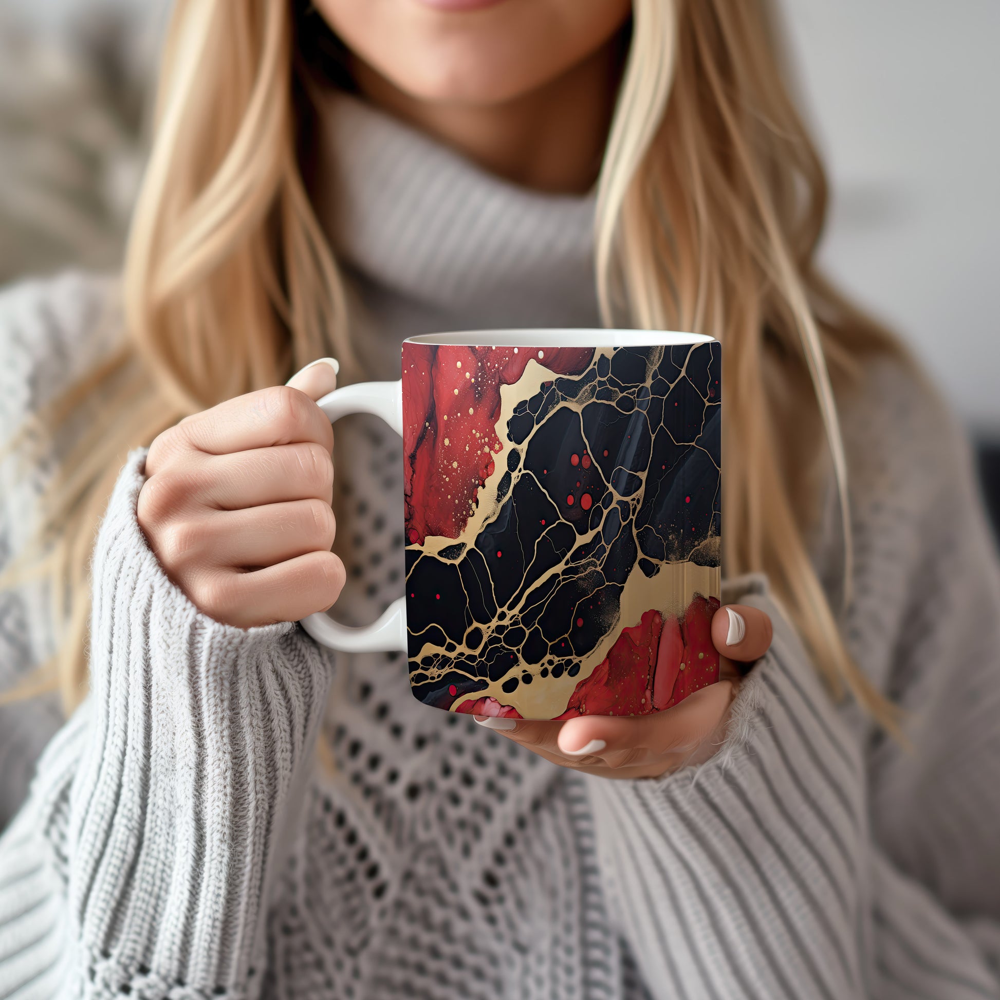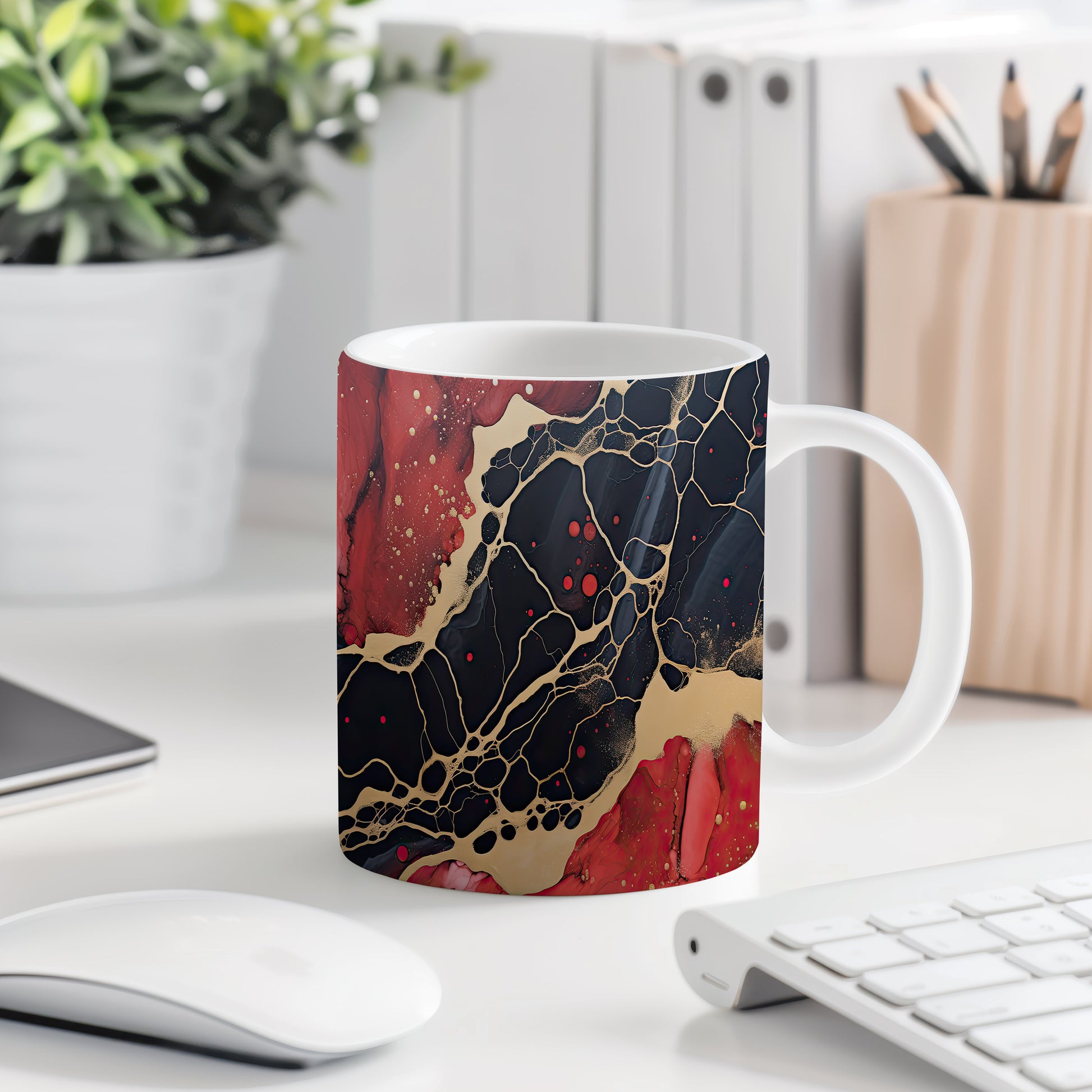Tento hrnek s mramorováním v černých a červených tónech přináší elegantní a luxusní vzhled. Je ideální pro milovníky stylového nádobí a skvělým dárkem pro přátele či rodinu. Materiál: keramika. Objem: 330 ml. Vhodné do myčky i mikrovlnky. Díky svému designu dodá každému nápoji šmrnc a potěší oko.