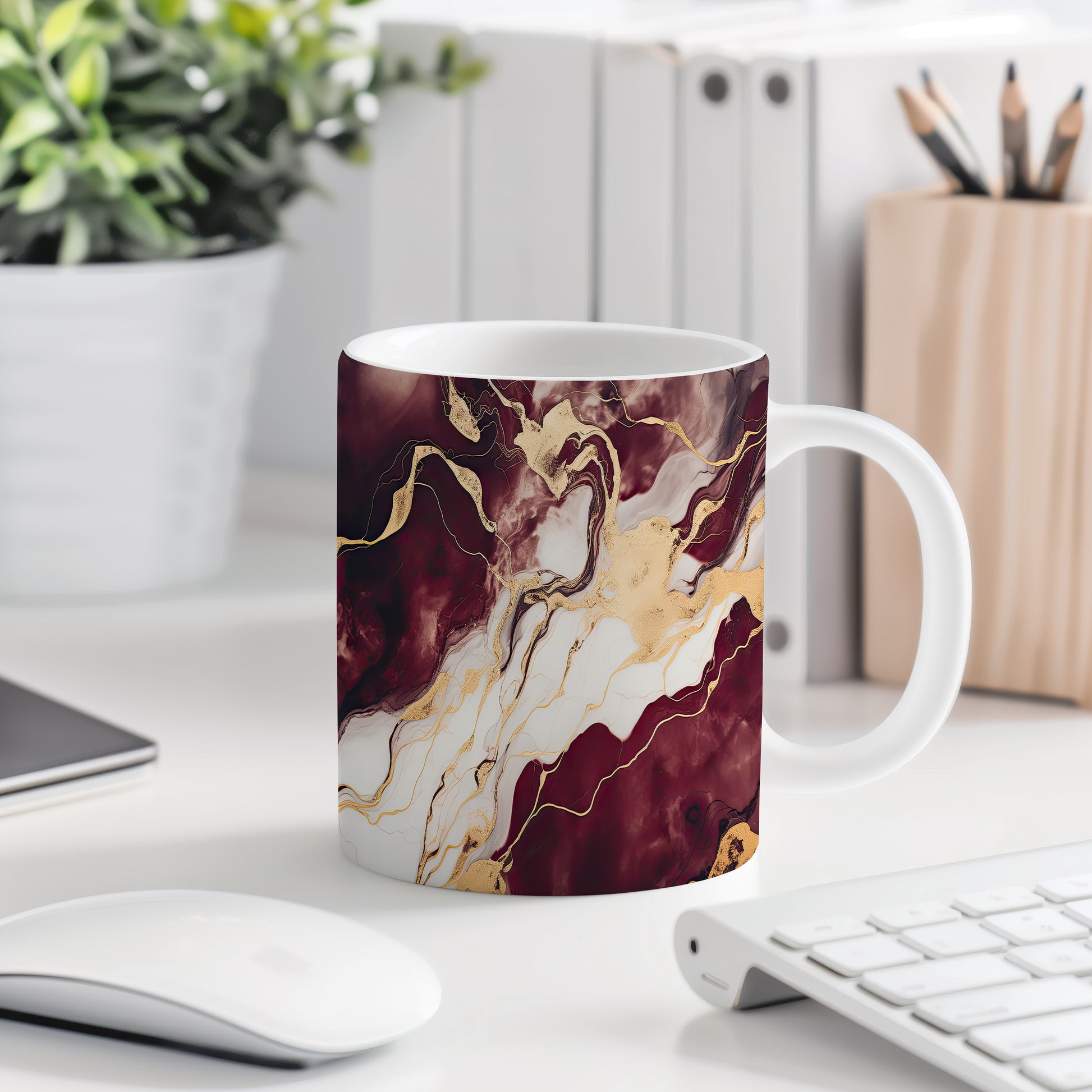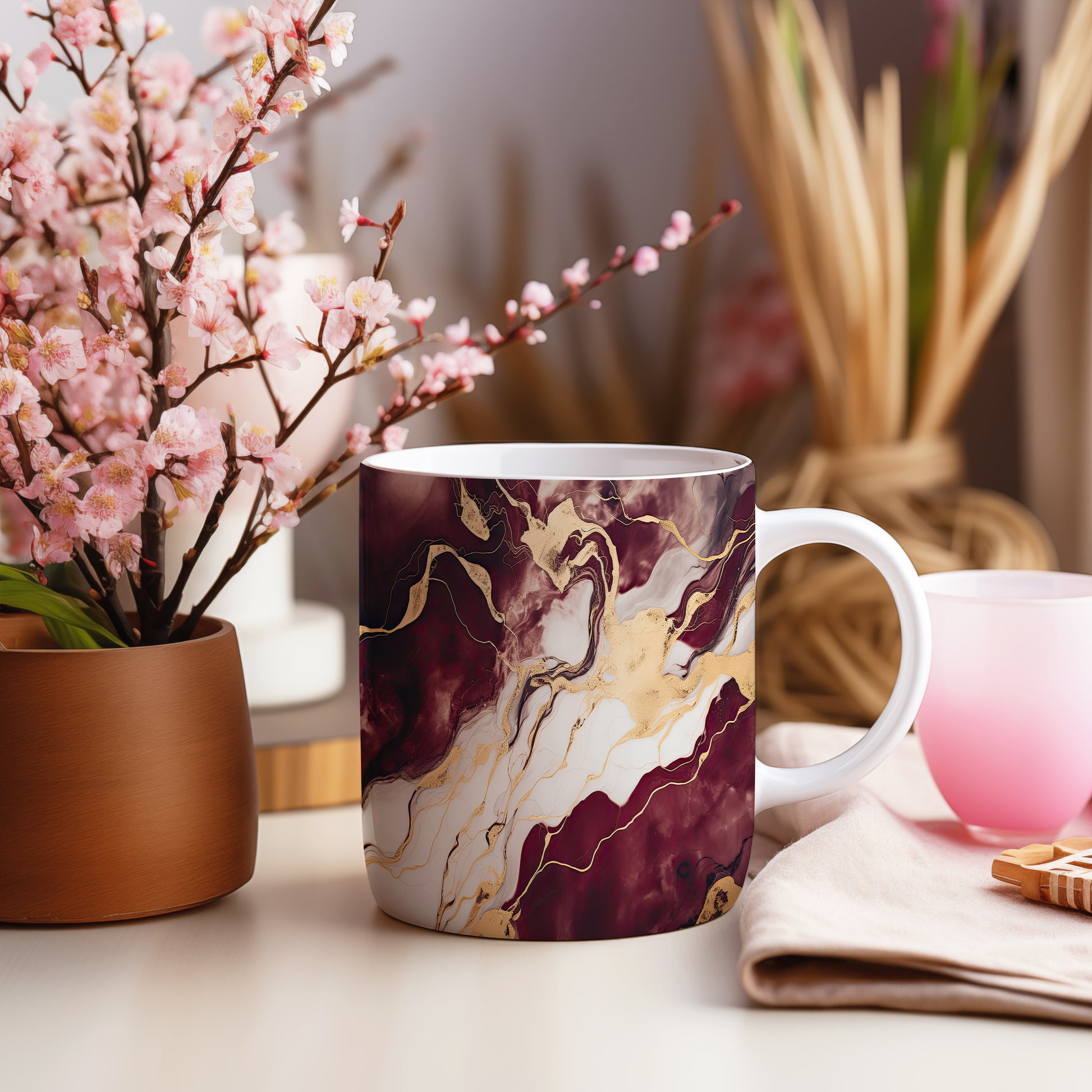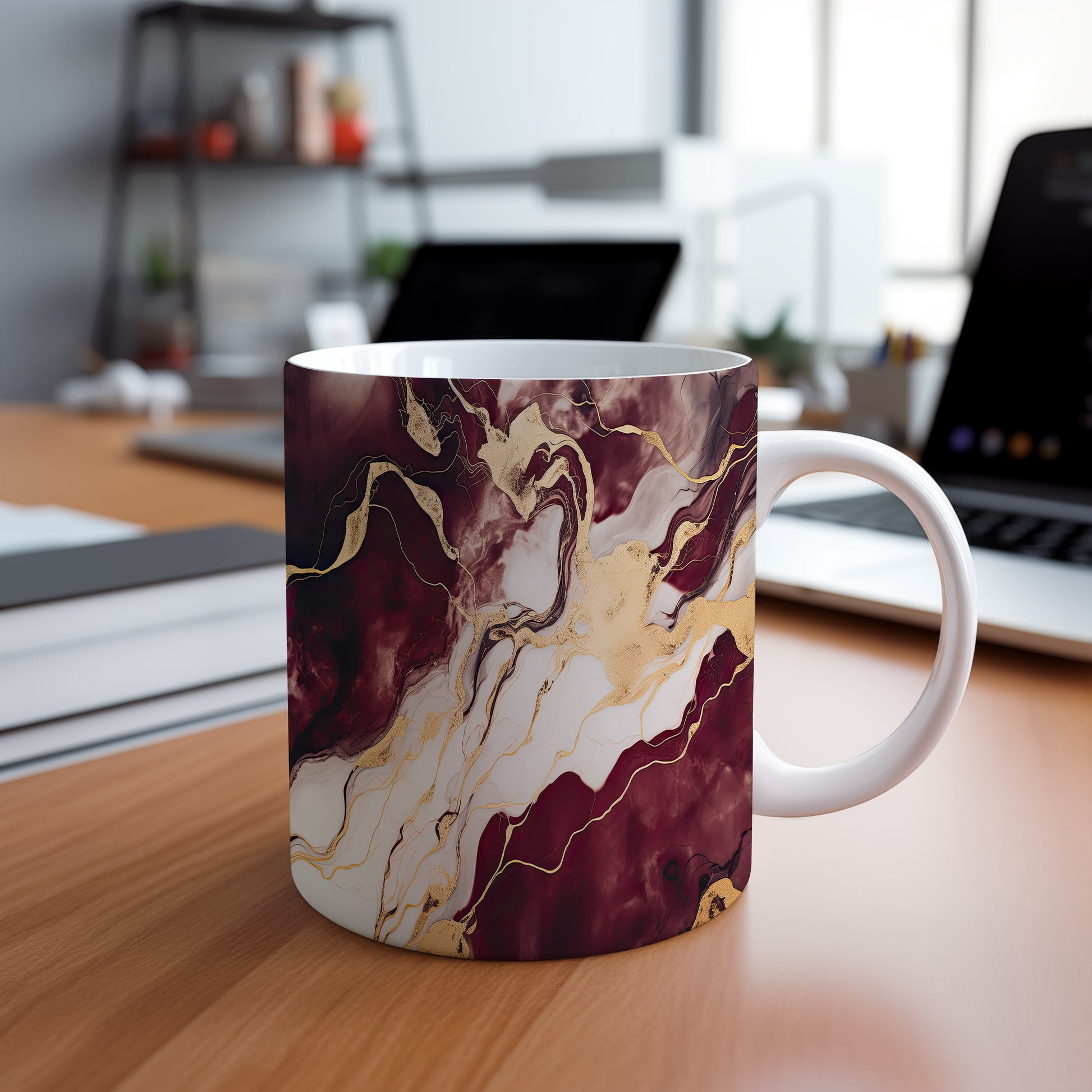 Hrnek s mramorováním v červenohnědých a zlatých tónech přináší elegantní styl a přírodní vzhled. Je ideální pro milovníky designu a skvělým dárkem pro každého, kdo ocení krásu v jednoduchosti. Materiál: keramika. Objem: 330 ml. Vhodné do myčky i mikrovlnky. Tento hrnek dodá vašemu pití šmrnc a potěší oko při každém doušku.