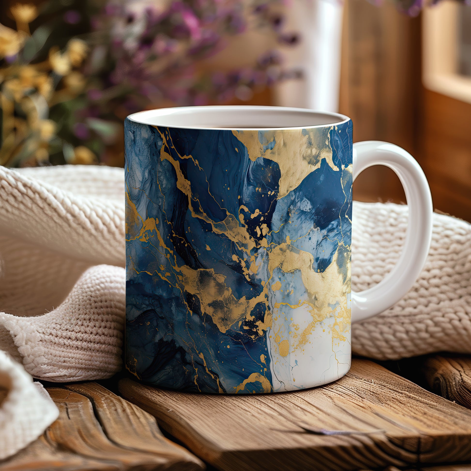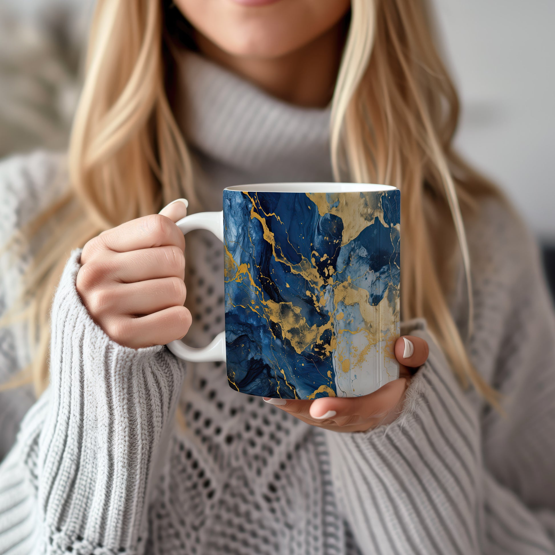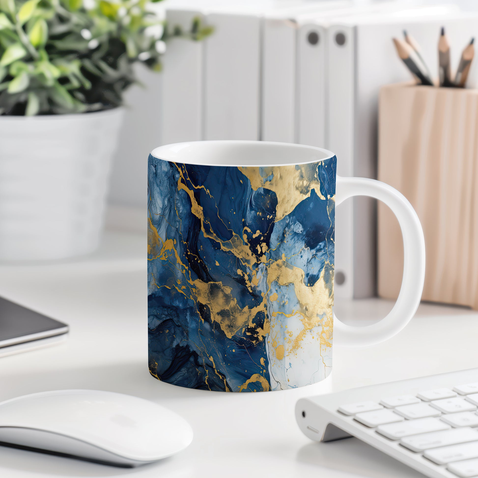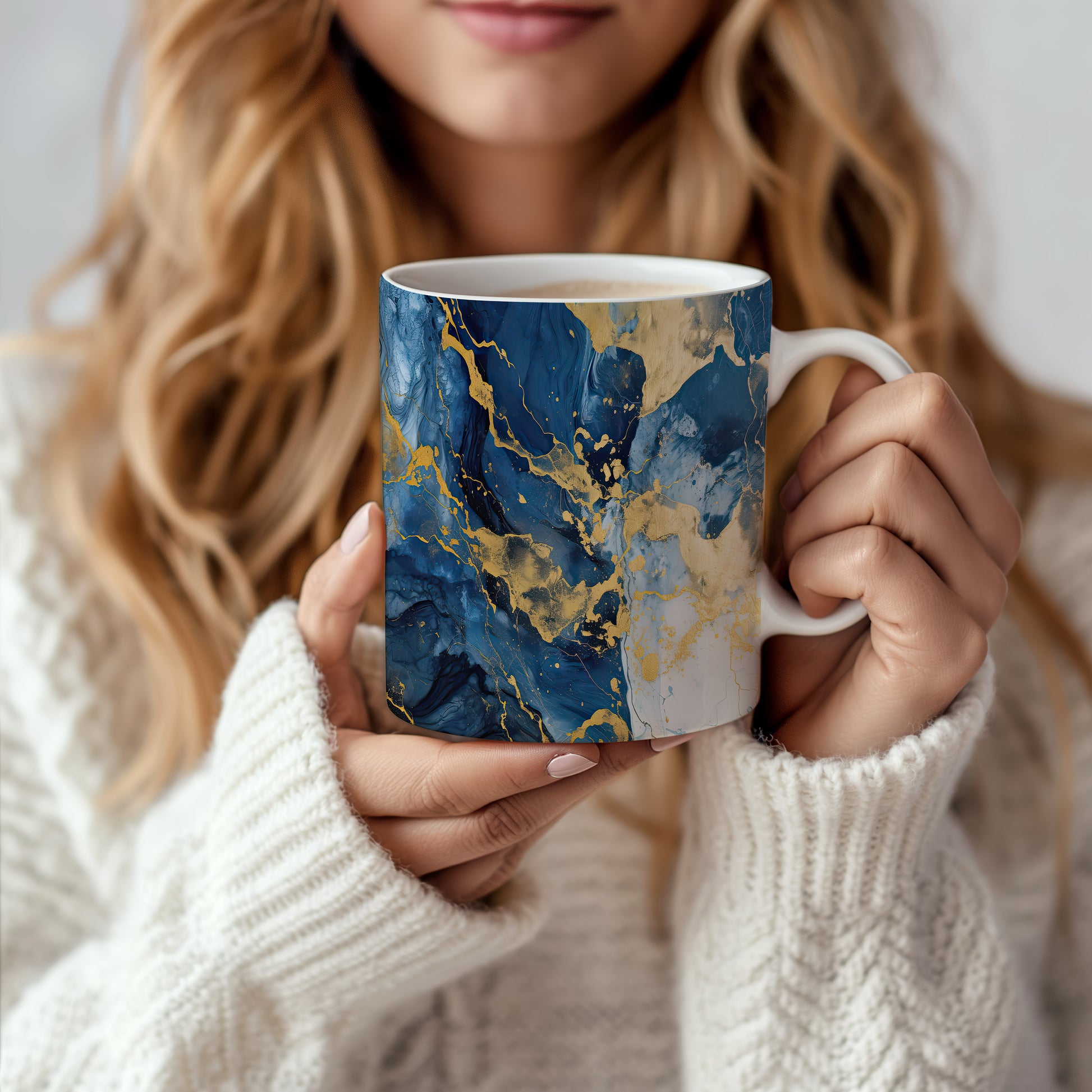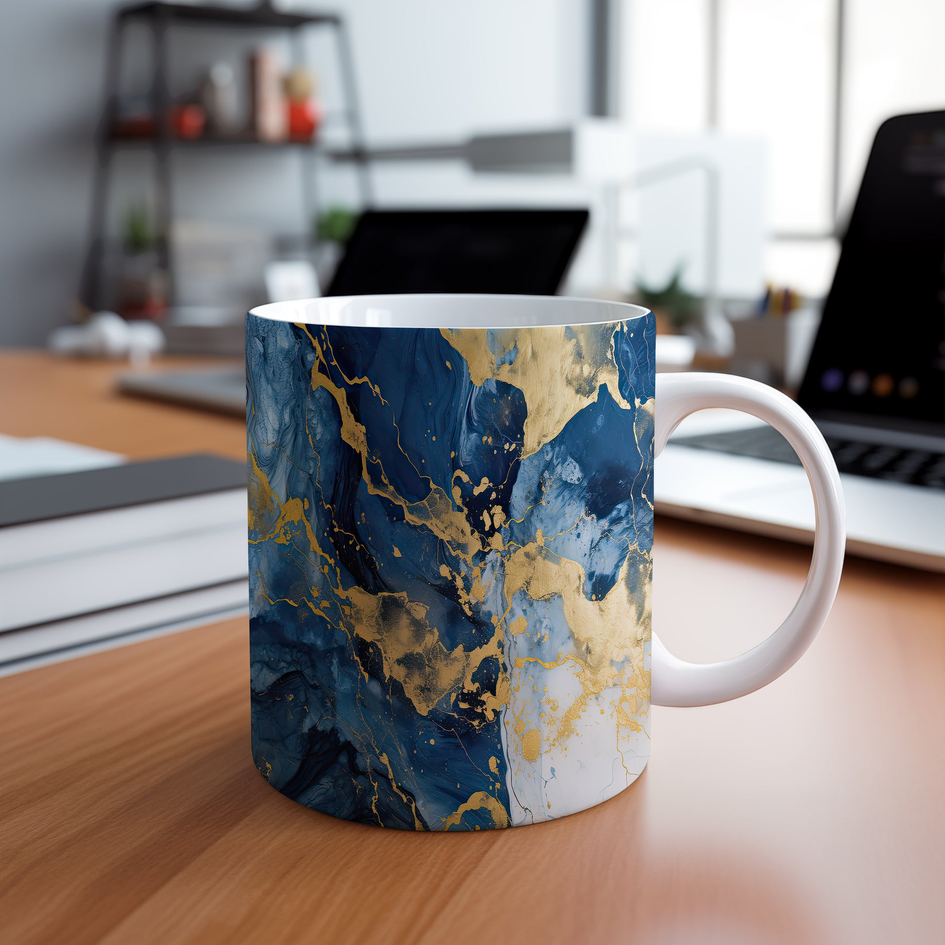 Hrnek s mramorováním v modré a zlaté přináší elegantní a moderní vzhled. Je ideální pro milovníky stylového nádobí a skvělým dárkem pro přátele či rodinu. Materiál: keramika. Objem: 330 ml. Vhodné do myčky i mikrovlnky. Díky svému designu dodá každému nápoji šmrnc a potěší oko.