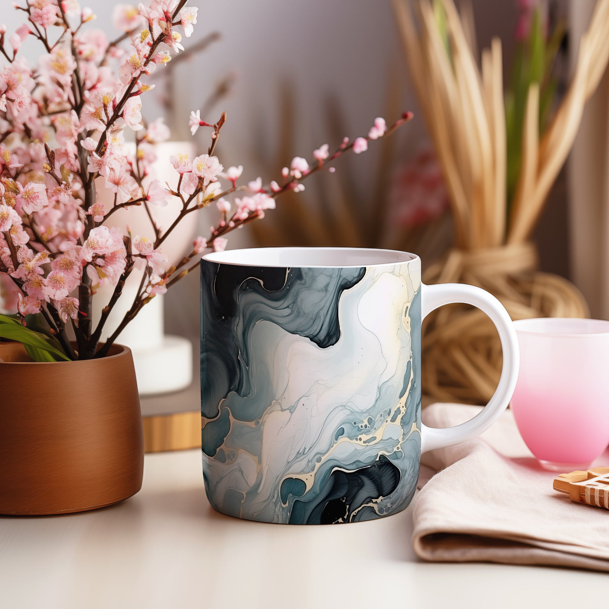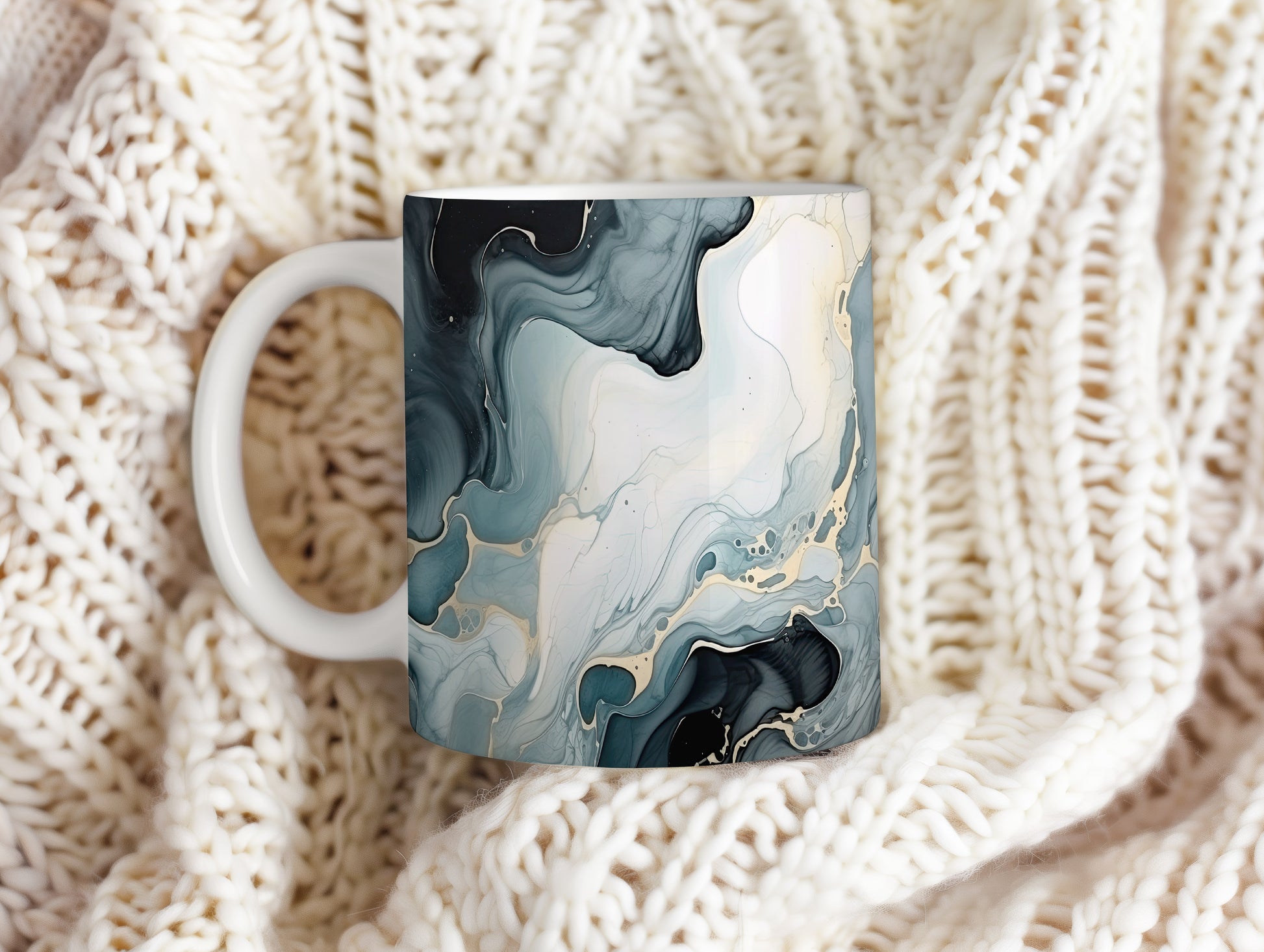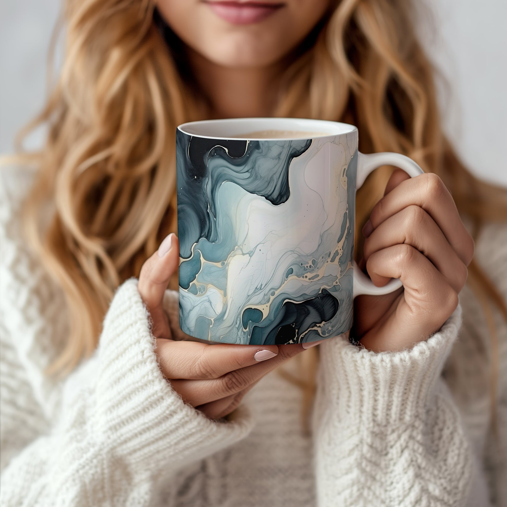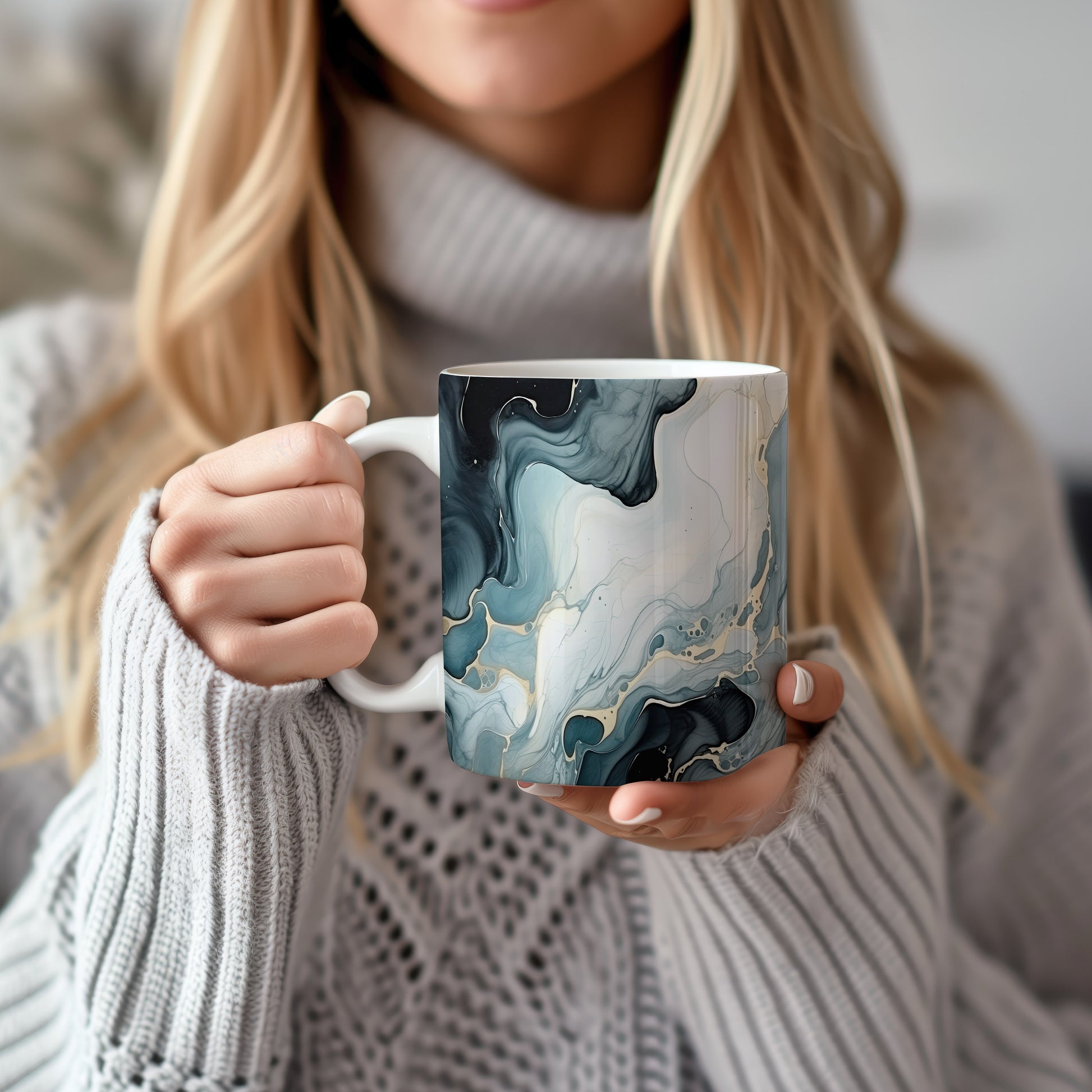 Motiv hrnku zobrazuje mramorování s jemnými přechody mezi modrými a béžovými odstíny. Tento styl je ideální pro milovníky originálního designu a skvělým dárkem pro přátele či rodinu. Hrnky o objemu 330 ml jsou vyrobeny z keramiky, vhodné do myčky i mikrovlnky. Díky unikátnímu vzhledu každého kusu přinášejí do vašeho domova jedinečnou atmosféru.