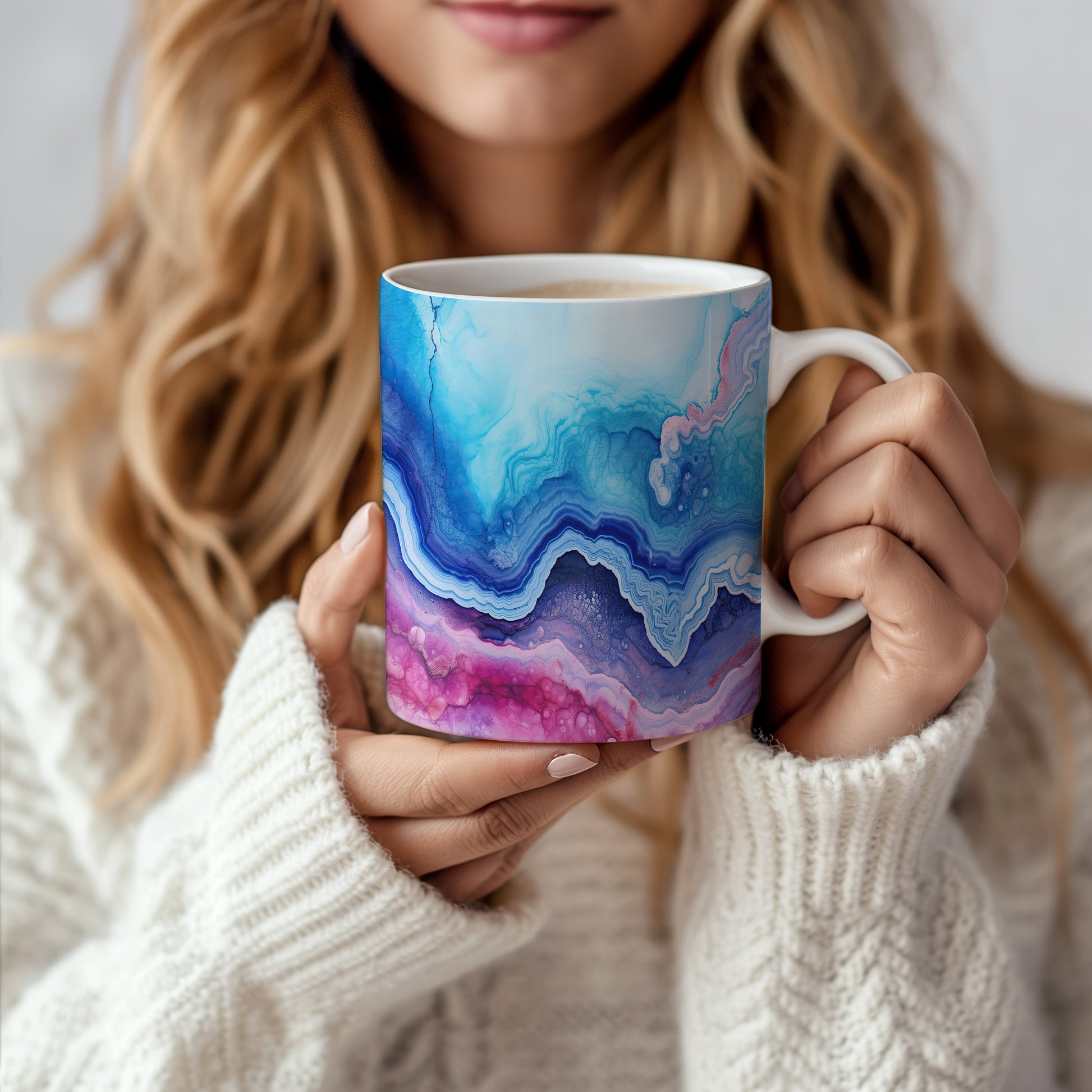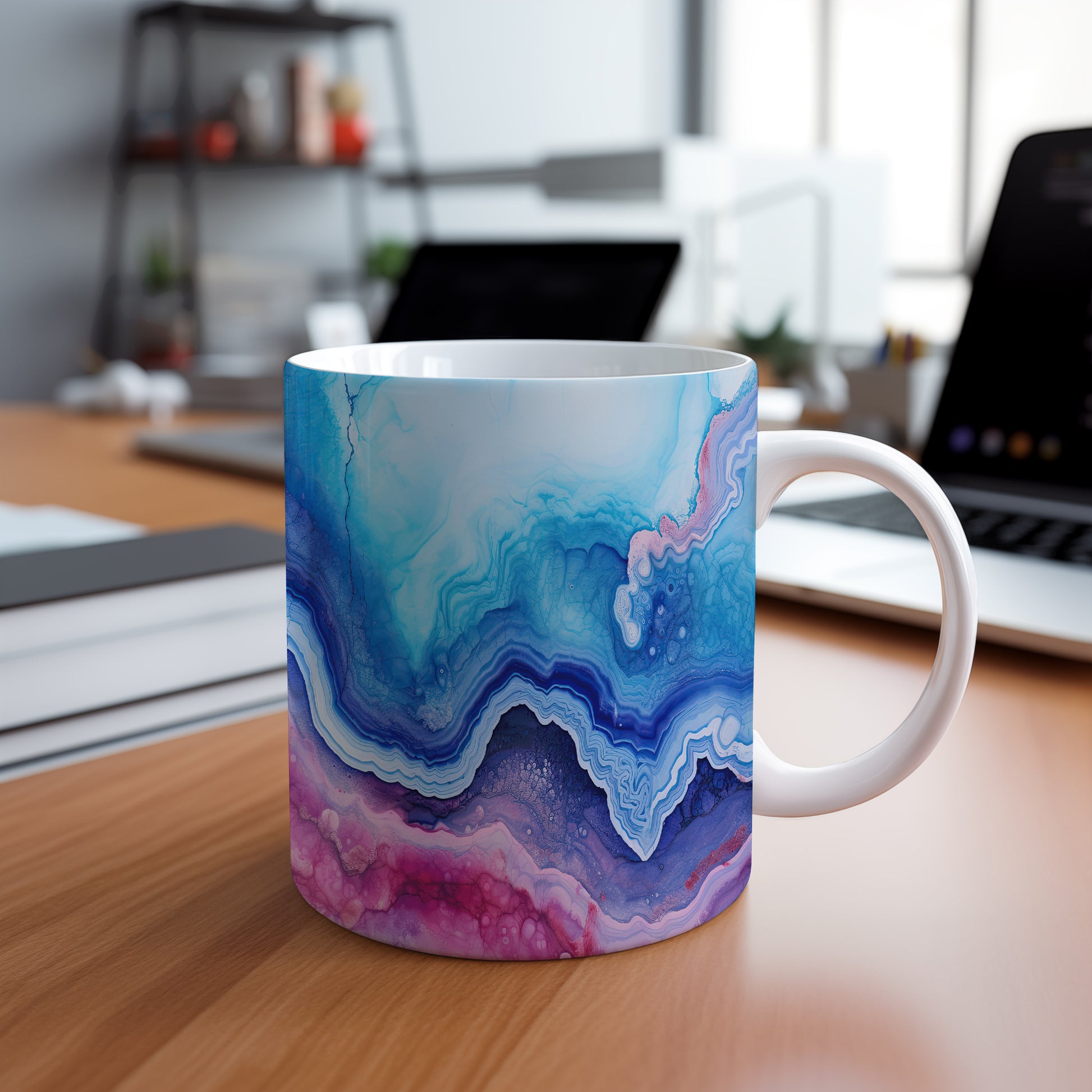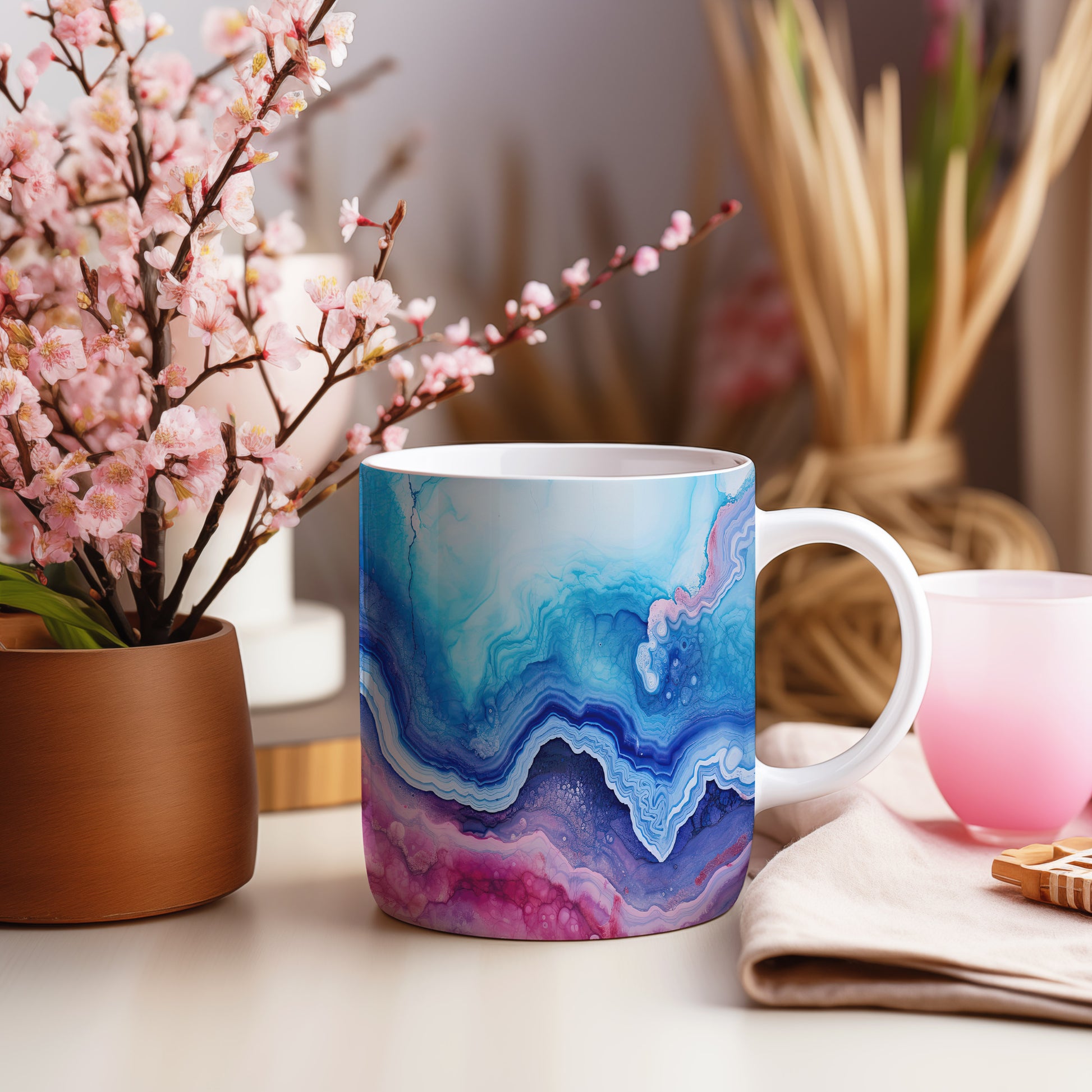 Tento hrnek s mramorováním v modrých a růžových tónech přináší elegantní a moderní vzhled. Je ideální pro milovníky stylového nádobí a skvělým dárkem pro přátele či rodinu. Materiál: keramika. Objem: 330 ml. Vhodné do myčky i mikrovlnky. Díky svému jedinečnému designu přidá do každého nápoje špetku umění.