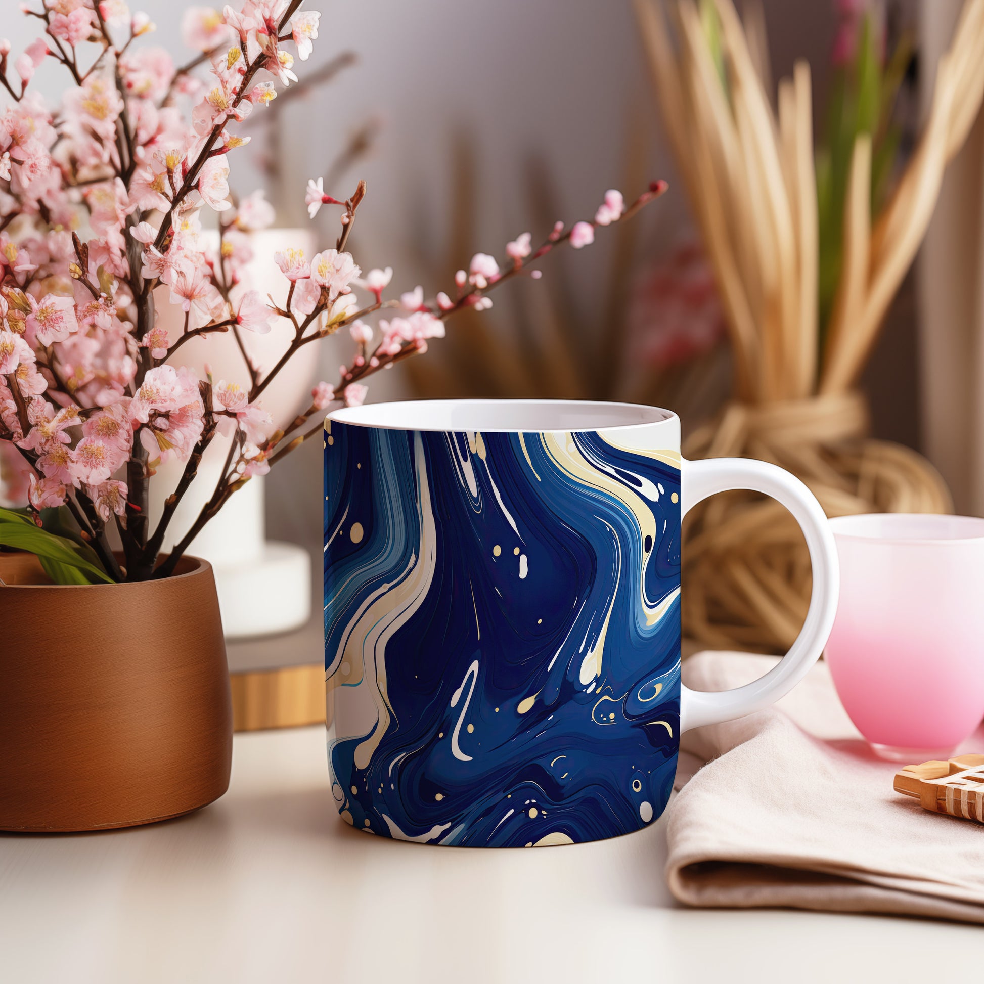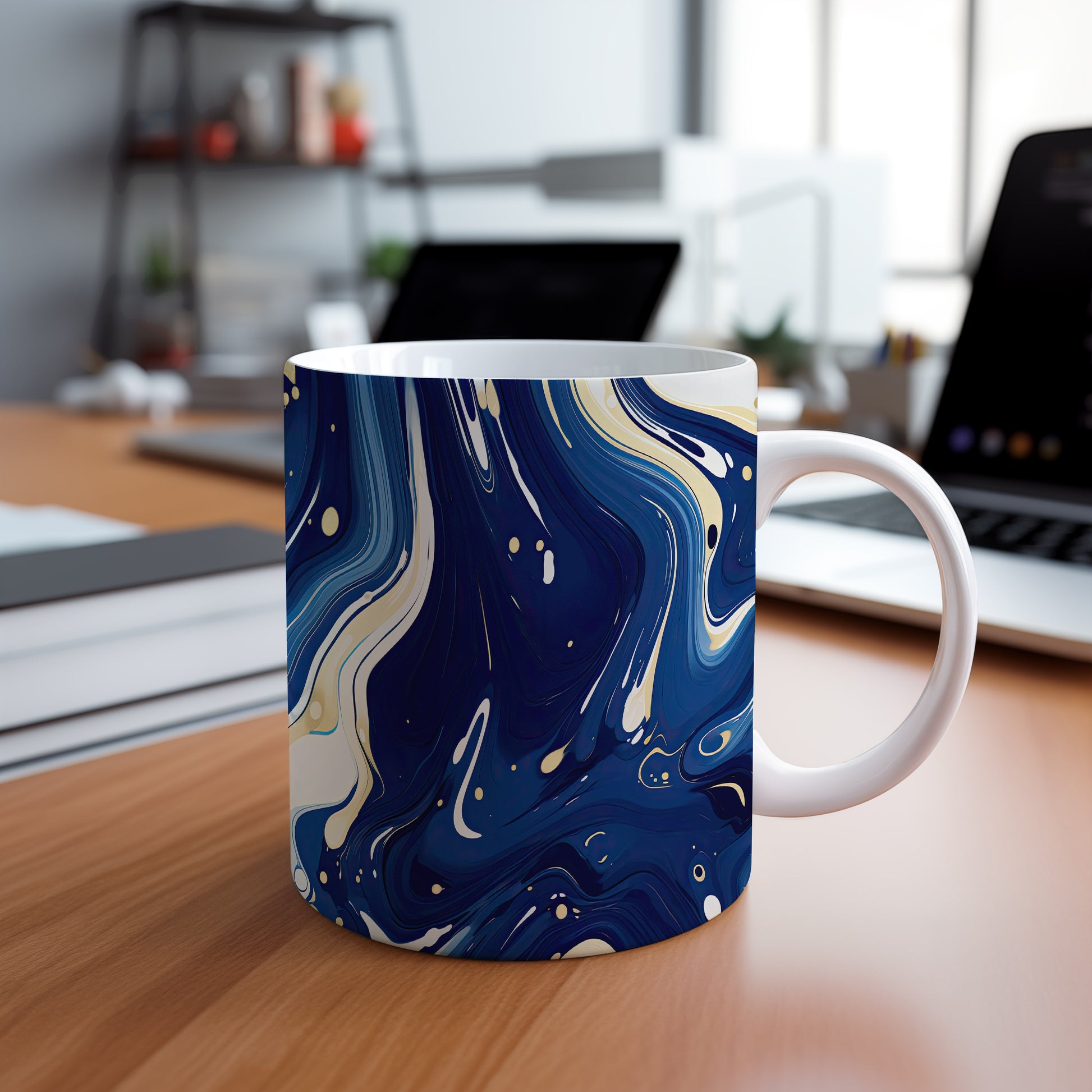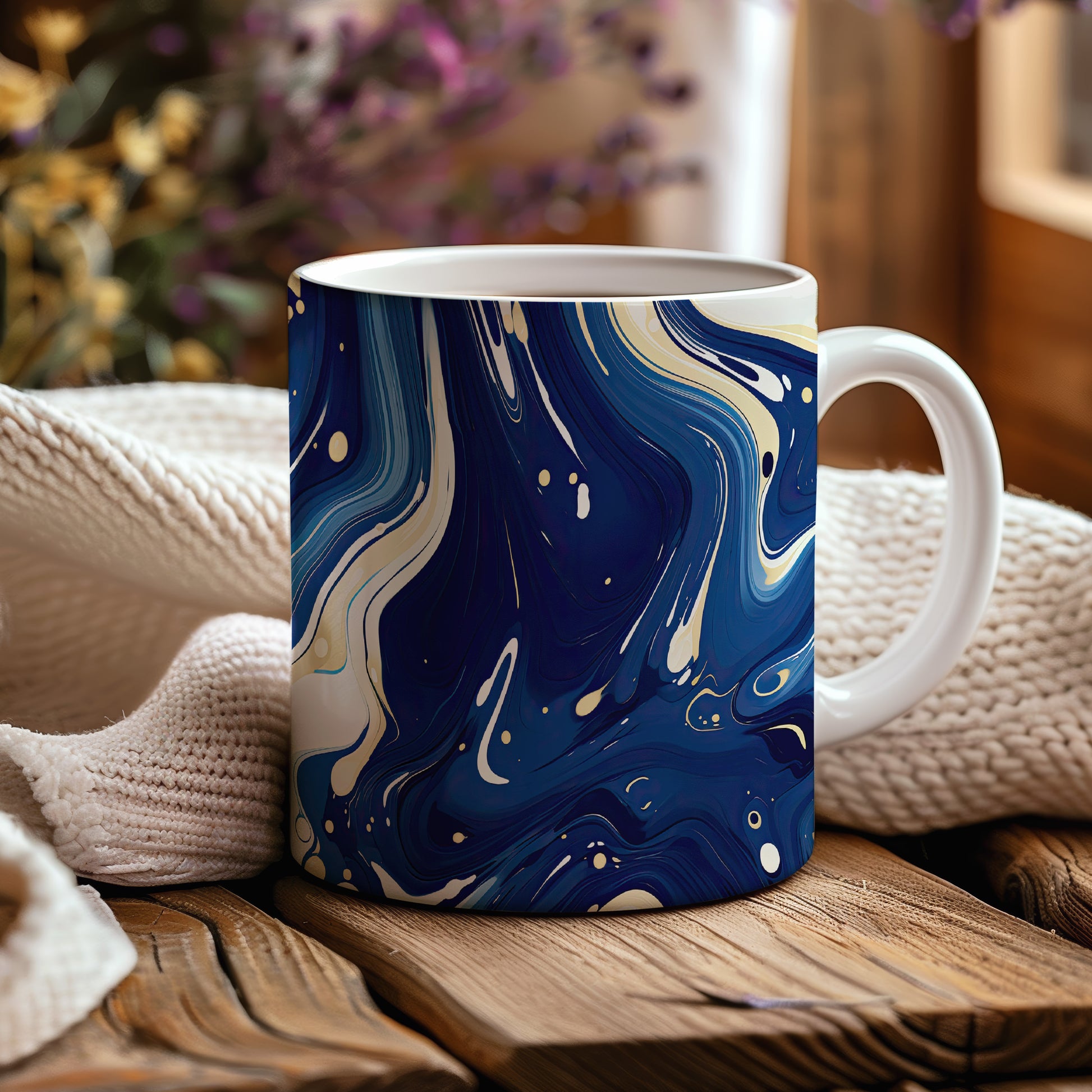 Tento hrnek s mramorováním v modrých a zlatých tónech přináší elegantní a moderní design. Je ideální pro milovníky stylového nádobí a skvělým dárkem pro přátele nebo rodinu. Materiál: keramika. Objem: 330 ml. Vhodné do myčky i mikrovlnky. Díky svému jedinečnému vzhledu přidá šmrnc každému stolu.