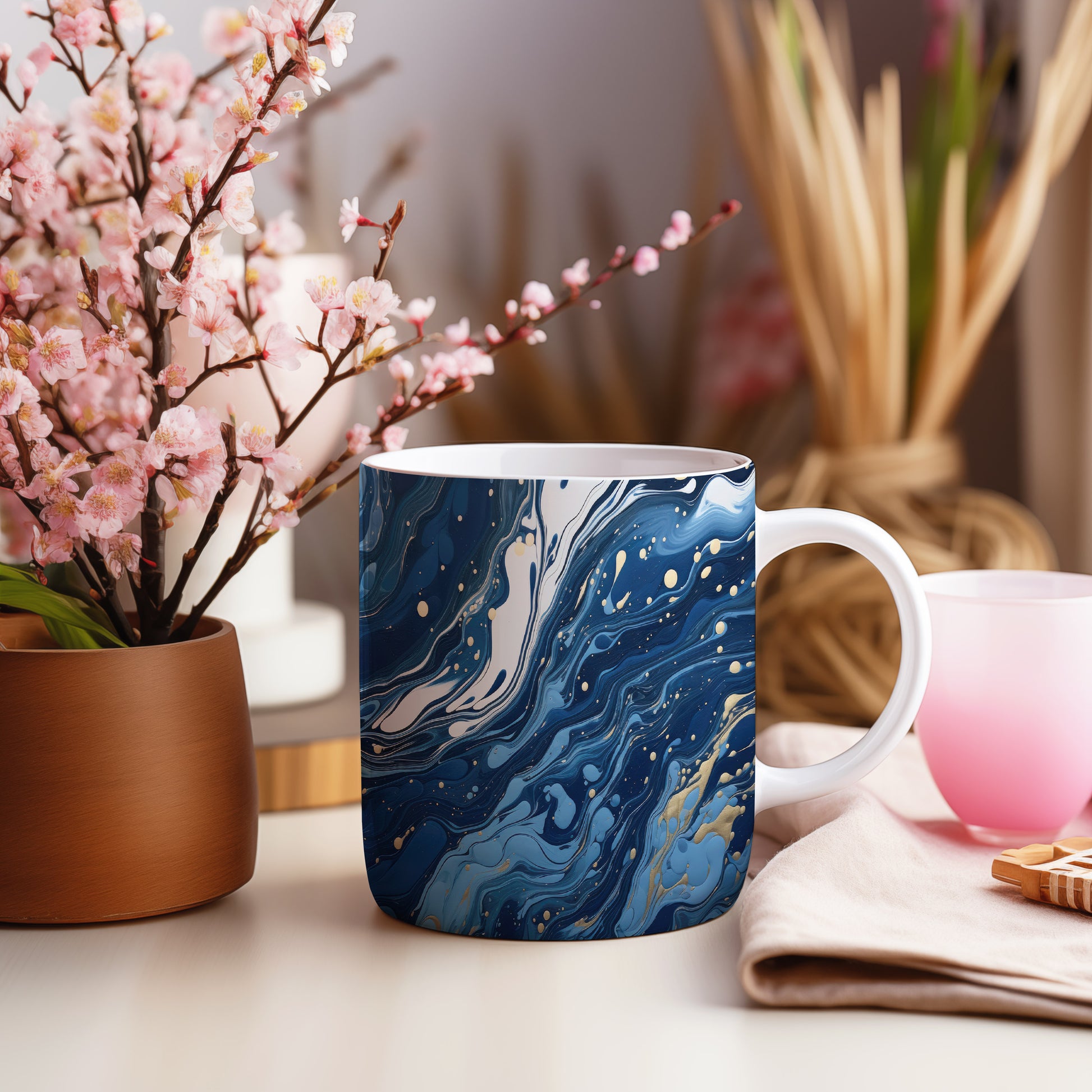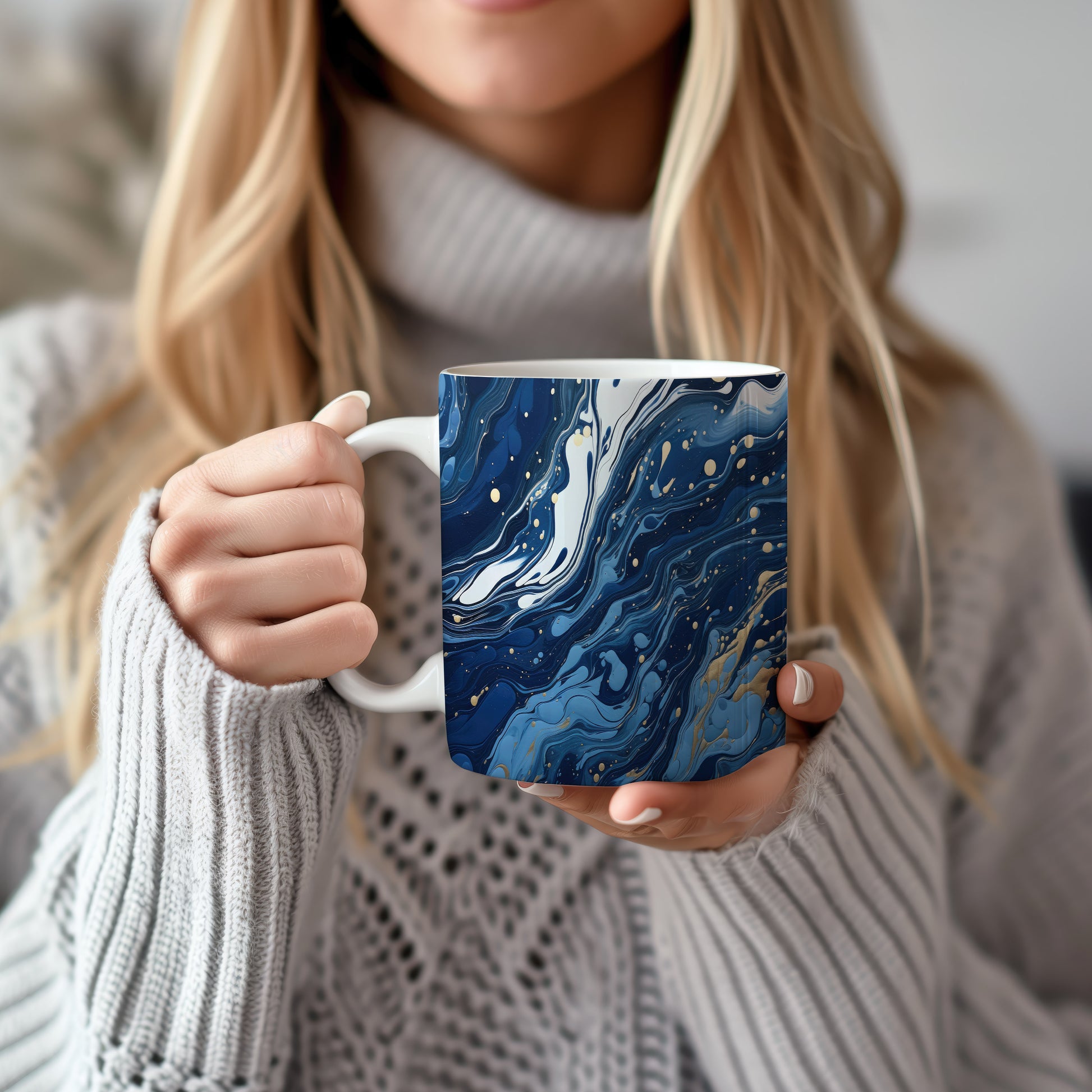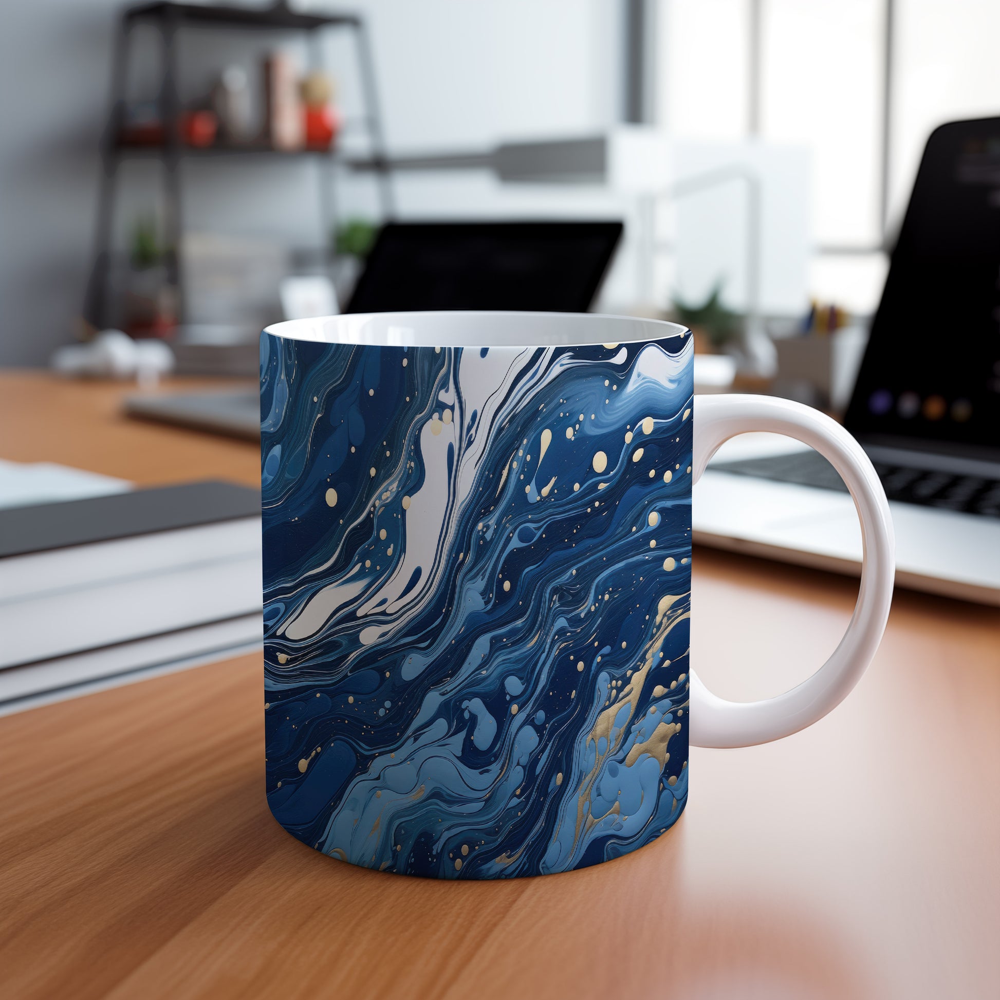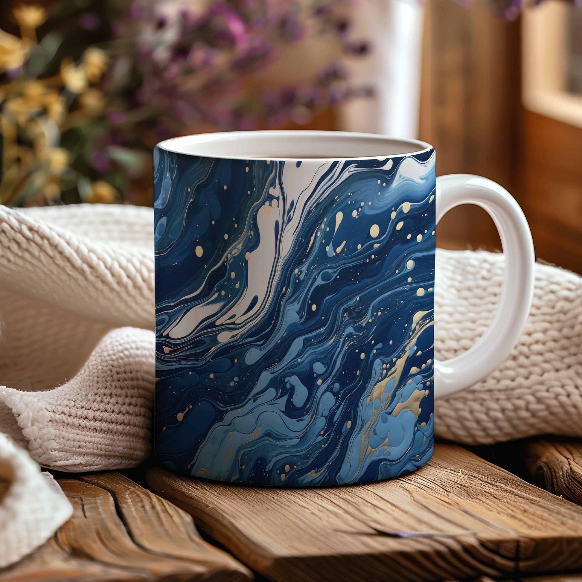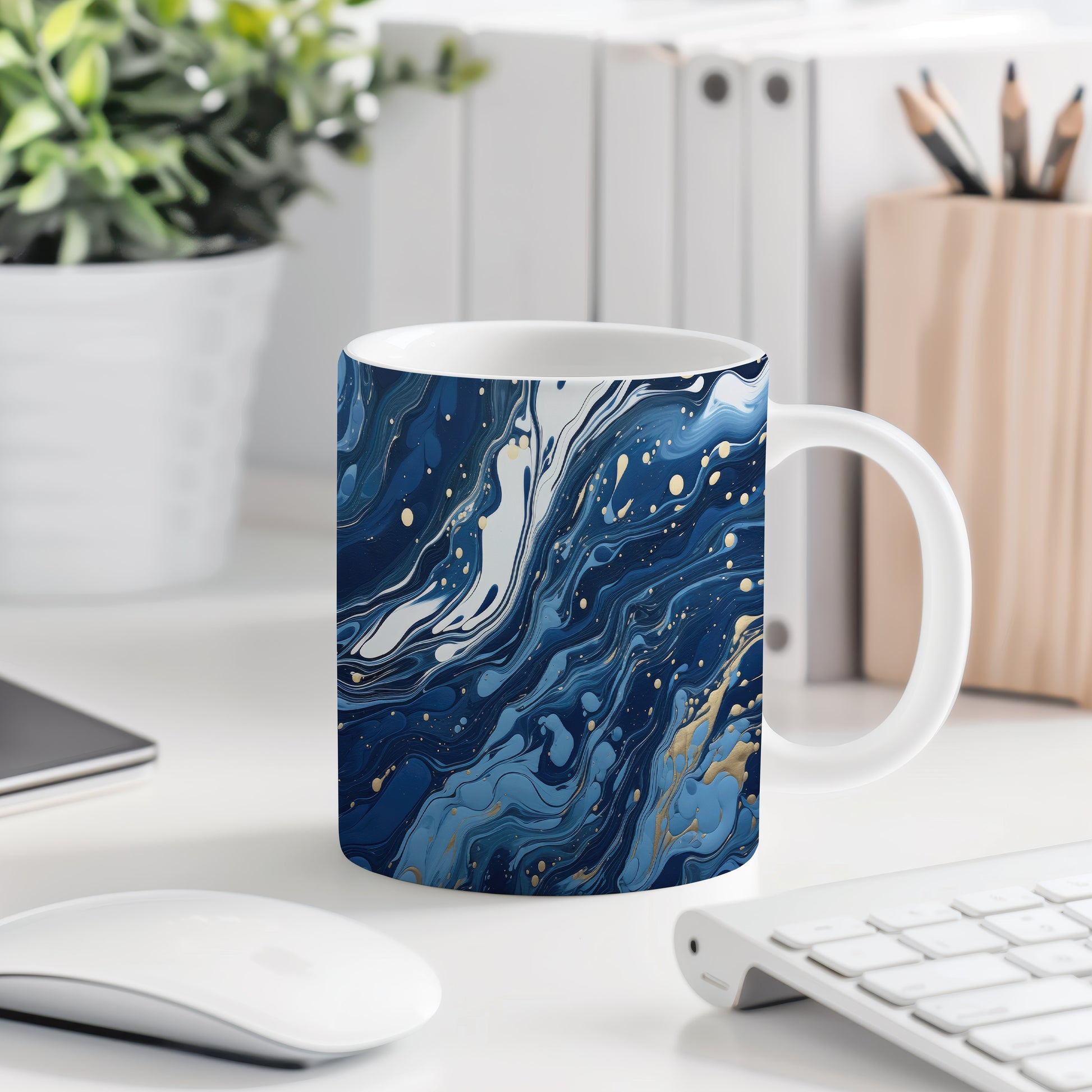 Tento hrnek s mramorováním v modrých a zlatých tónech přináší elegantní a moderní vzhled. Je ideální pro milovníky stylového nádobí a skvělým dárkem pro přátele či rodinu. Hrnek má objem 330 ml, je vyroben z keramiky, což zajišťuje jeho odolnost, a je vhodný do myčky i mikrovlnky. Díky svému designu dodá každému nápoji jedinečný šarm.
