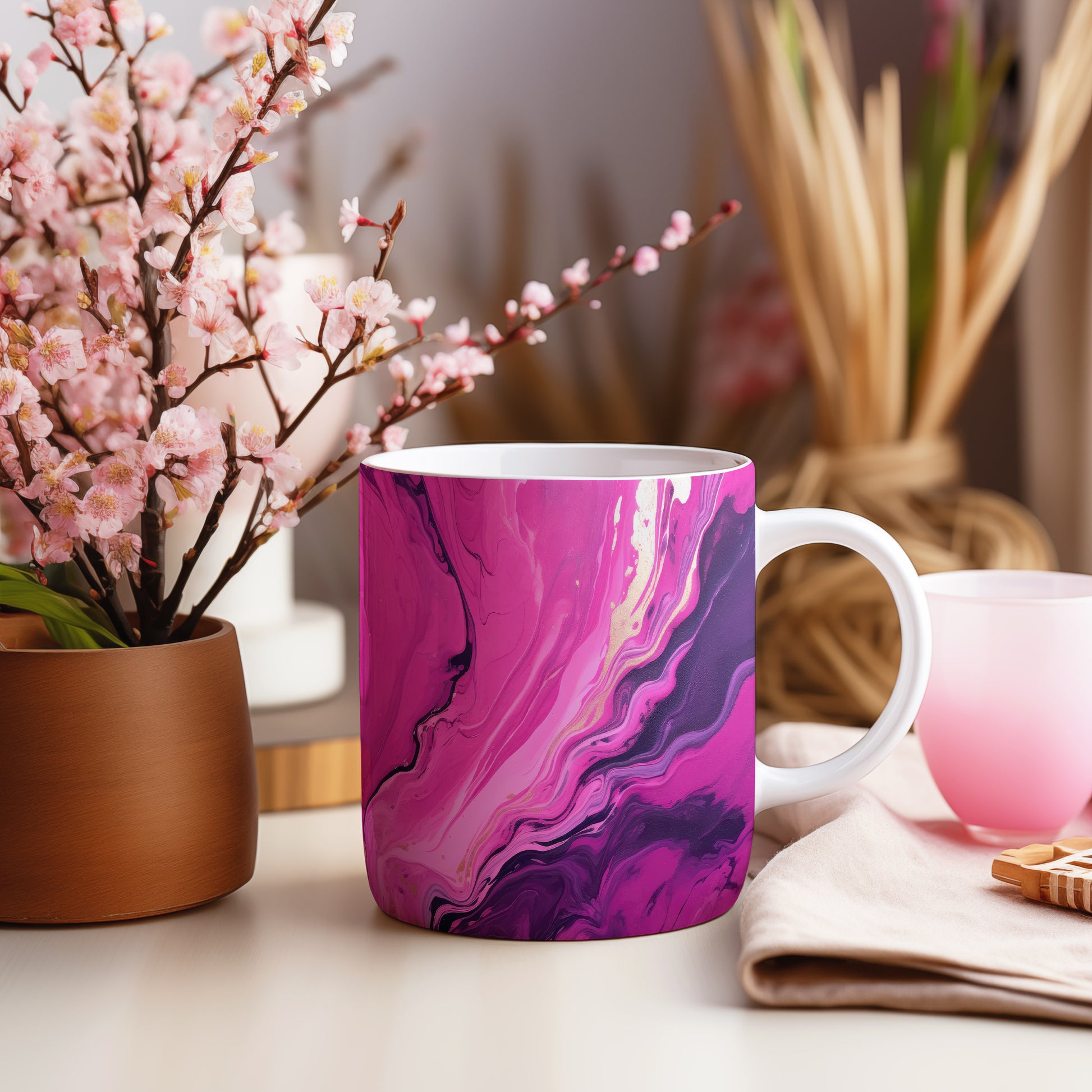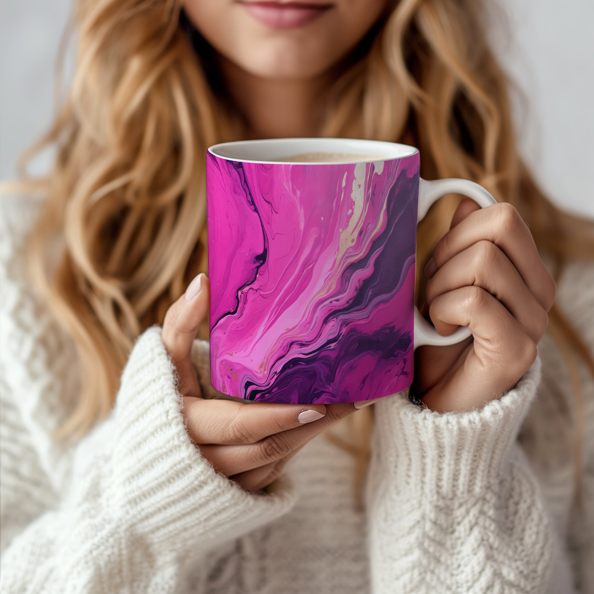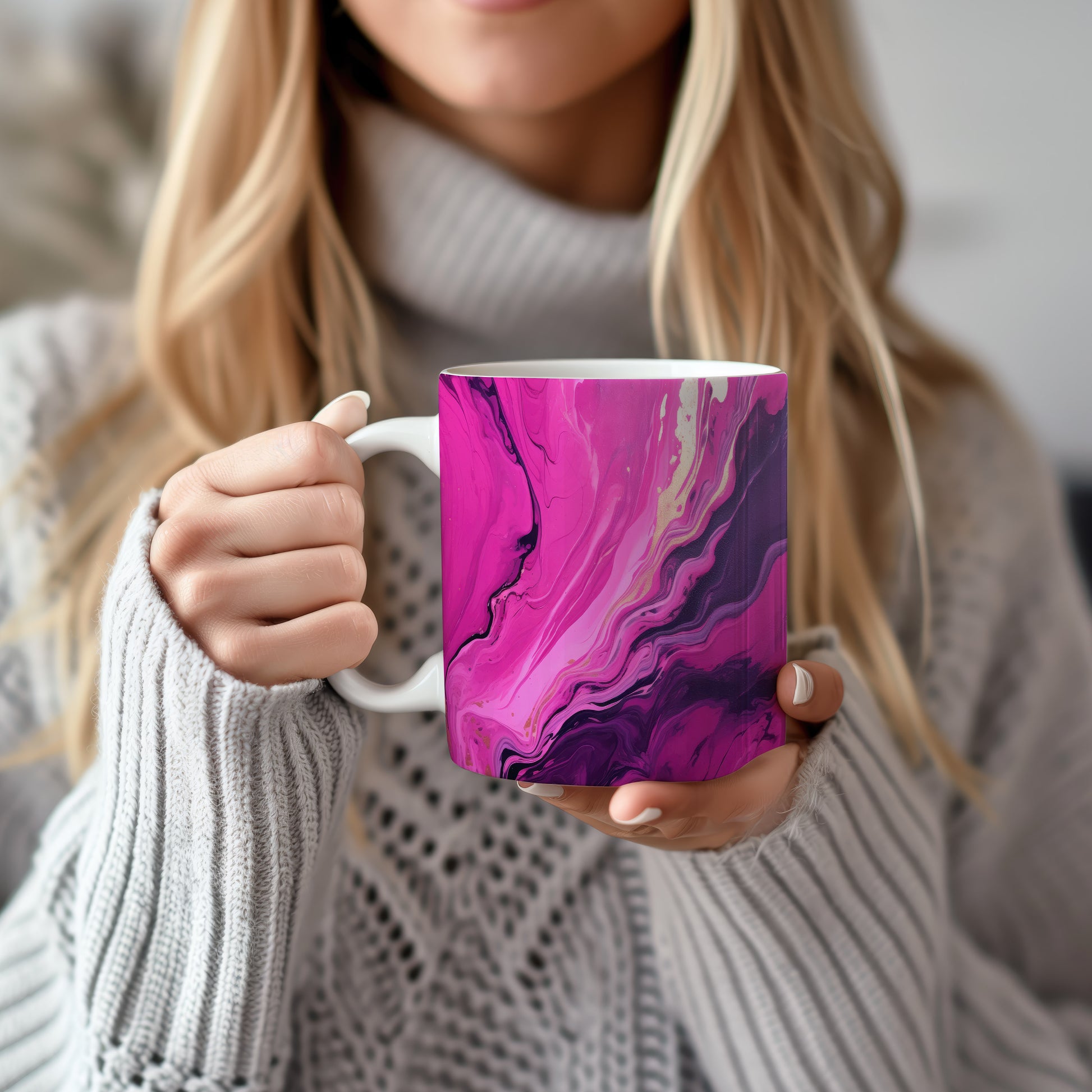 Tento hrnek s elegantním mramorovaným vzorem v růžových a fialových tónech je skvělým doplňkem pro každého milovníka stylového nádobí. Je ideální jako dárek pro přátele nebo rodinu, kteří ocení jedinečný design. Materiál: keramika. Objem: 330 ml. Vhodné do myčky i mikrovlnky. Díky svému vzhledu přináší do každodenního pití kávy nebo čaje špetku elegance.
