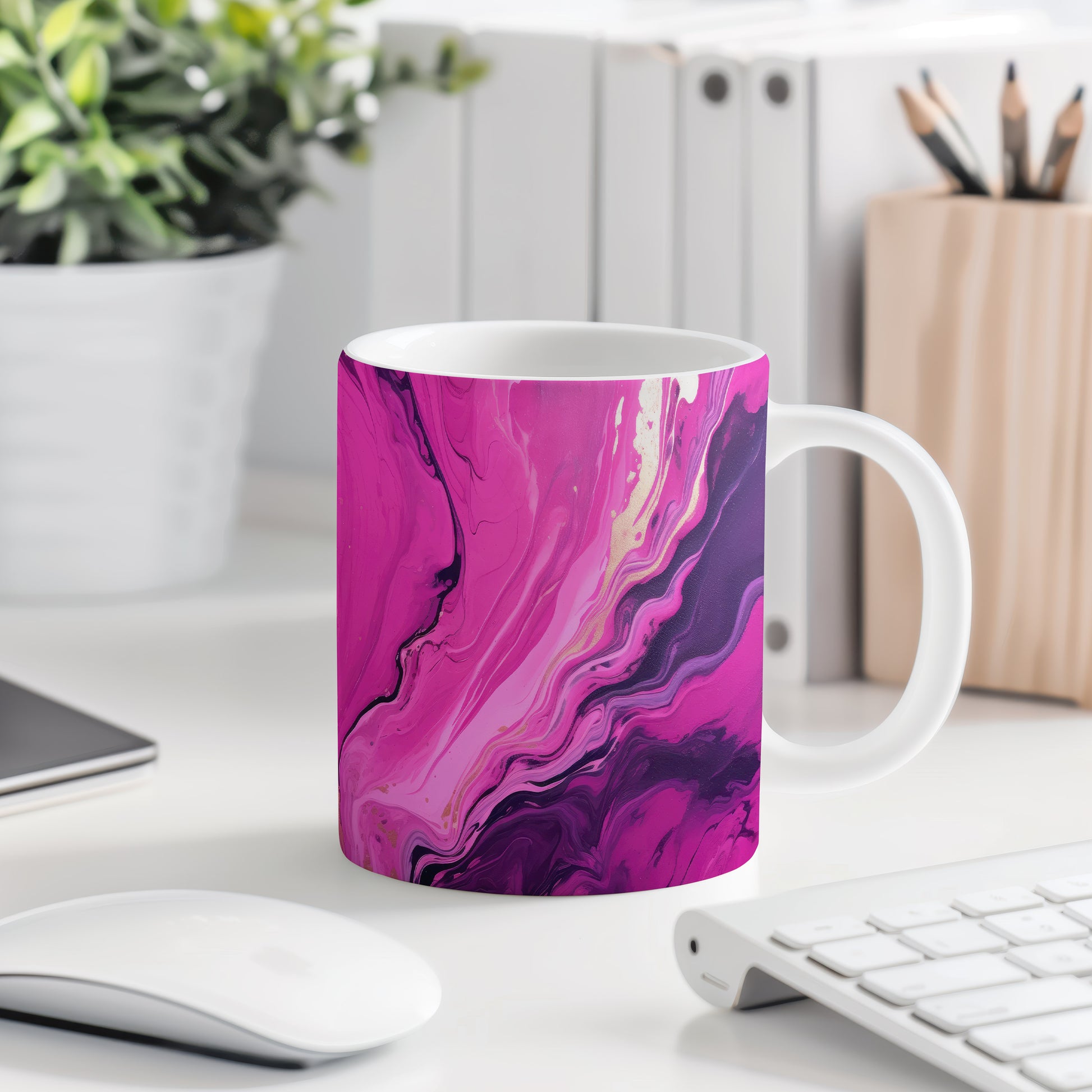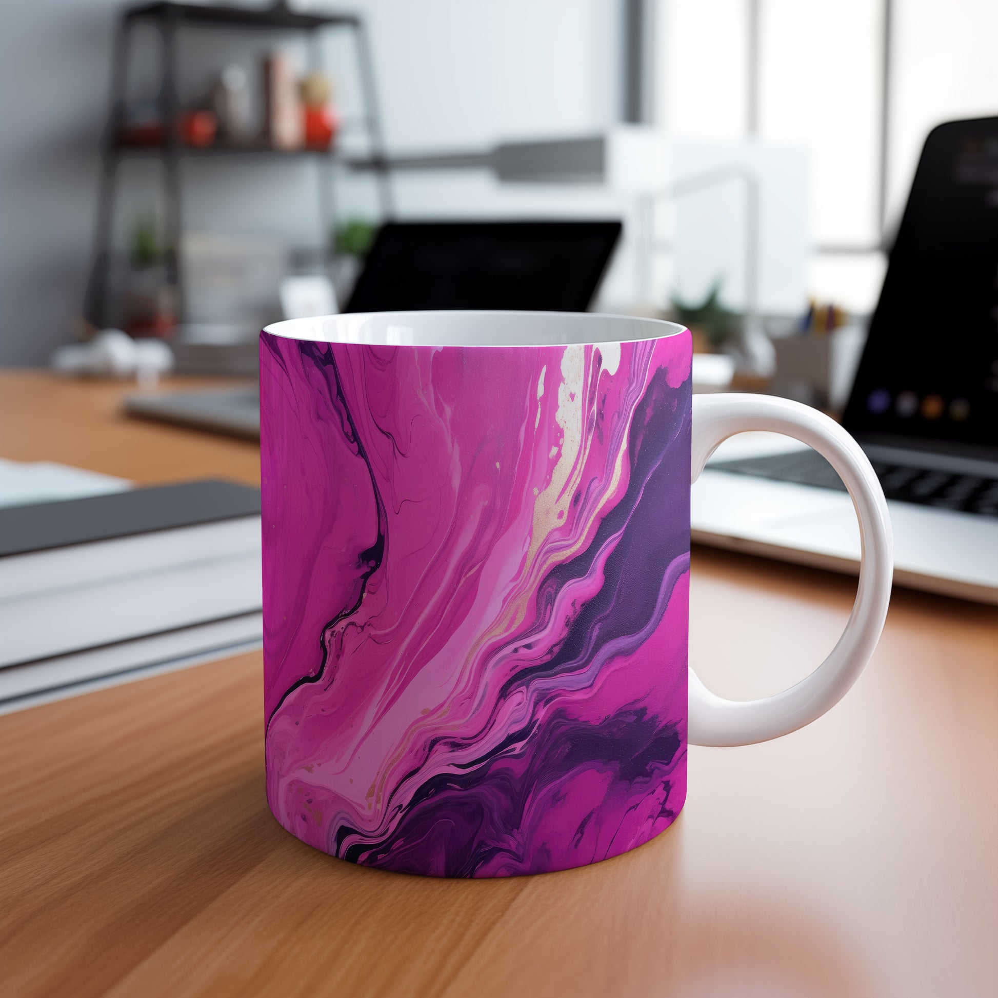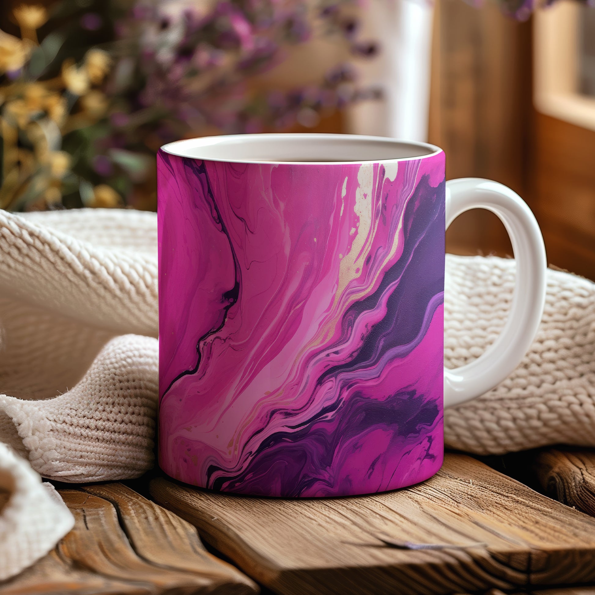 Tento hrnek s elegantním mramorovaným vzorem v růžových a fialových tónech je skvělým doplňkem pro každého milovníka stylového nádobí. Je ideální jako dárek pro přátele nebo rodinu, kteří ocení jedinečný design. Materiál: keramika. Objem: 330 ml. Vhodné do myčky i mikrovlnky. Díky svému vzhledu přináší do každodenního pití kávy nebo čaje špetku elegance.