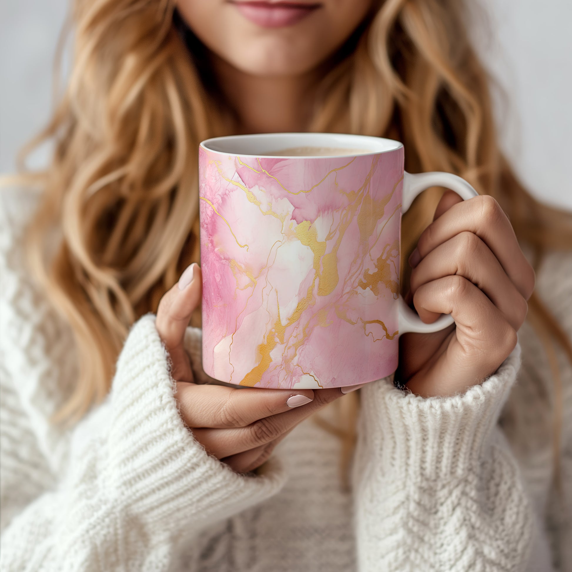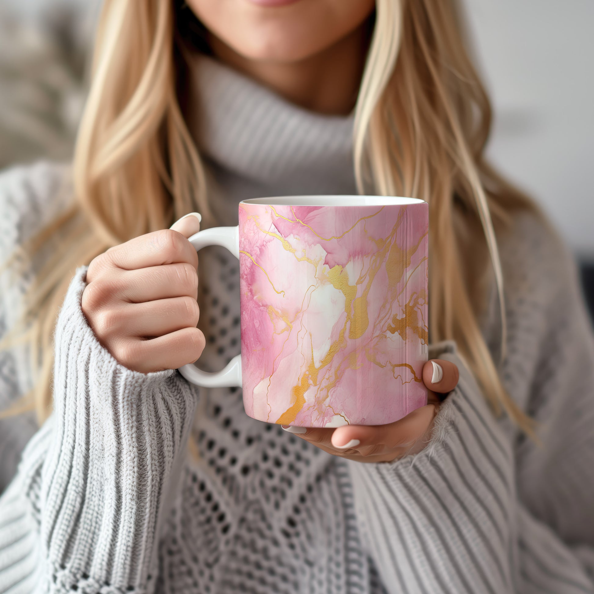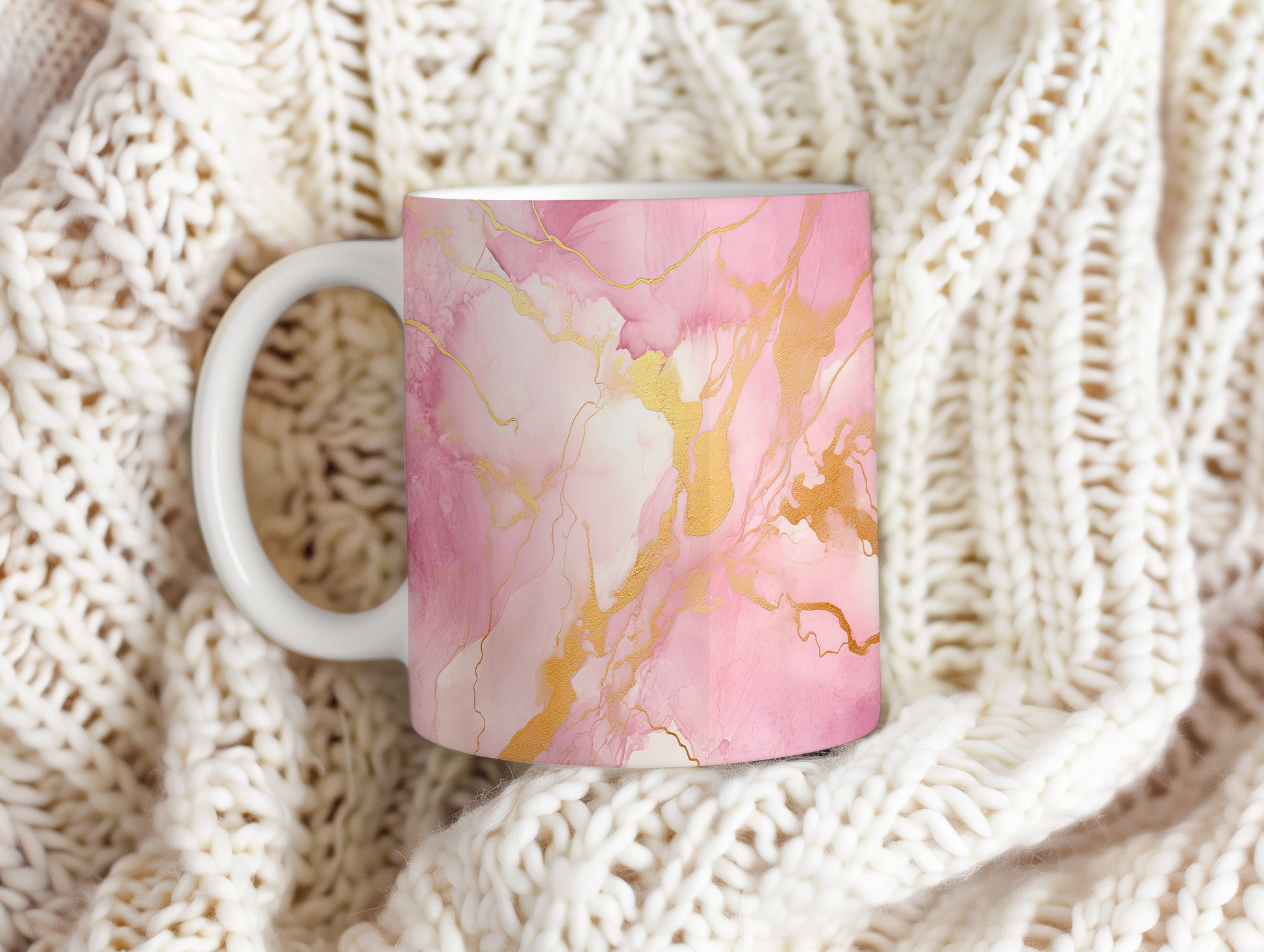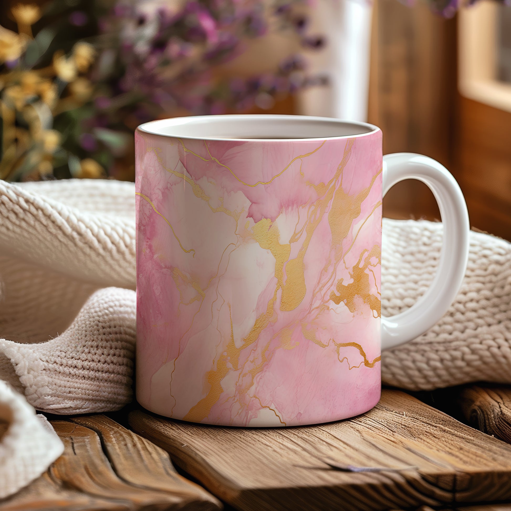Tento hrnek s mramorováním v růžových a zlatých tónech přináší elegantní a moderní design. Je ideální pro každodenní použití a skvělým dárkem pro milovníky stylového nádobí. Materiál: keramika. Objem: 330 ml. Vhodné do myčky i mikrovlnky. Díky svému jedinečnému vzhledu se stane ozdobou každého stolu.