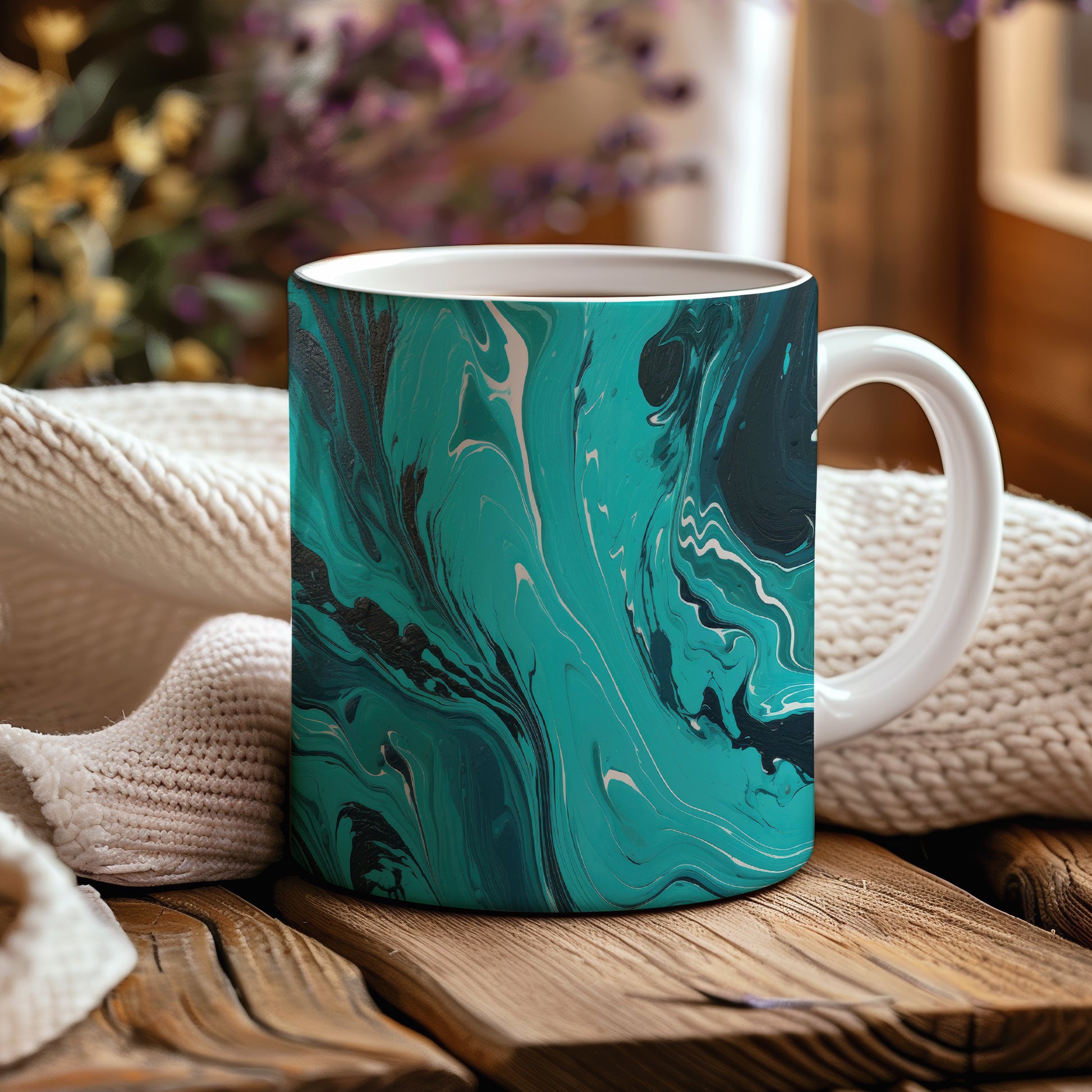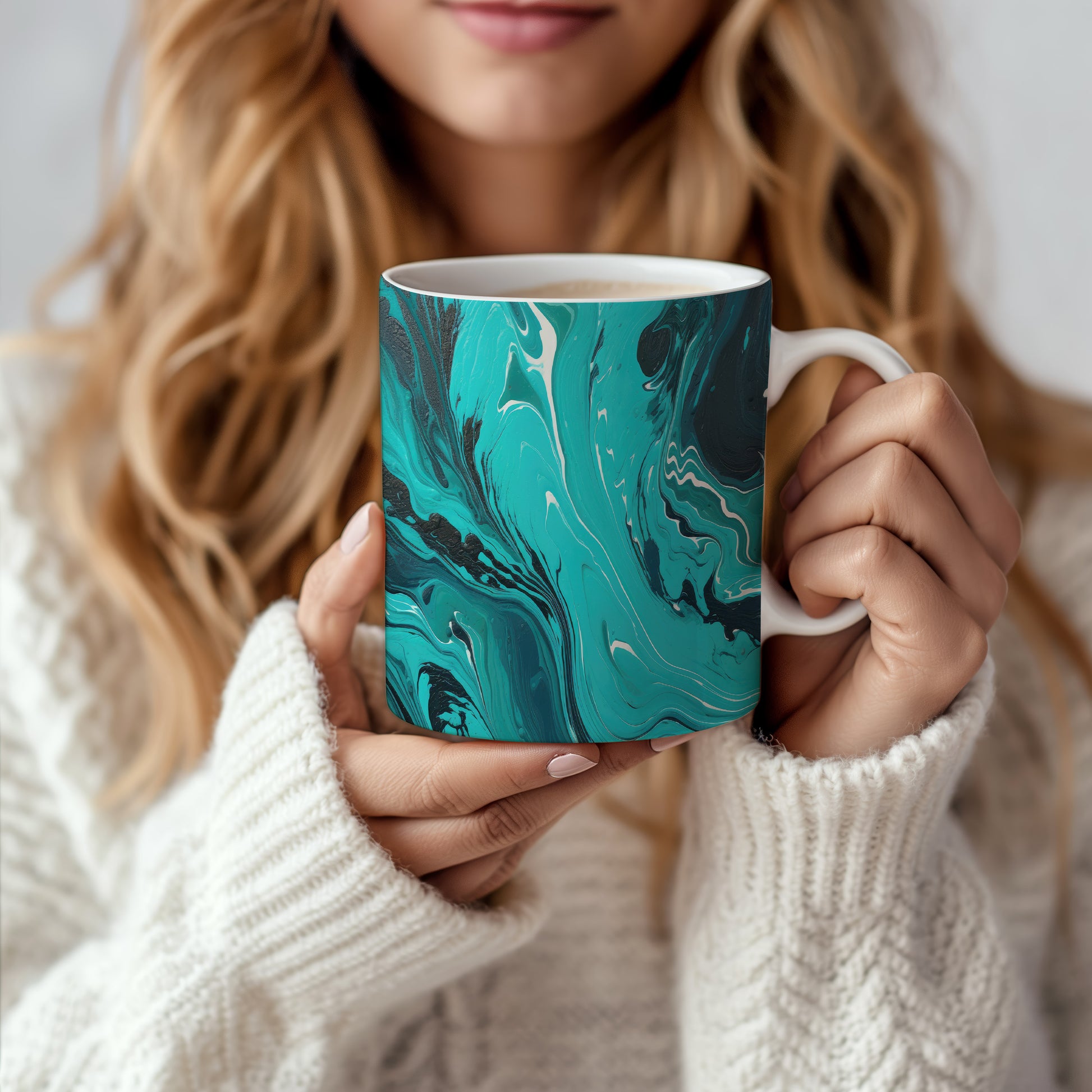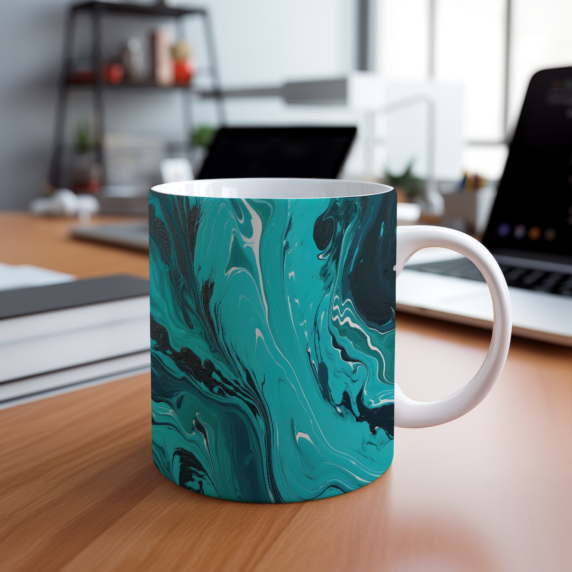 Hrnek s mramorovým vzorem vyniká jemnými kroucenými liniemi v tyrkysových a černých odstínech. Tento styl je ideální pro milovníky originálního designu a skvělým dárkem pro přátele či rodinu. Materiál: keramika. Objem: 330 ml. Vhodné do myčky i mikrovlnky. Používání tohoto hrnku přináší radost z každého doušku.