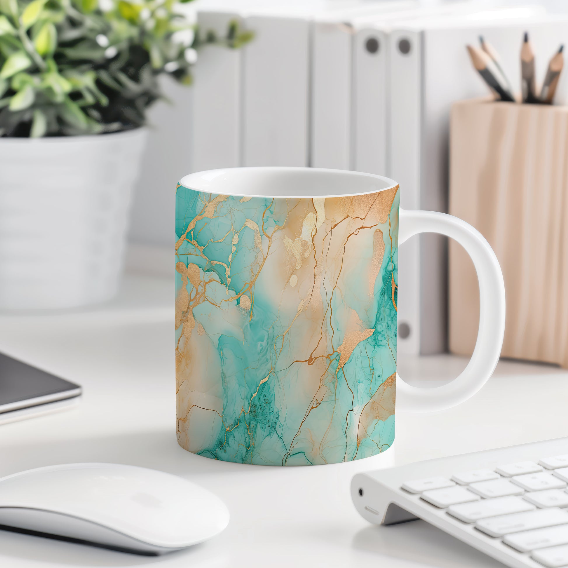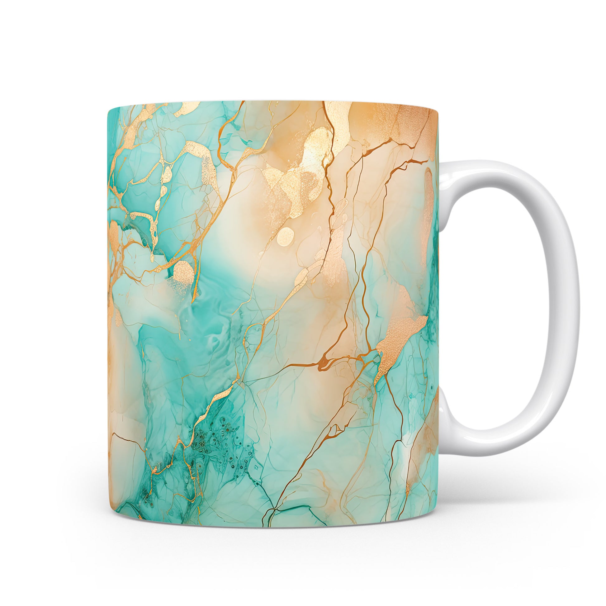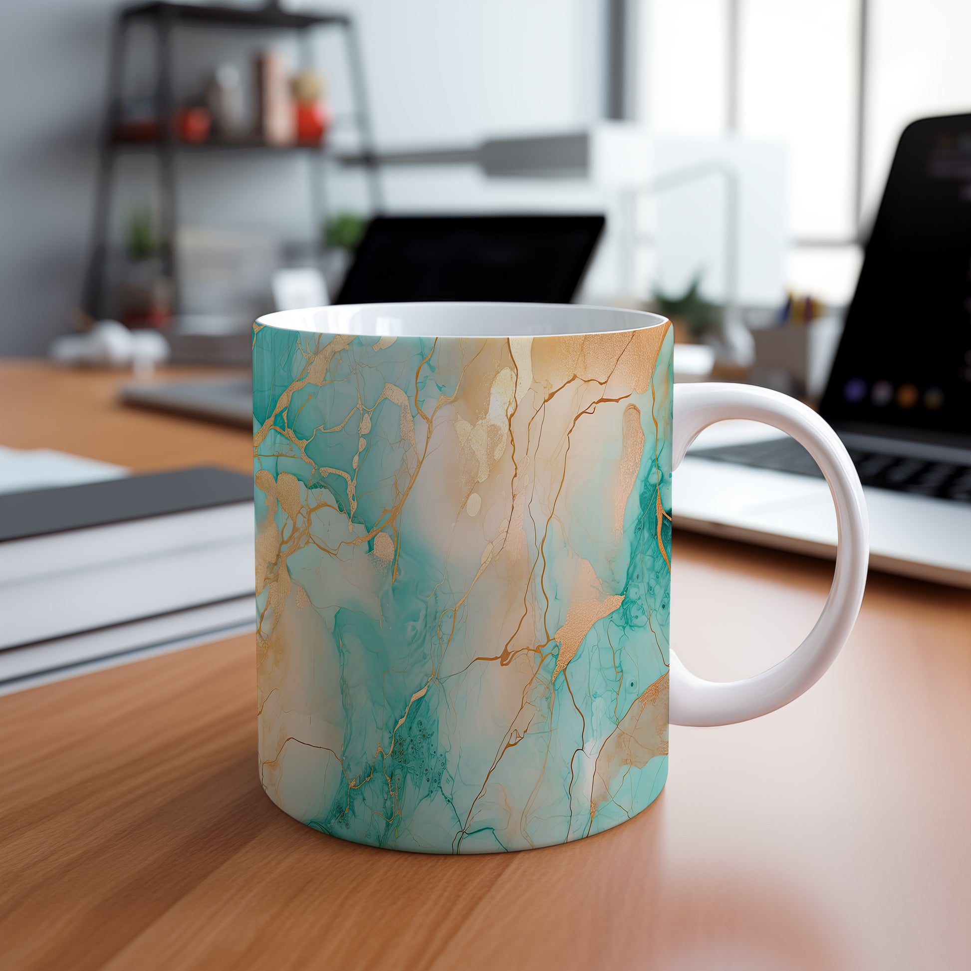Tento hrnek s mramorováním v tyrkysových a zlatých tónech přináší elegantní a moderní design. Je ideální pro milovníky stylového nádobí a skvělým dárkem pro přátele či rodinu. Materiál: keramika. Objem: 330 ml. Vhodné do myčky i mikrovlnky. Díky svému jedinečnému vzhledu se stane ozdobou každého stolu.
