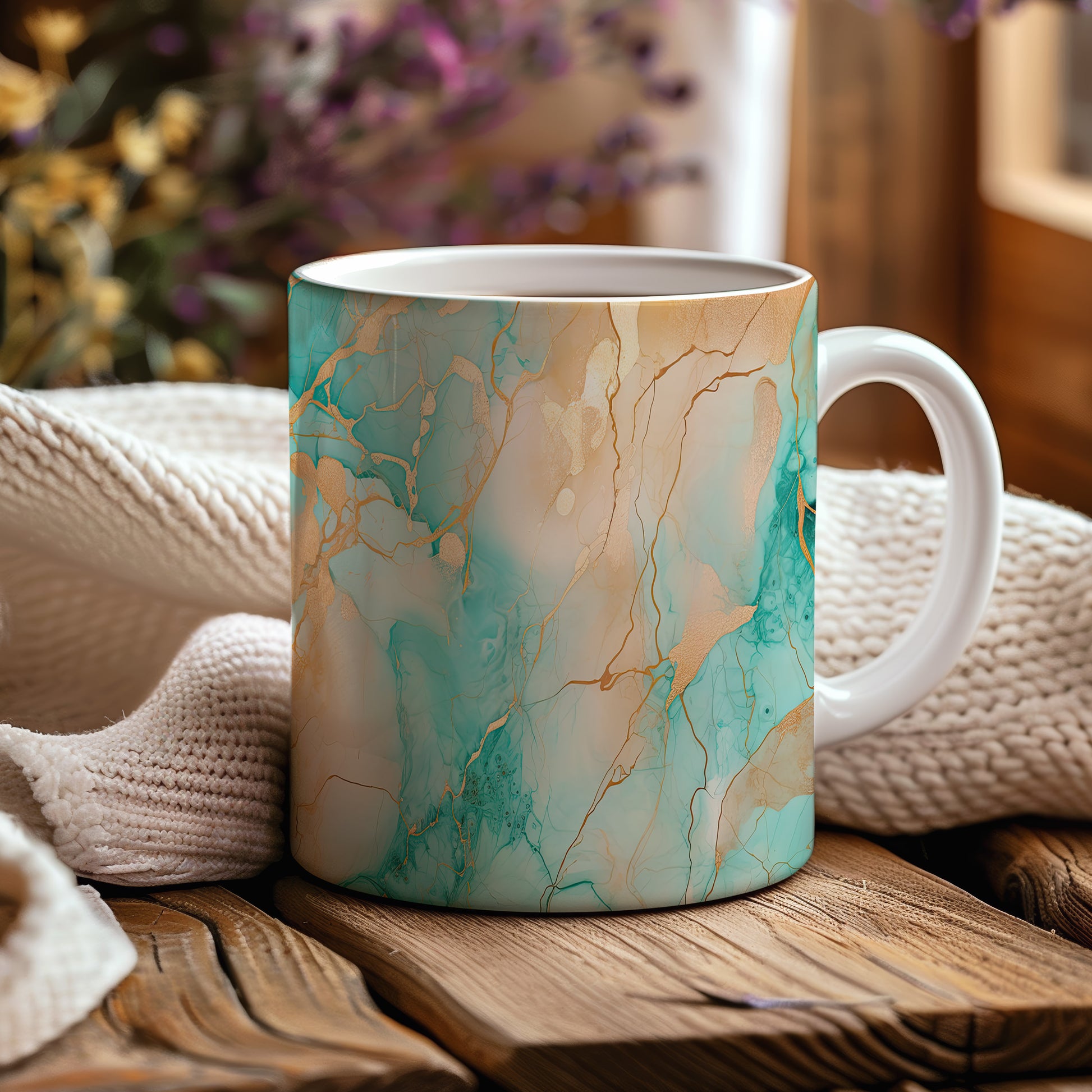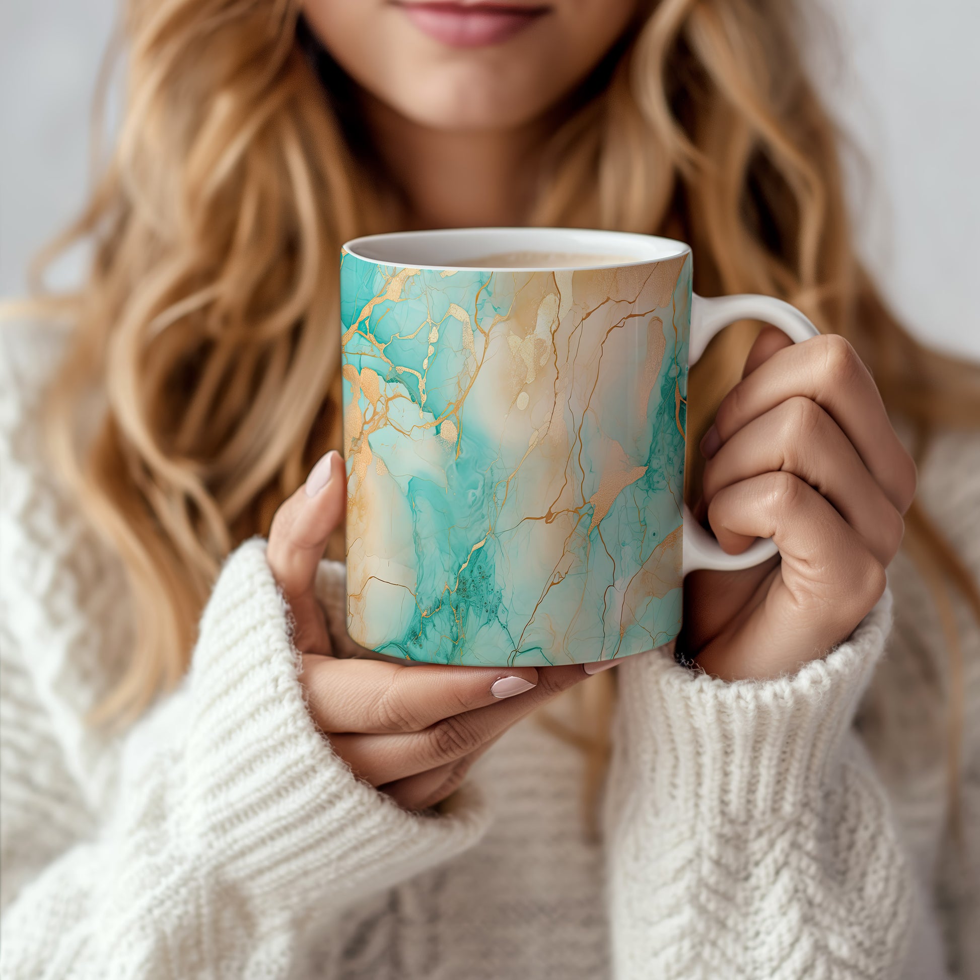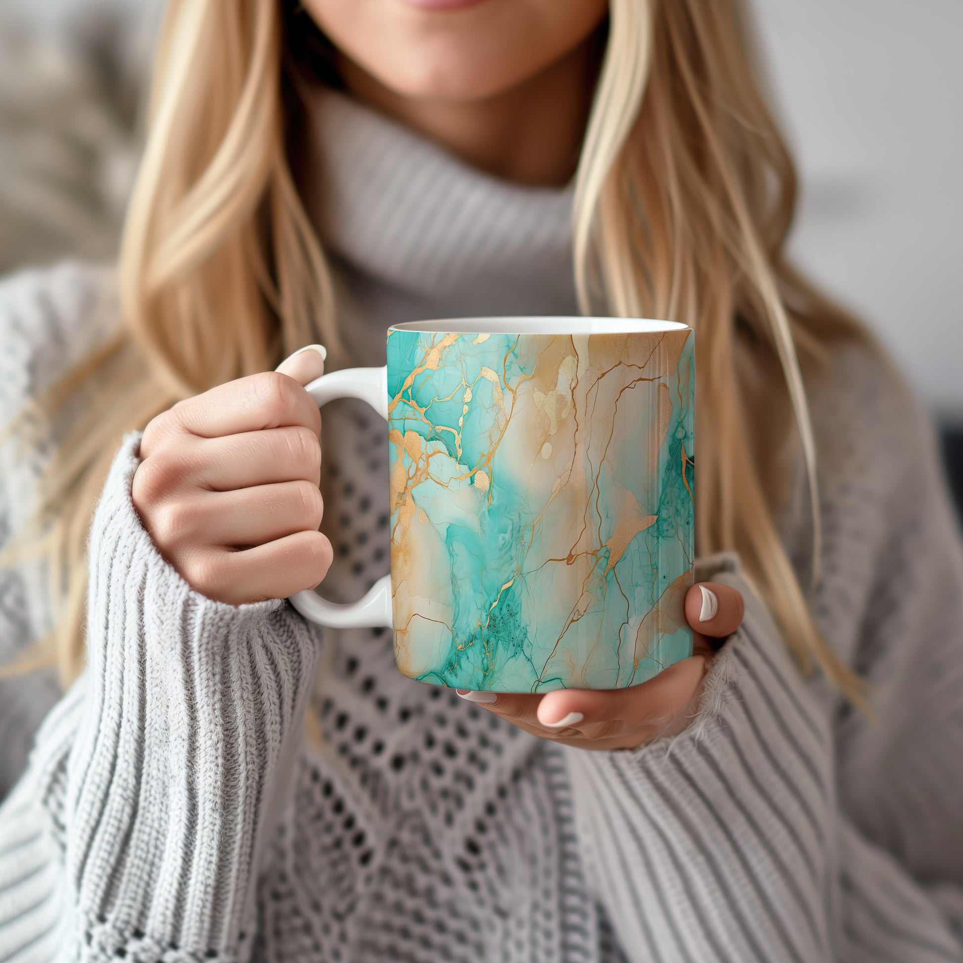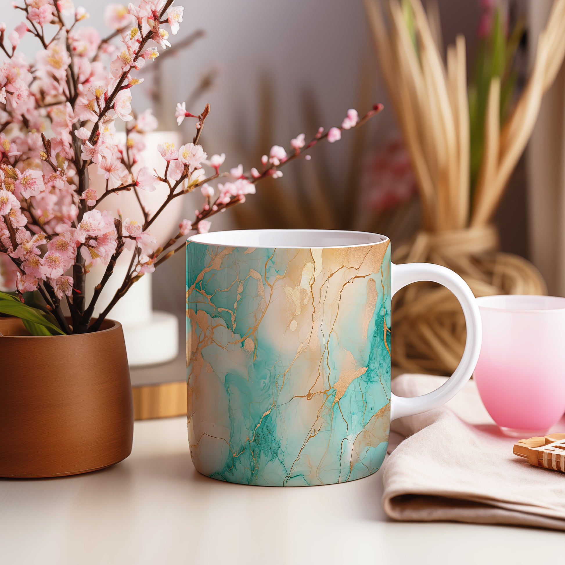 Tento hrnek s mramorováním v tyrkysových a zlatých tónech přináší elegantní a moderní design. Je ideální pro milovníky stylového nádobí a skvělým dárkem pro přátele či rodinu. Materiál: keramika. Objem: 330 ml. Vhodné do myčky i mikrovlnky. Díky svému jedinečnému vzhledu se stane ozdobou každého stolu.