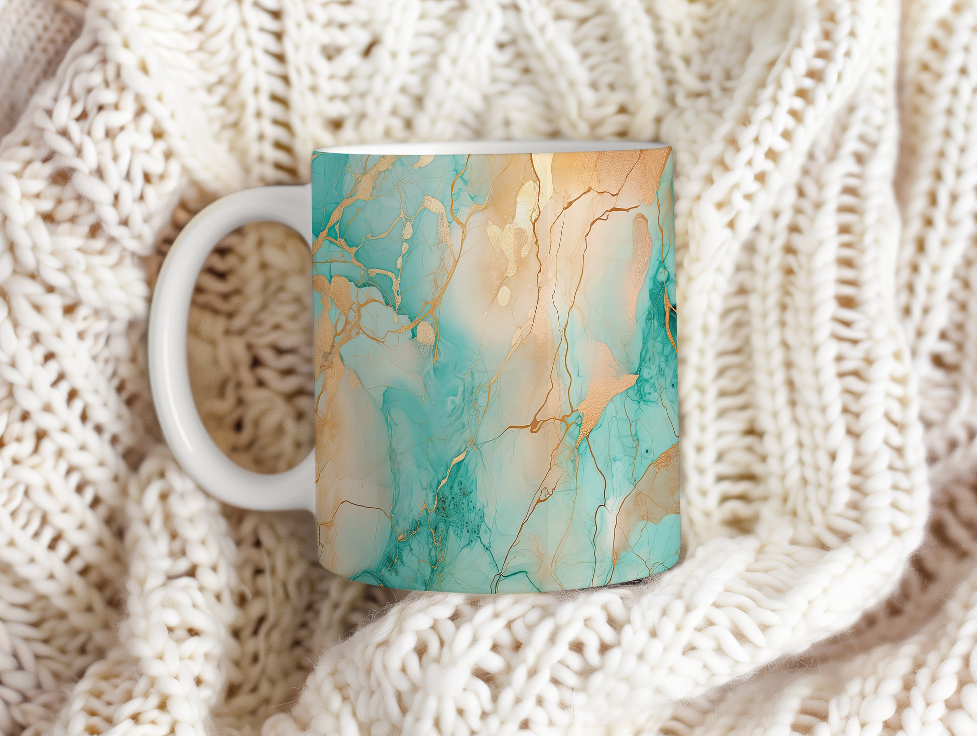 Hrnek s mramorováním v tyrkysových a zlatých tónech – jemnými detaily