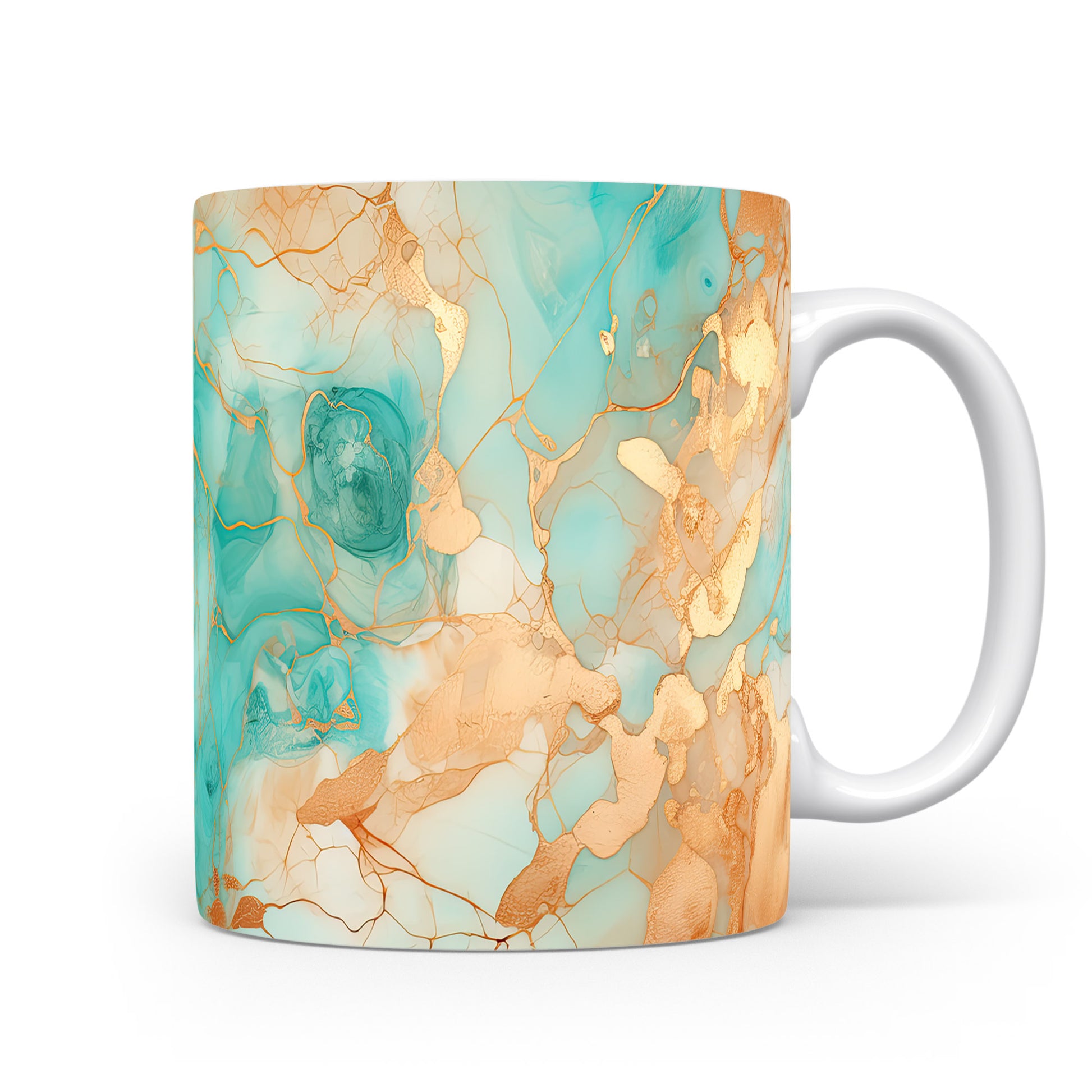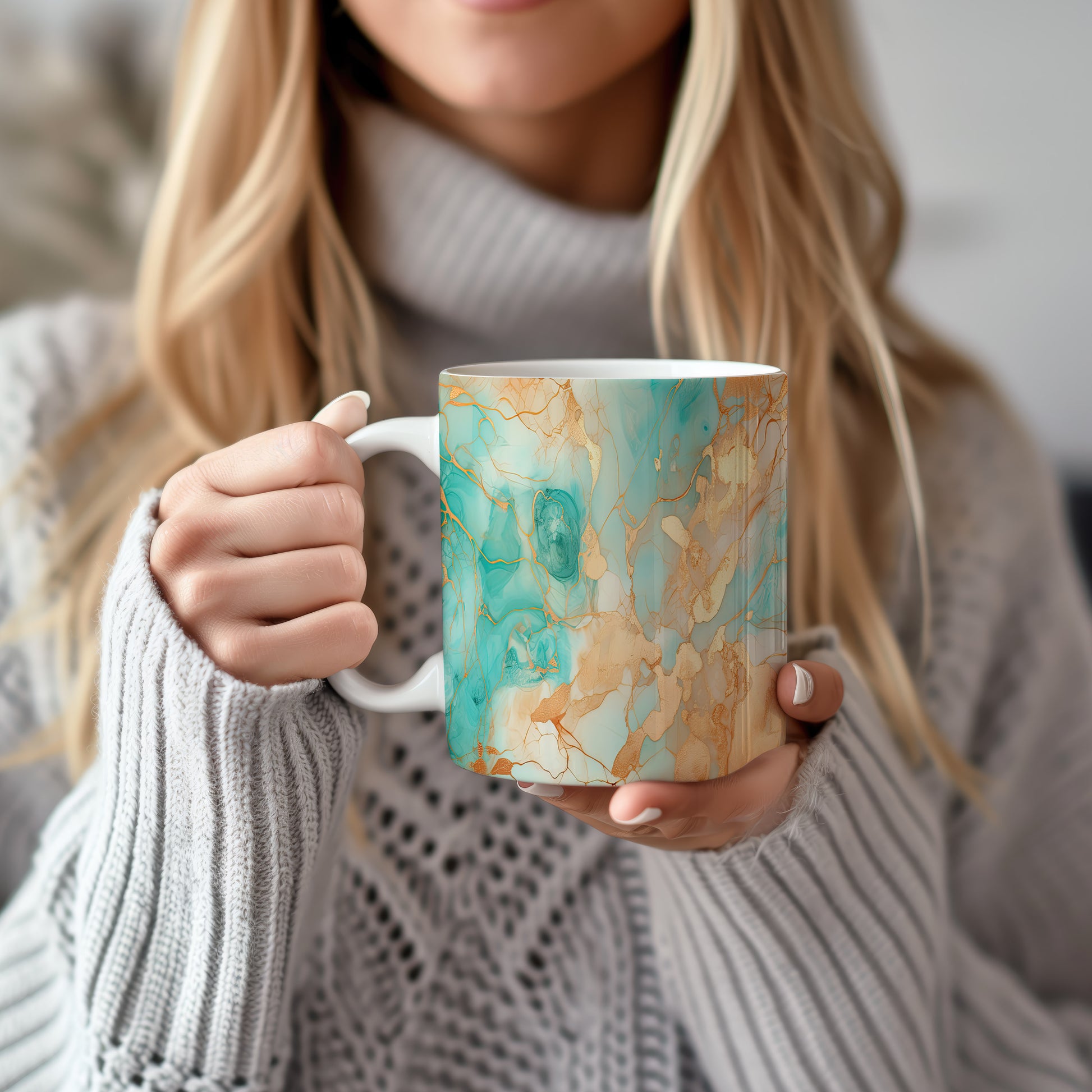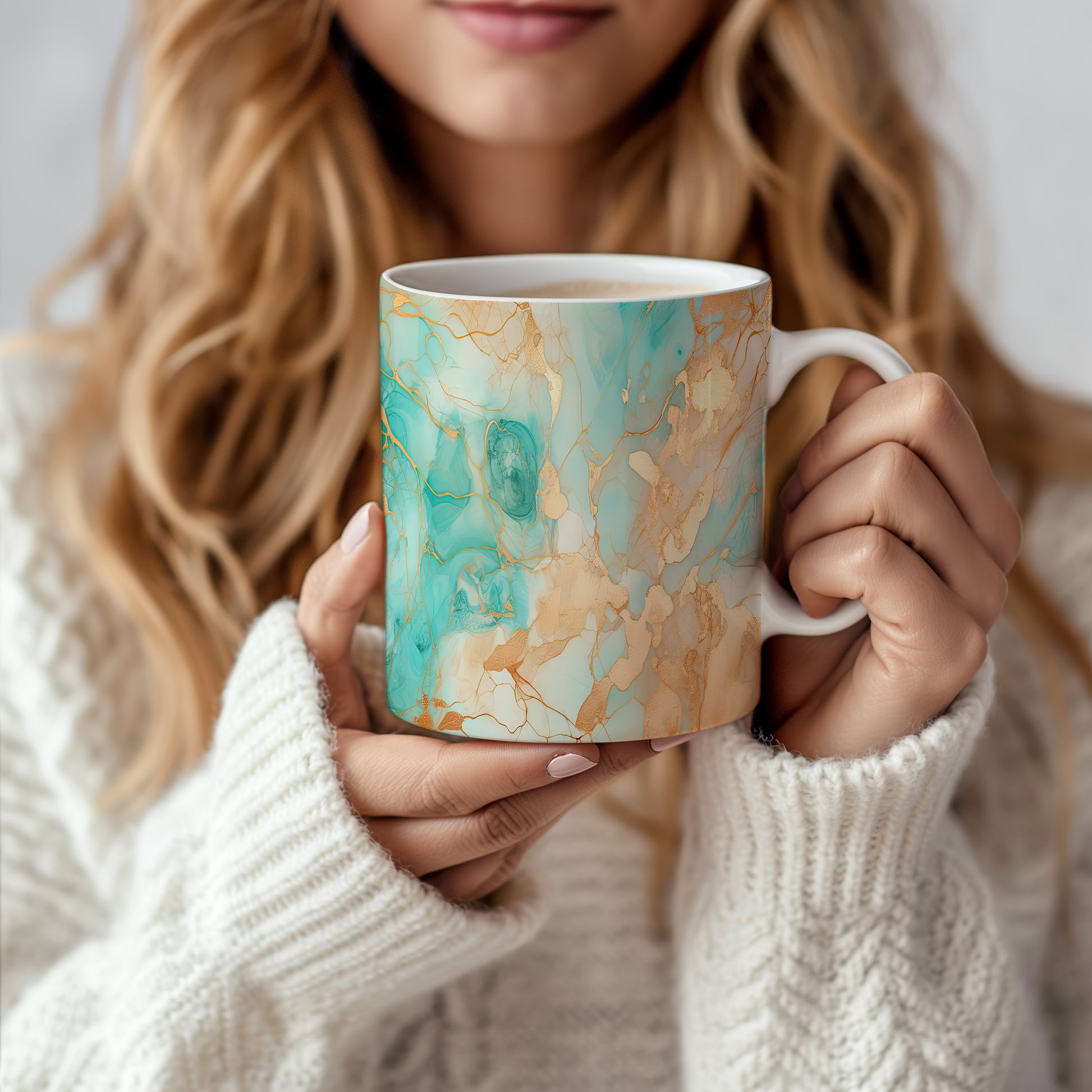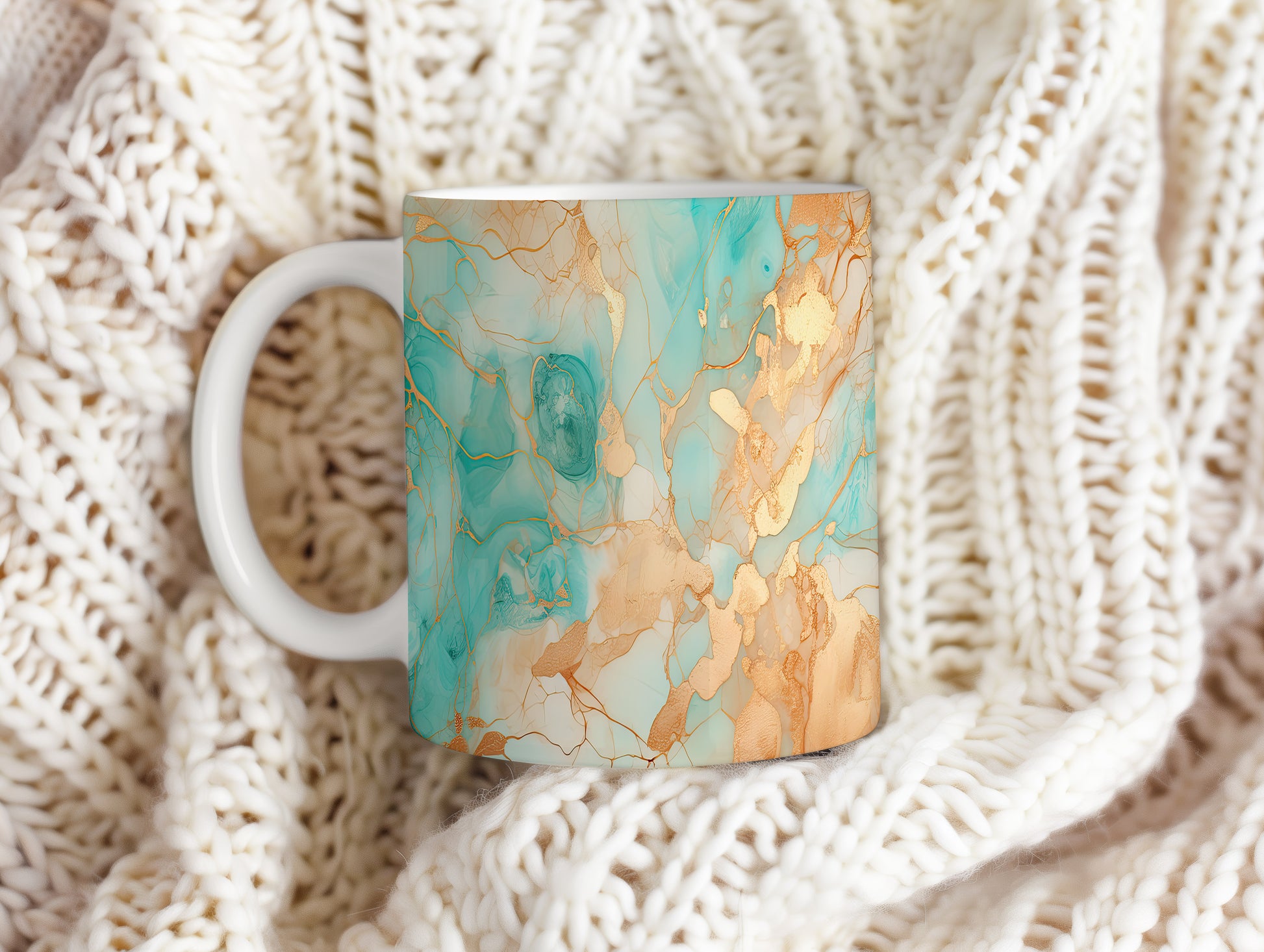 Hrnek s mramorováním v tyrkysových a zlatých tónech – výrazným designem