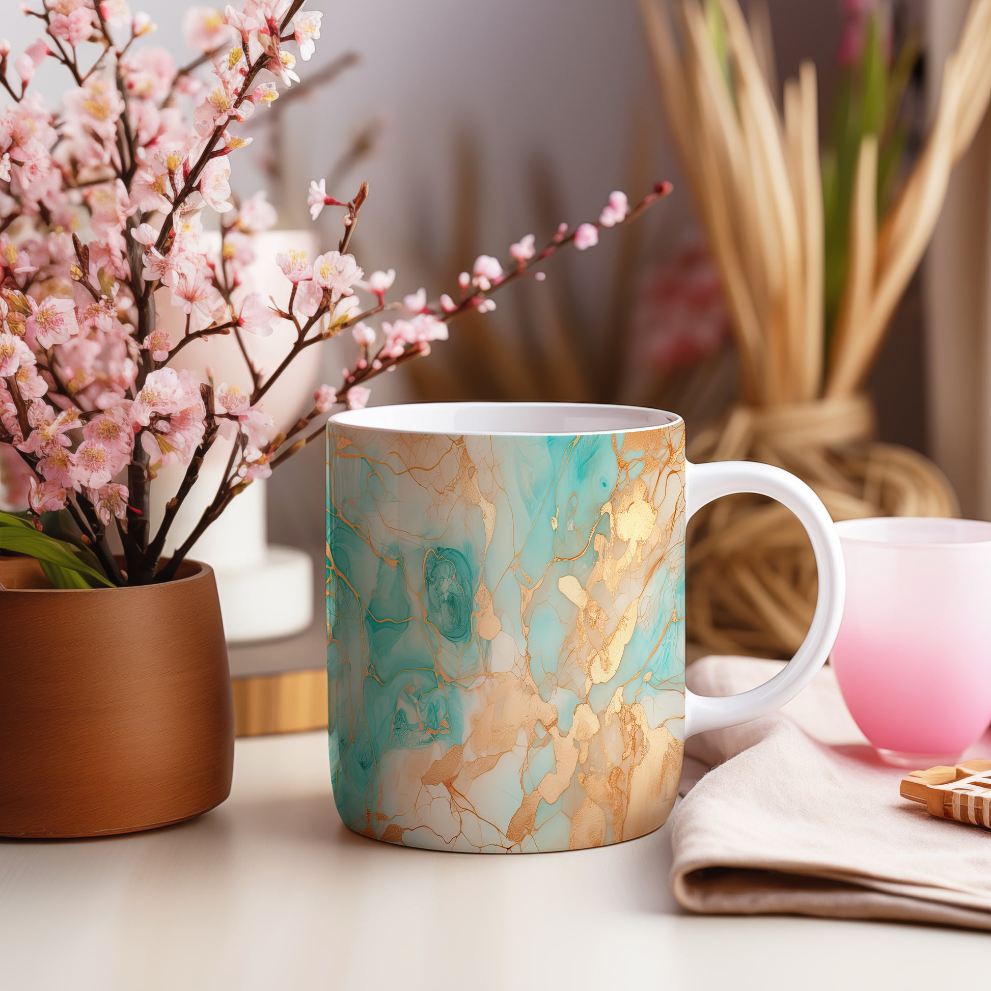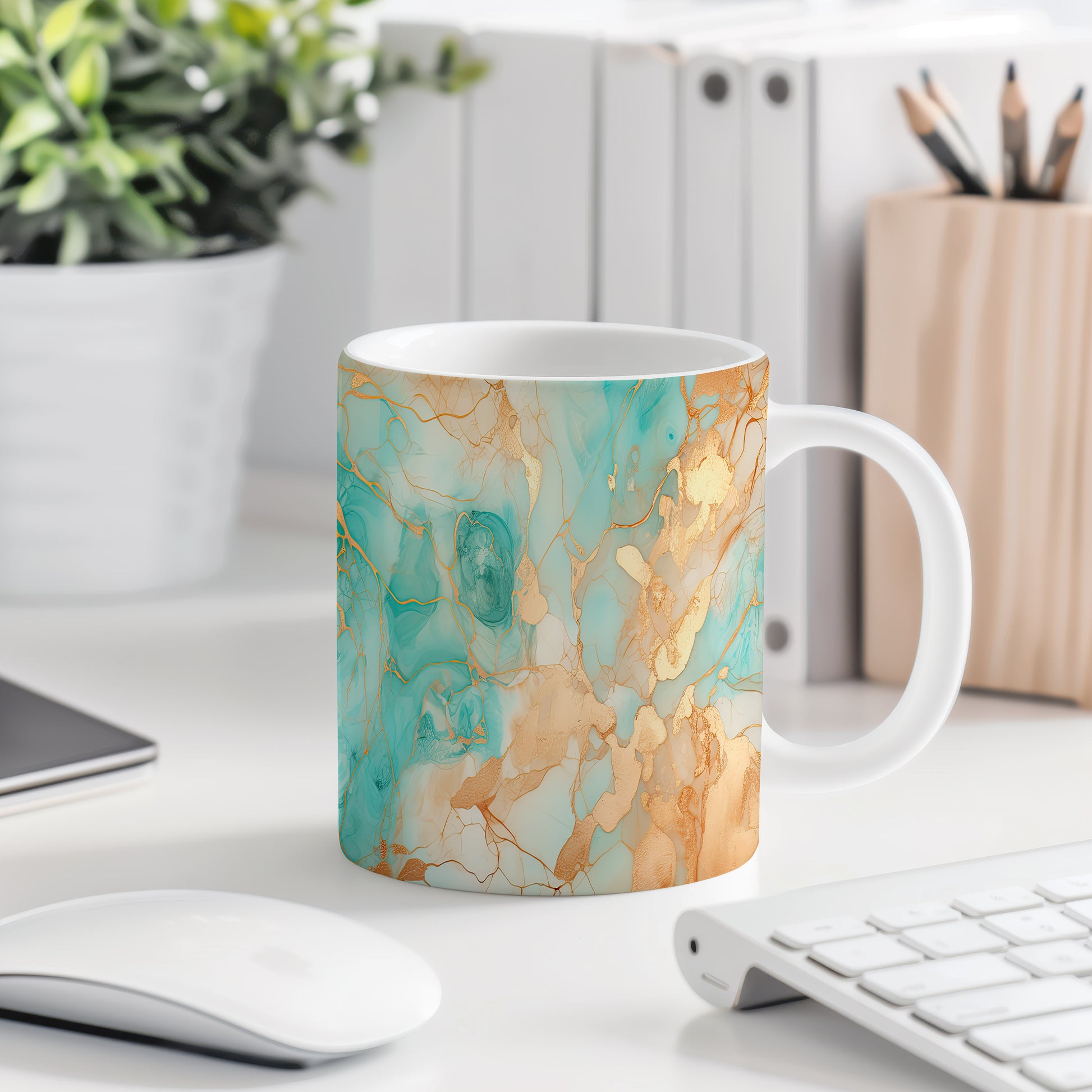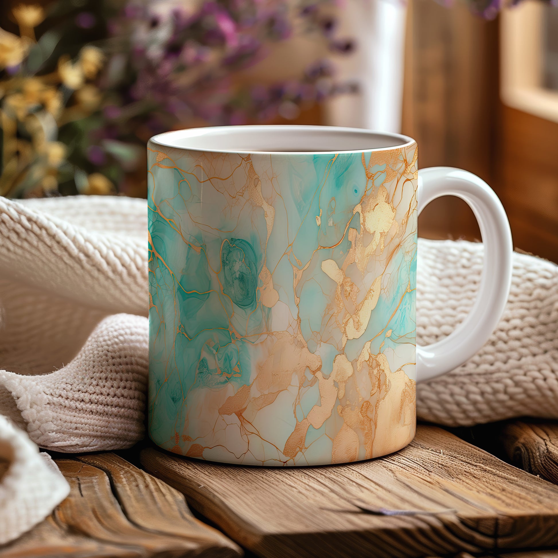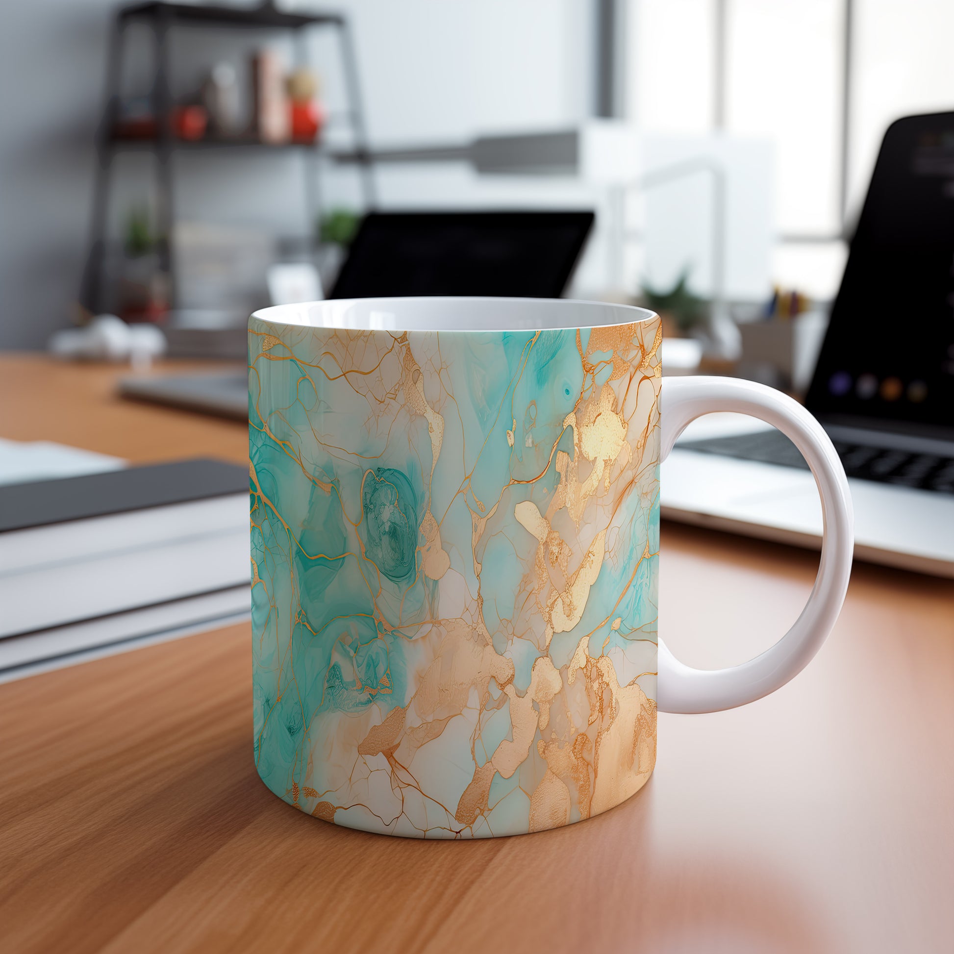 Tento hrnek s mramorováním v tyrkysových a zlatých tónech přináší elegantní a moderní vzhled. Je ideální pro milovníky stylového nádobí a skvělým dárkem pro přátele či rodinu. Materiál: keramika. Objem: 330 ml. Vhodné do myčky i mikrovlnky. Díky svému designu dodá každému nápoji jedinečný šarm.