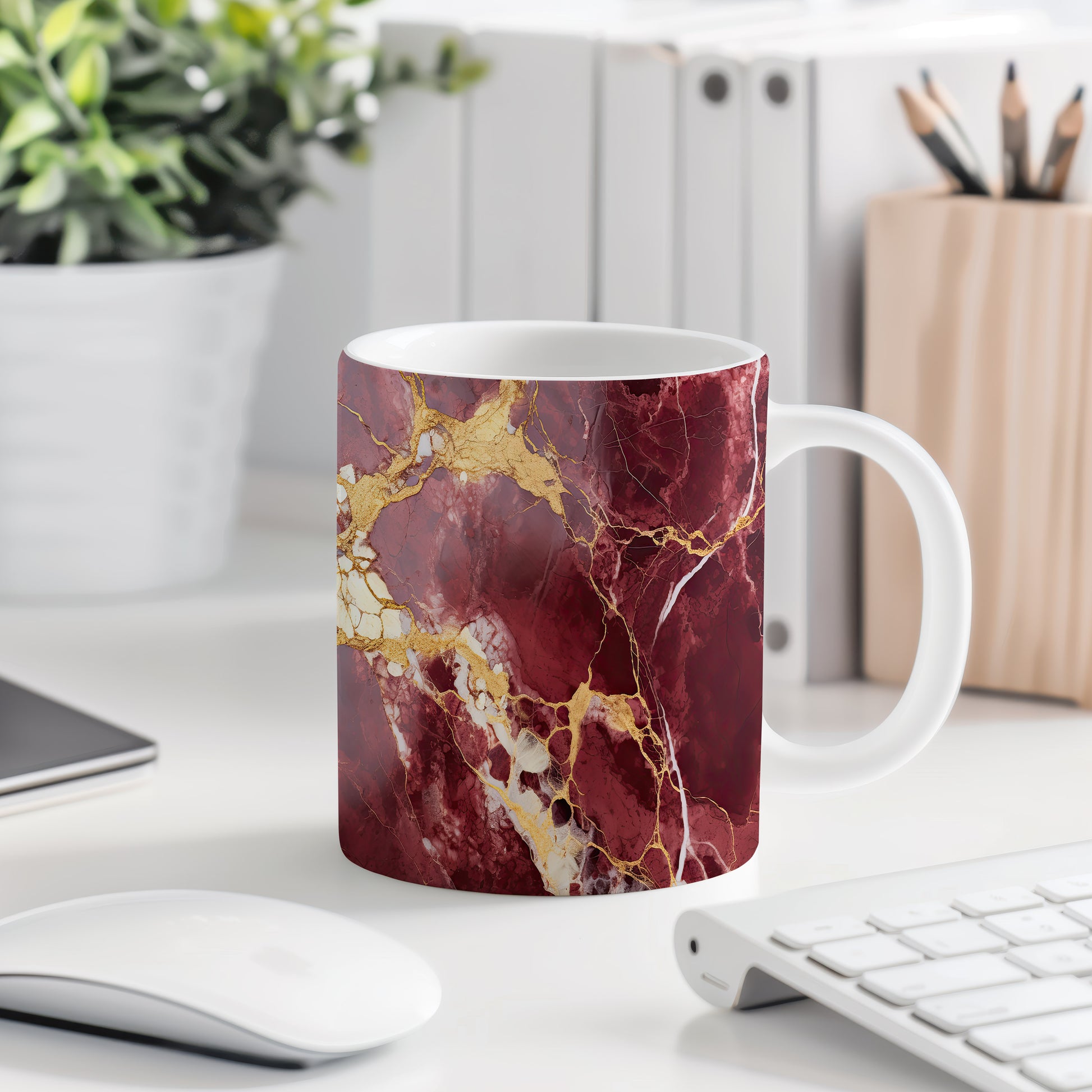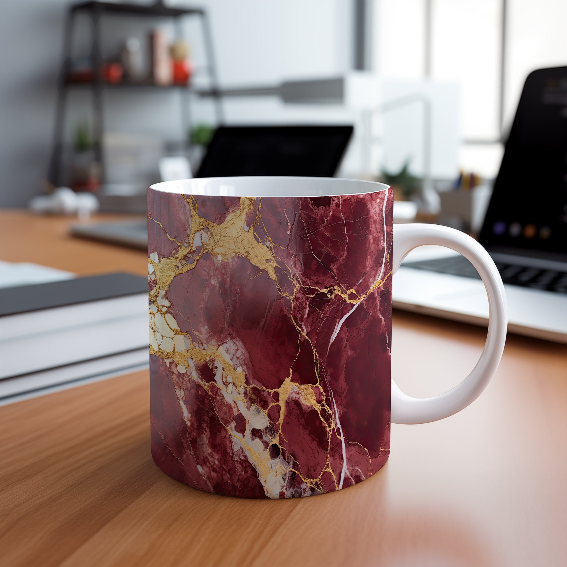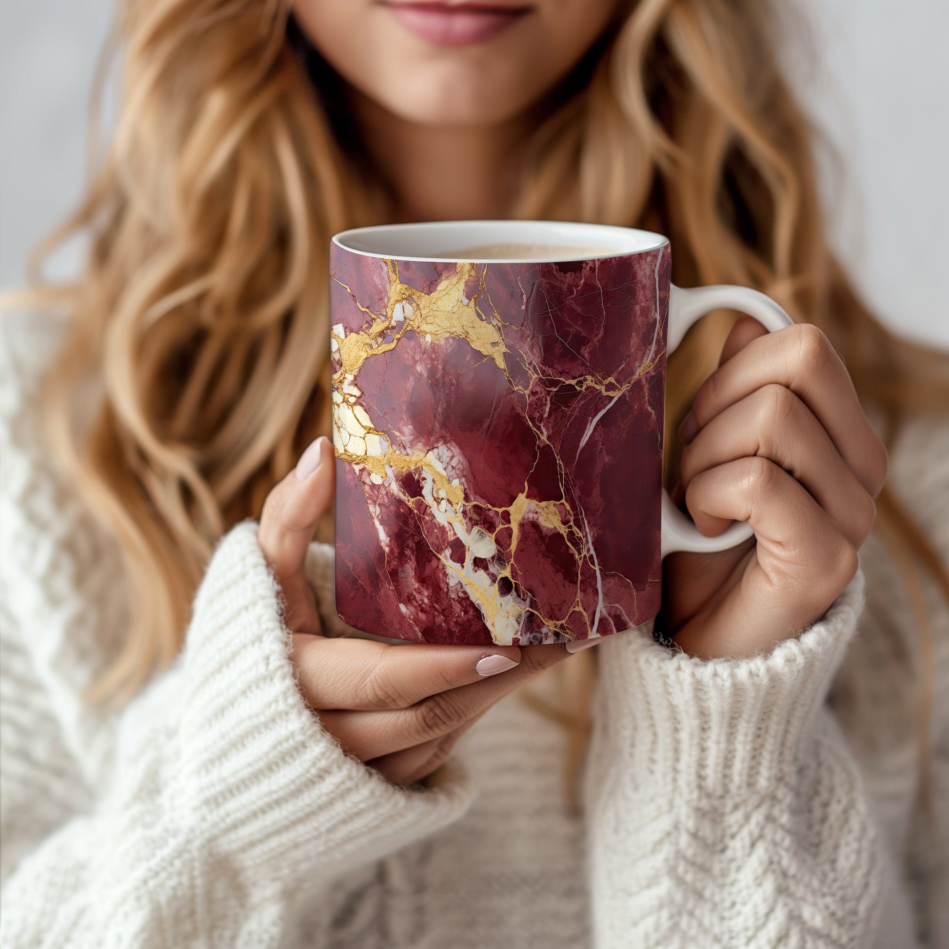 Hrnek s mramorovým vzorem v odstínech vínové barvy a jemnými zlatými žilami. Tento elegantní kousek je ideální pro milovníky stylového nádobí a skvělým dárkem pro přátele či rodinu. Materiál: keramika. Objem: 330 ml. Vhodné do myčky i mikrovlnky. Díky svému unikátnímu vzhledu přináší do každodenního pití kávy nebo čaje nádech luxusu.