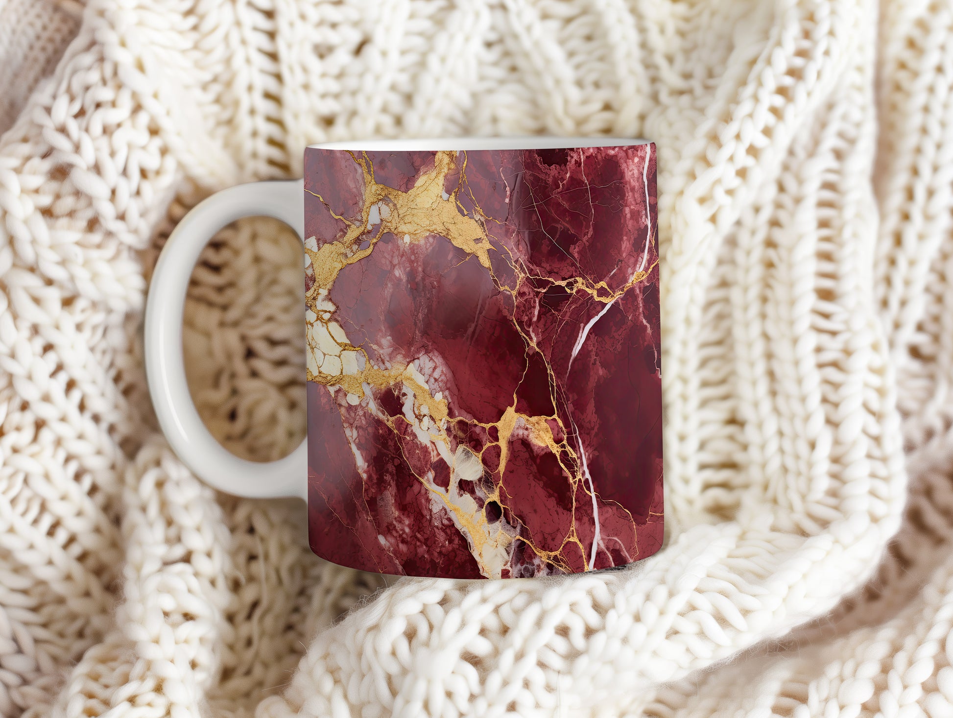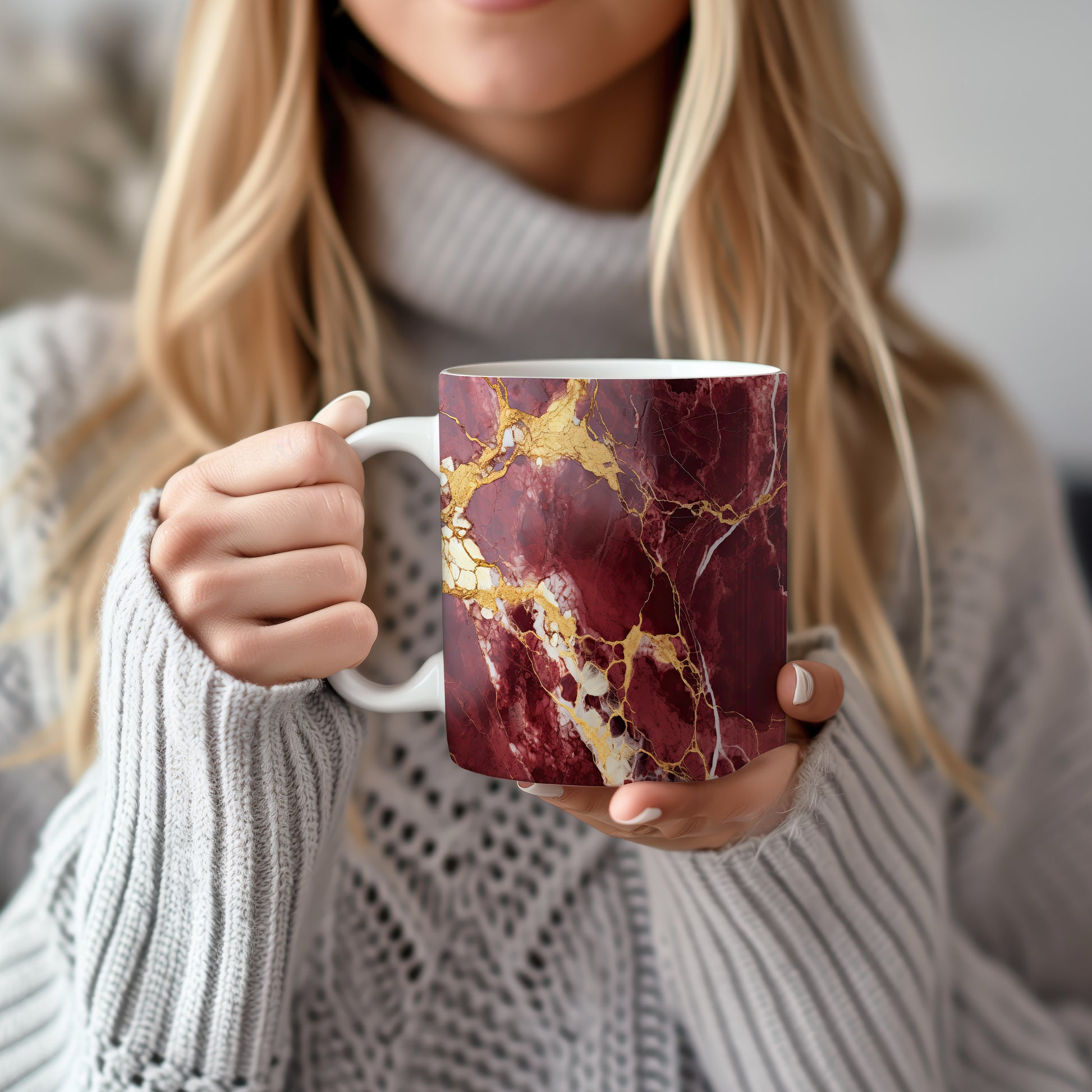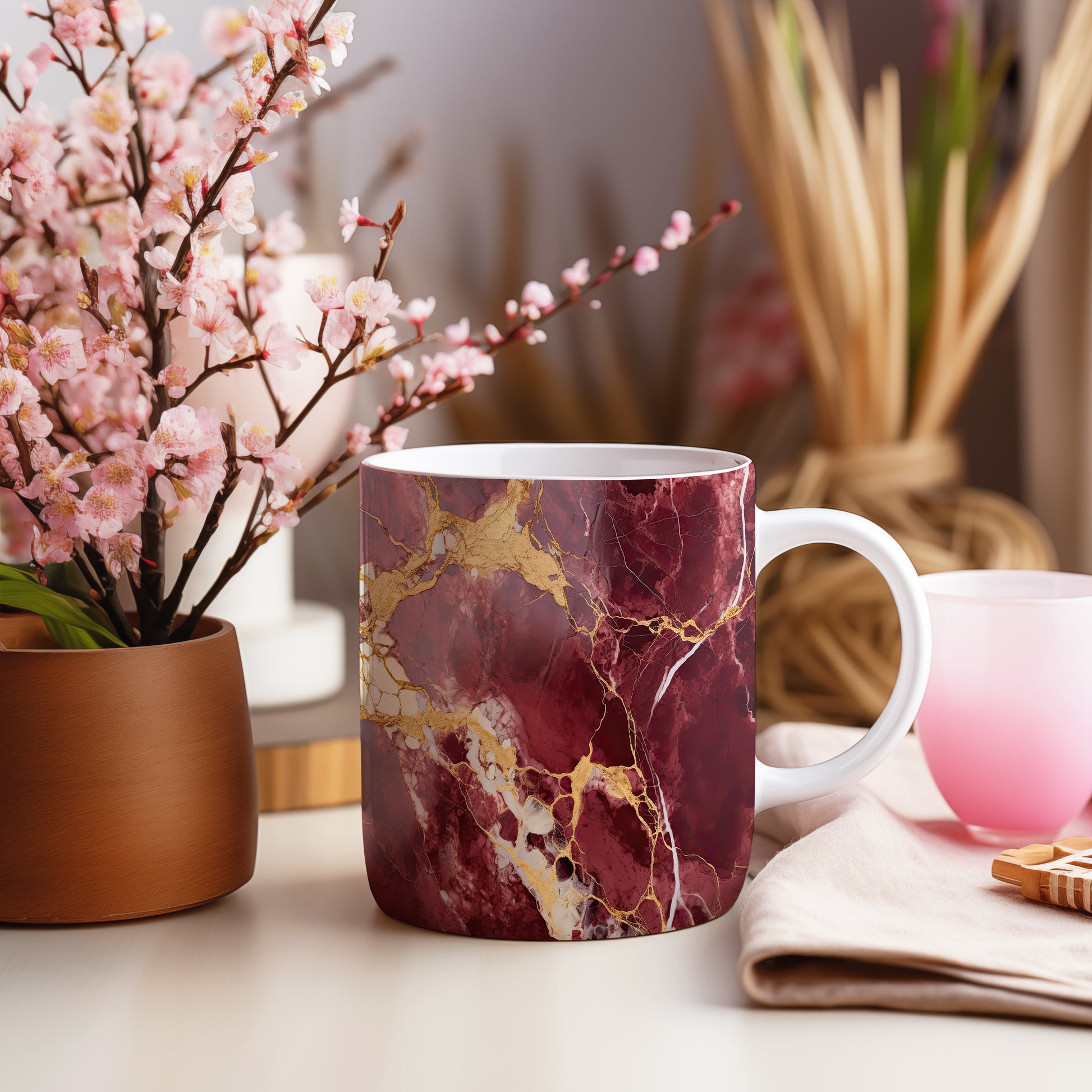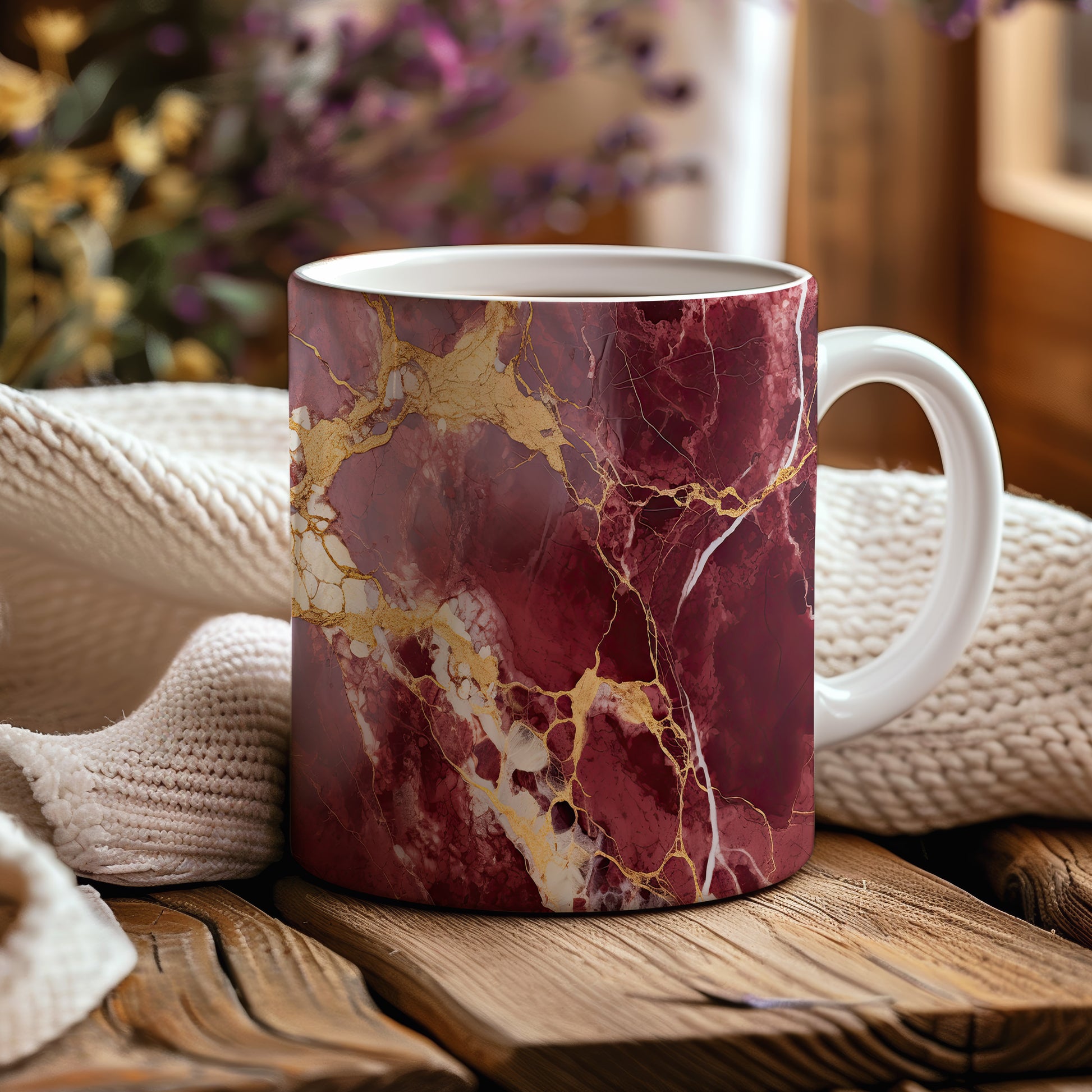 Hrnek s mramorovým vzorem v odstínech vínové barvy a jemnými zlatými žilami. Tento elegantní kousek je ideální pro milovníky stylového nádobí a skvělým dárkem pro přátele či rodinu. Materiál: keramika. Objem: 330 ml. Vhodné do myčky i mikrovlnky. Díky svému unikátnímu vzhledu přináší do každodenního pití kávy nebo čaje nádech luxusu.