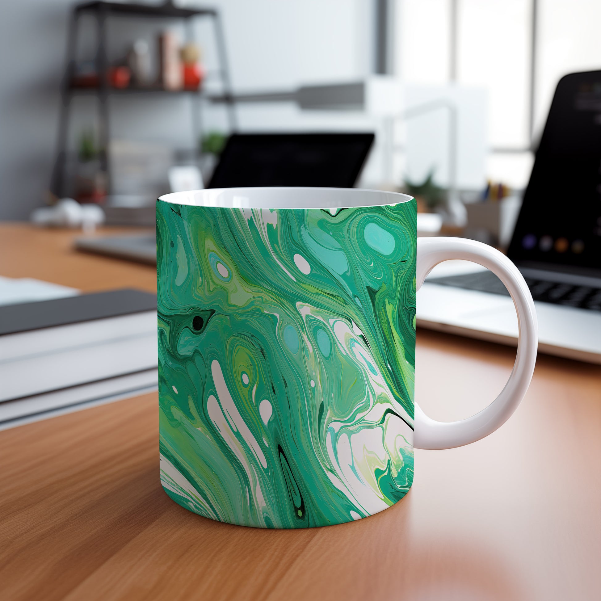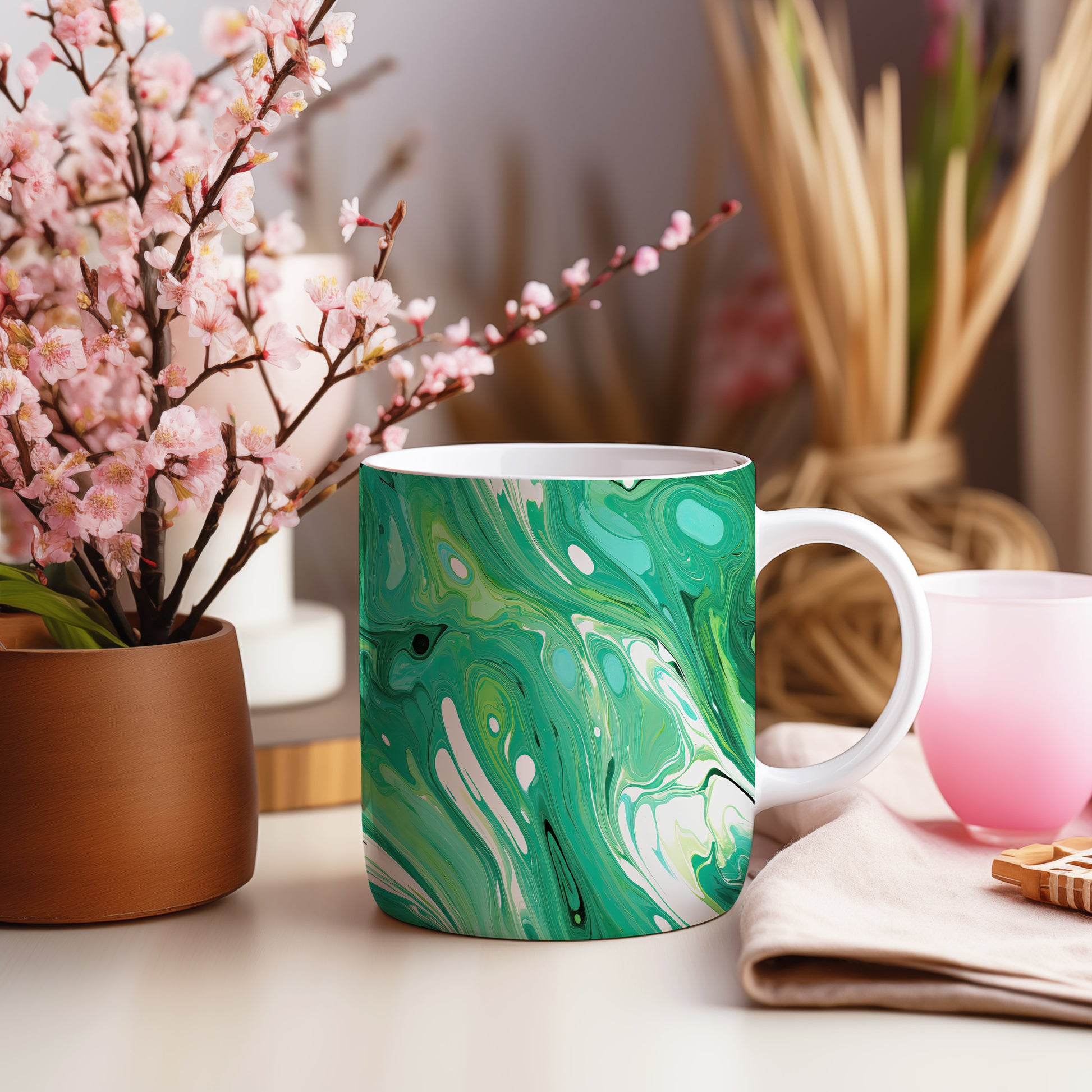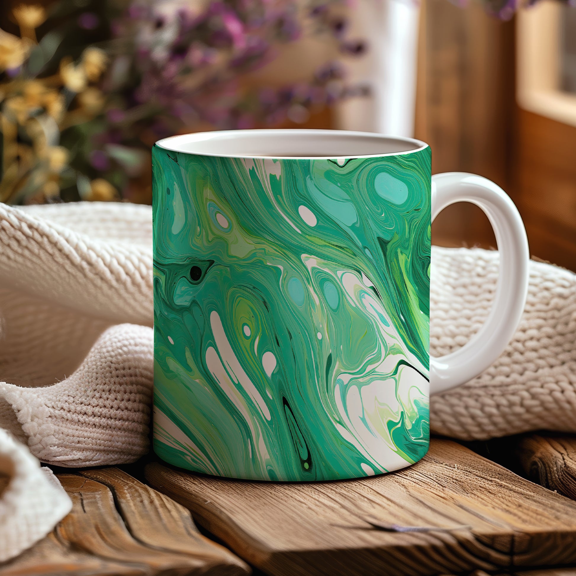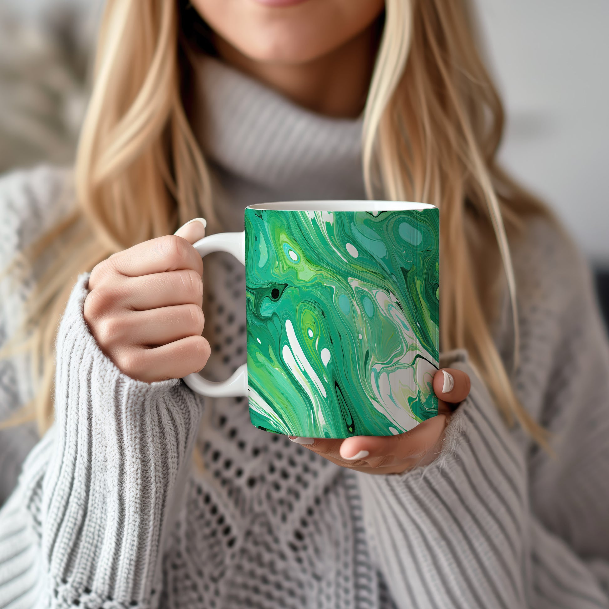 Tento hrnek s mramorováním v zelených a bílých tónech přináší elegantní a moderní vzhled. Je ideální pro milovníky stylového nádobí a skvělým dárkem pro přátele či rodinu. Materiál: keramika. Objem: 330 ml. Vhodné do myčky i mikrovlnky. Díky unikátnímu designu se stane ozdobou každého stolu.