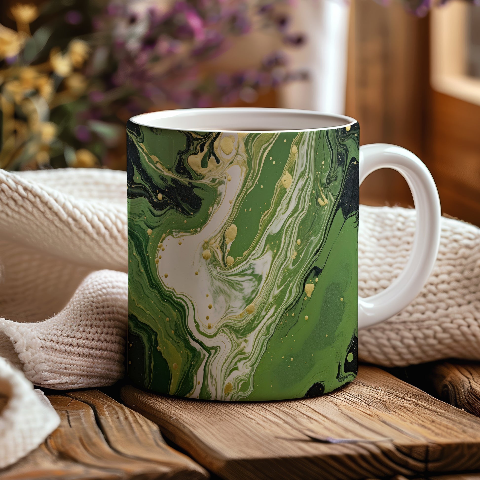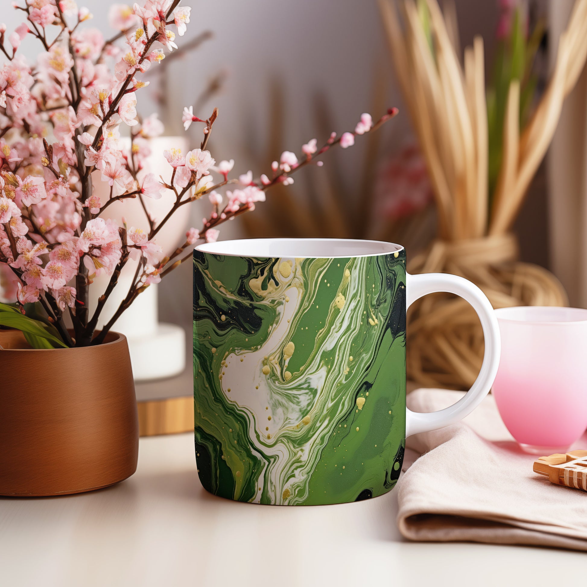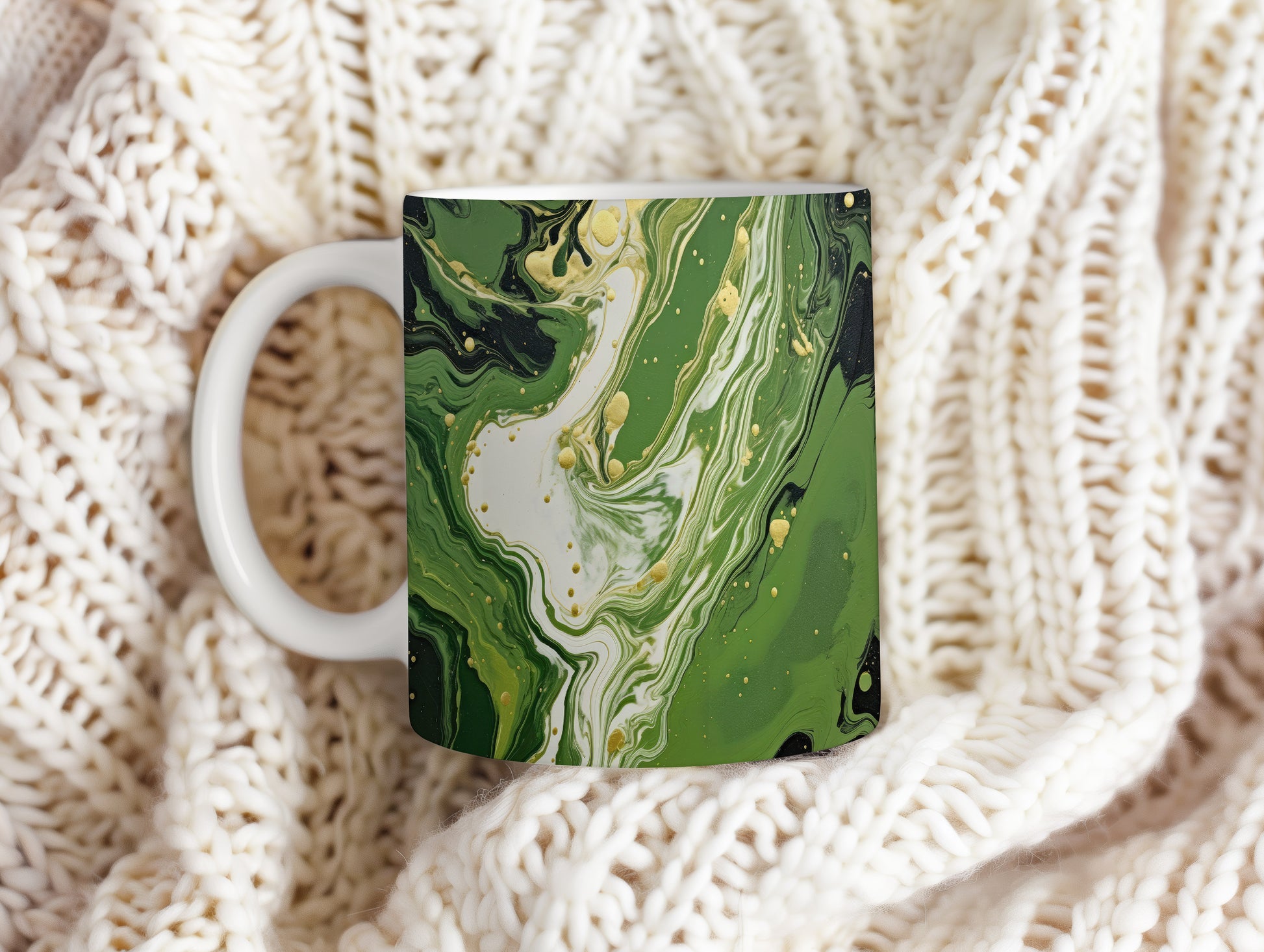 Hrnek s mramorováním v zelených a zlatých tónech