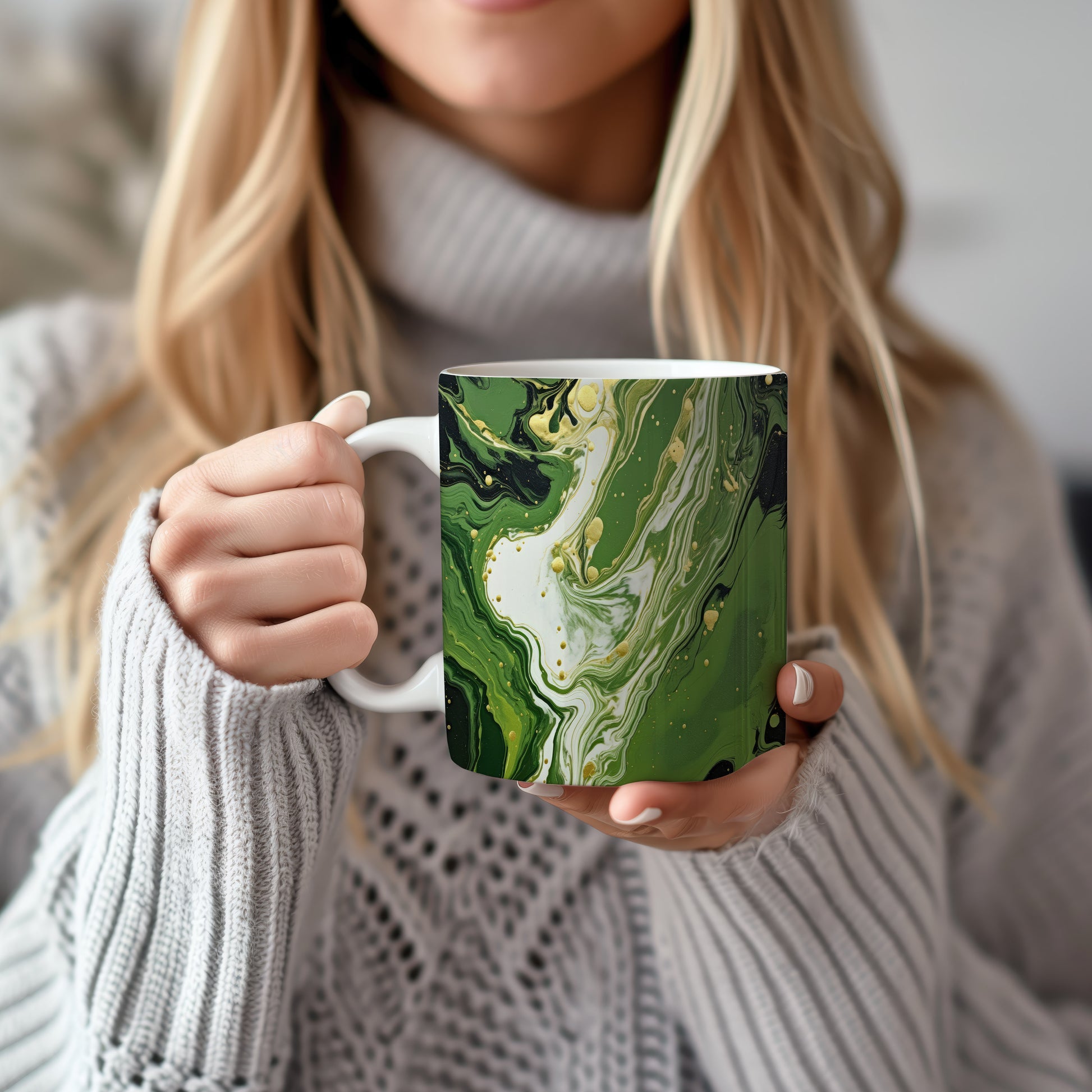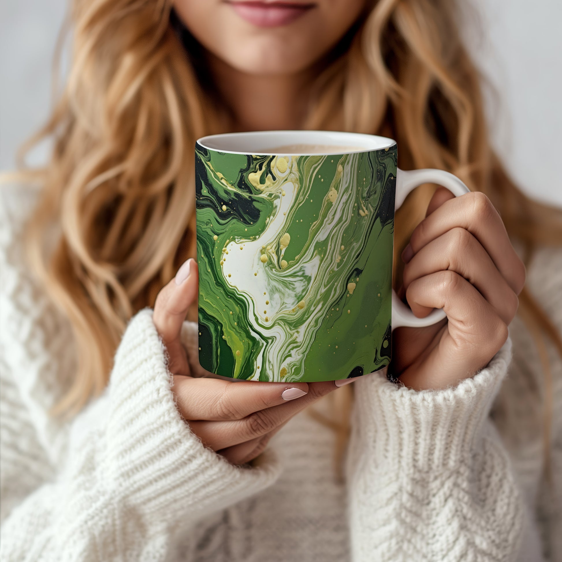 Tento hrnek s mramorovým vzorem v zelených a zlatých tónech přináší elegantní a moderní vzhled. Je ideální pro milovníky stylového nádobí a skvělým dárkem pro přátele či rodinu. Hrnky jsou vyrobené z keramiky o objemu 330 ml, vhodné do myčky i mikrovlnky. Díky svému designu dodají každému nápoji šmrnc a potěší oko každého uživatele.