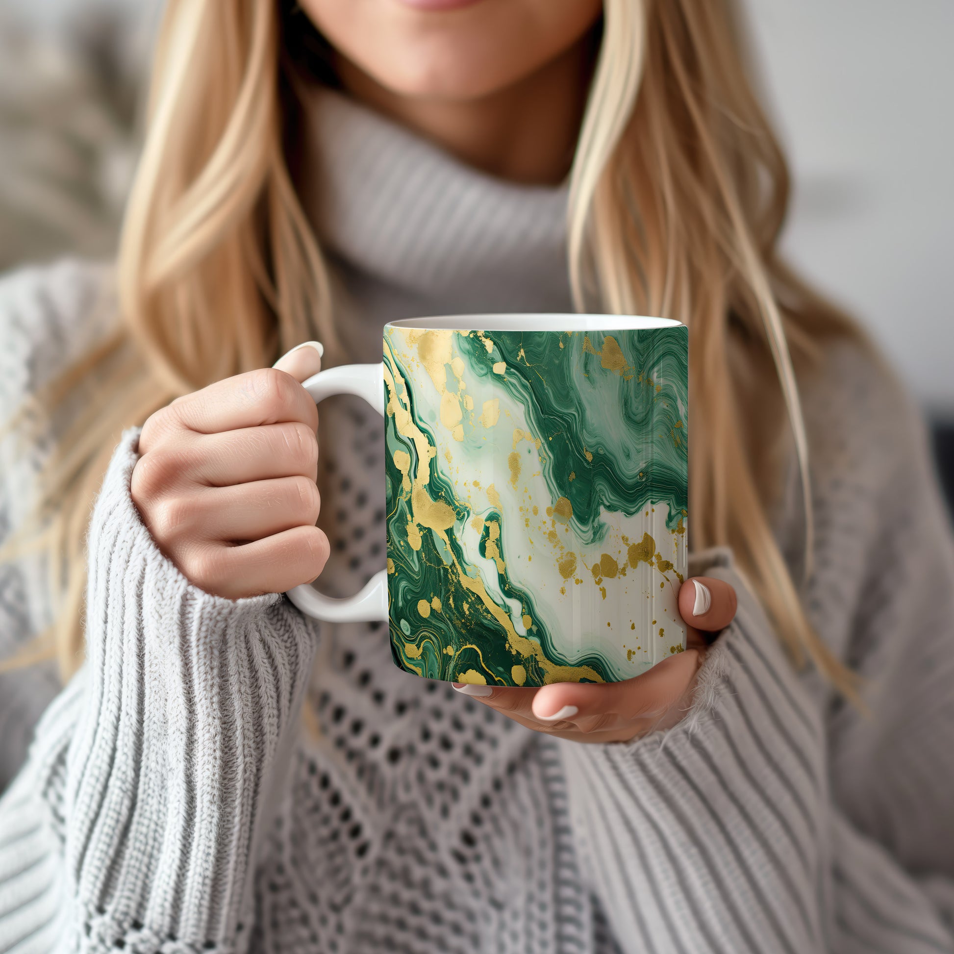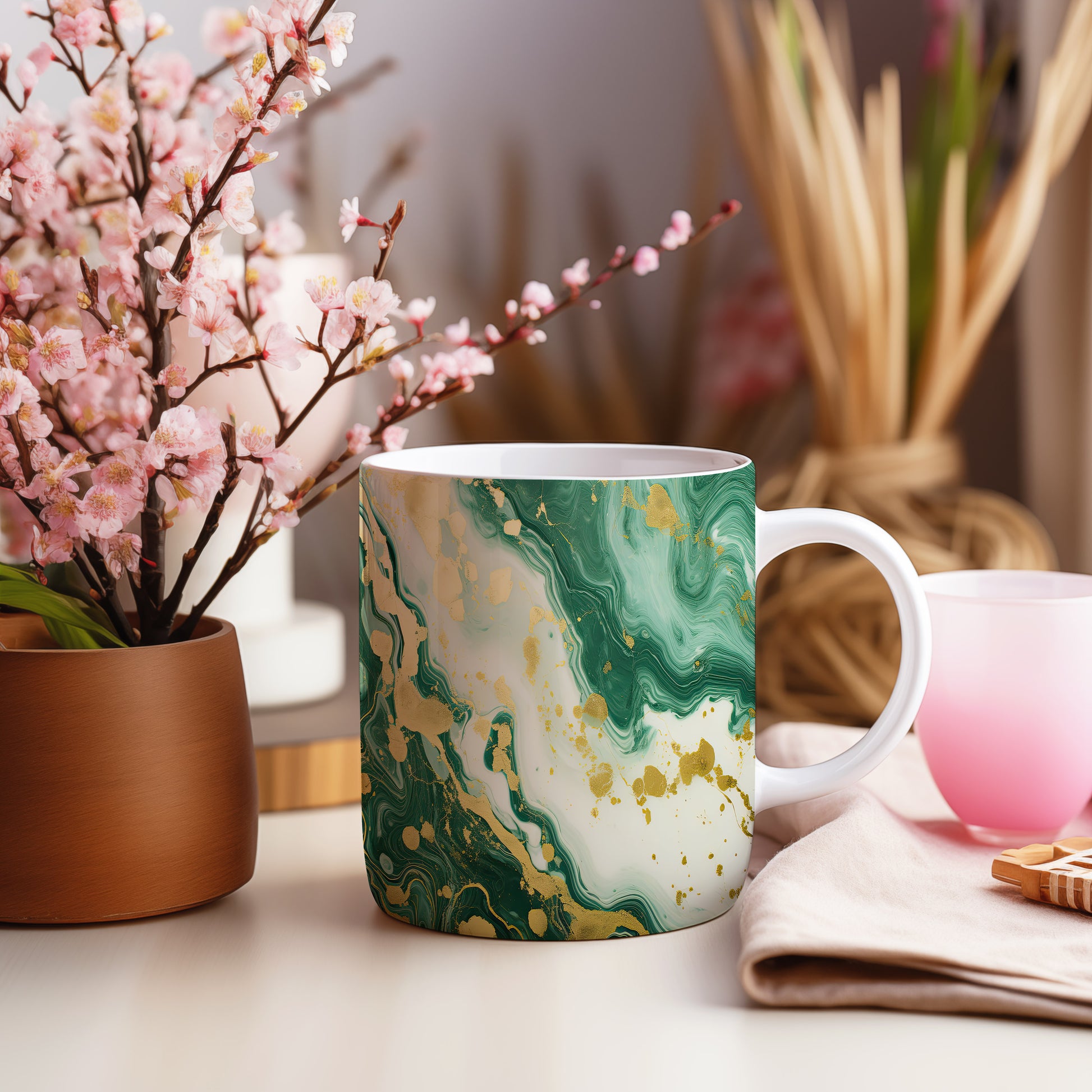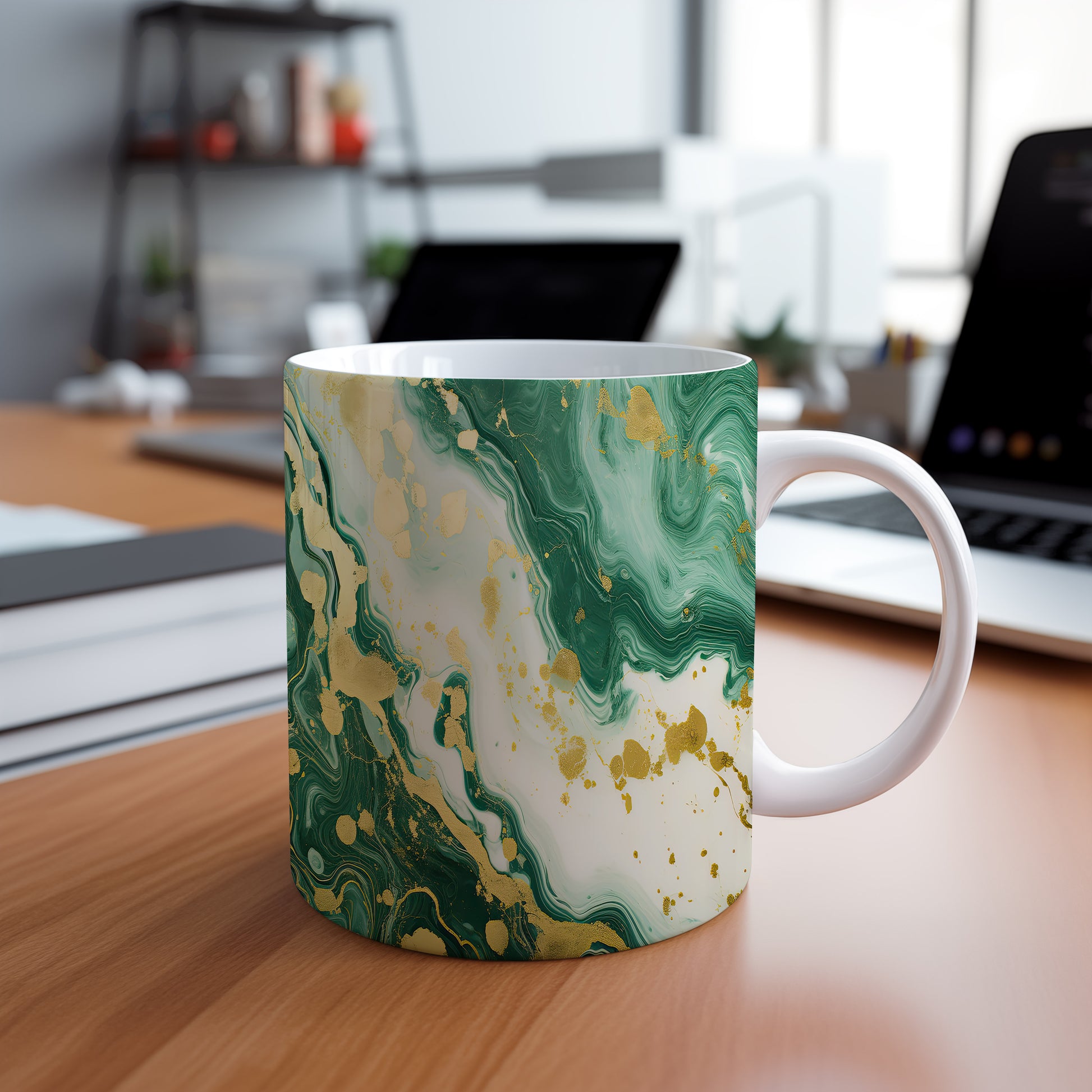 Tento hrnek s mramorovým efektem v zelených a zlatých odstínech přináší elegantní a minimalistický styl. Je ideální pro milovníky moderního designu a skvělým dárkem pro přátele nebo rodinu. Materiál: keramika. Objem: 330 ml. Vhodné do myčky i mikrovlnky. Díky svému jedinečnému vzhledu se stane ozdobou každého stolu.
