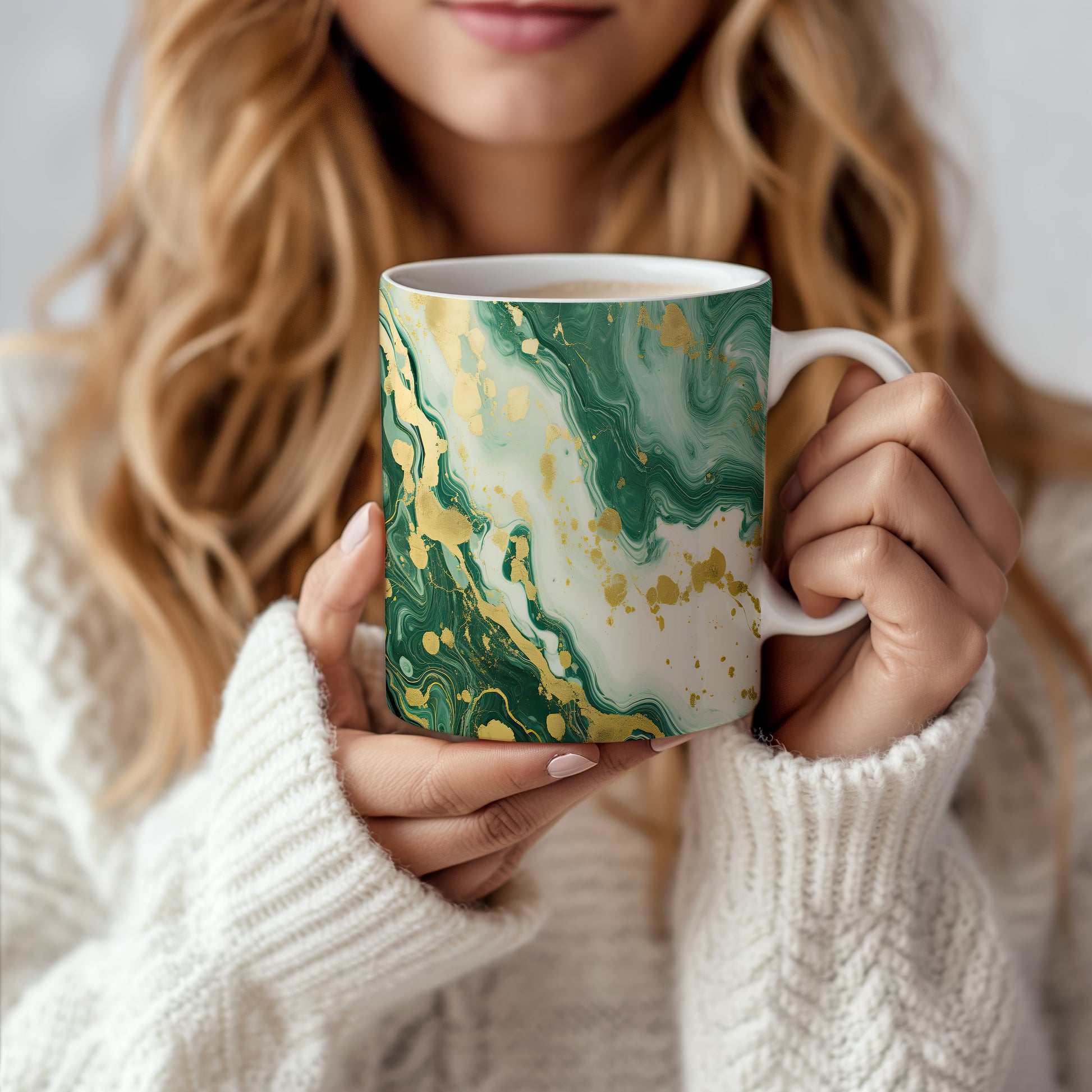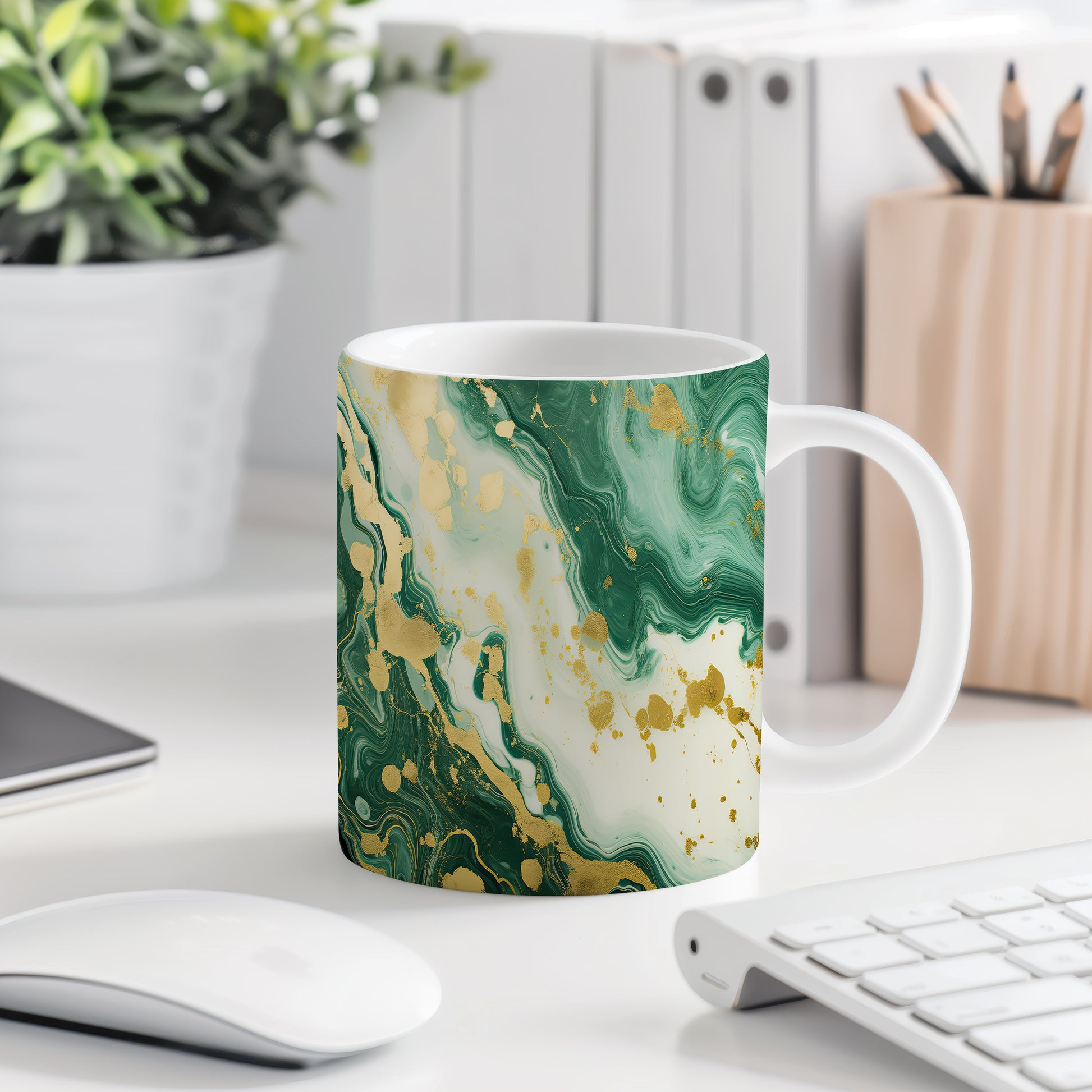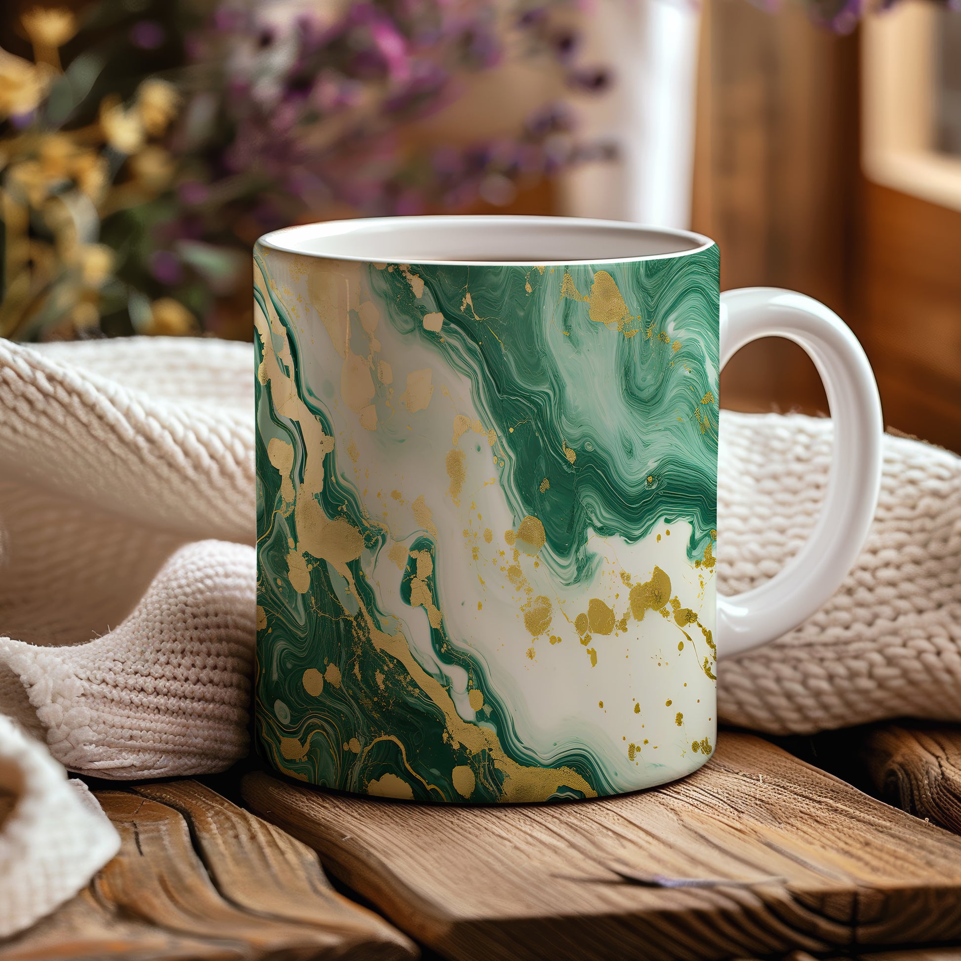 Tento hrnek s mramorovým efektem v zelených a zlatých odstínech přináší elegantní a minimalistický styl. Je ideální pro milovníky moderního designu a skvělým dárkem pro přátele nebo rodinu. Materiál: keramika. Objem: 330 ml. Vhodné do myčky i mikrovlnky. Díky svému jedinečnému vzhledu se stane ozdobou každého stolu.