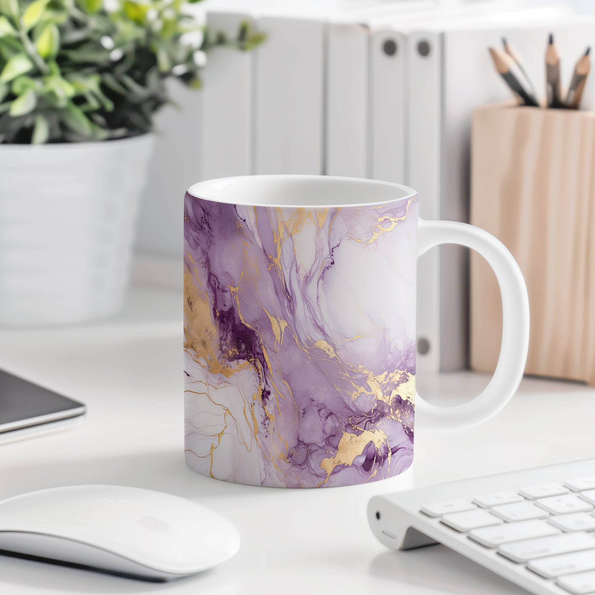 Hrnek s mramorováním ve fialových a zlatých tónech – výrazným designem