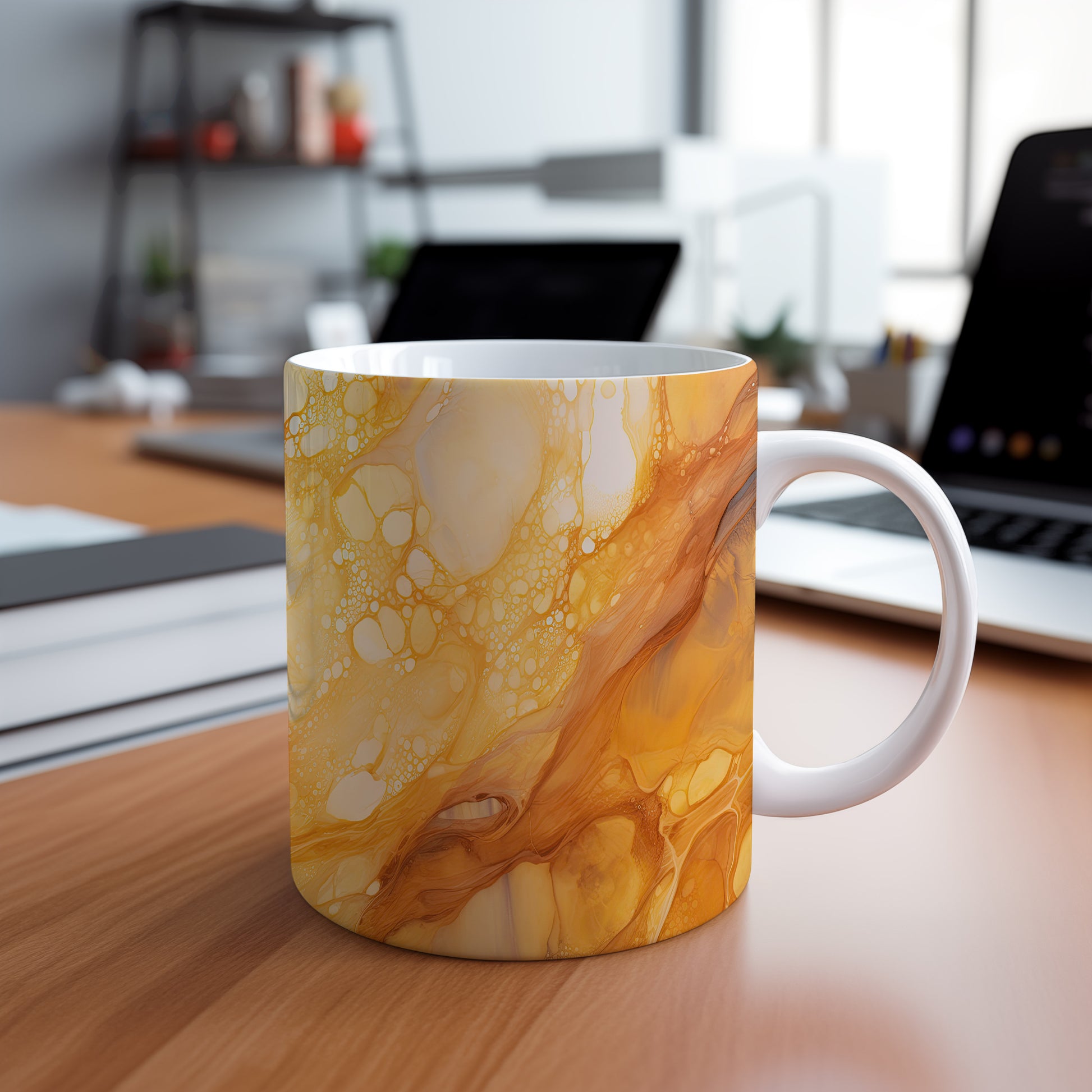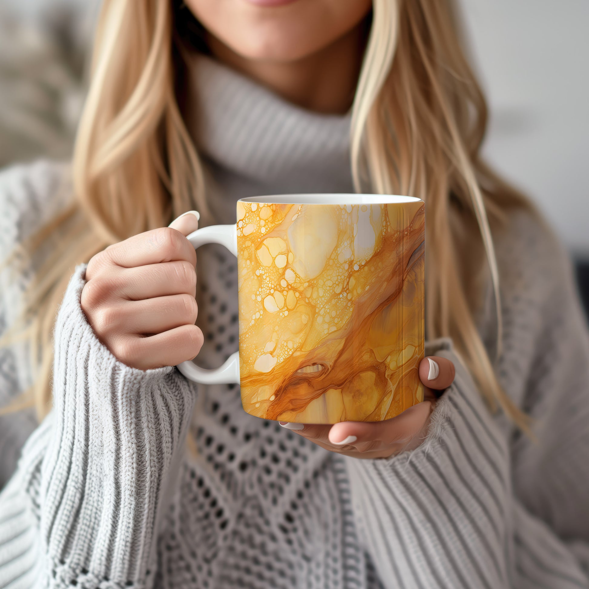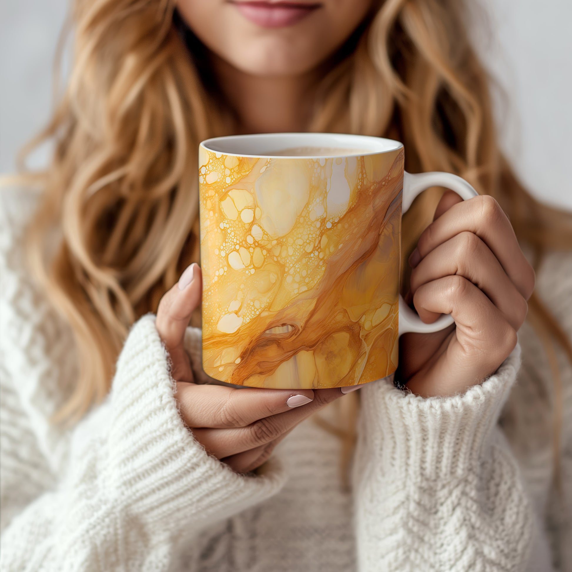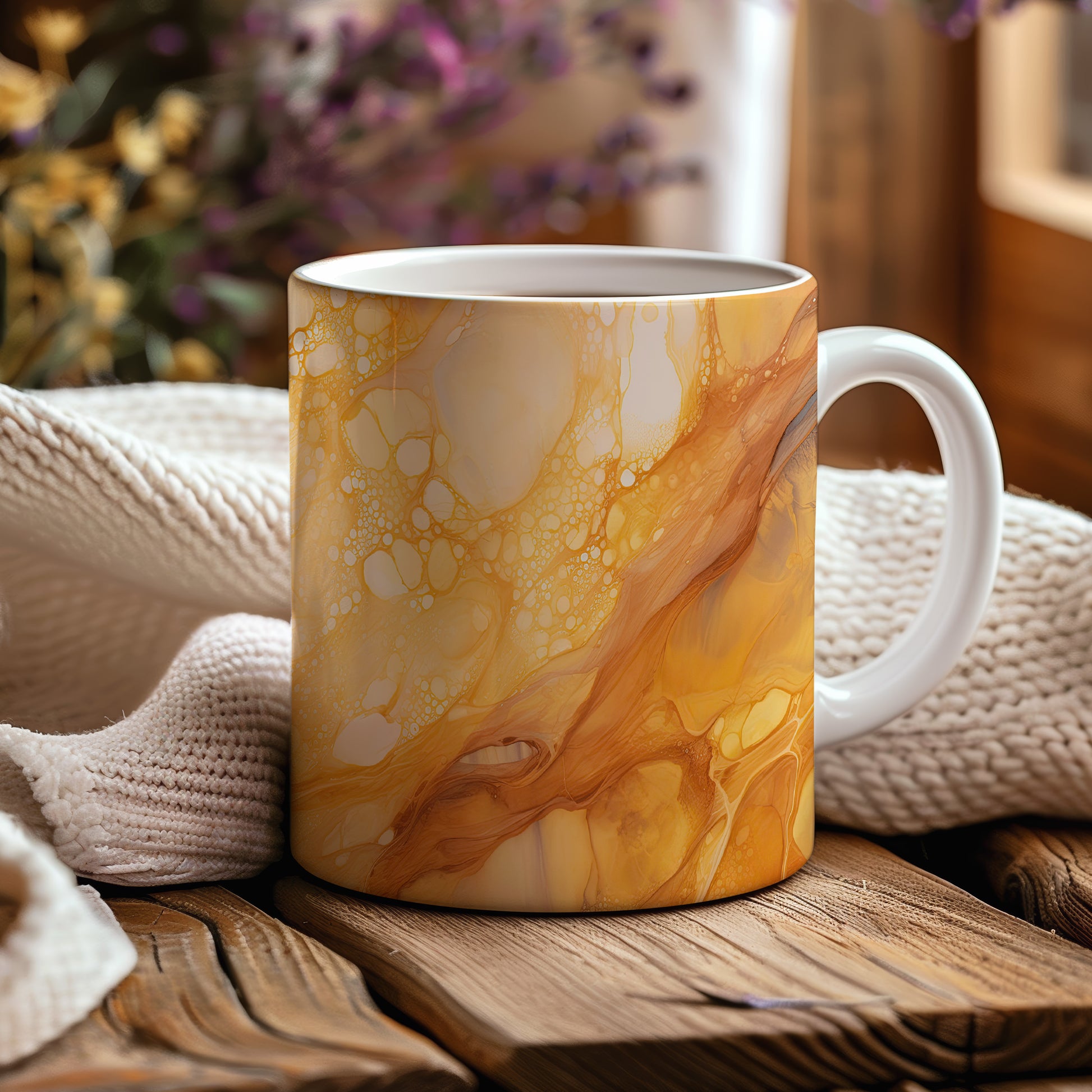 Hrnek s mramorovým vzorem v oranžových a béžových tónech