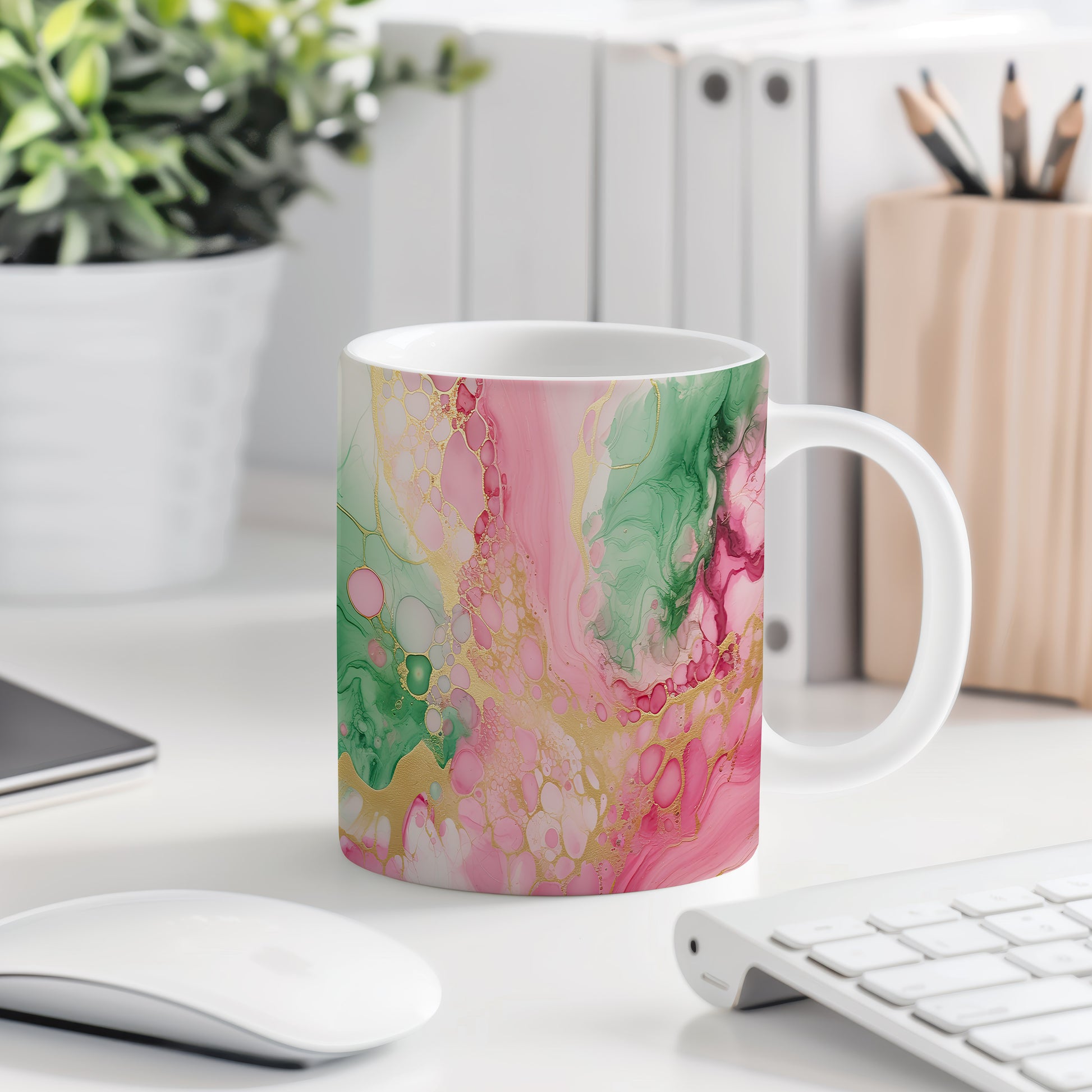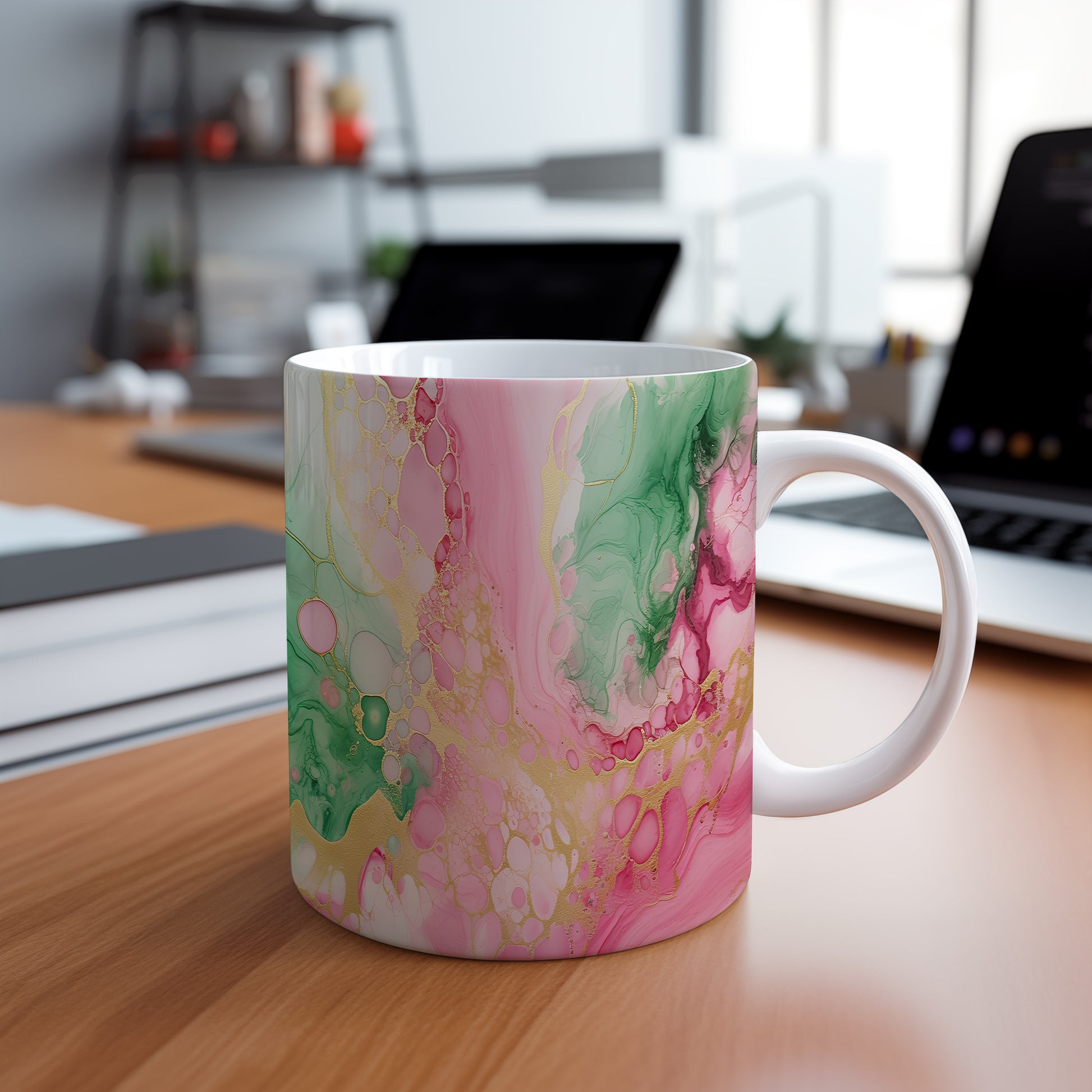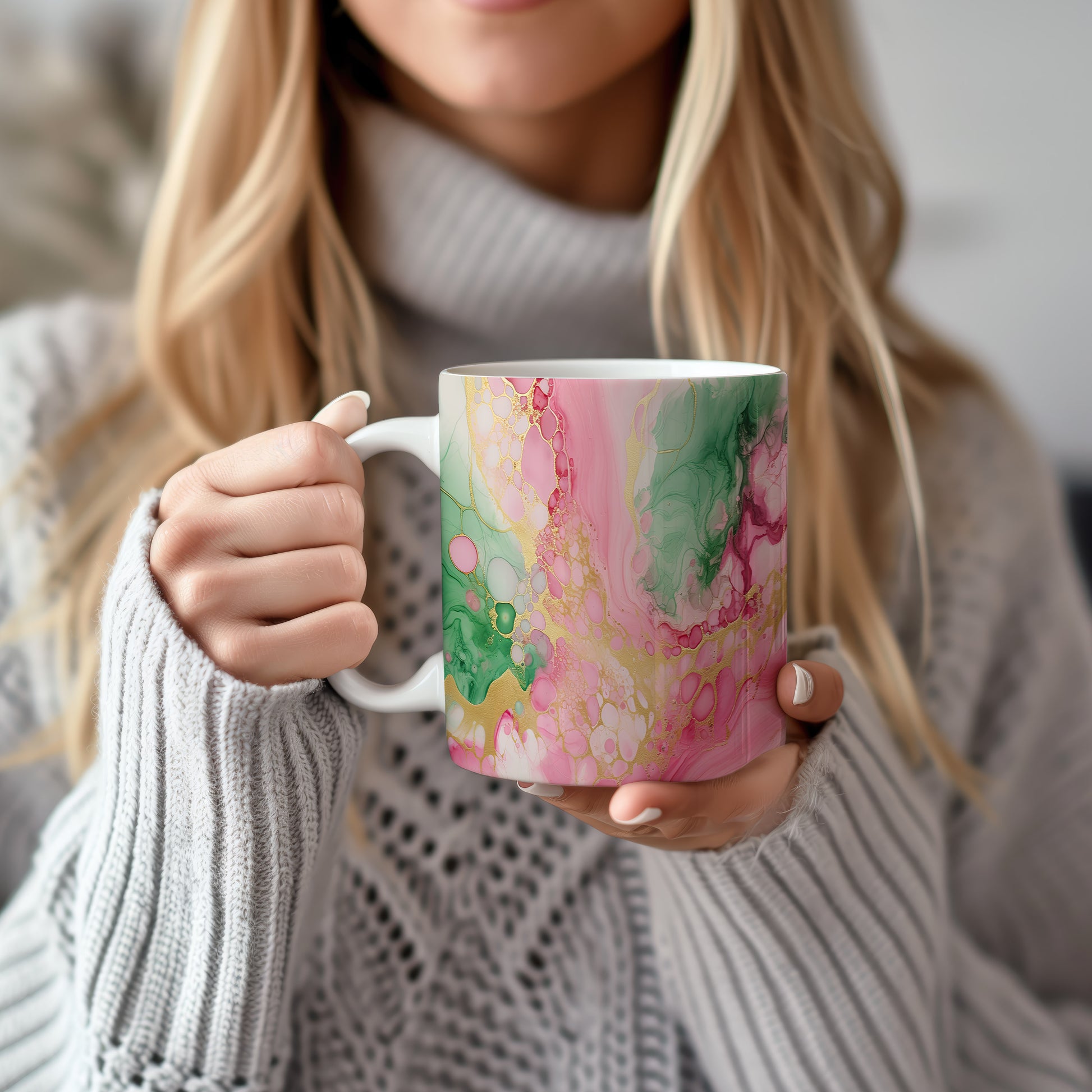 Hrnek s mramorovým vzorem v růžových a zelených tónech