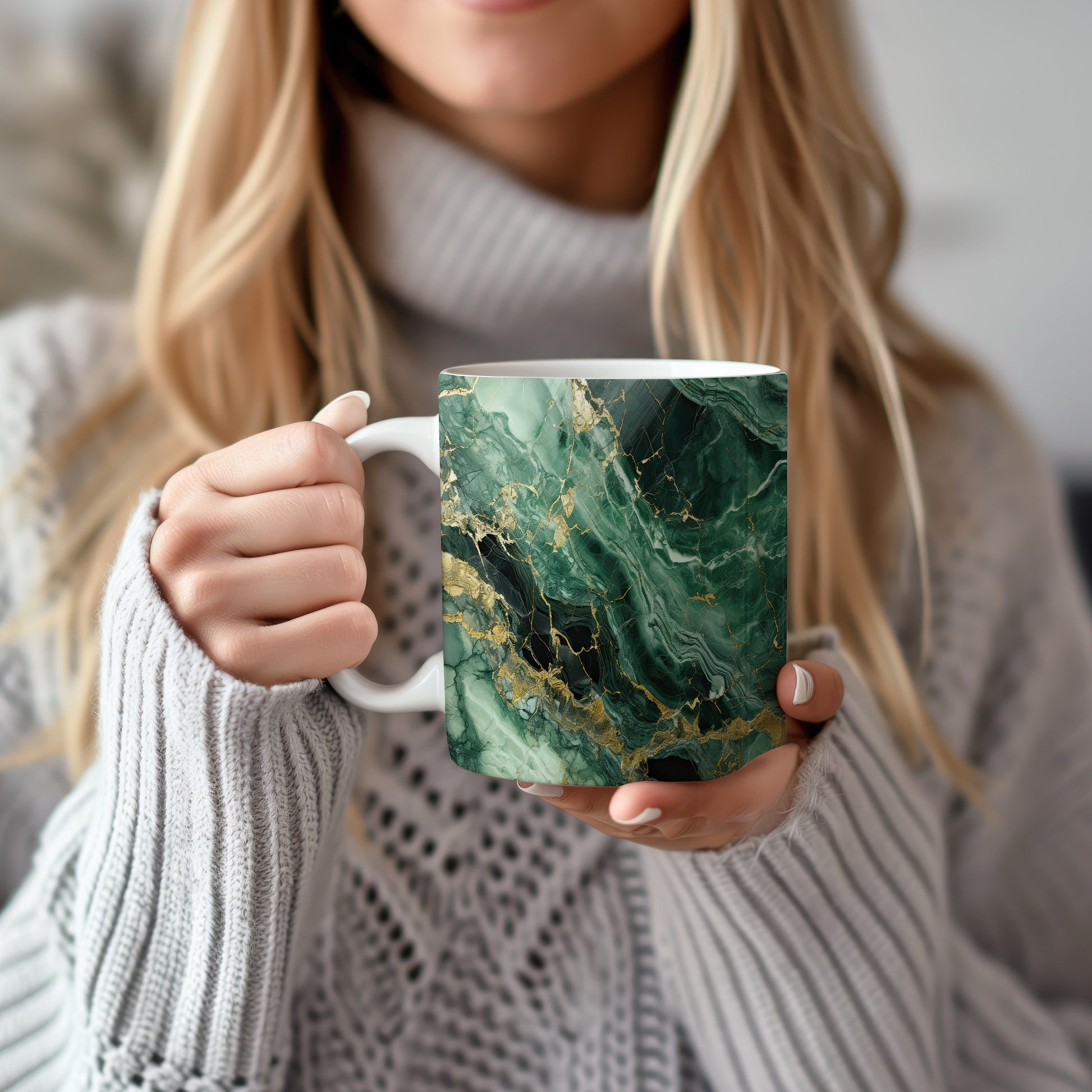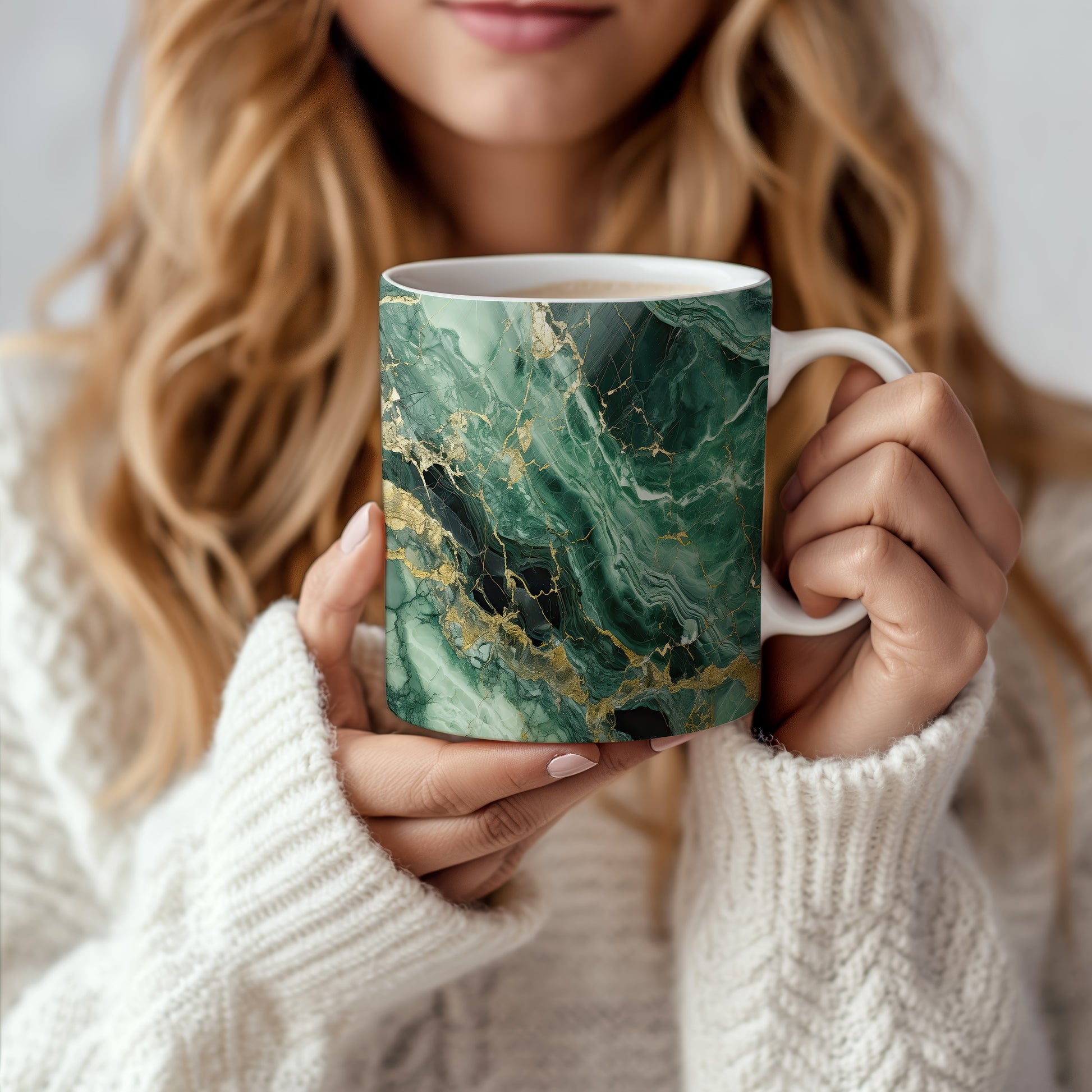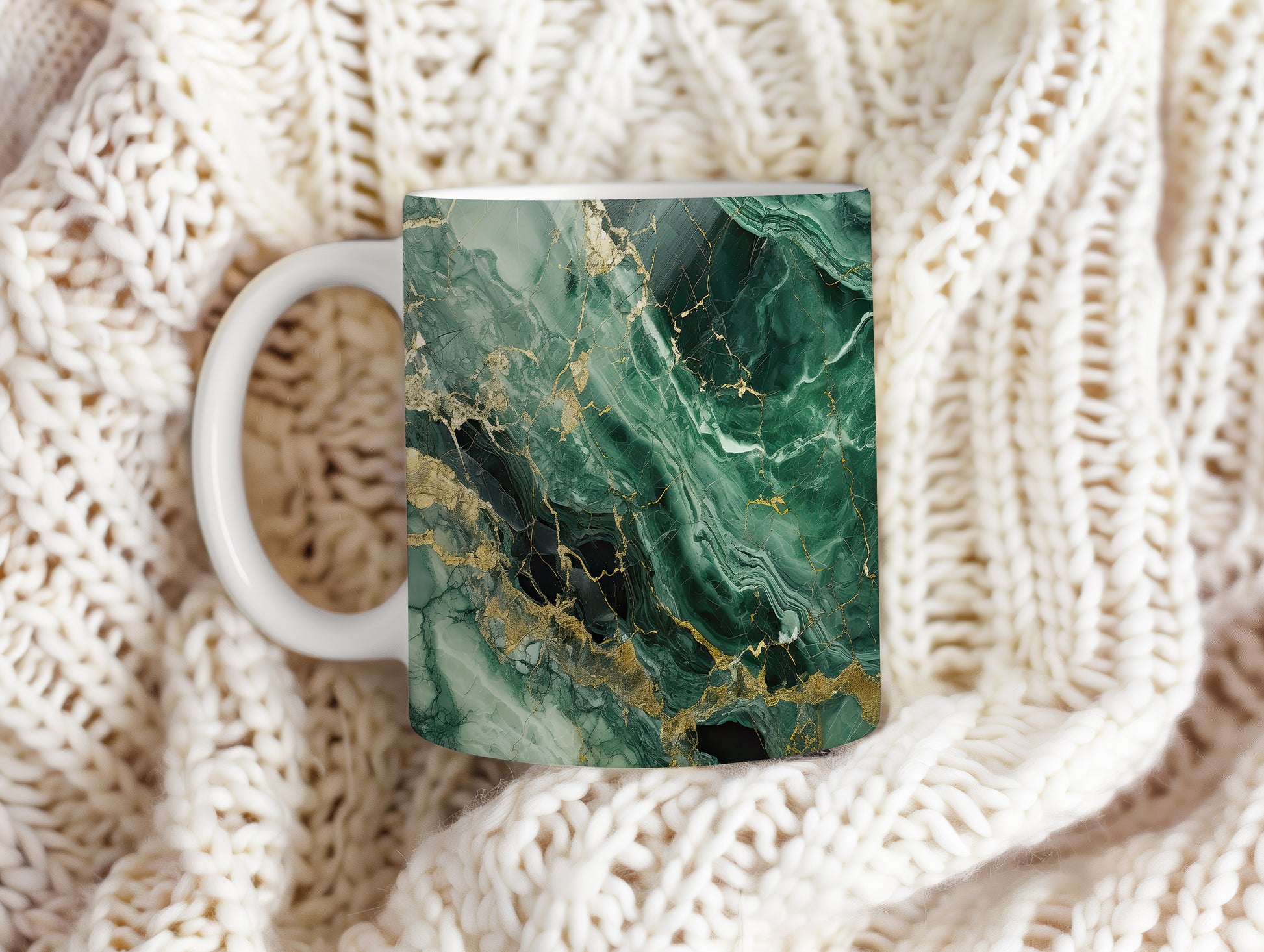 Hrnek s mramorovým vzorem v zelených a zlatých tónech – dárkovým tipem