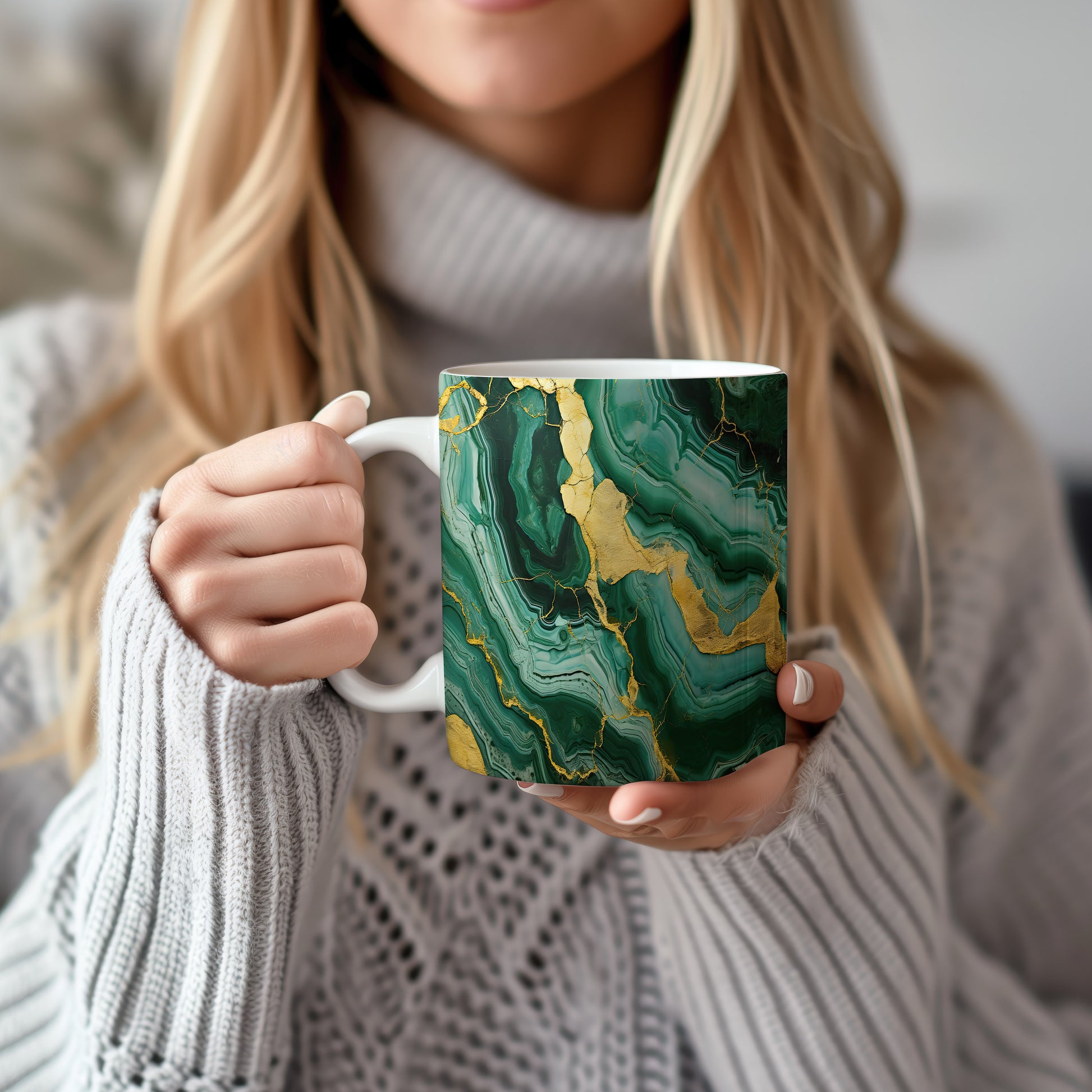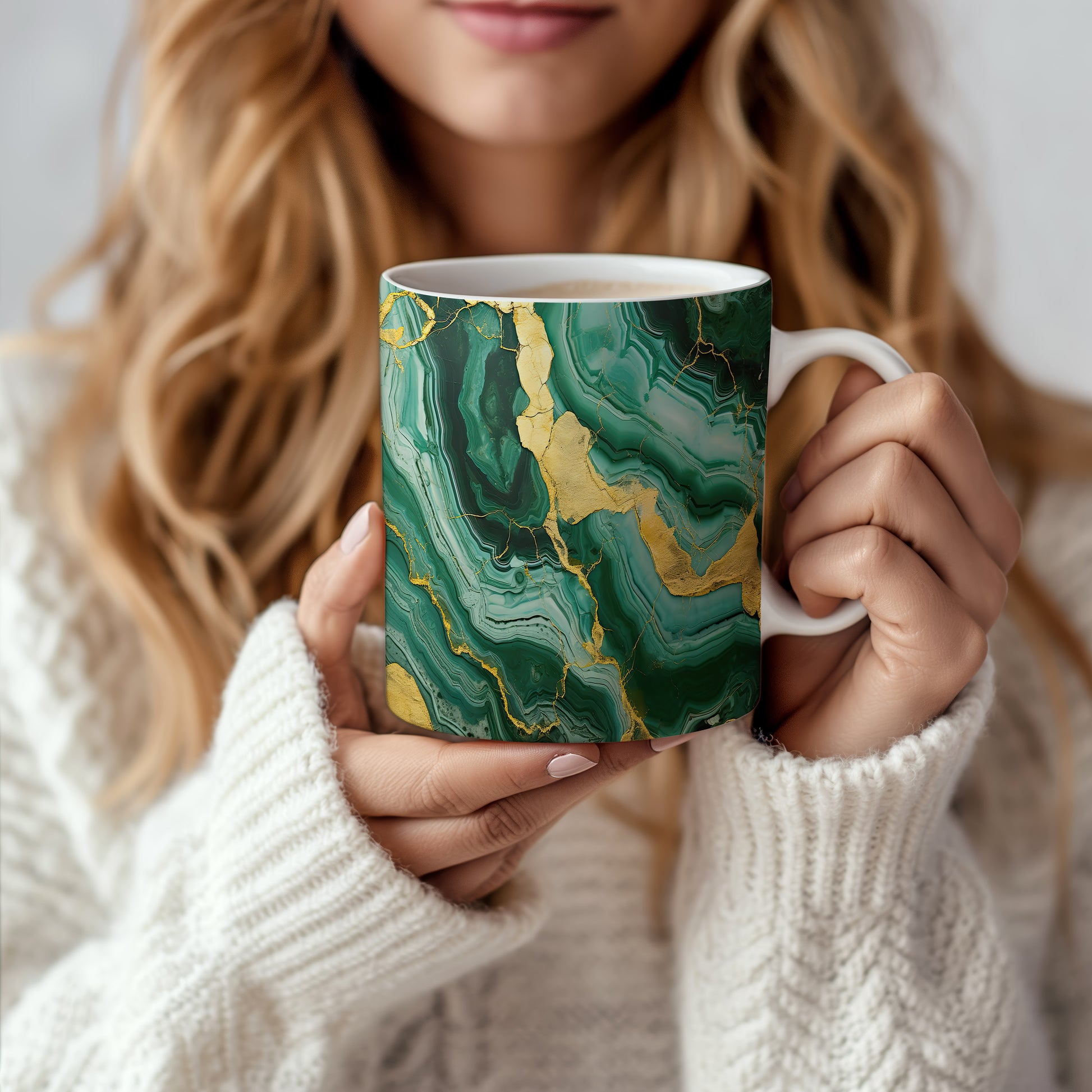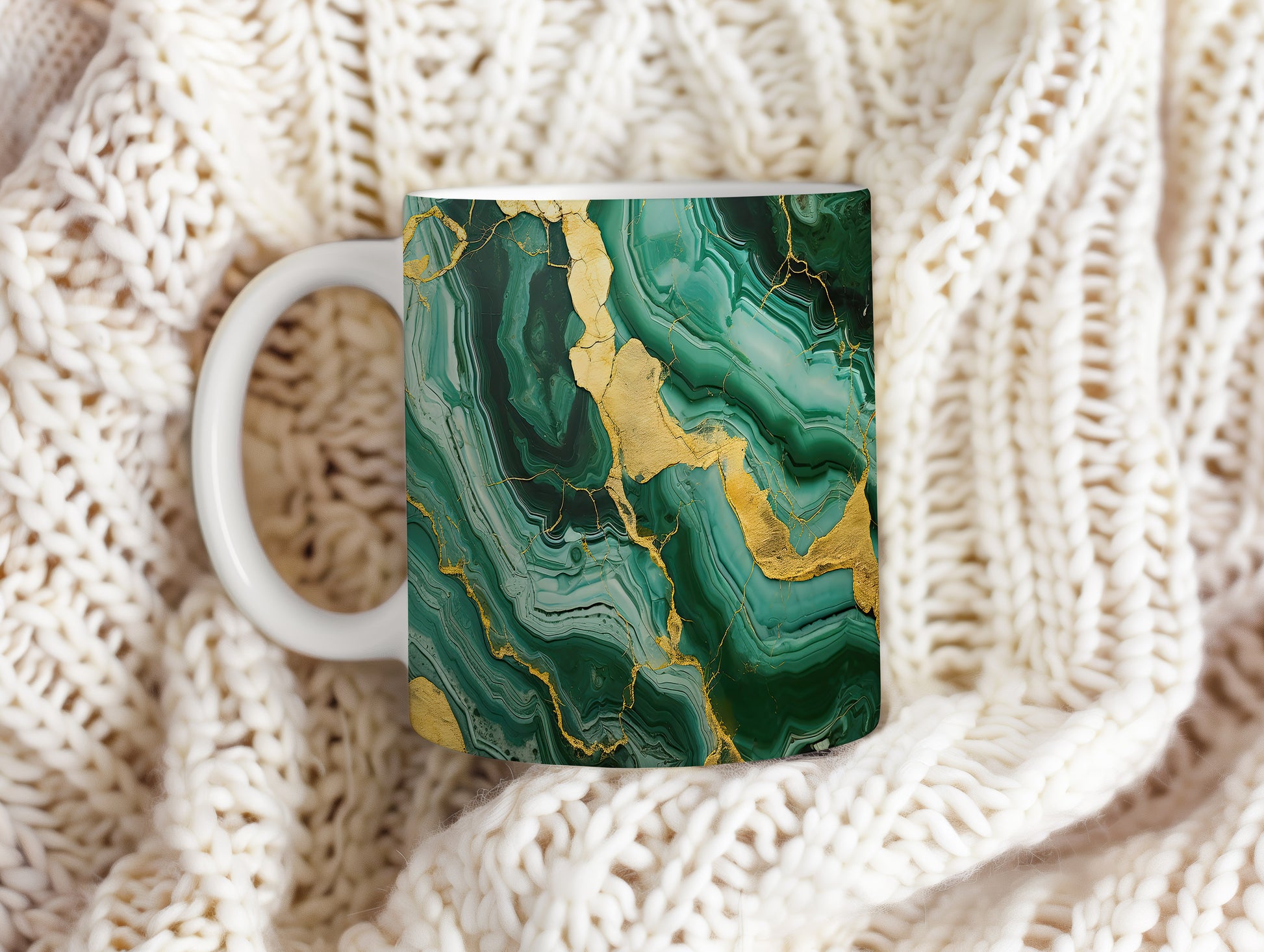 Hrnek s mramorovým vzorem v zelených a zlatých tónech – jemnými detaily