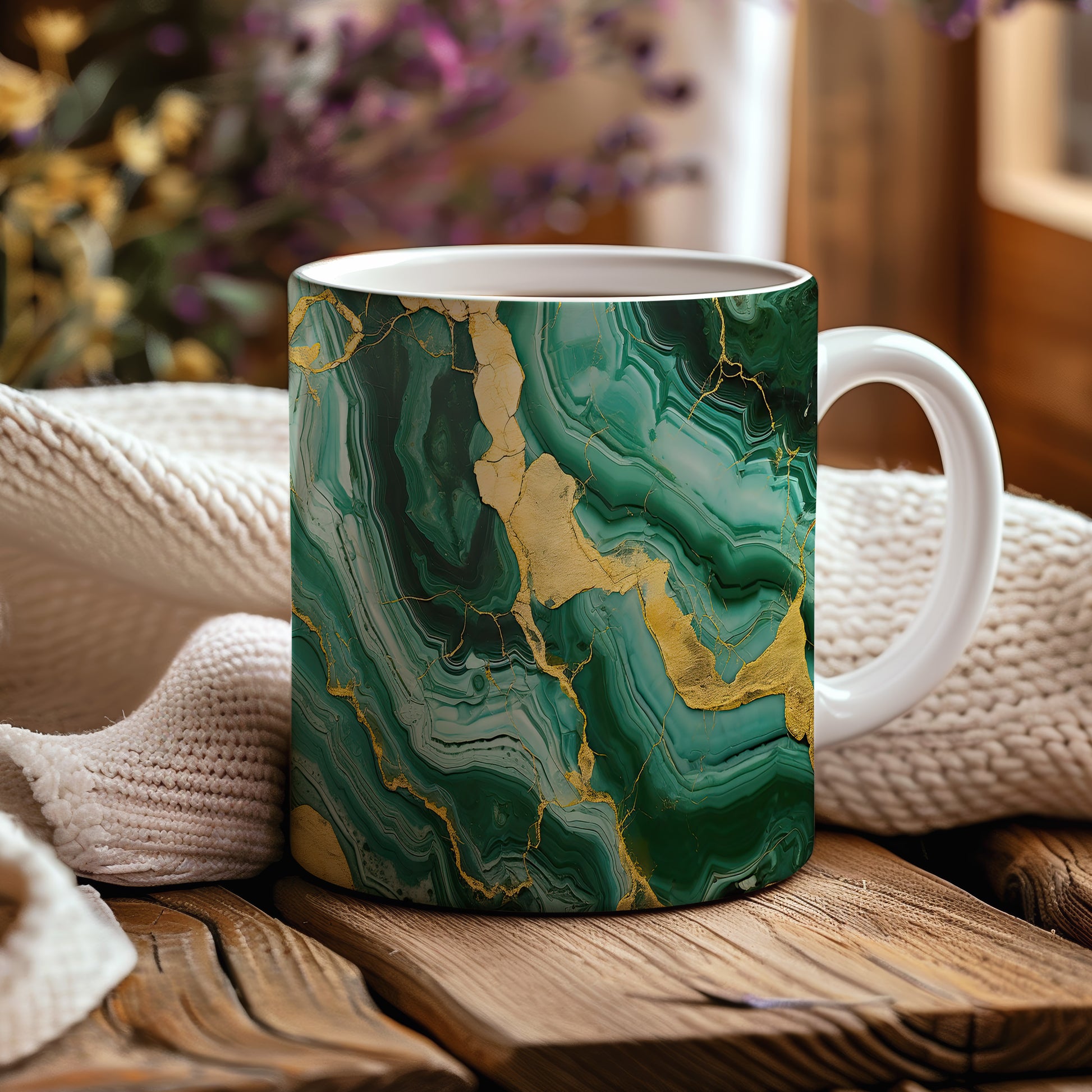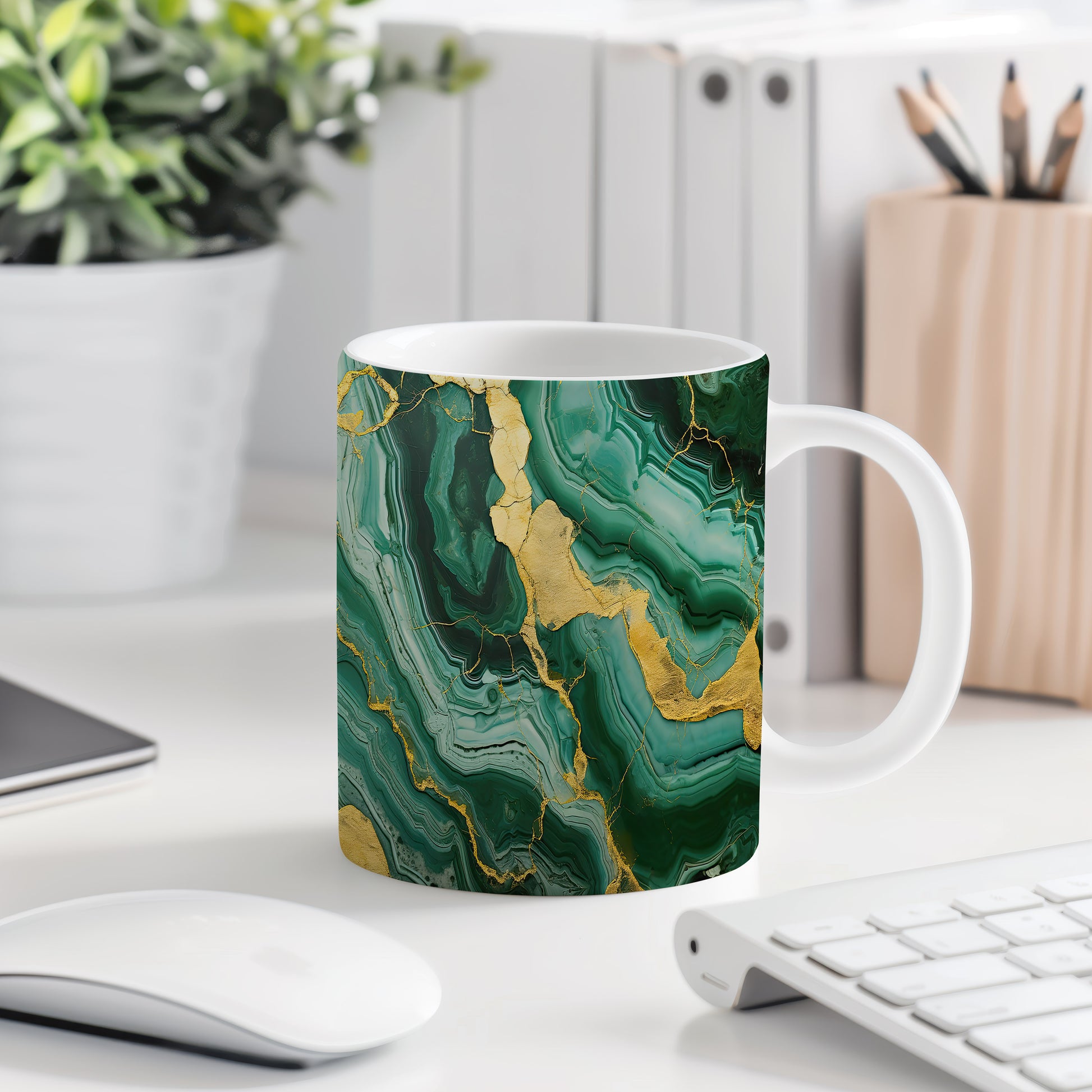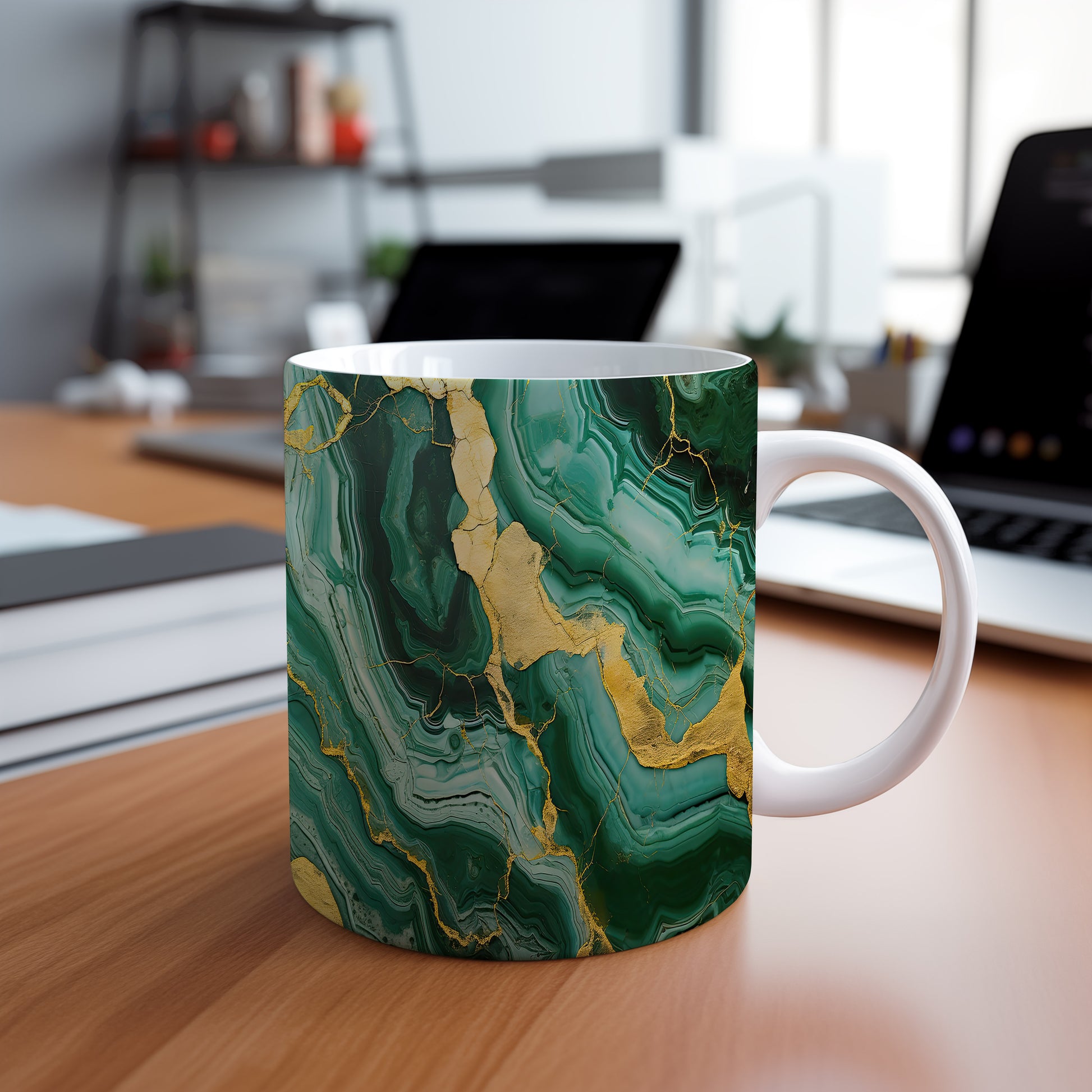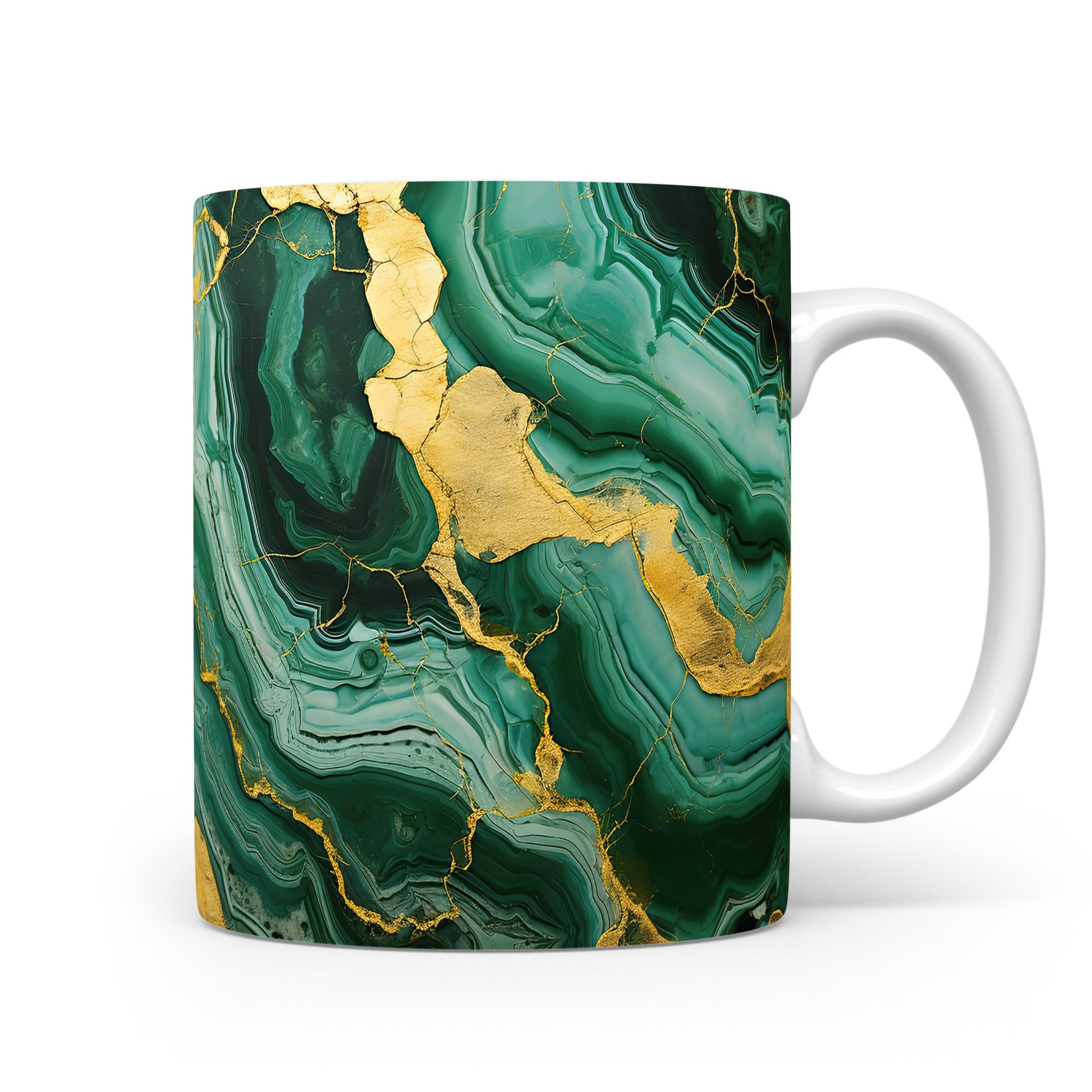Hrnek s mramorovým vzorem v zelených a zlatých tónech – jemnými detaily