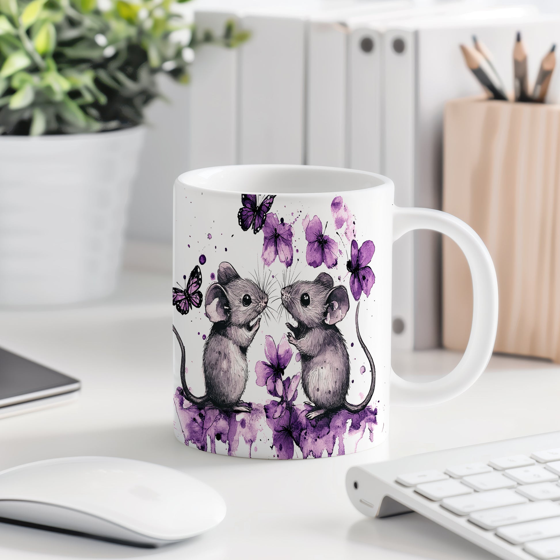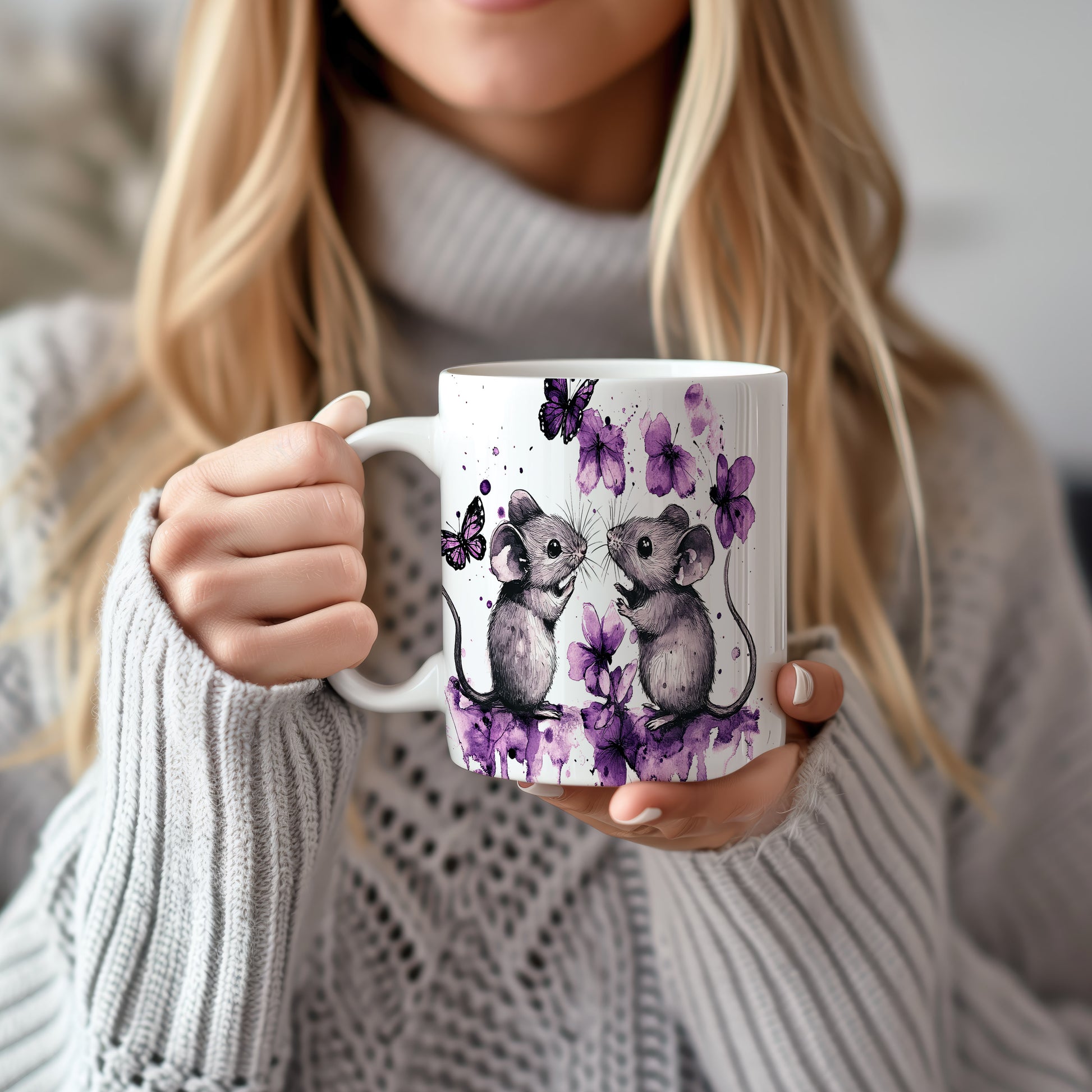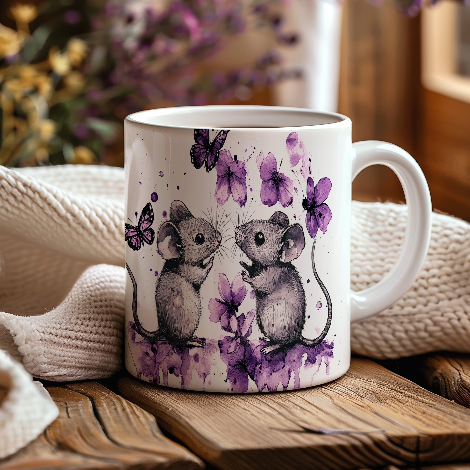 Hrnek s motivem myšek obklopených fialovými květinami a motýly. Tento hrnek je ideální pro milovníky zvířat a přírody, skvělý tip na dárek pro přátele nebo rodinu. Materiál: keramika. Objem: 330 ml. Vhodné do myčky i mikrovlnky. Používání tohoto hrnku přináší radost a oživí každé pití.