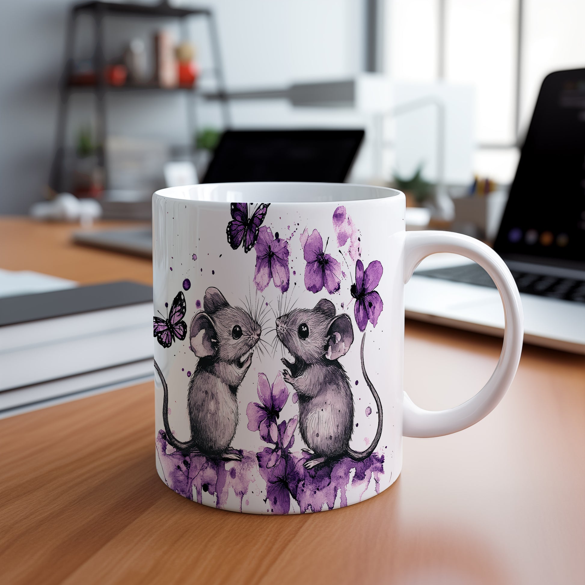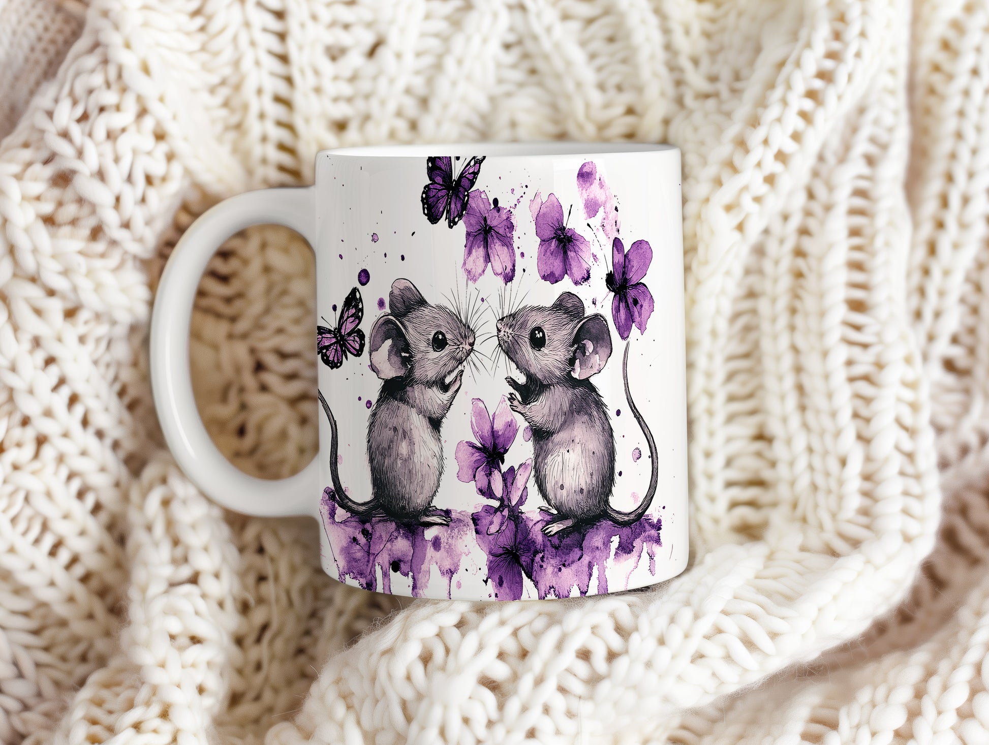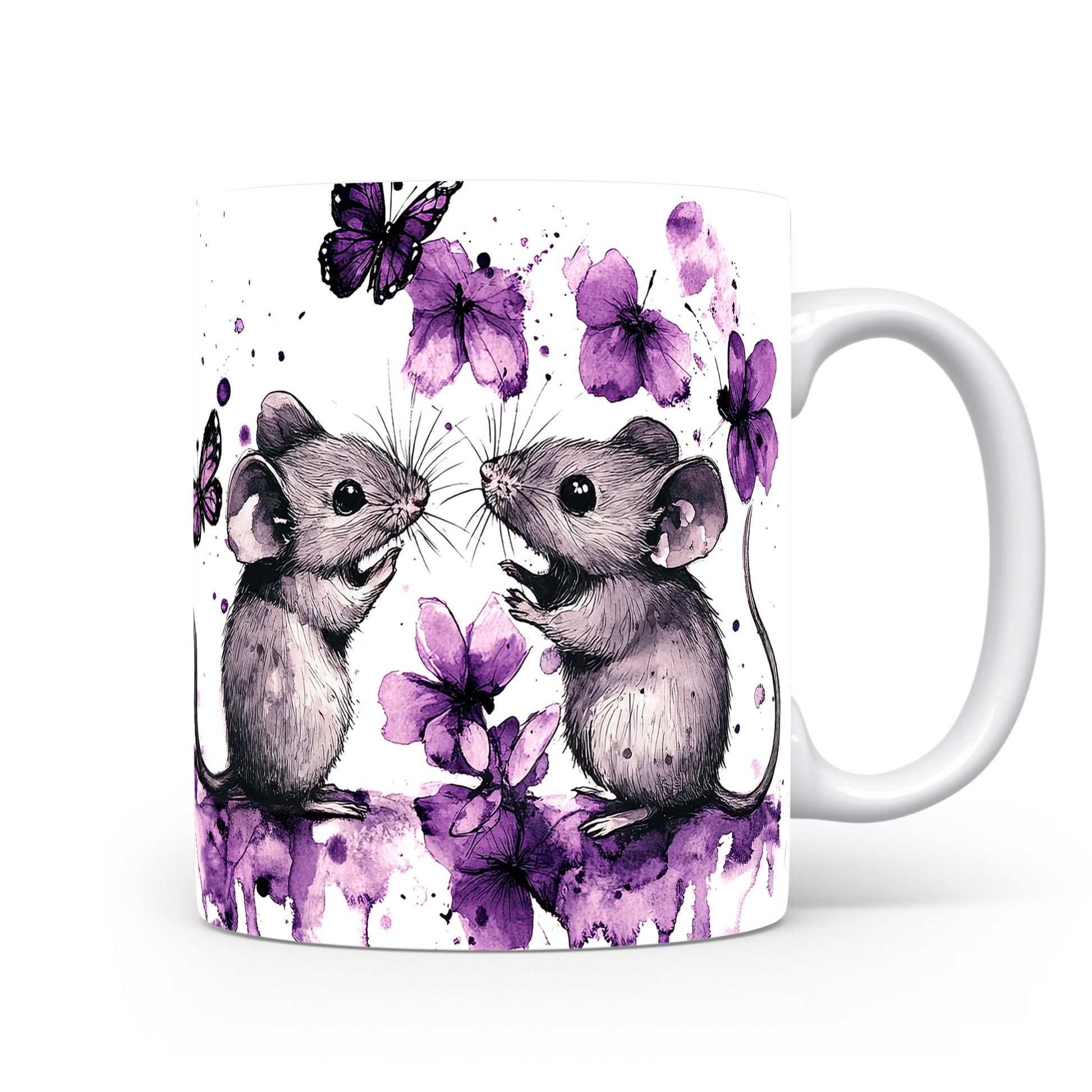 Hrnek s motivem myšek obklopených fialovými květinami a motýly. Tento hrnek je ideální pro milovníky zvířat a přírody, skvělý tip na dárek pro přátele nebo rodinu. Materiál: keramika. Objem: 330 ml. Vhodné do myčky i mikrovlnky. Používání tohoto hrnku přináší radost a oživí každé pití.