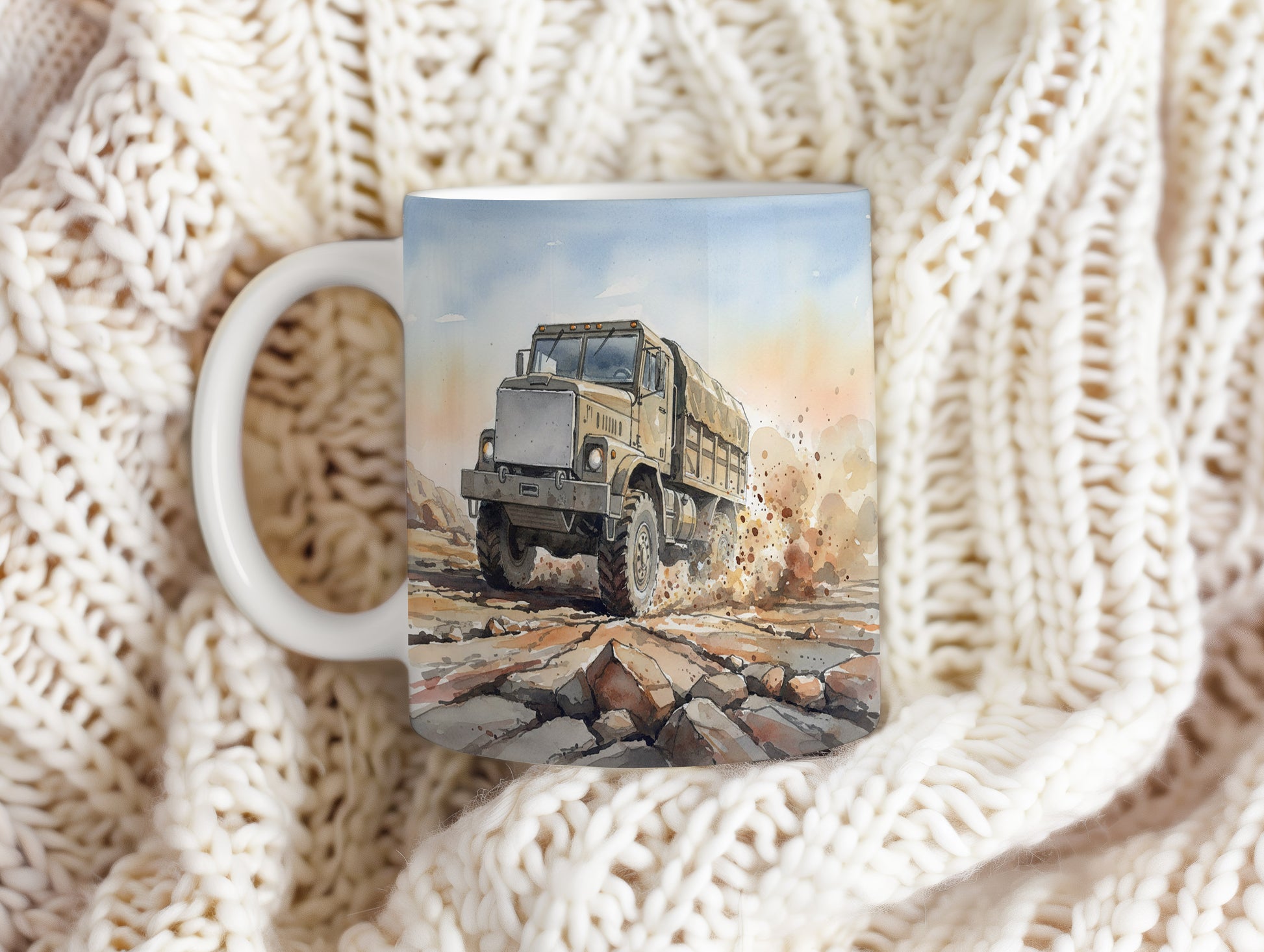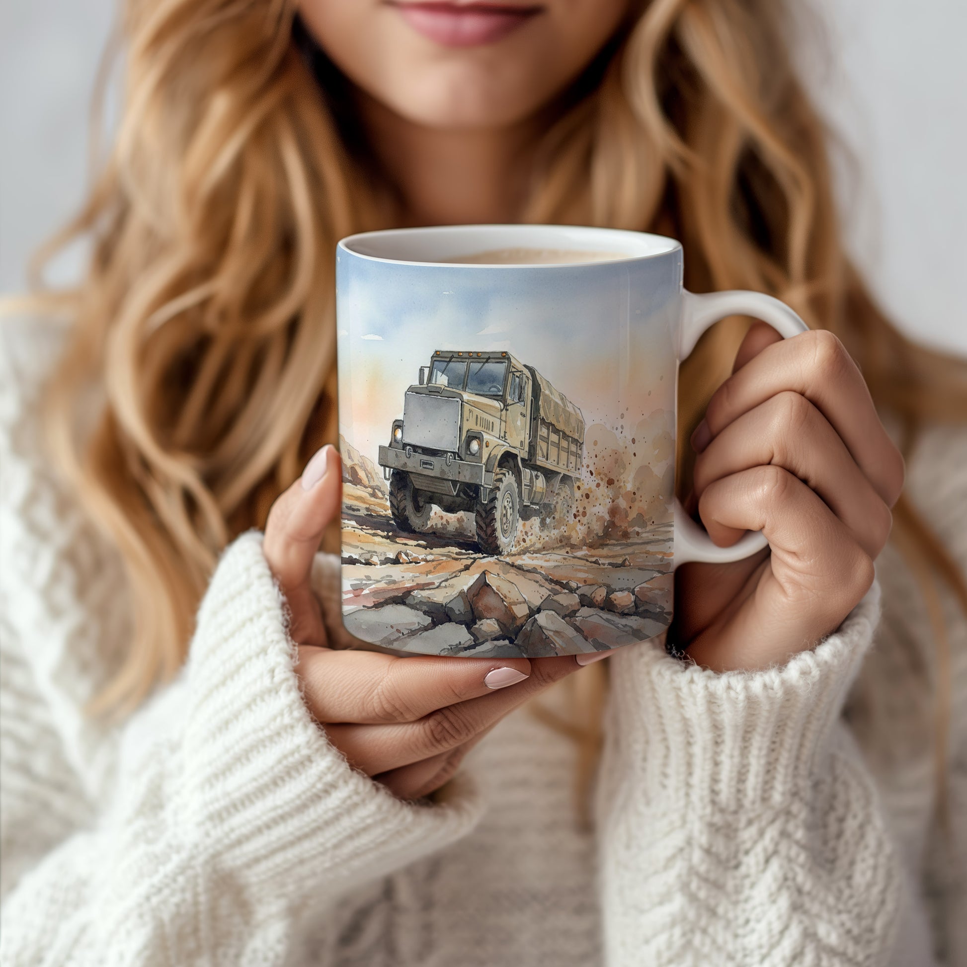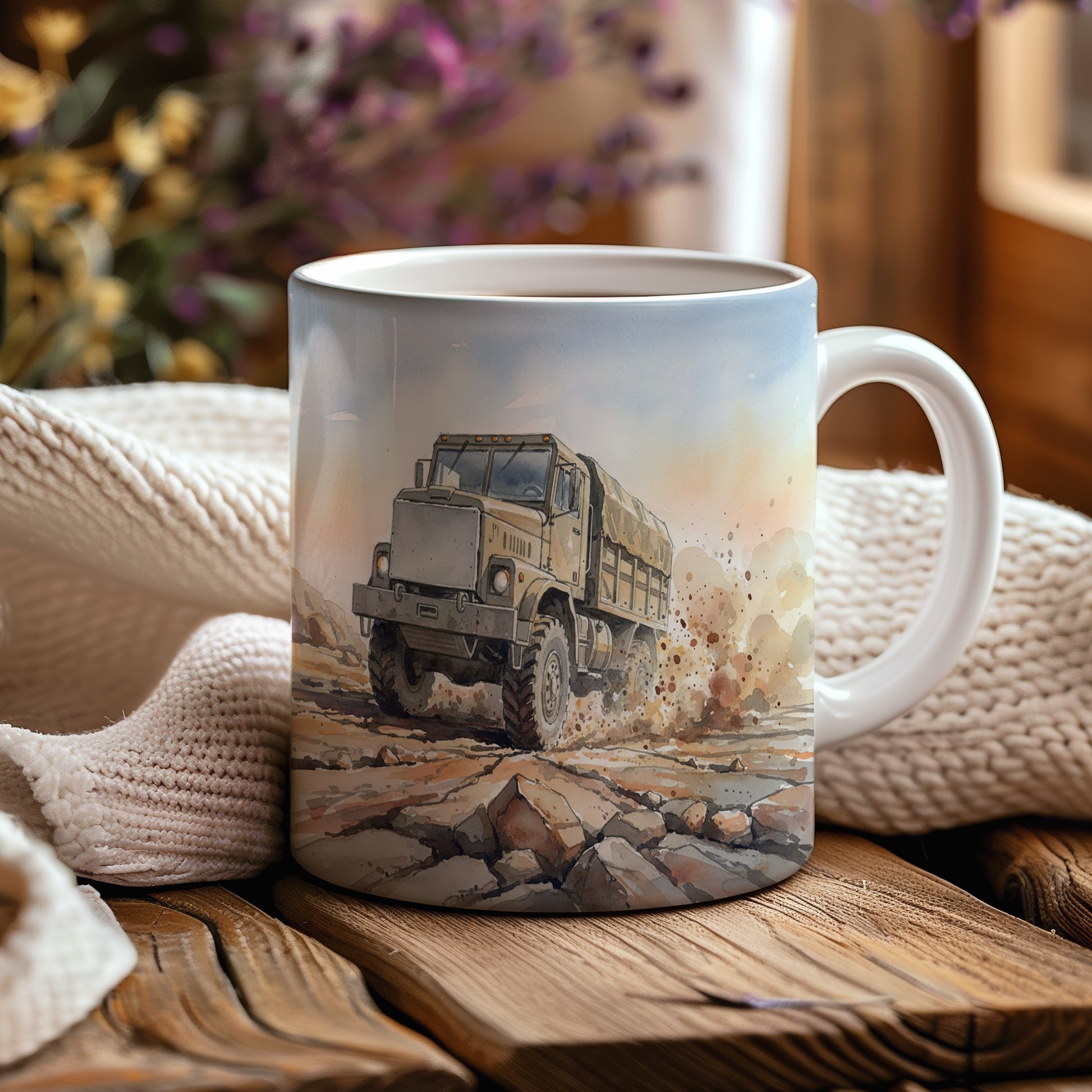 Objevte kouzlo dobrodružství s hrnkem, na kterém je akvarelový motiv náklaďáku projíždějícího kamenitou krajinou. Ideální pro milovníky silných strojů. Hrnek 330 ml – vhodný do myčky i mikrovlnky.